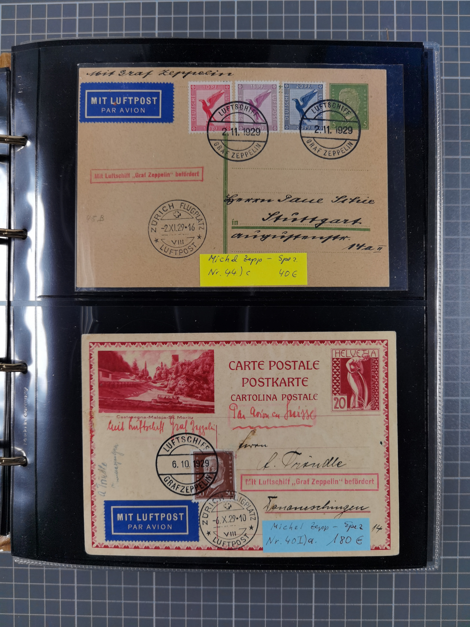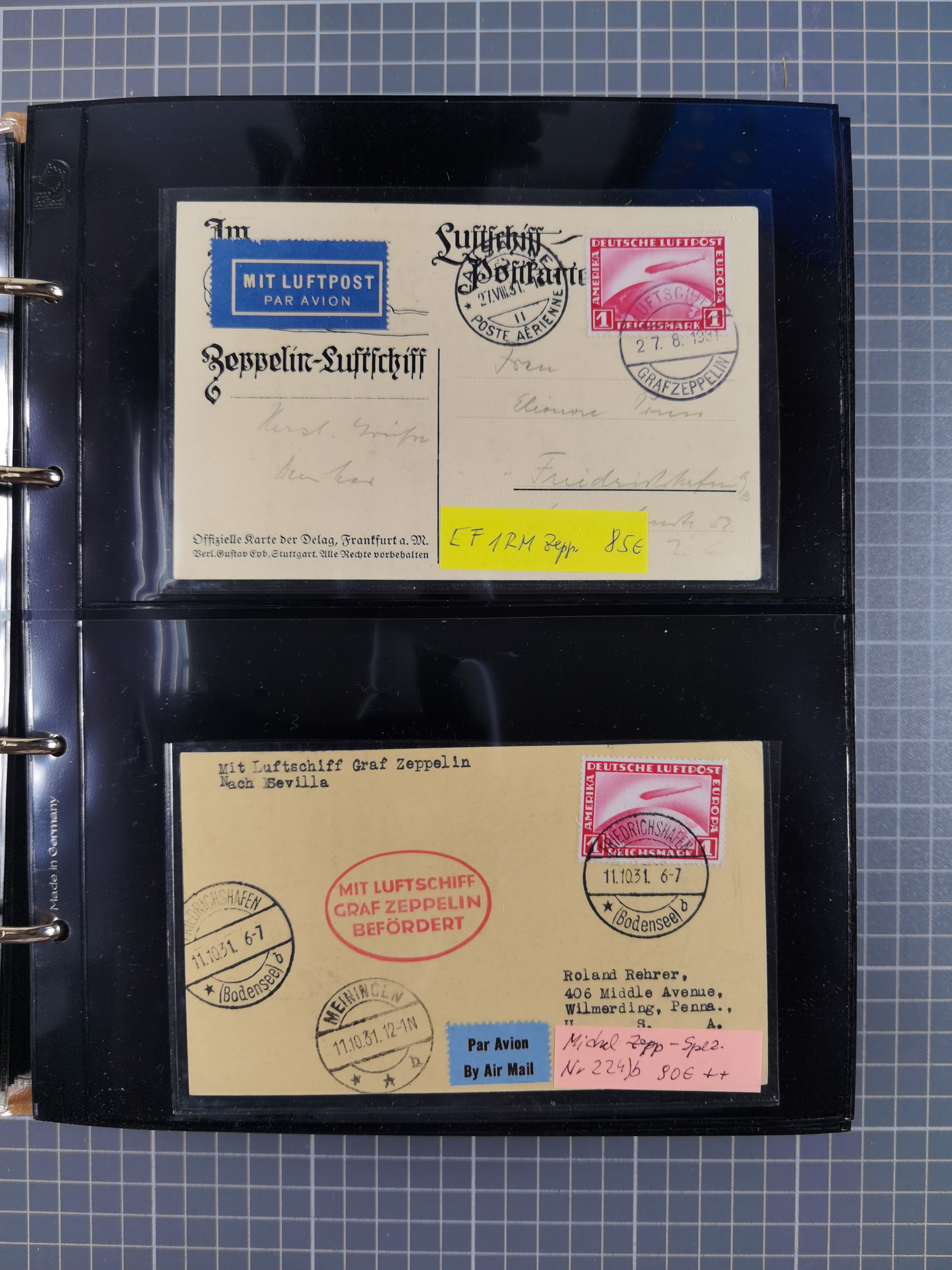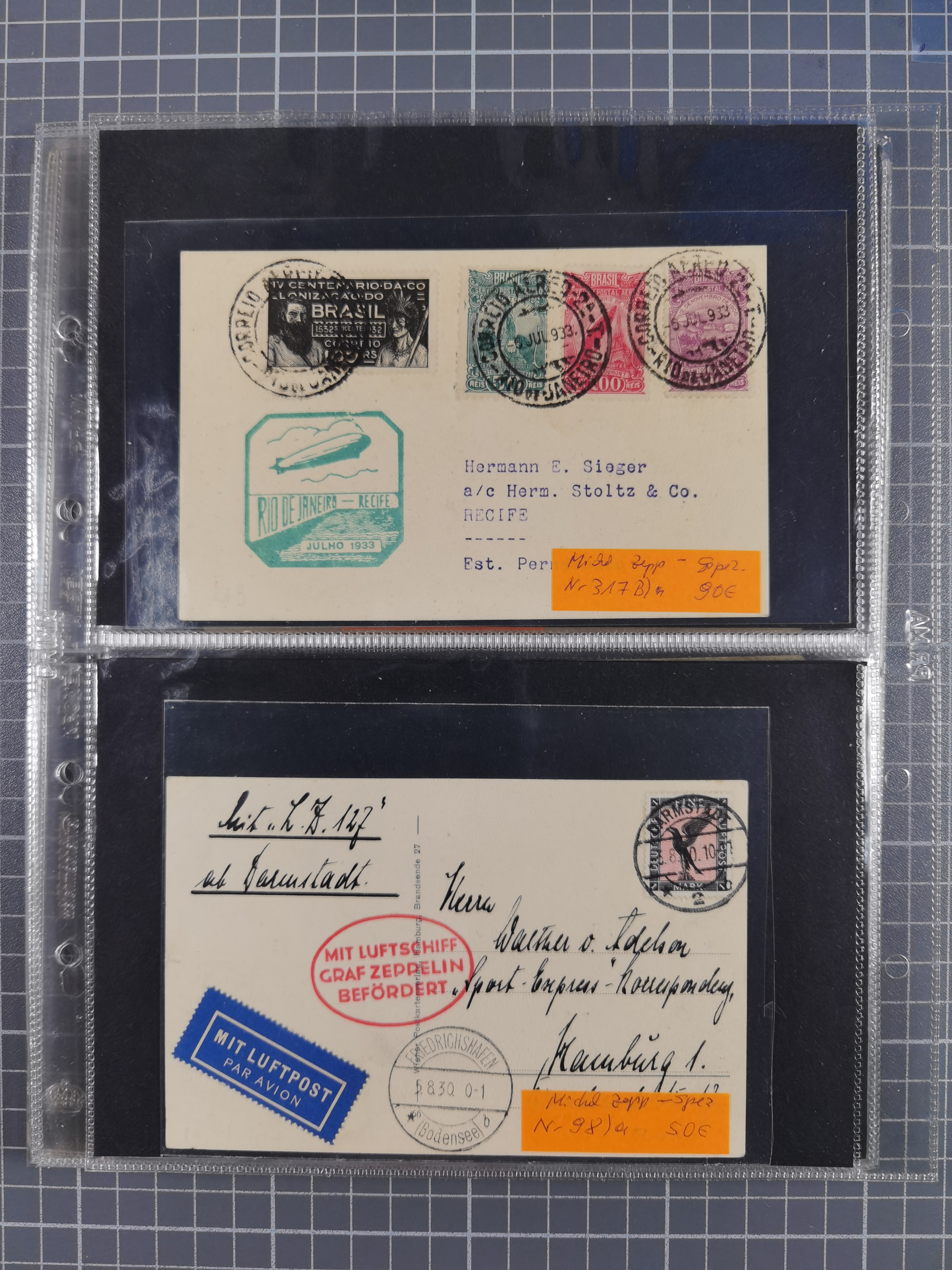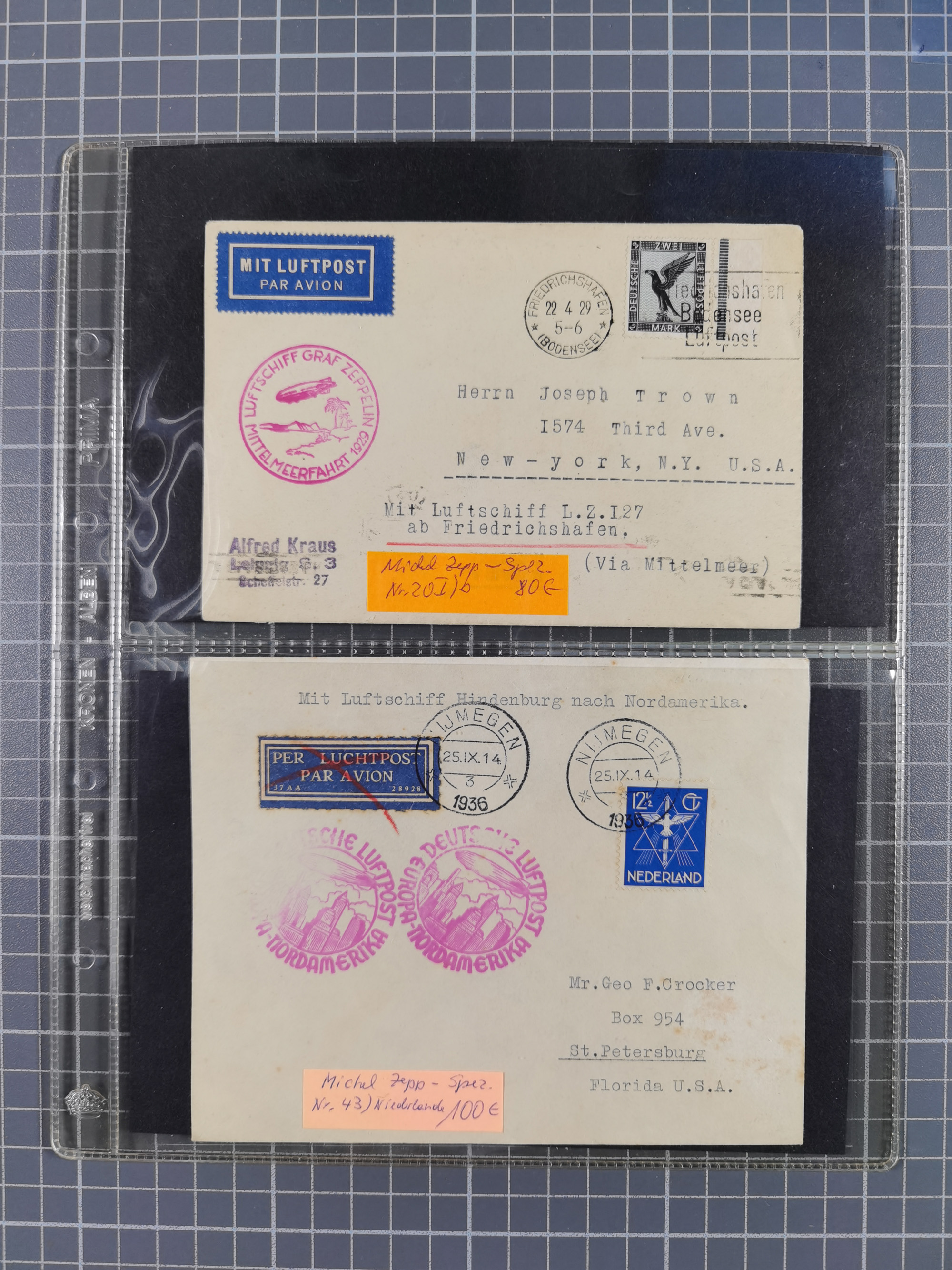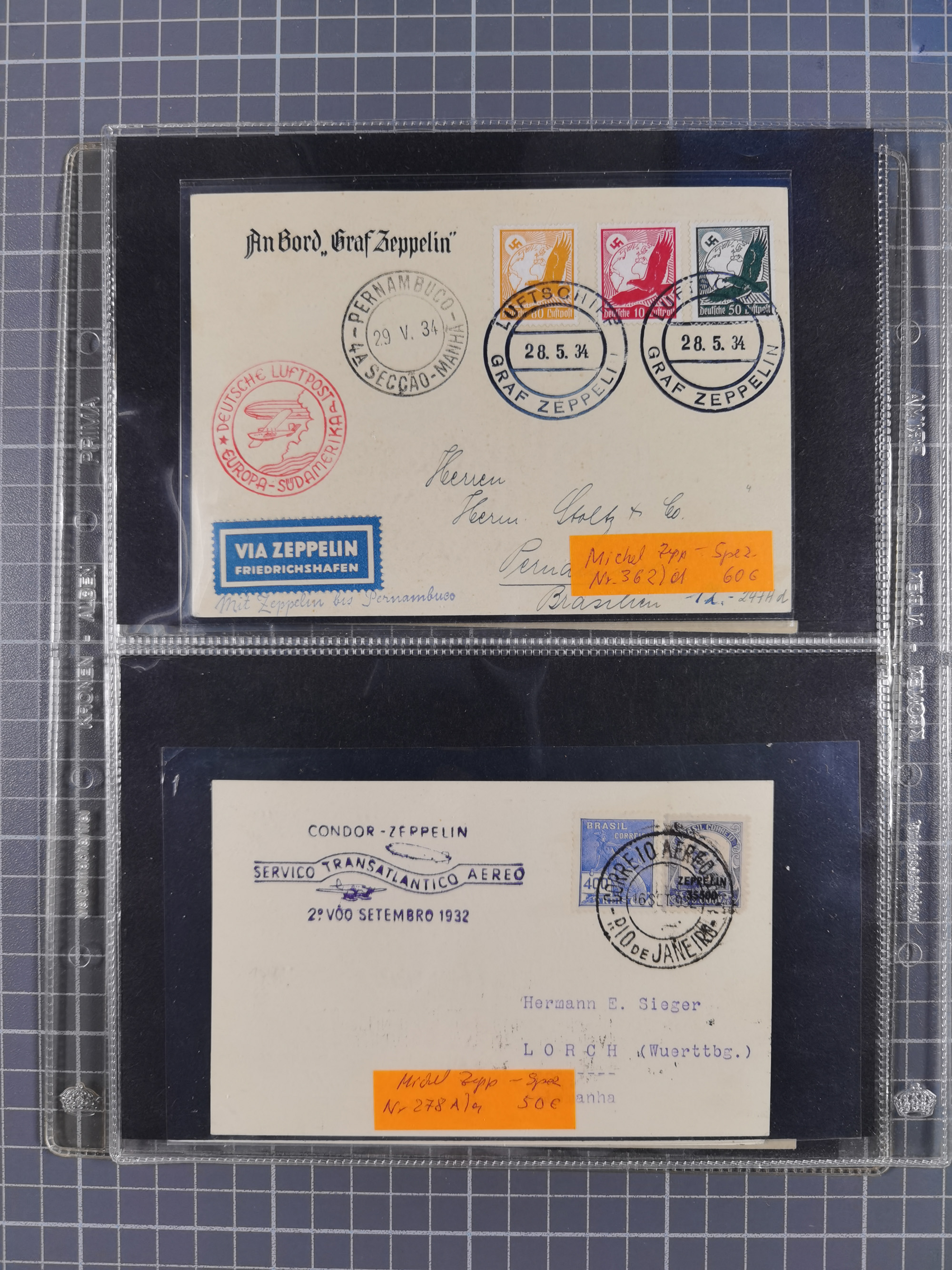 1913/36, Album mit 55 Zeppelinbriefen -Karten, (51 St. DR) dabei viele bessere Belege, u.a. DR großes Telegramm Luftschiff Hindenburg. Zeppelinkarte Viktoria Luise" und Hansa" (Sieger Nr. 4 und 6 II) Zeppelinbrief mit 1 und 2 RM Chicagofahrt!, Zeppelinkarte Nordpolarfahrt Zuleitung Niederlande. 2. SAF 1933, Zuleitung franz. Andorra, Zeppelin-Karte mit 2. SAF 1931 Hin- und Rückfahrt mit brasilianischer und deutscher Frankatur (2 x 1 RM Zeppelin) 10 Zeppelinbriefe/Karten mit 1.2 und 4 RM Zeppelin, meist gute Erhaltung