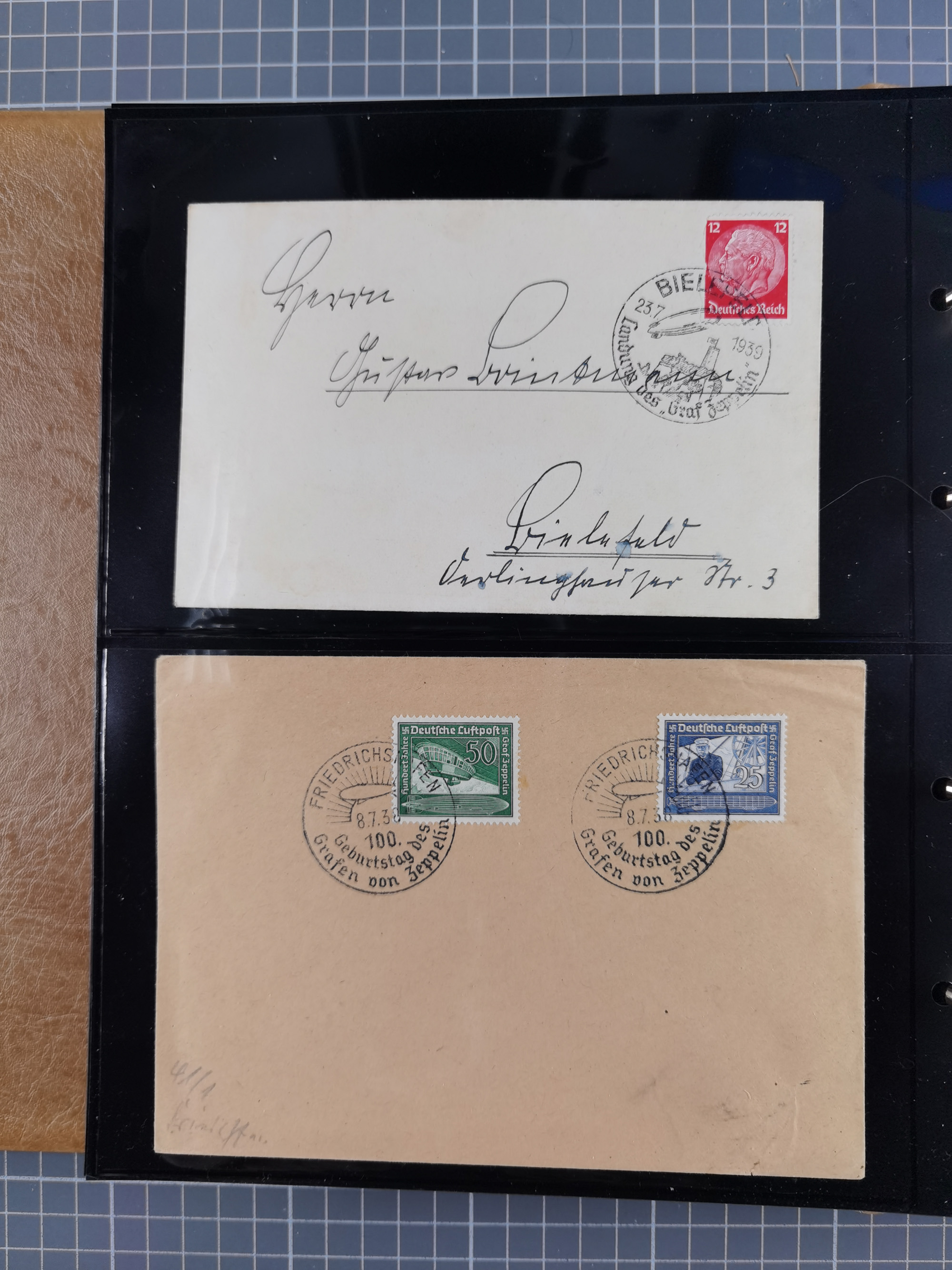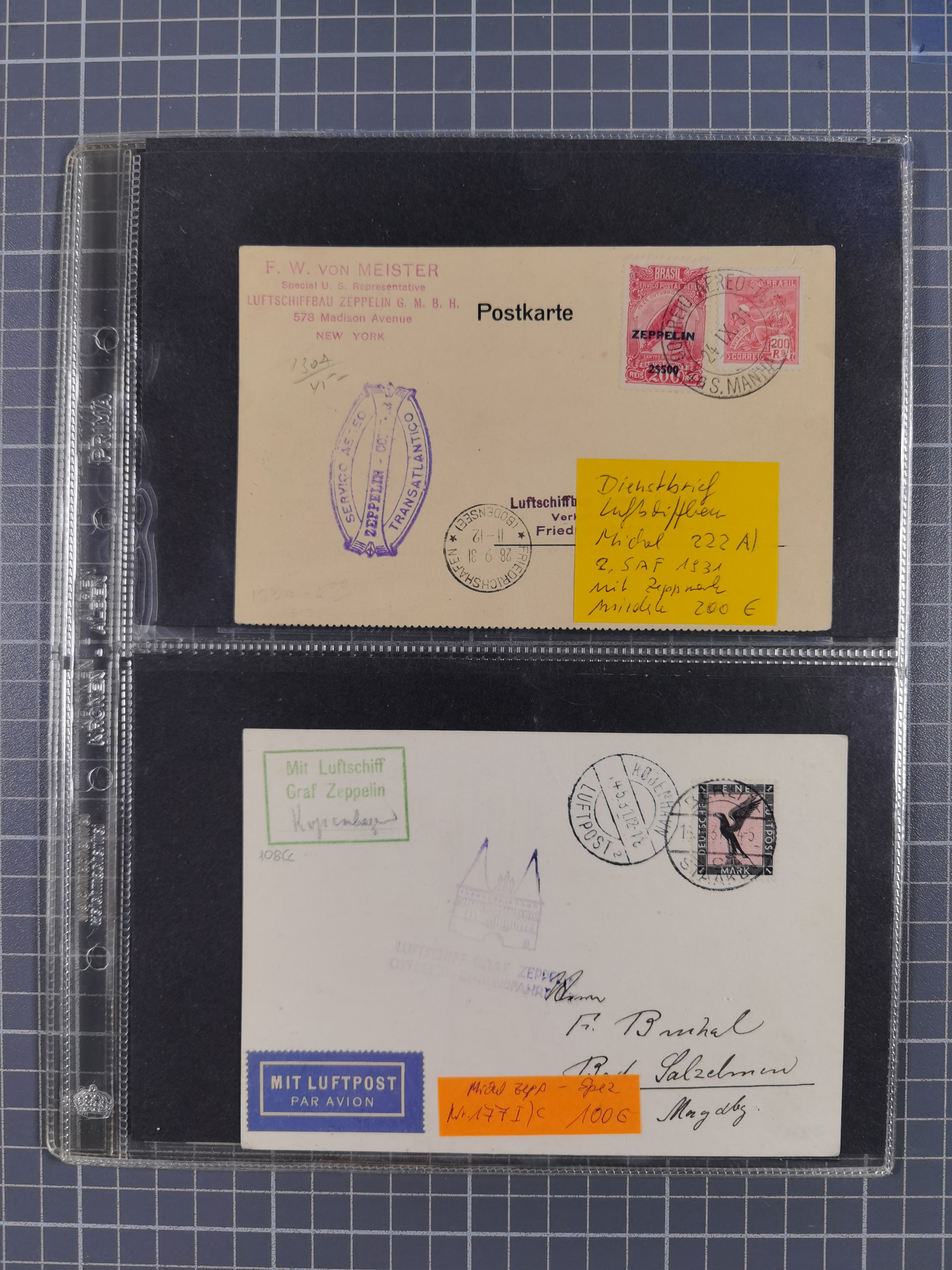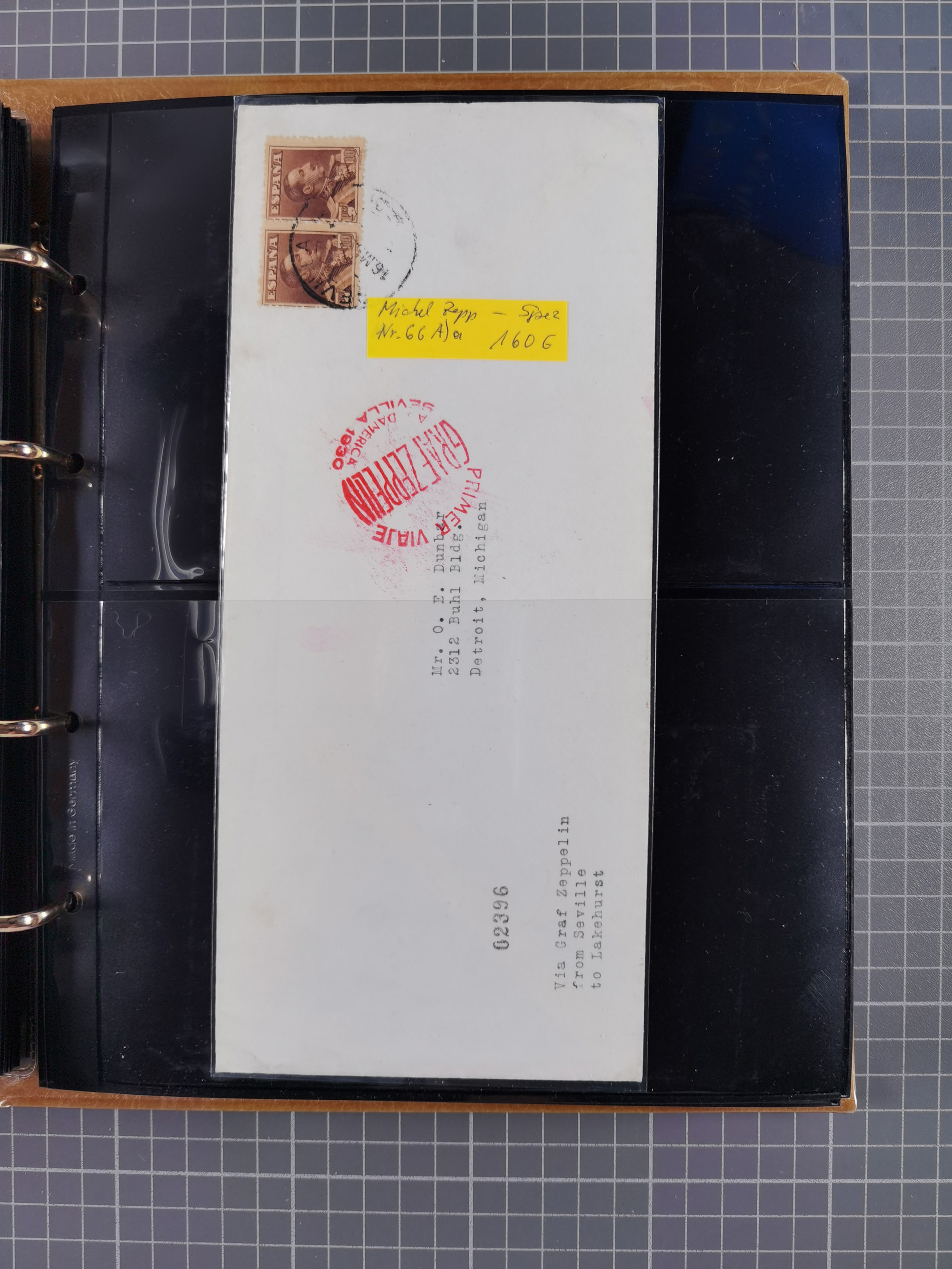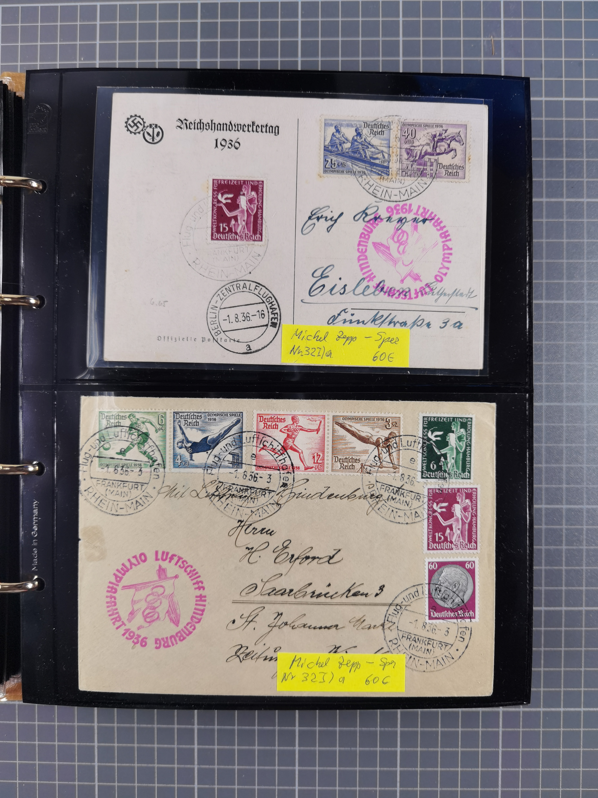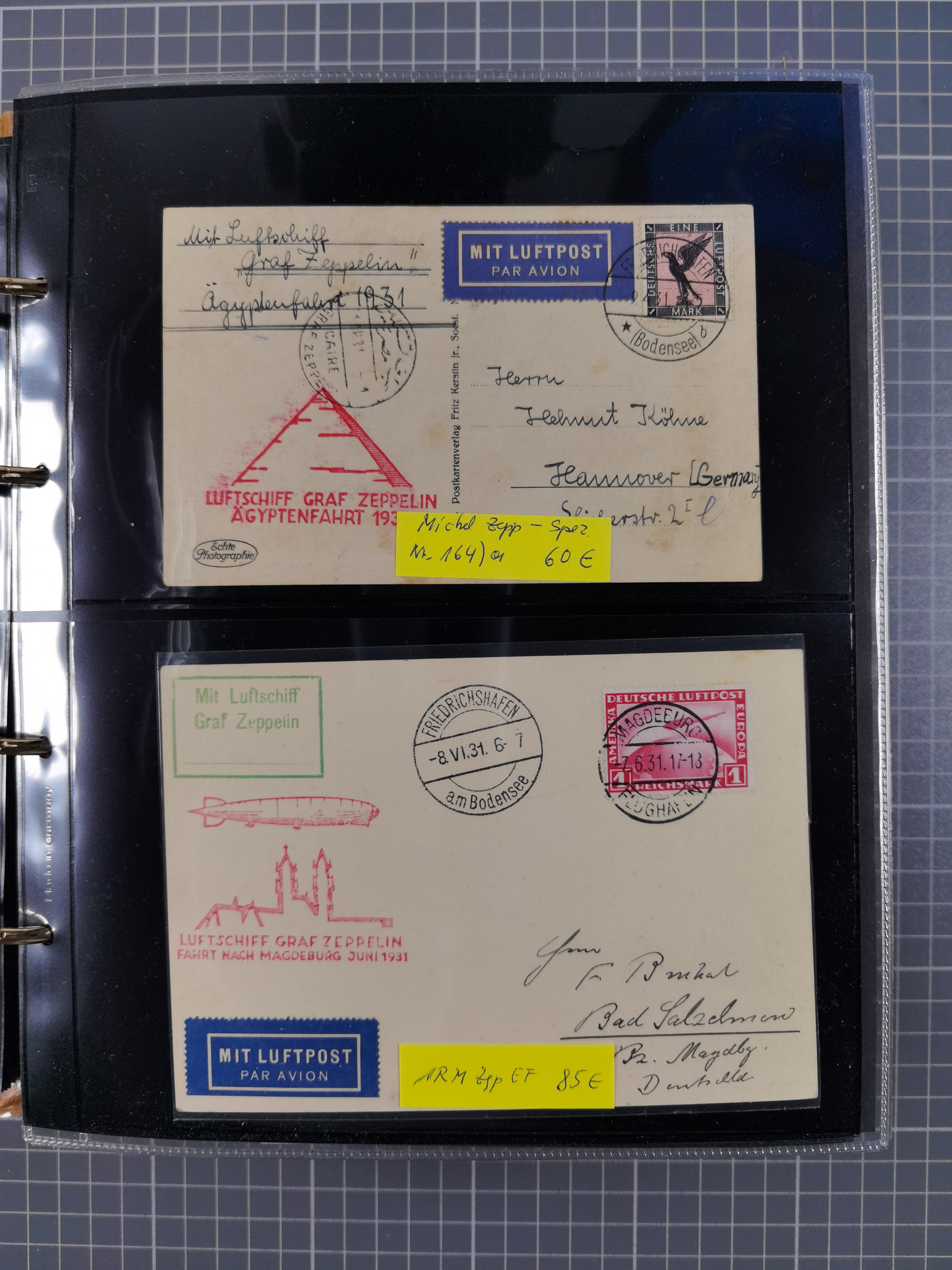 1913/36, Album mit 55 Zeppelinbriefen -Karten, (51 St. DR) dabei viele bessere Belege, u.a. DR großes Telegramm Luftschiff Hindenburg. Zeppelinkarte Viktoria Luise" und Hansa" (Sieger Nr. 4 und 6 II) Zeppelinbrief mit 1 und 2 RM Chicagofahrt!, Zeppelinkarte Nordpolarfahrt Zuleitung Niederlande. 2. SAF 1933, Zuleitung franz. Andorra, Zeppelin-Karte mit 2. SAF 1931 Hin- und Rückfahrt mit brasilianischer und deutscher Frankatur (2 x 1 RM Zeppelin) 10 Zeppelinbriefe/Karten mit 1.2 und 4 RM Zeppelin, meist gute Erhaltung
