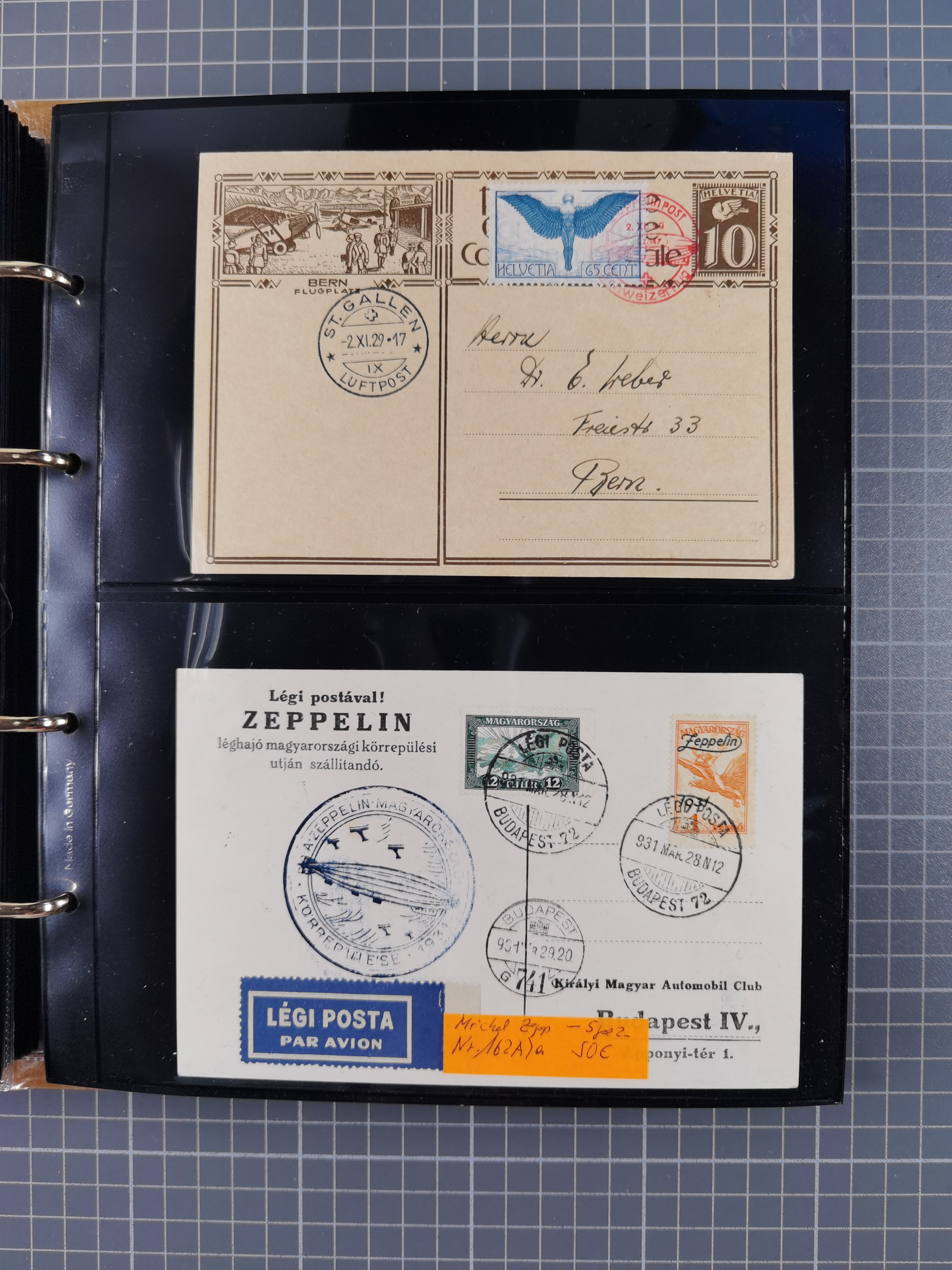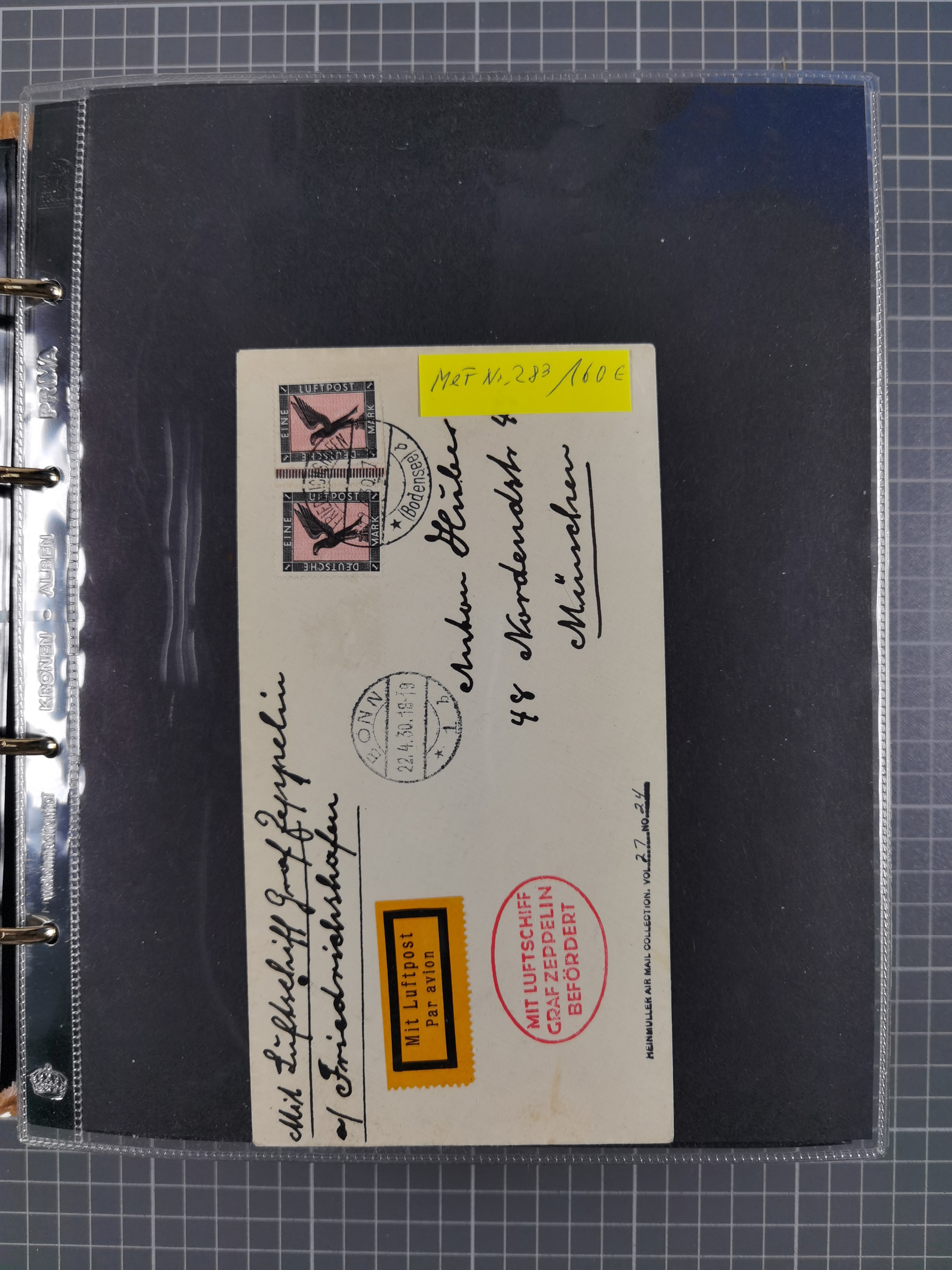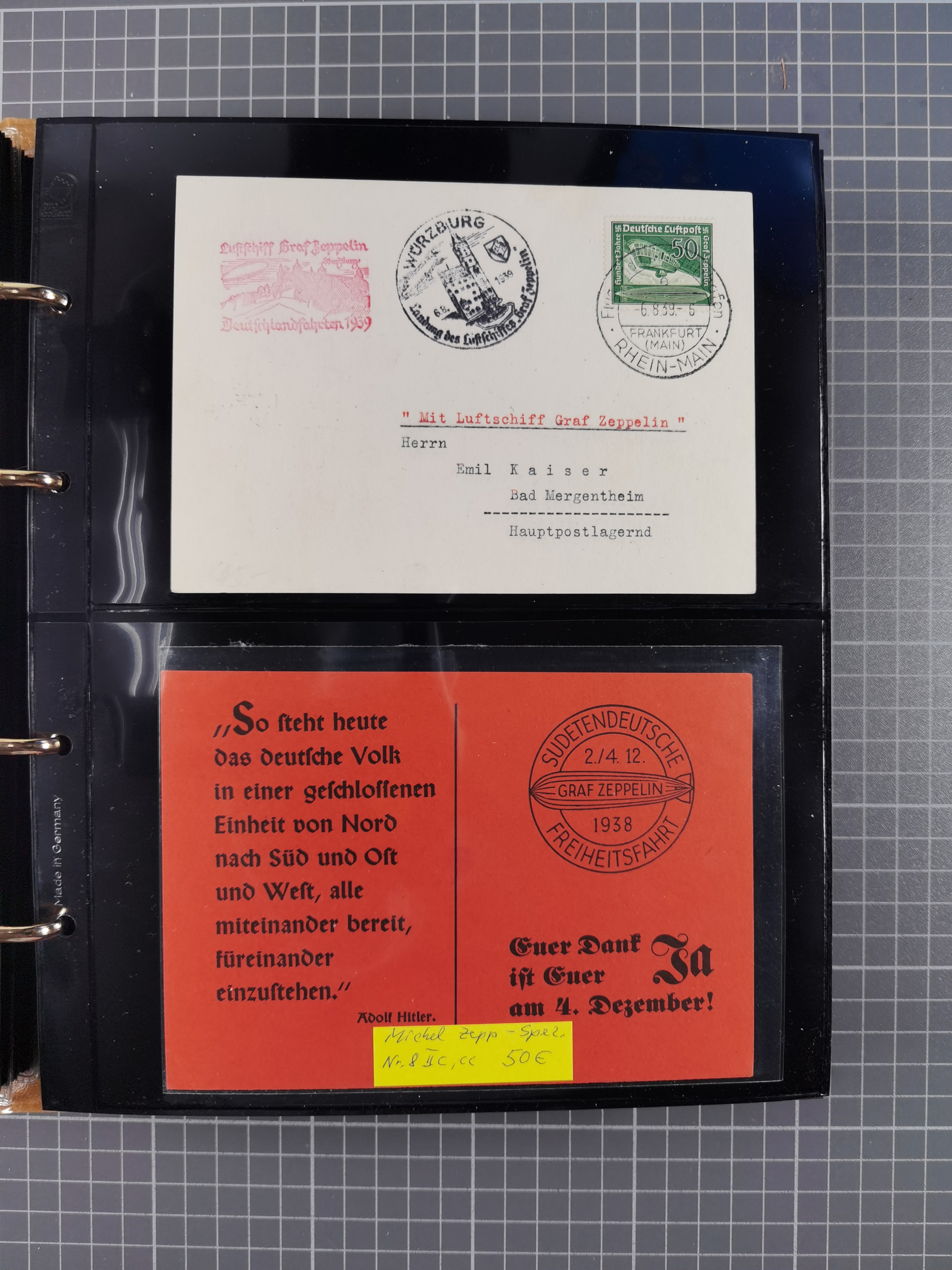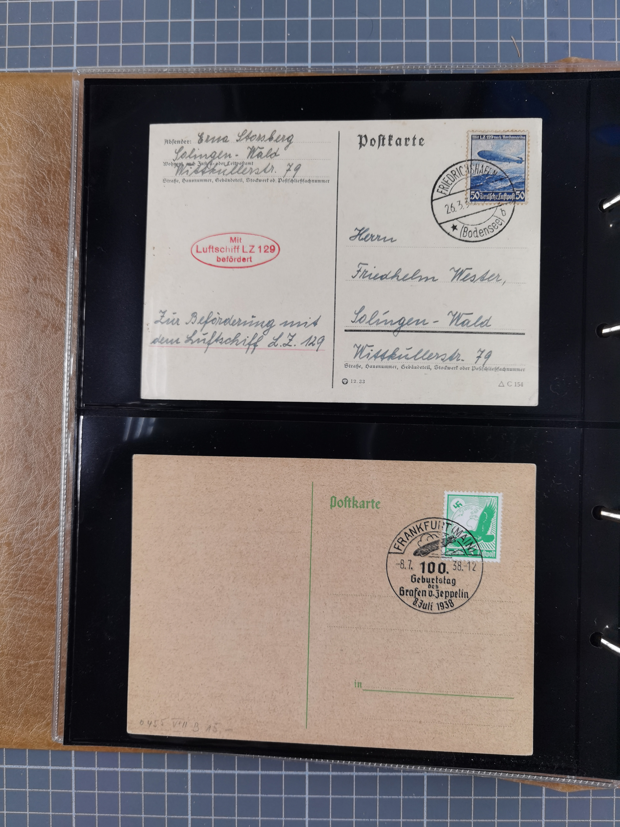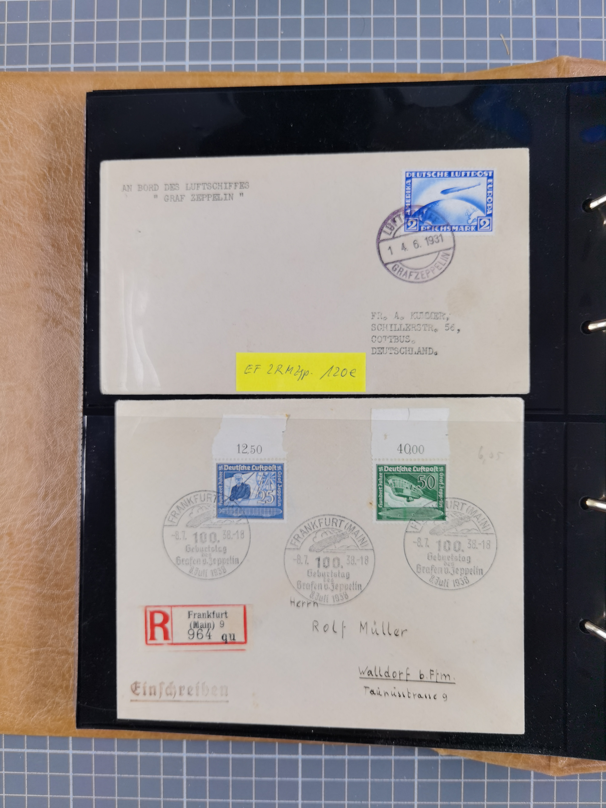 1913/36, Album mit 55 Zeppelinbriefen -Karten, (51 St. DR) dabei viele bessere Belege, u.a. DR großes Telegramm Luftschiff Hindenburg. Zeppelinkarte Viktoria Luise" und Hansa" (Sieger Nr. 4 und 6 II) Zeppelinbrief mit 1 und 2 RM Chicagofahrt!, Zeppelinkarte Nordpolarfahrt Zuleitung Niederlande. 2. SAF 1933, Zuleitung franz. Andorra, Zeppelin-Karte mit 2. SAF 1931 Hin- und Rückfahrt mit brasilianischer und deutscher Frankatur (2 x 1 RM Zeppelin) 10 Zeppelinbriefe/Karten mit 1.2 und 4 RM Zeppelin, meist gute Erhaltung