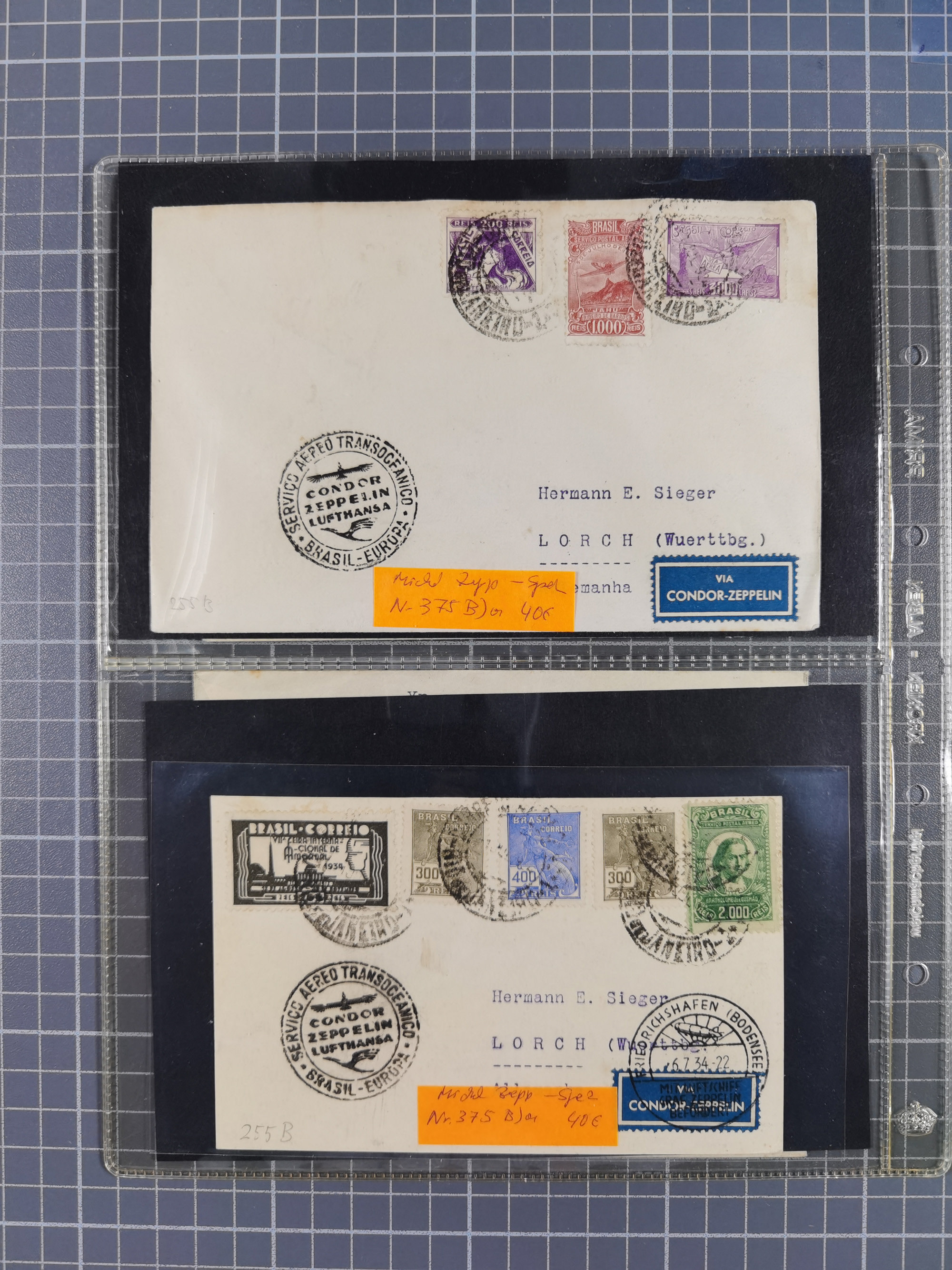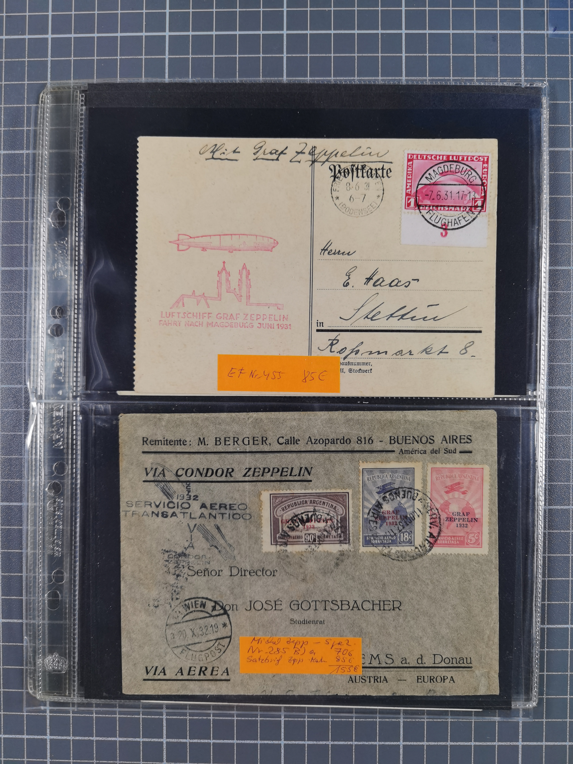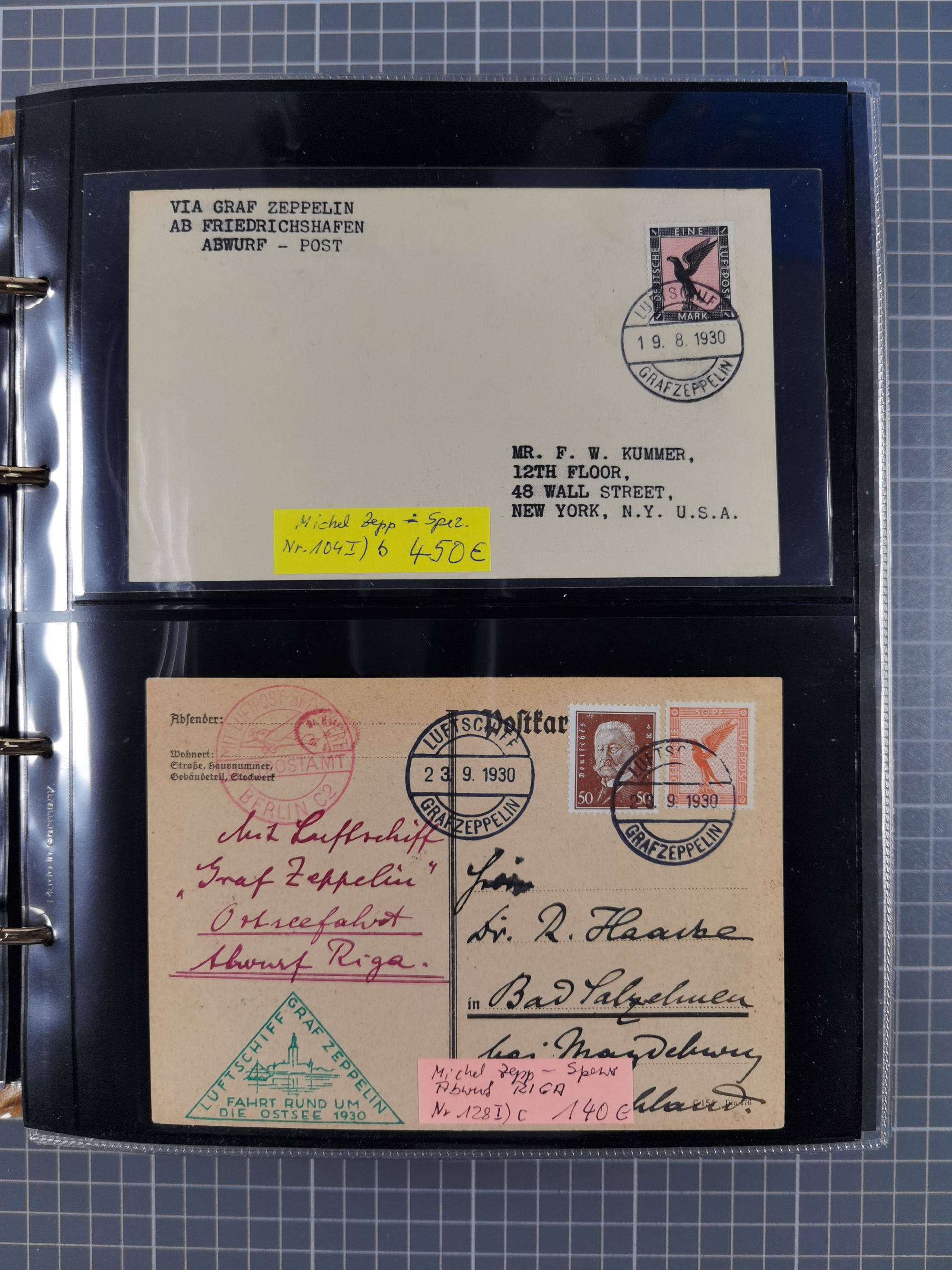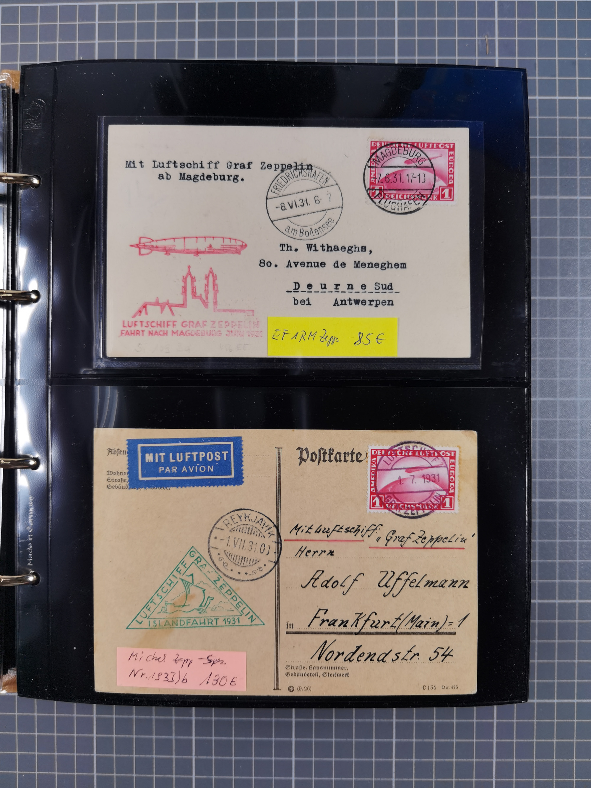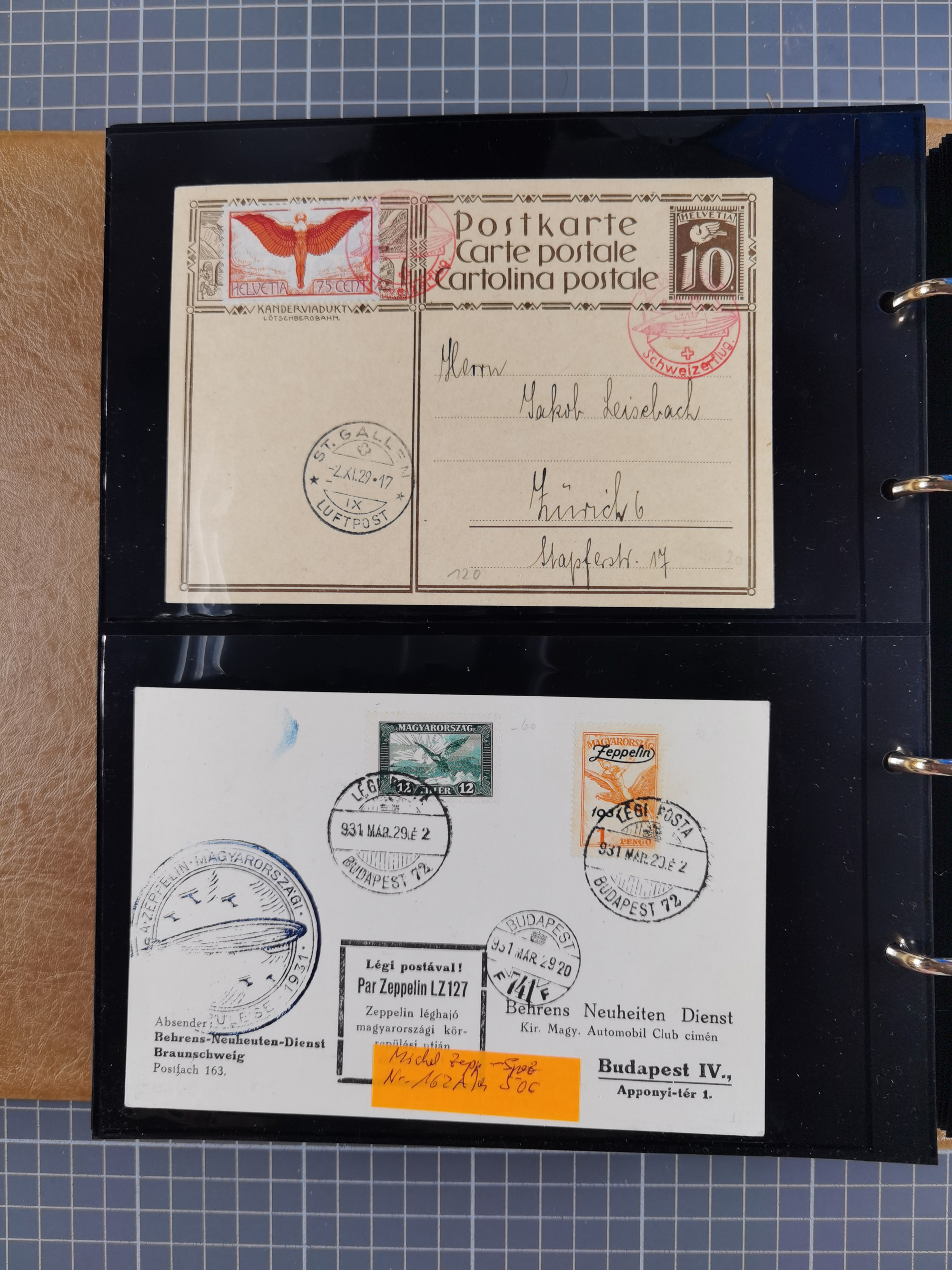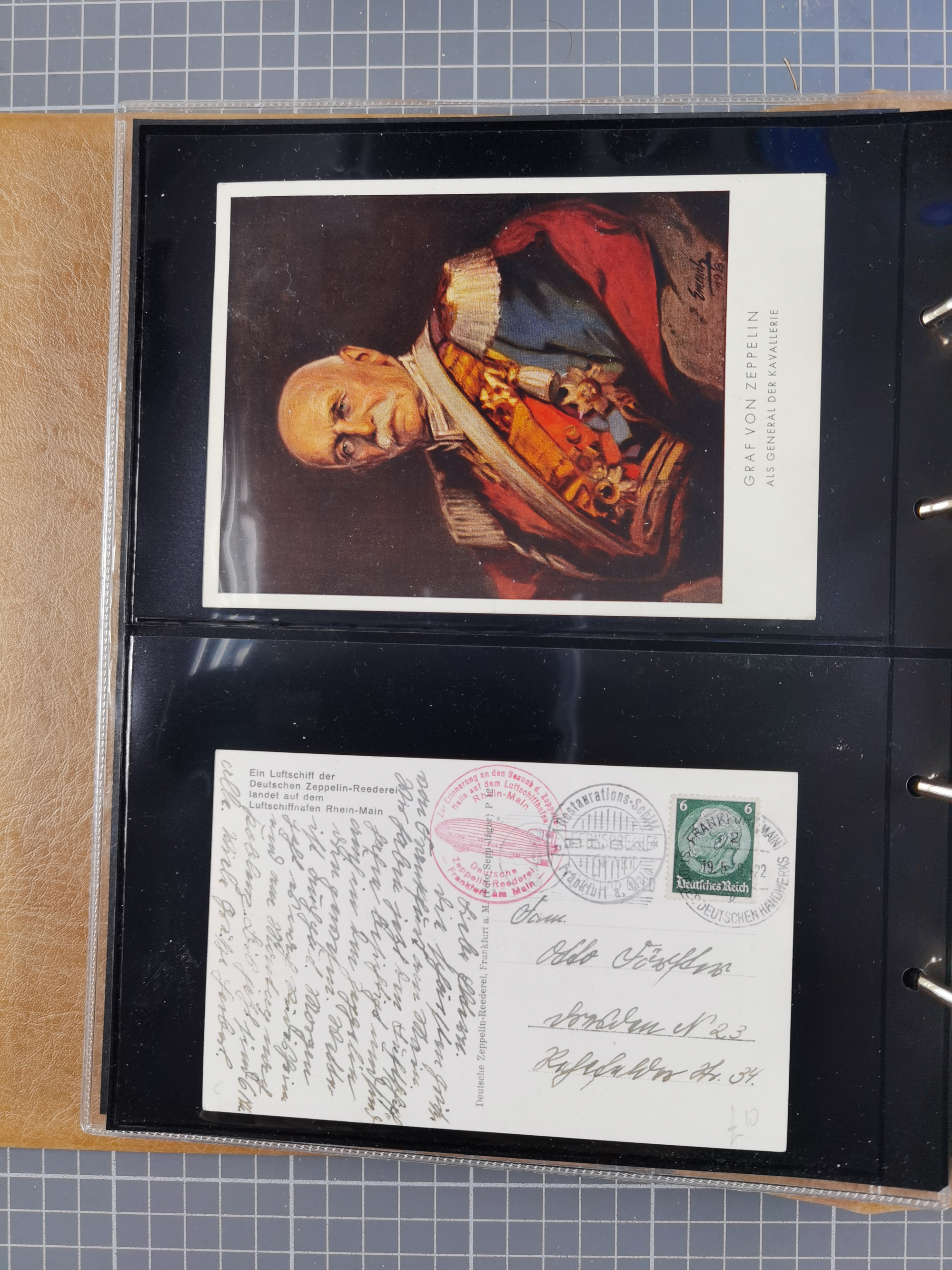 1913/36, Album mit 55 Zeppelinbriefen -Karten, (51 St. DR) dabei viele bessere Belege, u.a. DR großes Telegramm Luftschiff Hindenburg. Zeppelinkarte Viktoria Luise" und Hansa" (Sieger Nr. 4 und 6 II) Zeppelinbrief mit 1 und 2 RM Chicagofahrt!, Zeppelinkarte Nordpolarfahrt Zuleitung Niederlande. 2. SAF 1933, Zuleitung franz. Andorra, Zeppelin-Karte mit 2. SAF 1931 Hin- und Rückfahrt mit brasilianischer und deutscher Frankatur (2 x 1 RM Zeppelin) 10 Zeppelinbriefe/Karten mit 1.2 und 4 RM Zeppelin, meist gute Erhaltung