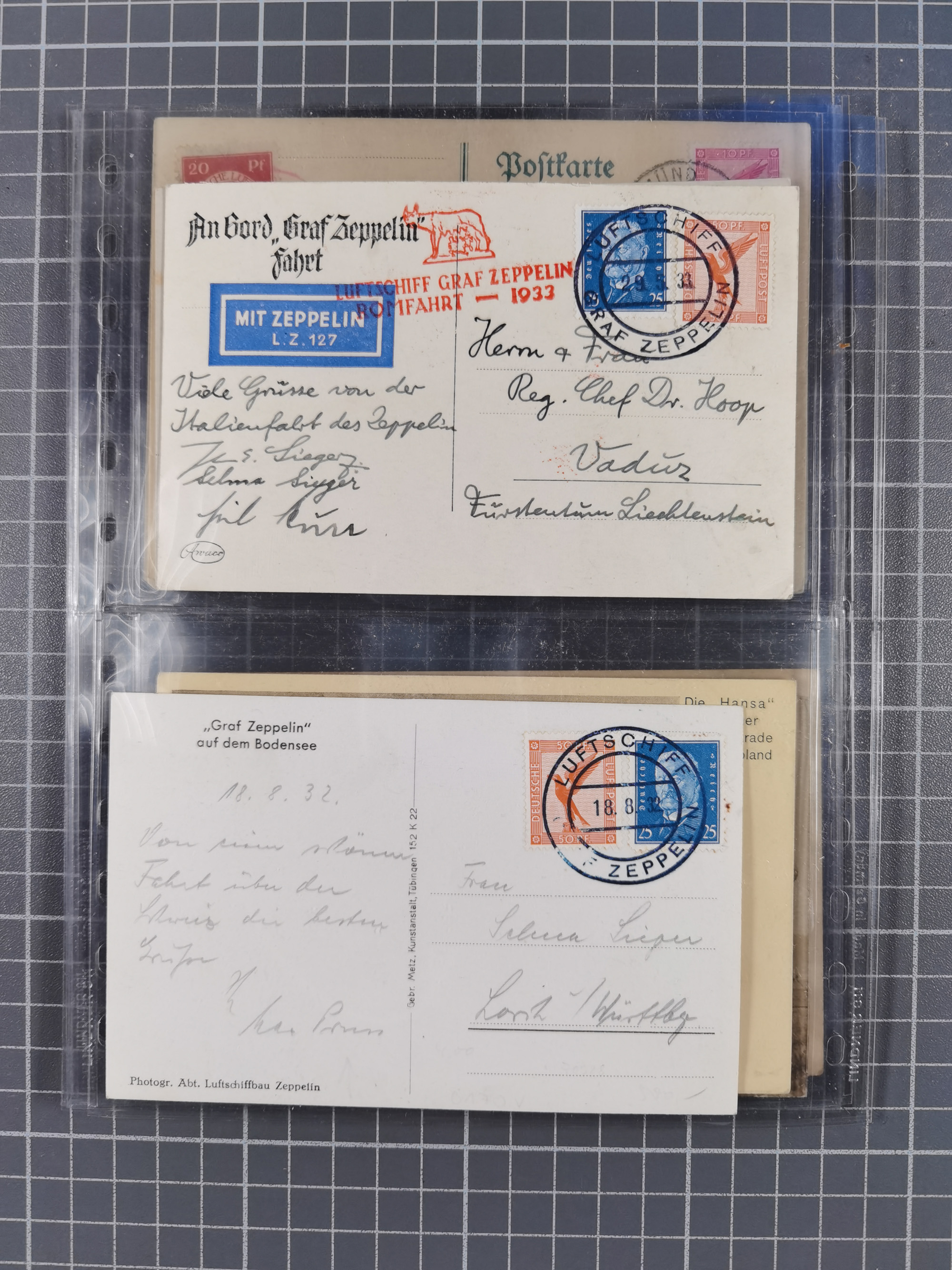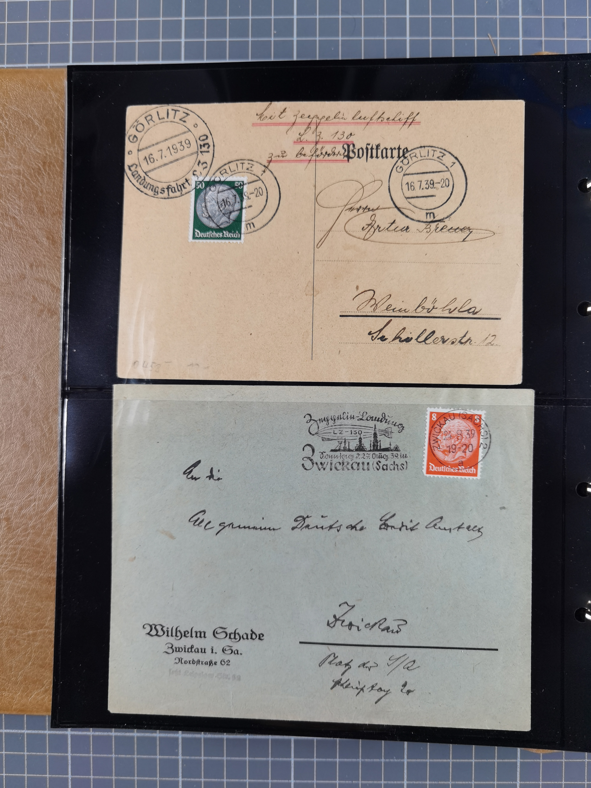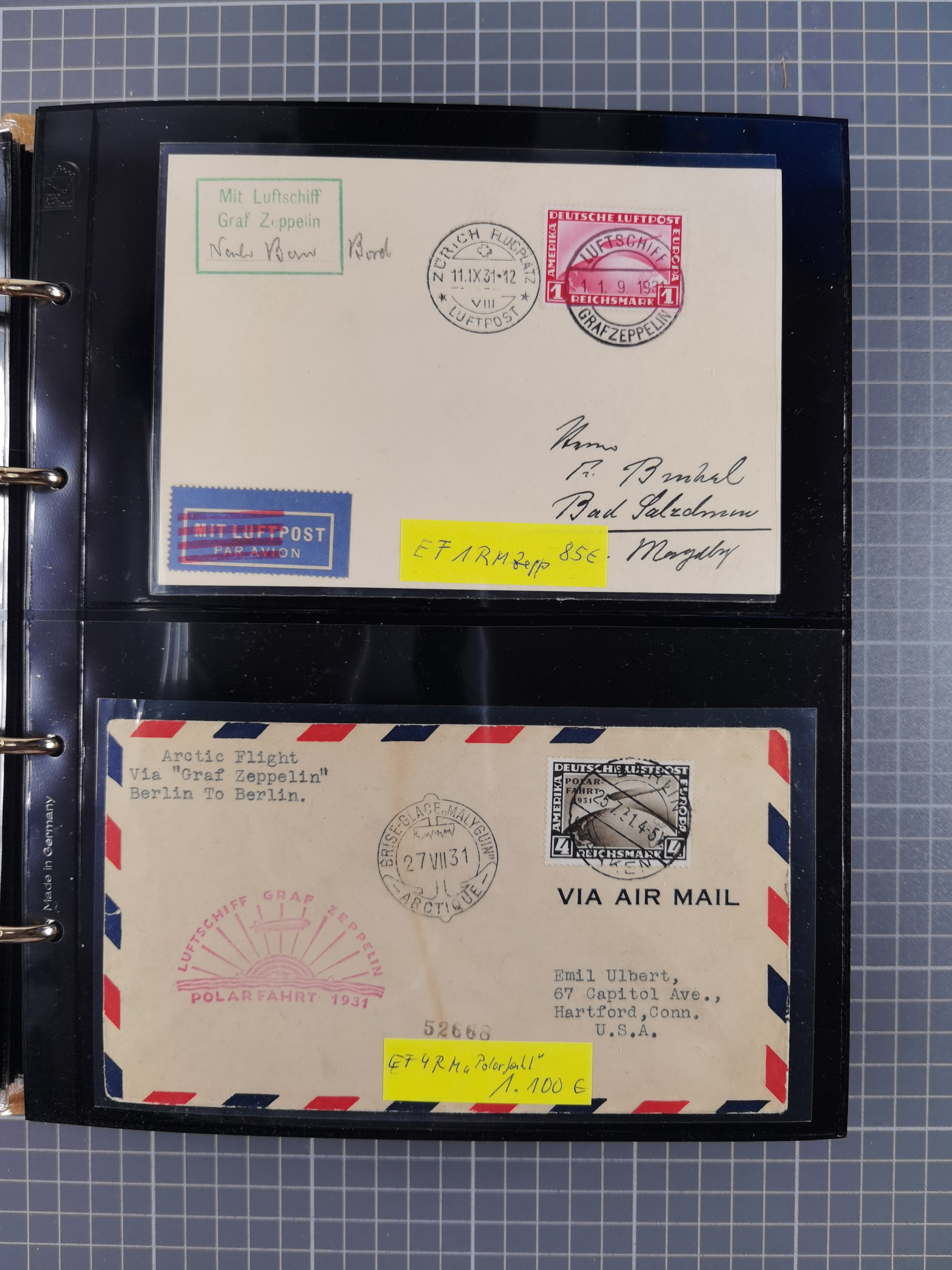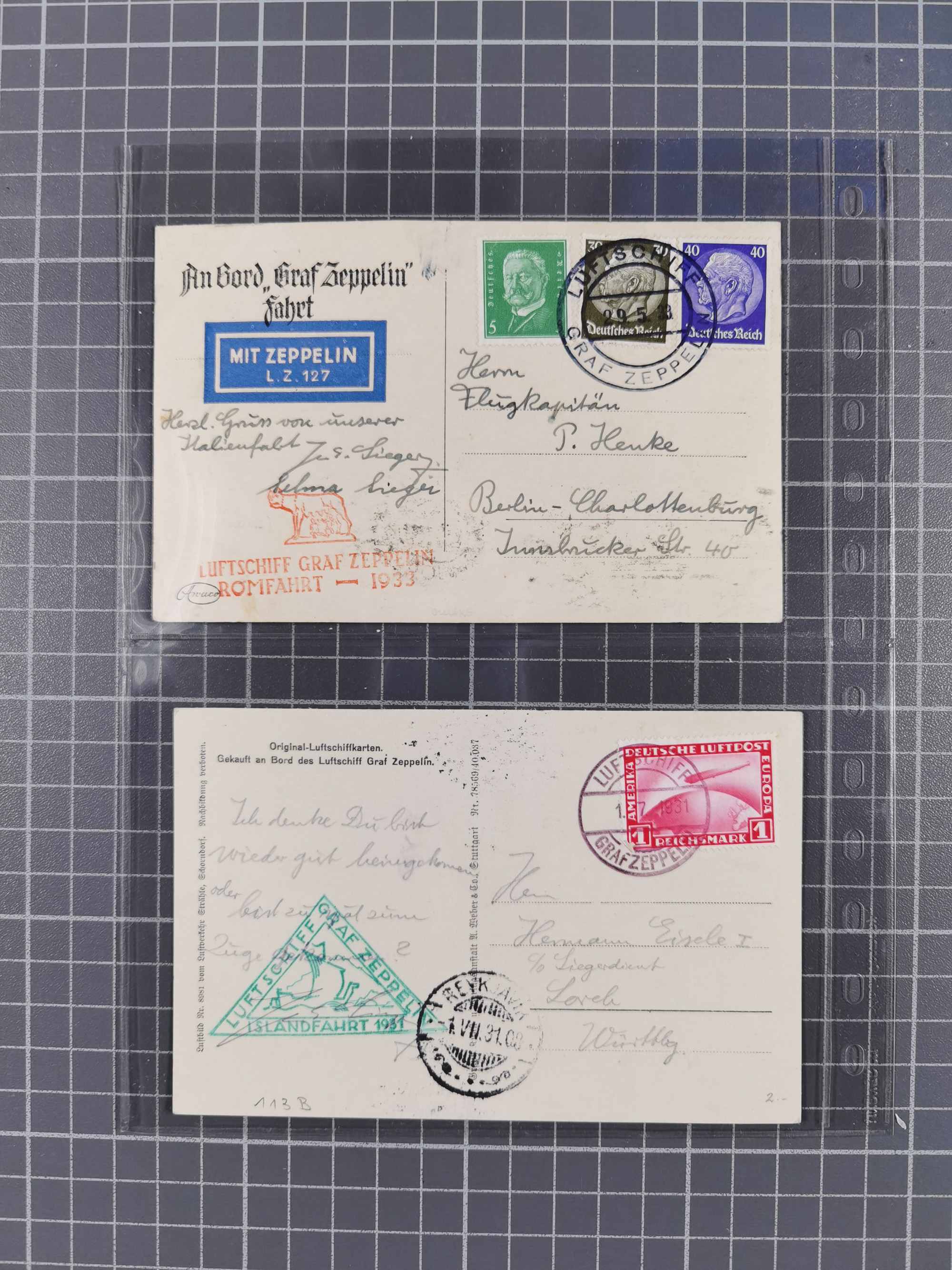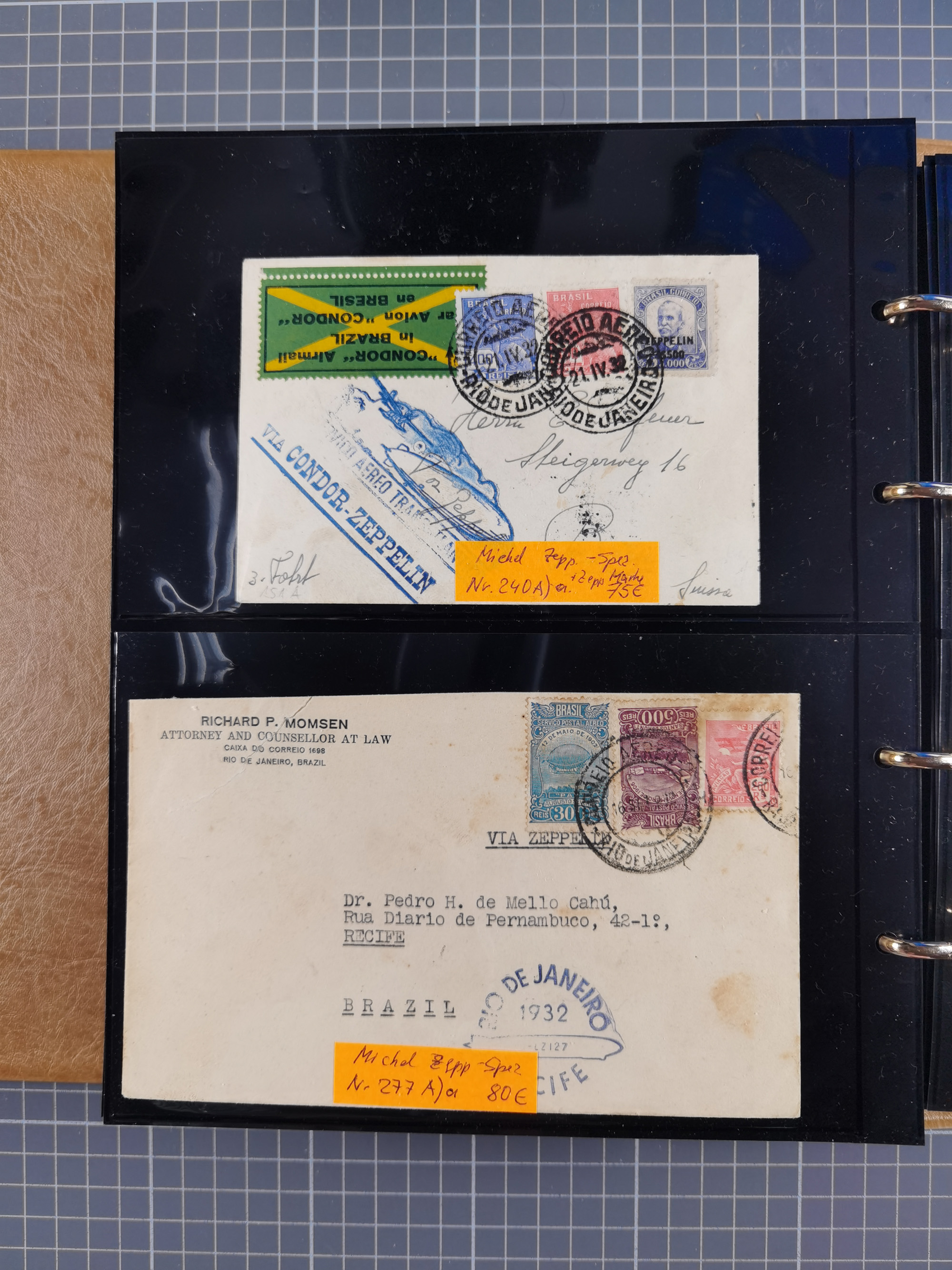 1913/36, Album mit 55 Zeppelinbriefen -Karten, (51 St. DR) dabei viele bessere Belege, u.a. DR großes Telegramm Luftschiff Hindenburg. Zeppelinkarte Viktoria Luise" und Hansa" (Sieger Nr. 4 und 6 II) Zeppelinbrief mit 1 und 2 RM Chicagofahrt!, Zeppelinkarte Nordpolarfahrt Zuleitung Niederlande. 2. SAF 1933, Zuleitung franz. Andorra, Zeppelin-Karte mit 2. SAF 1931 Hin- und Rückfahrt mit brasilianischer und deutscher Frankatur (2 x 1 RM Zeppelin) 10 Zeppelinbriefe/Karten mit 1.2 und 4 RM Zeppelin, meist gute Erhaltung