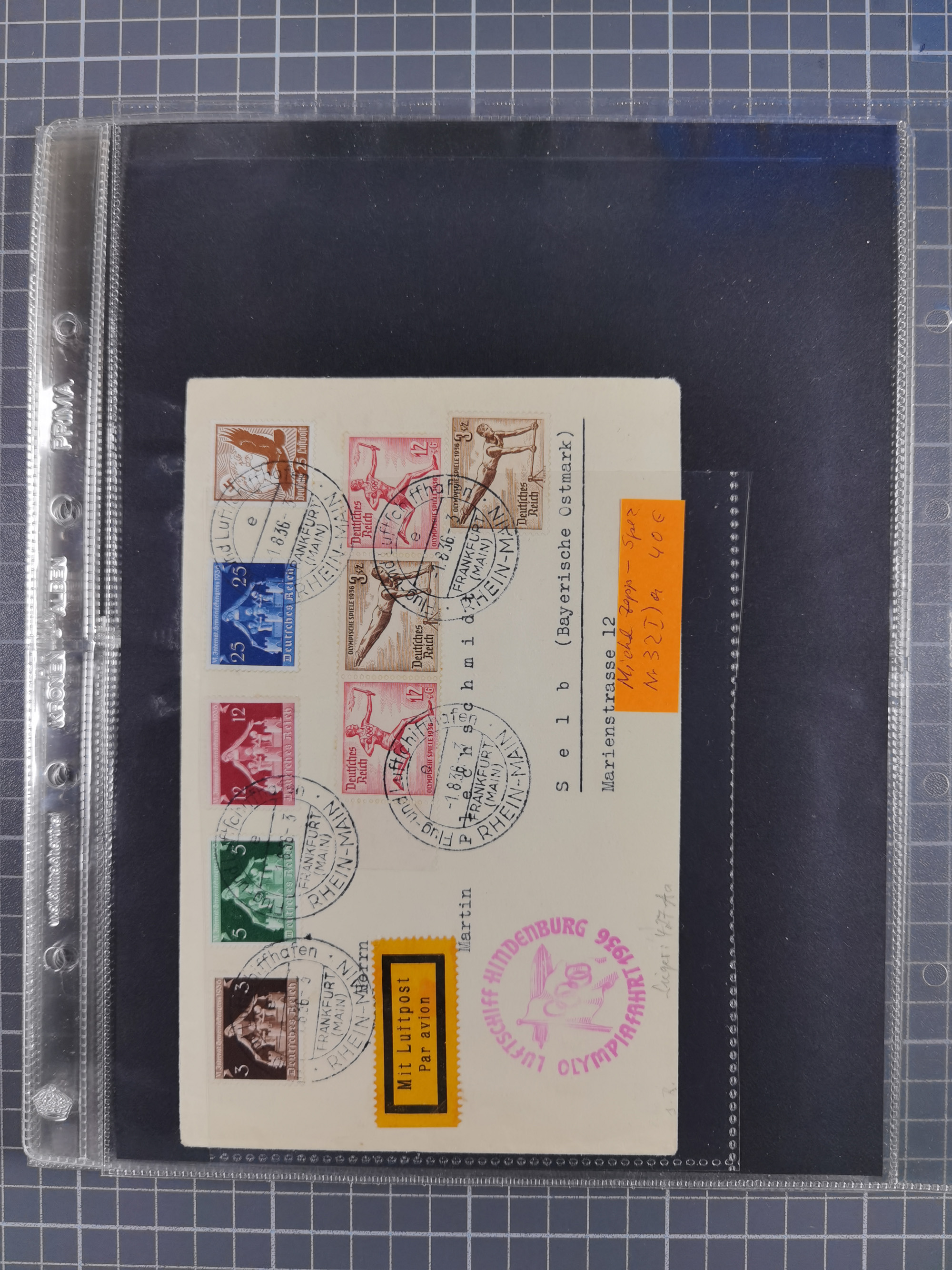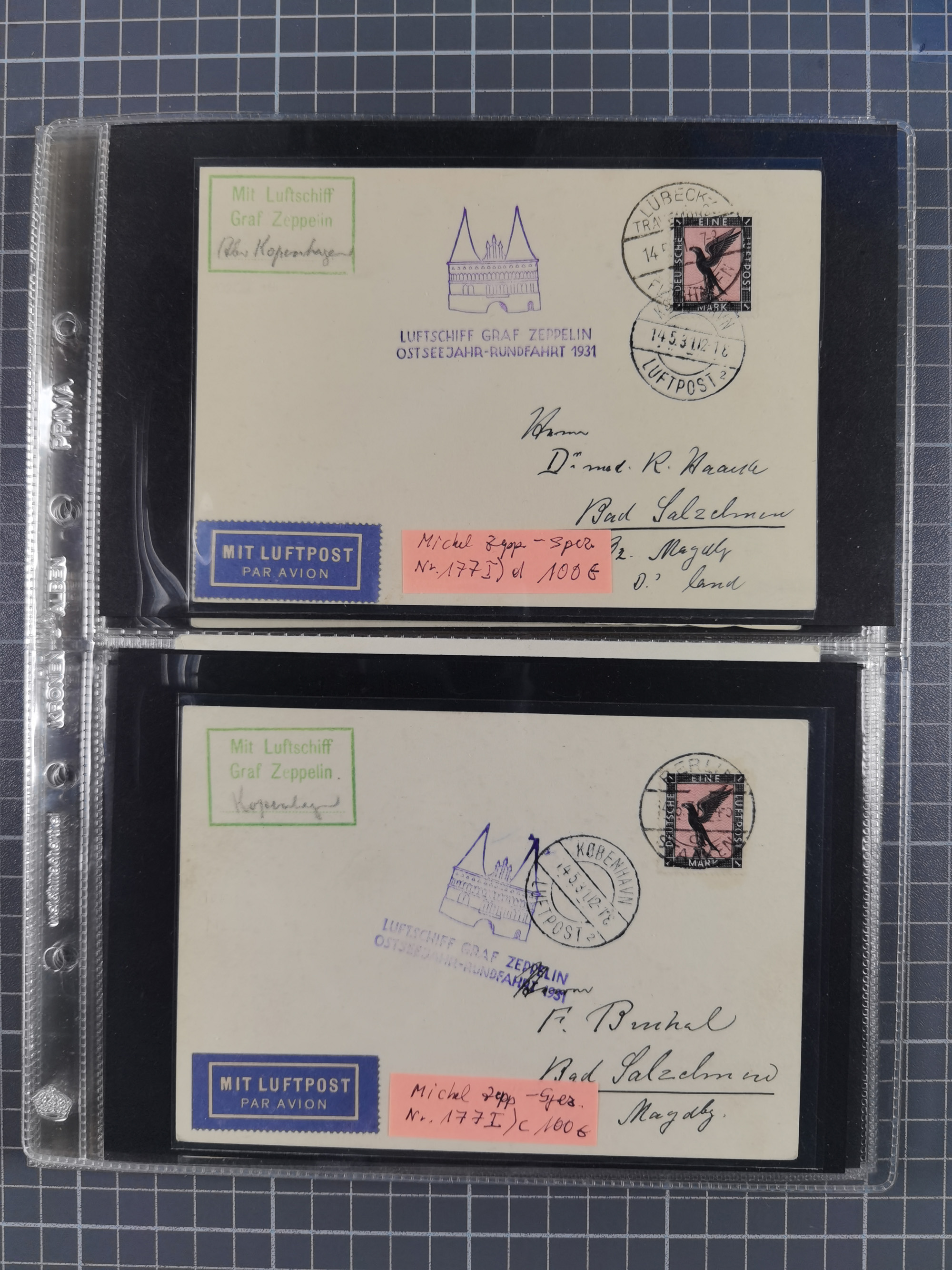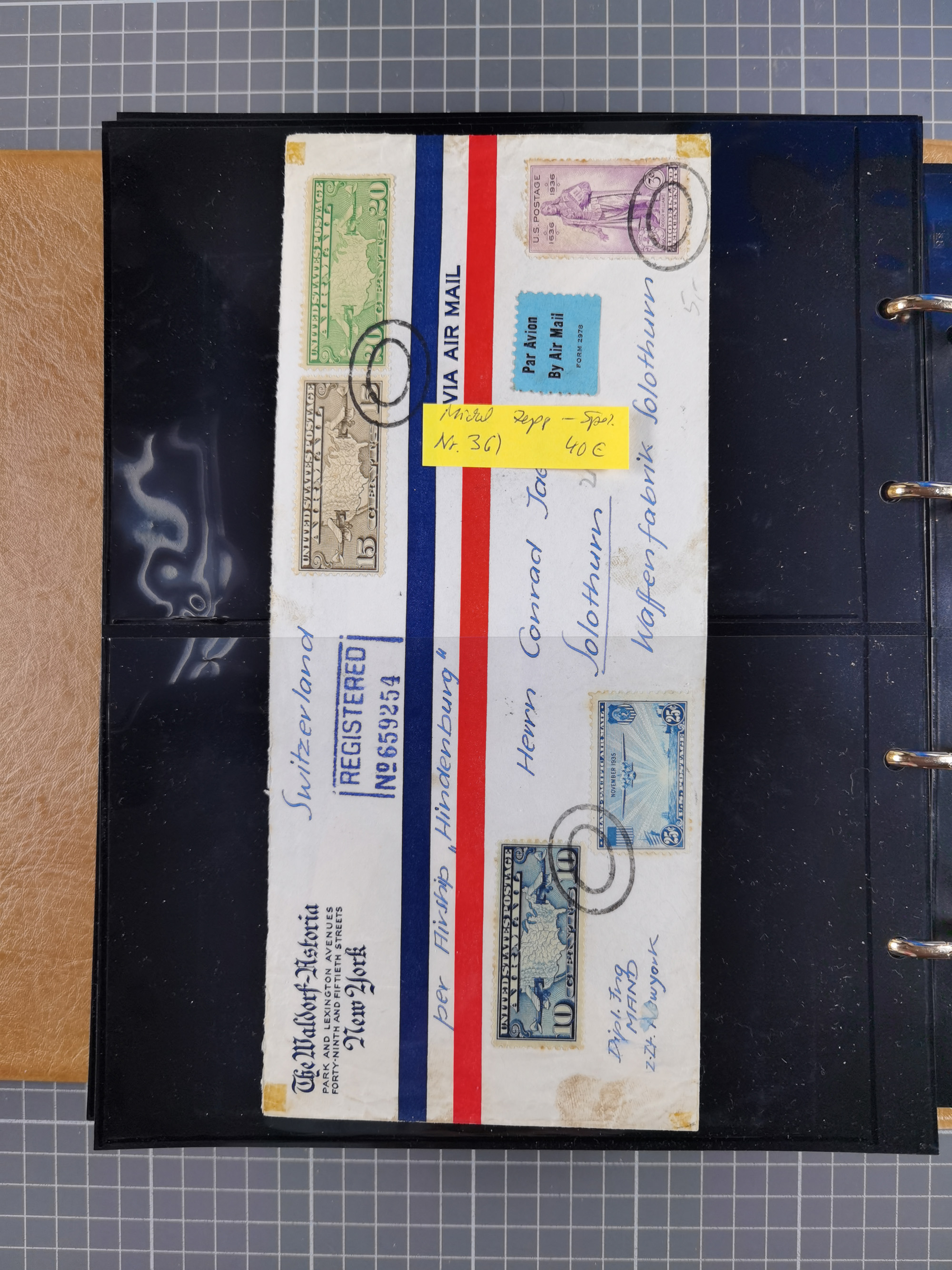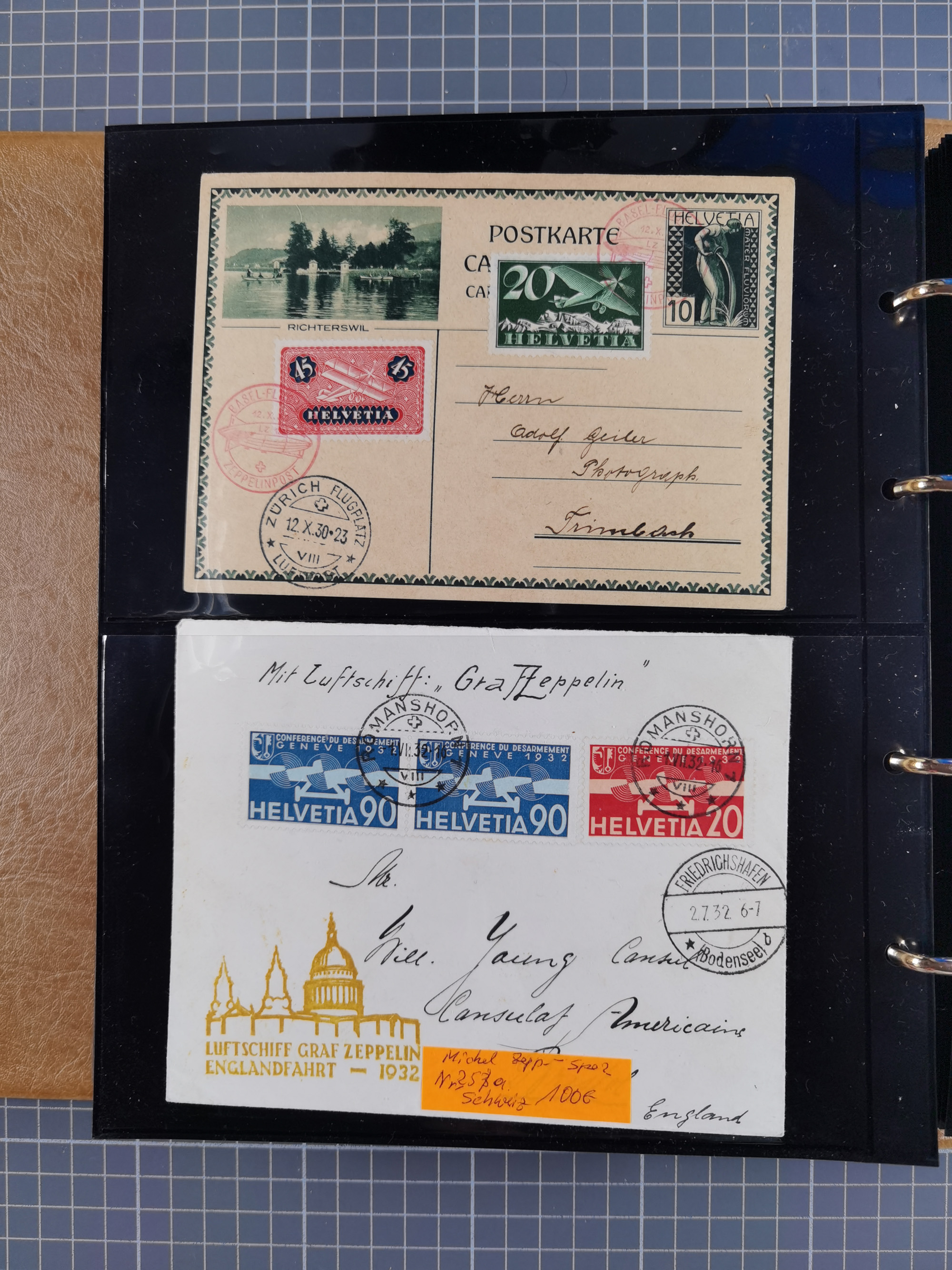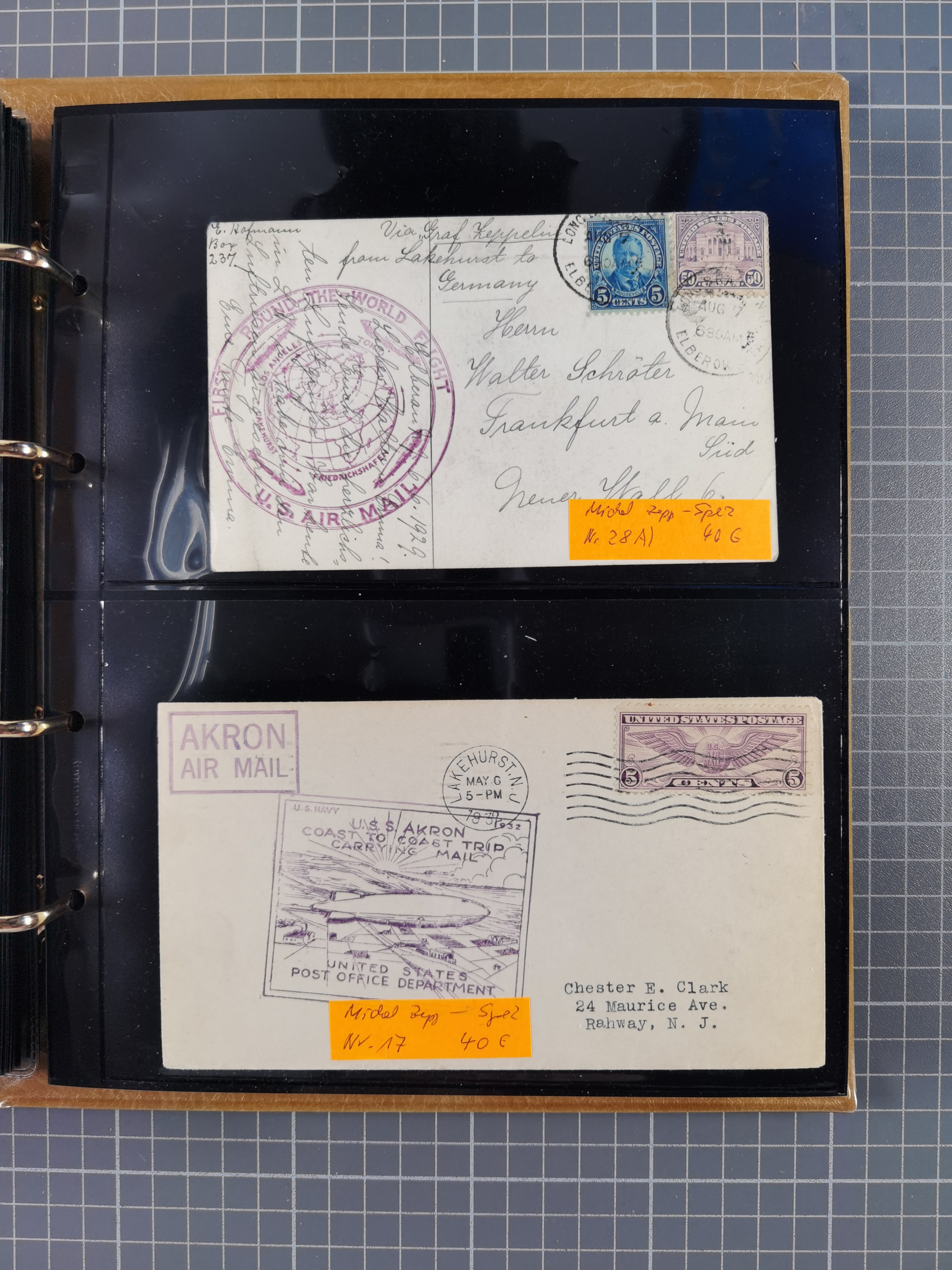 1913/36, Album mit 55 Zeppelinbriefen -Karten, (51 St. DR) dabei viele bessere Belege, u.a. DR großes Telegramm Luftschiff Hindenburg. Zeppelinkarte Viktoria Luise" und Hansa" (Sieger Nr. 4 und 6 II) Zeppelinbrief mit 1 und 2 RM Chicagofahrt!, Zeppelinkarte Nordpolarfahrt Zuleitung Niederlande. 2. SAF 1933, Zuleitung franz. Andorra, Zeppelin-Karte mit 2. SAF 1931 Hin- und Rückfahrt mit brasilianischer und deutscher Frankatur (2 x 1 RM Zeppelin) 10 Zeppelinbriefe/Karten mit 1.2 und 4 RM Zeppelin, meist gute Erhaltung