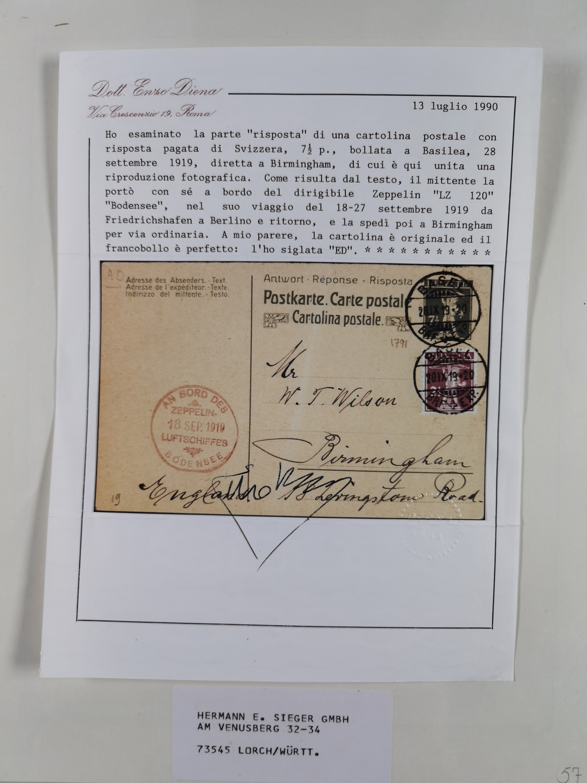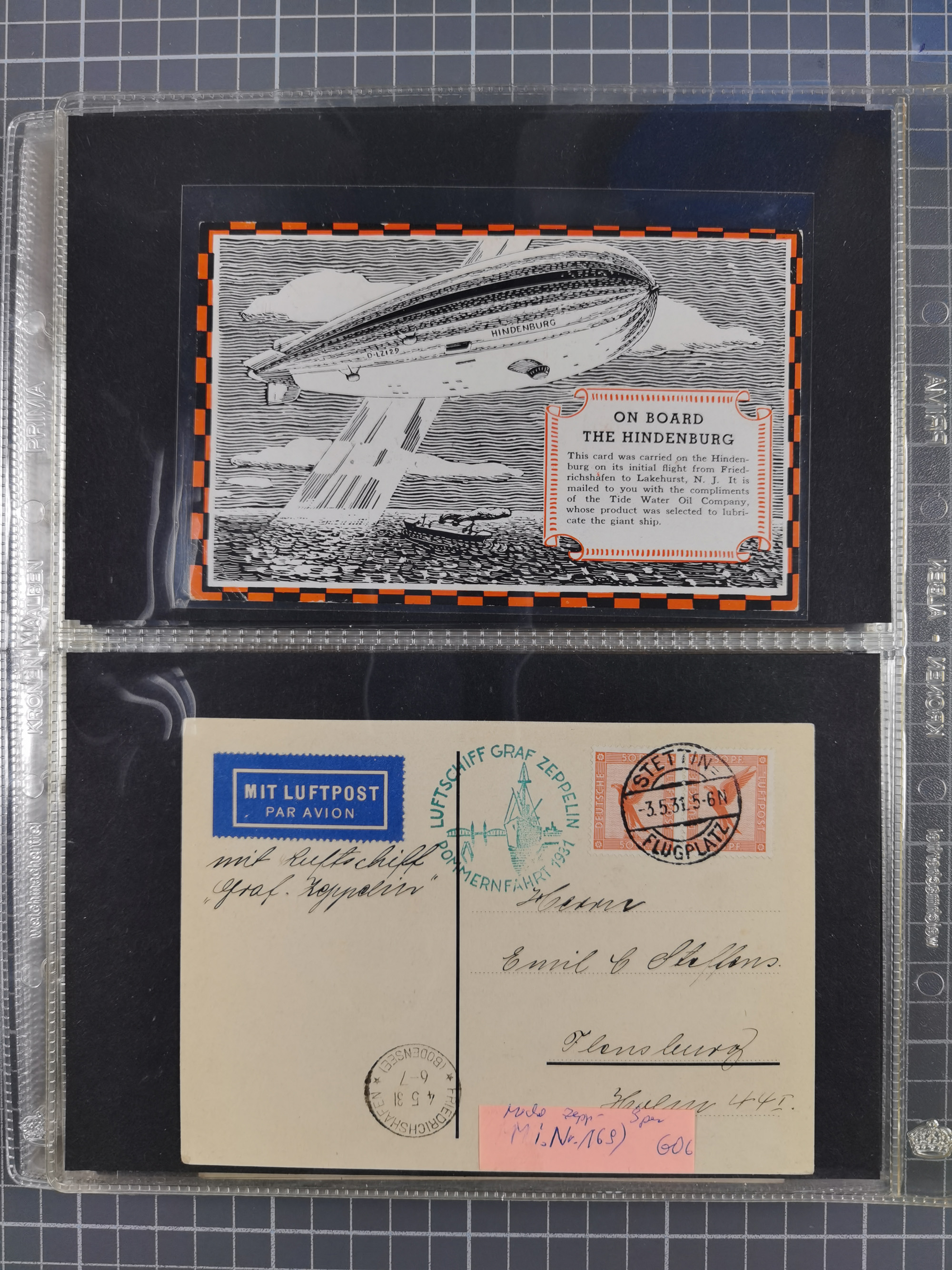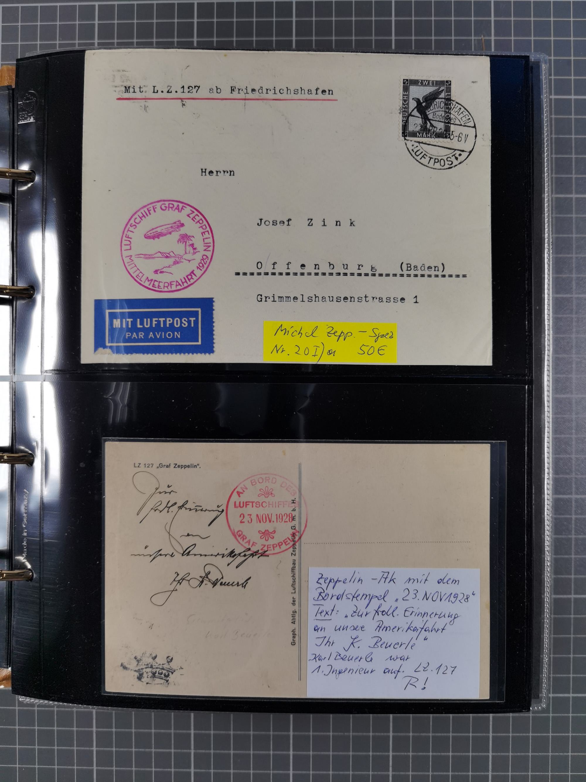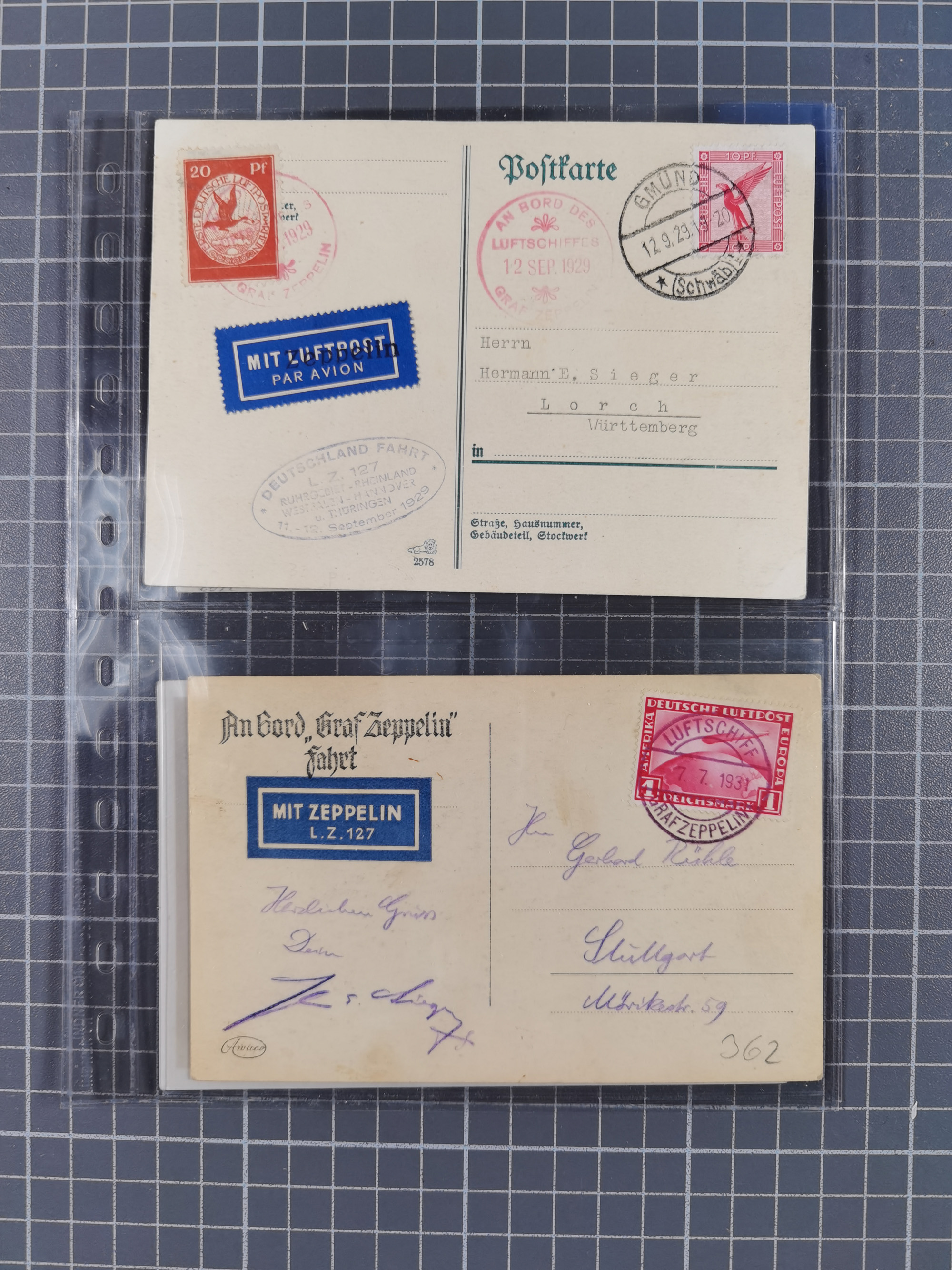 1929, 1. Amerikafahrt, Rückfahrt von Curs, Postkarte mit Frankreich 2 Fr. und Poststempel “PARIS 22.5.29” zugeleitet an das Luftschiff mit eigenhändiger Unterschrift von Dr. Eckener, Bordstempel vom 23.5.1929 und vorderseitigem Ankunftsstempel “FRIEDRICHSHAFEN LUFTPOST 24.MAI.29”. Dann Neuaufgabe mit Freimarke 5 Pfg. im Paar mit Stempel “FRIEDRICHSHAFEN 27.5.29” nach Paris befördert, in einwandfreier Erhaltung. Eine besonders attraktive Karte und seltenste Variante zur Dokumentation der Rückfahrt, es wurden nur 10 Karten in dieser Art befördert