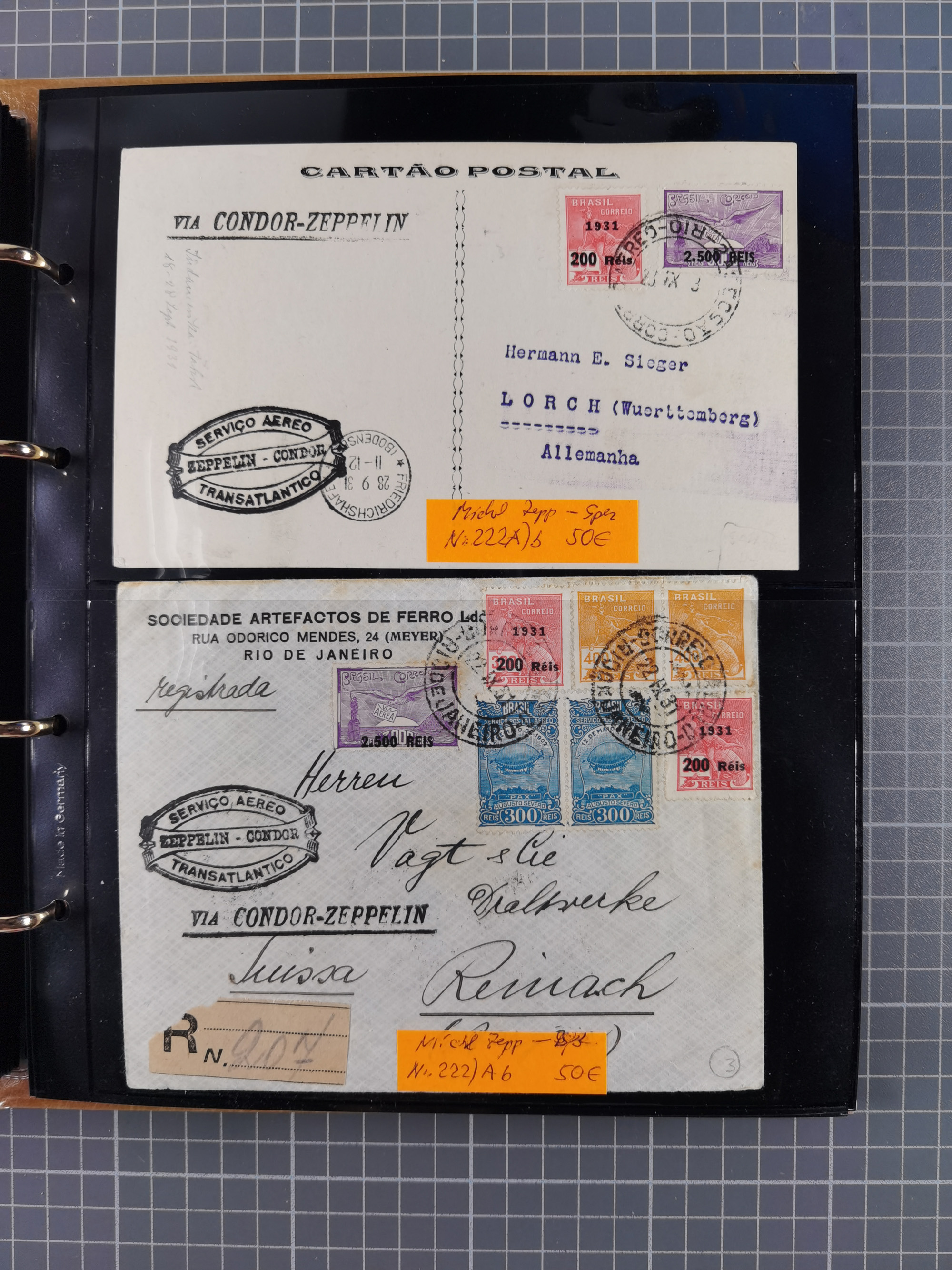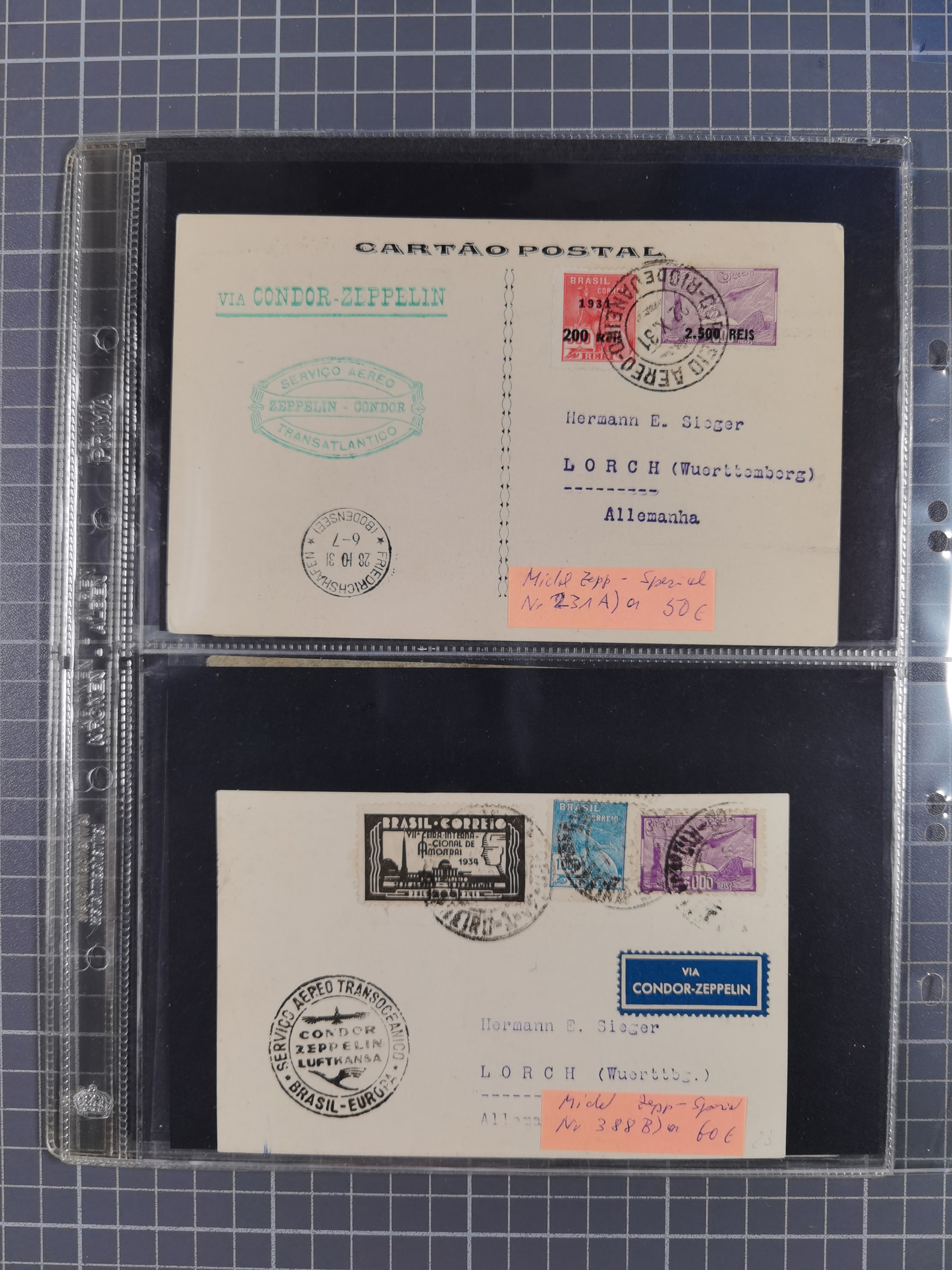 1931, 3. Südamerikafahrt, brasilianische Post, R-Karte von "PERNAMBUCO 22.X.31" mit u.a. Probedruck "2.500 auf 3000 Reis" der Zeppelin-Ausgabe via Friedrichshafen nach Lorch, adressiert an Selma Sieger. Der Probedruck hat größere und breitere Ziffern und es fehlt der Punkt zwischen "2" und "5" sowie das Wort "REIS" und ist in tadelloser Erhaltung. Altbekanntes Unikat und große Zeppelin-Seltenheit, bisher ist kein weiteres Exemplar bekannt, ausführliches Fotoattest Sieger A.I.E.P. (2007)