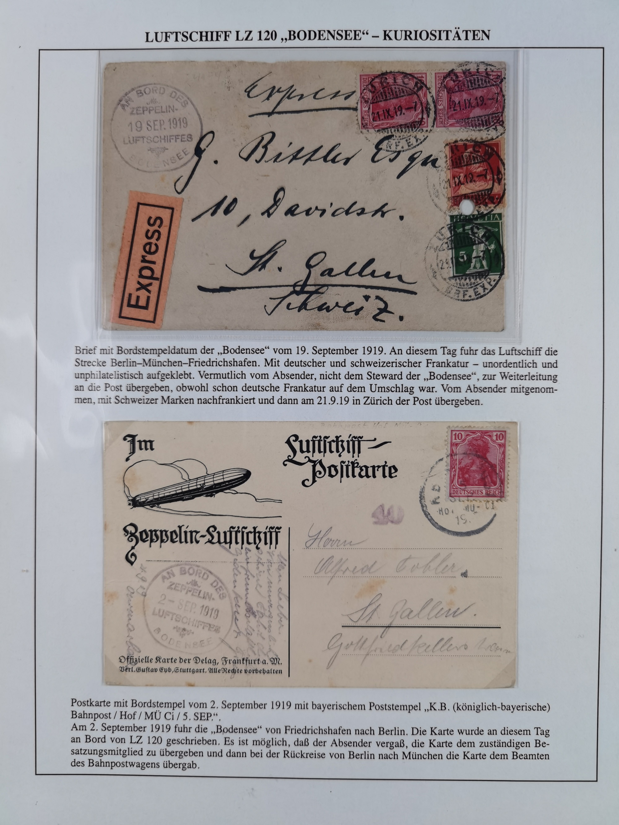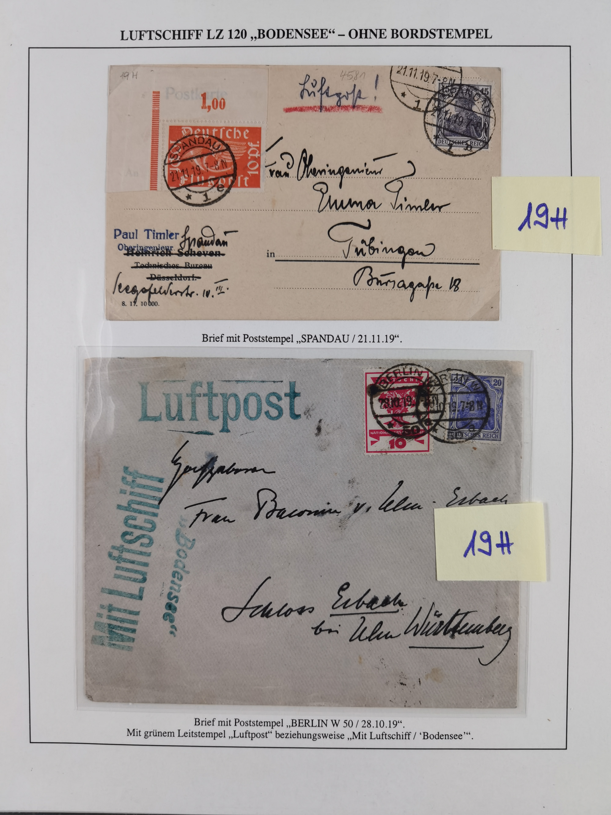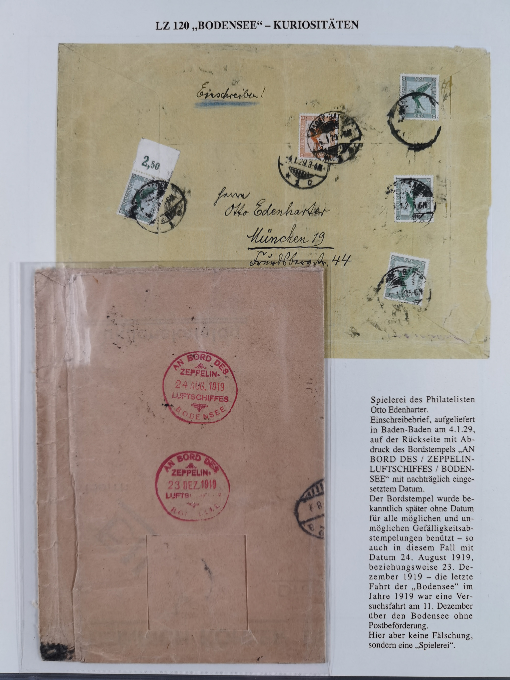 1919/1933, fast 30 Briefe und Karten mit Schwerpunkt bei der “Bodensee”-Post mit u.a. Sieger Nr. 19A, 19Ac, 19Ae, zwei fehlerhafte Briefe 19K (1x mit FA Sieger BPP), 33p und mehrere Karten 1931-33 mit Bordpoststempel, meist in guter Erhaltung