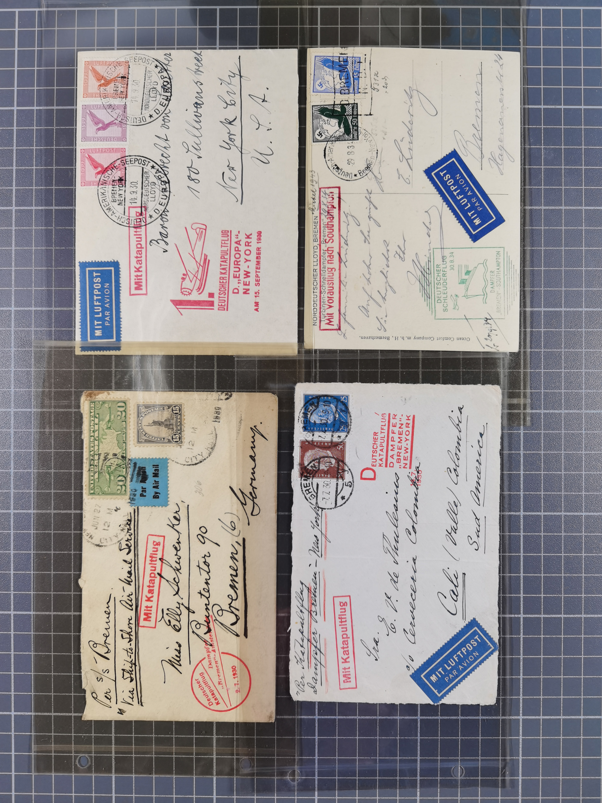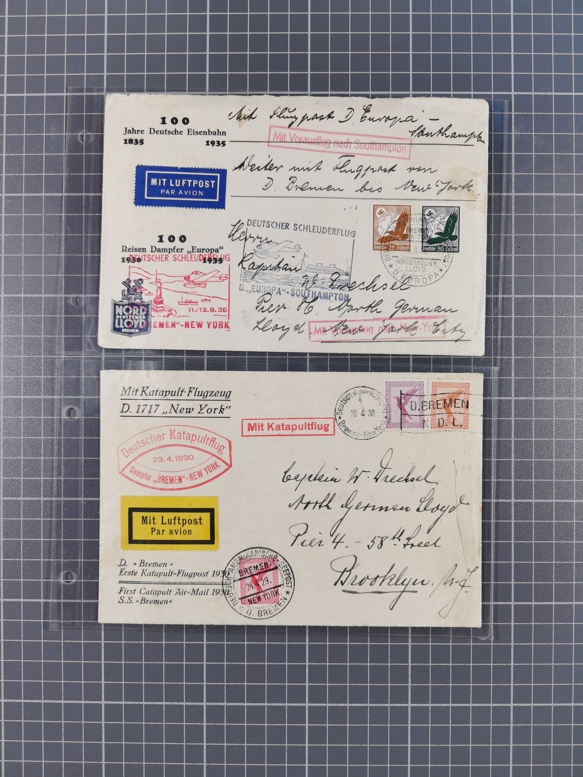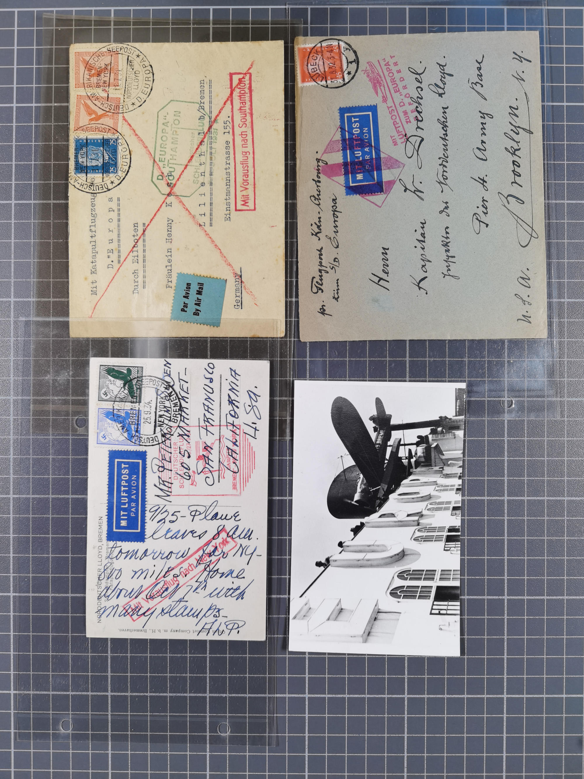 1935. D. Bremen 3.7., R-Brief mit u.a. OSTROPA-Block mit Sonderstempel “KÖNIGSBERG 26.6.35” via New York nach Akron mit Ankunftsstempel. Der Block ist etwas fleckig, aber mit der Block-Frankatur ein außergewöhnlicher Katapultpost-Brief