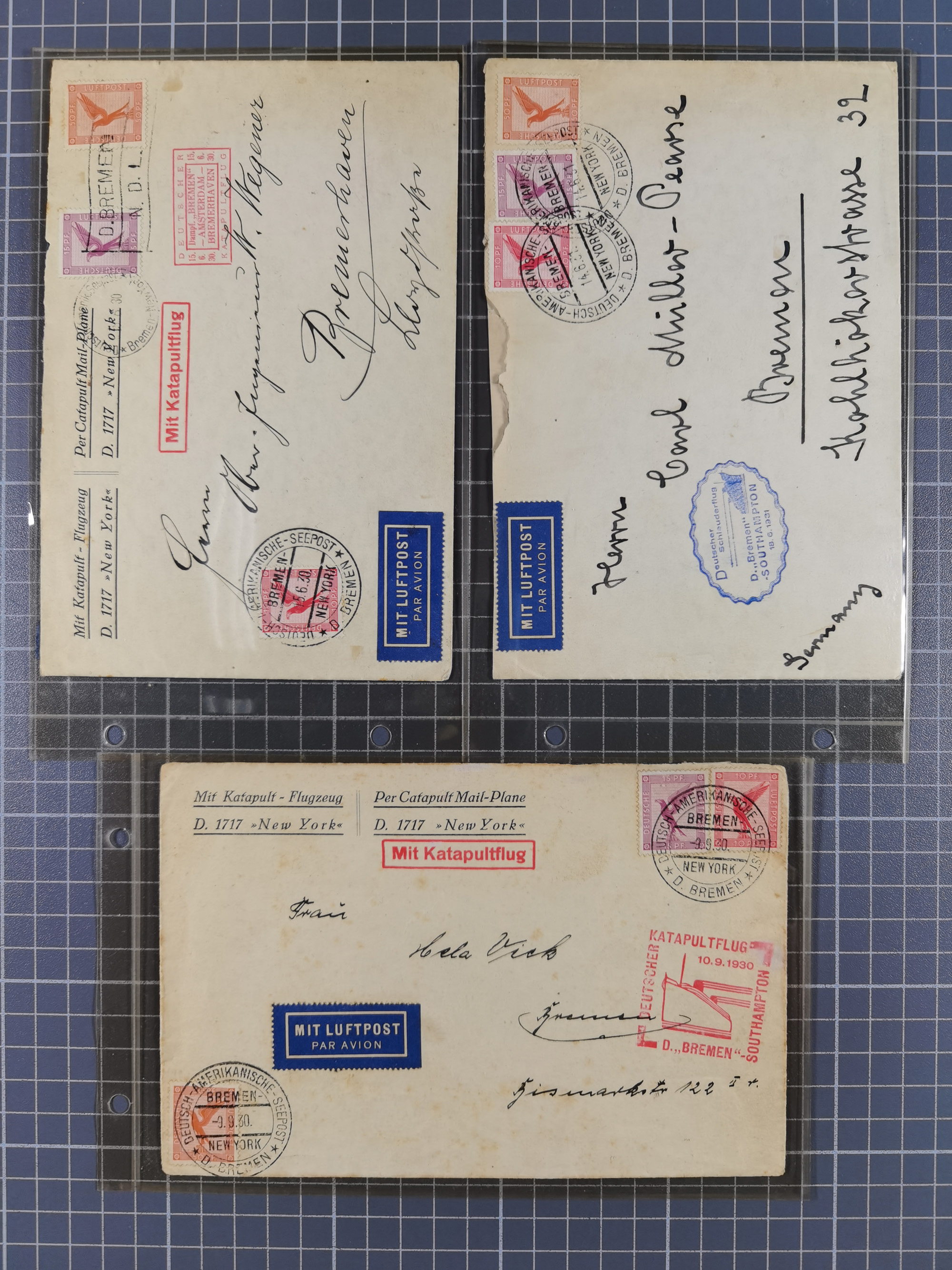 “LUFTPOST D. WESTFALEN 6.JUNI.1933” klar auf D. Reich Ganzsachenkarte 15 Pfg. mit violettem Ra3 “1. Flug vom Katapultdampfer Westfalen nach Südamerika” nach Natal mit vorderseitigem Ankunftsstempel. Wie immer ohne Text, in einwandfreier Erhaltung