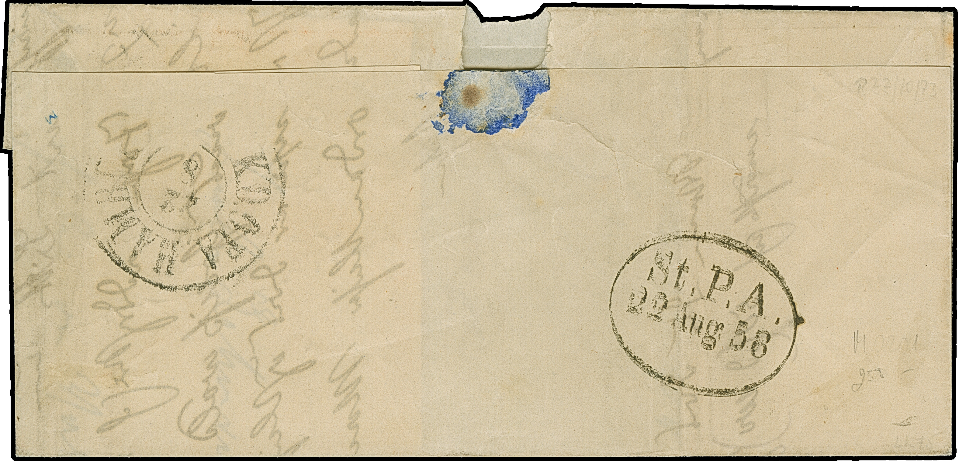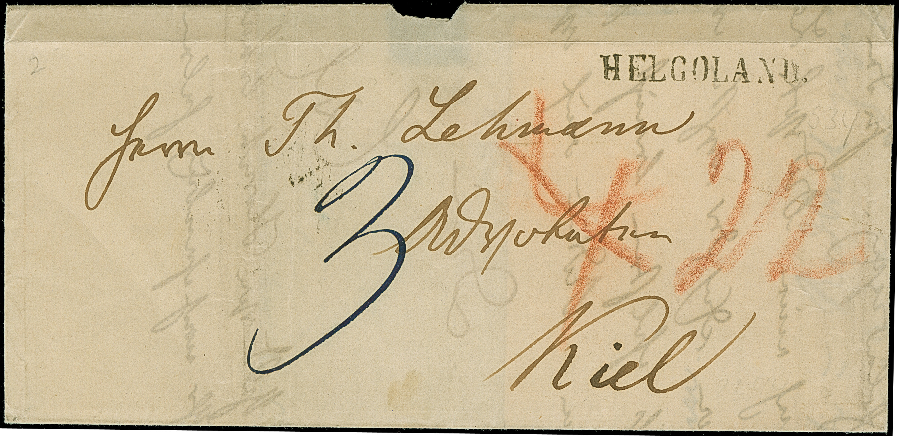 1853, "HELGOLAND." klarer Abschlag des Hamburger L1 auf Faltbriefhülle mit dänischem DKr. “K.D.O.P. HAMBURG 22/8” nach Kiel, insgesamt mit 22 (dänische Skilling) austaxiert, oben etwa umgefaltet, ein seltener und attraktiver Brief