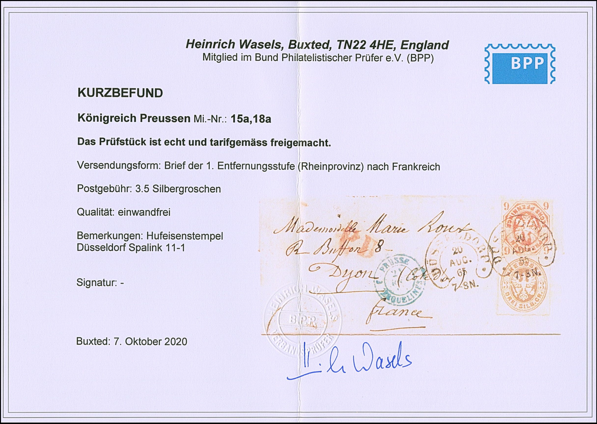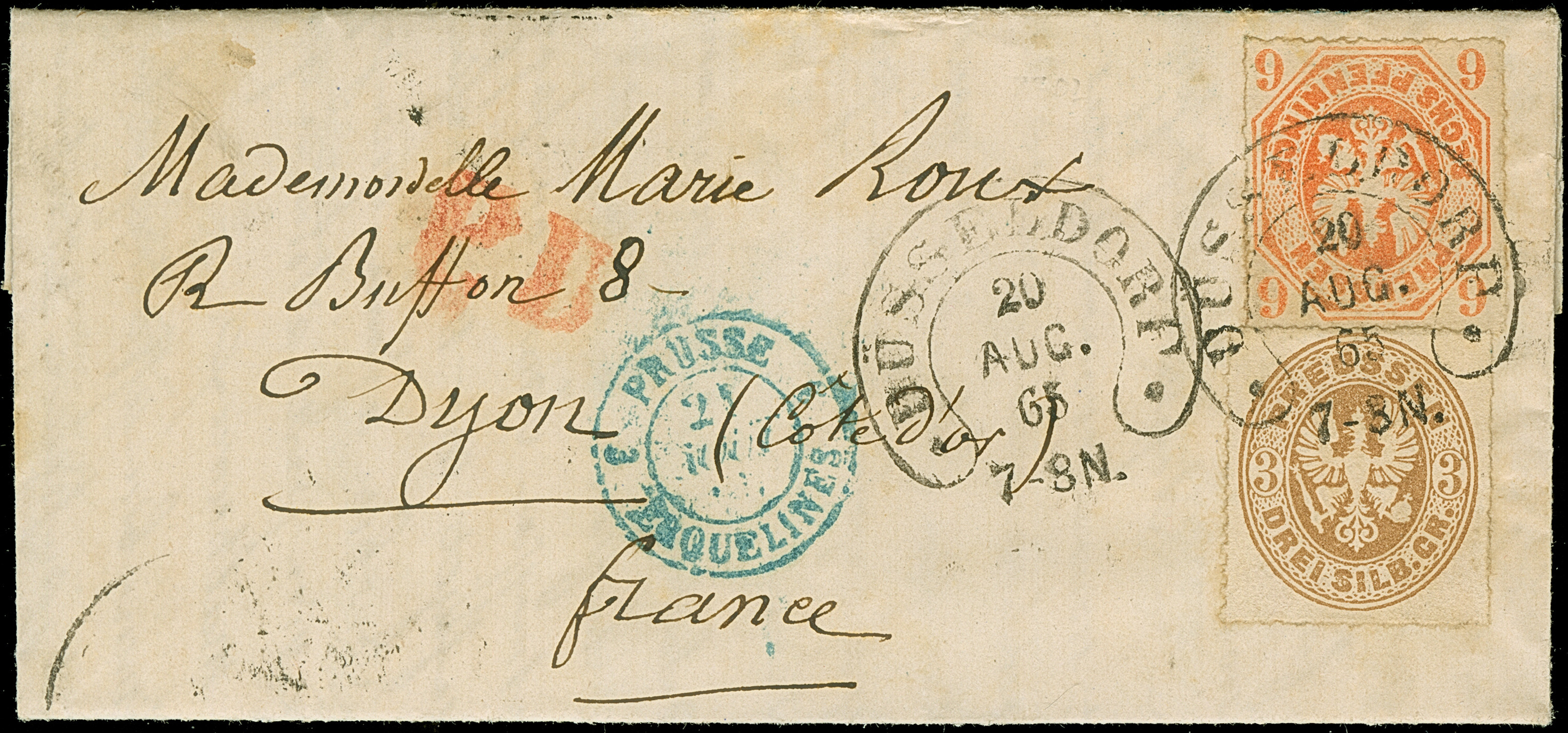 “DÜSSELDORF 20.AUG.65” (Spalink 11-1) sehr klar auf Preußen Wappen 6 Pfg. orange und 3 Sgr. hellbraun als tarifgerechte Frankatur auf komplettem Faltbrief mit rotem L1 “PD” und frz. Transitstempel nach Dijon mit Ankunftsstempel, in einwandfreier Erhaltung. Ein dekorativer Brief im kleinen Format in der 1. Entfernungsstufe nach Frankreich, Kurzbefund Wasels BPP (2020)