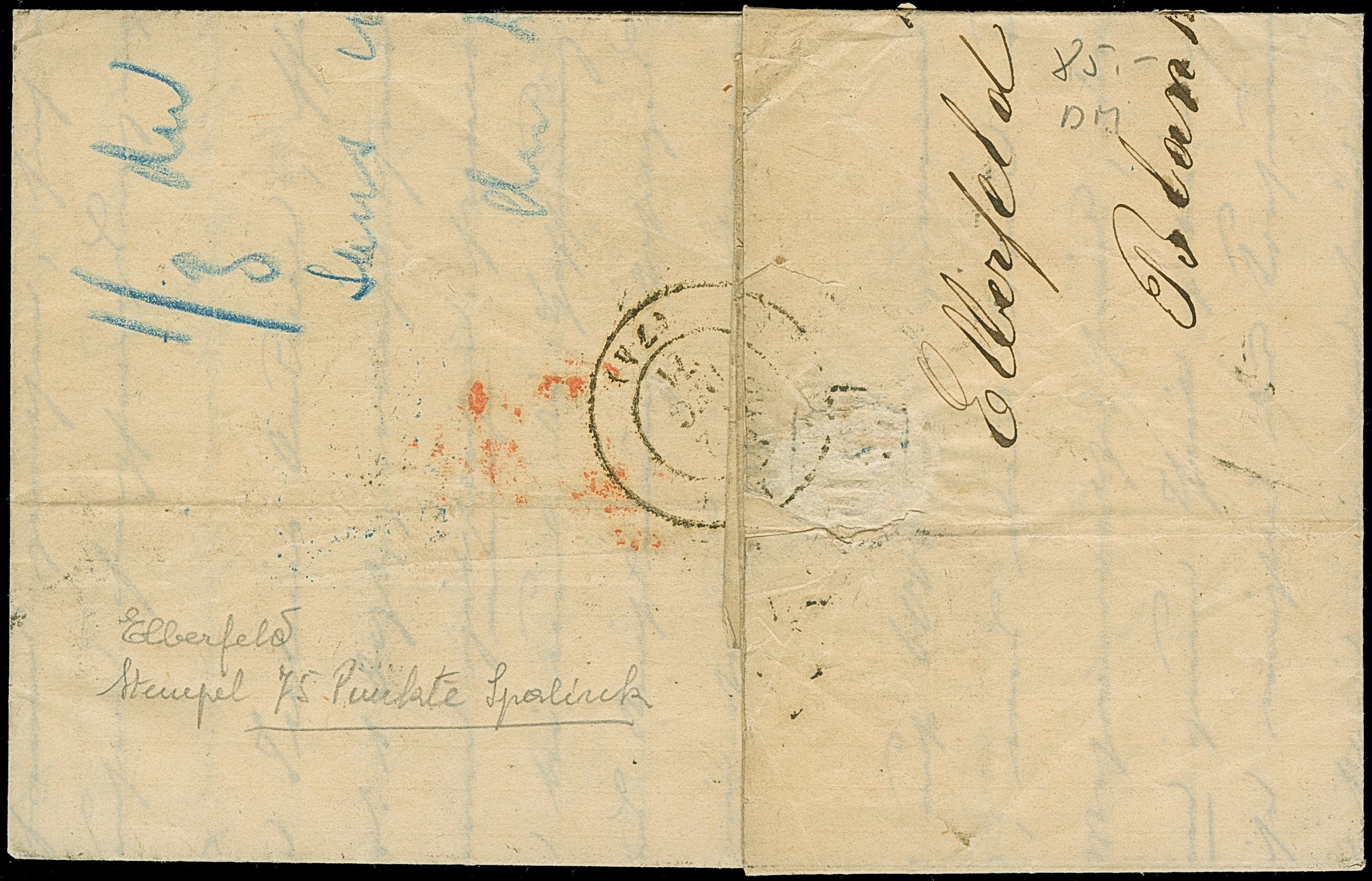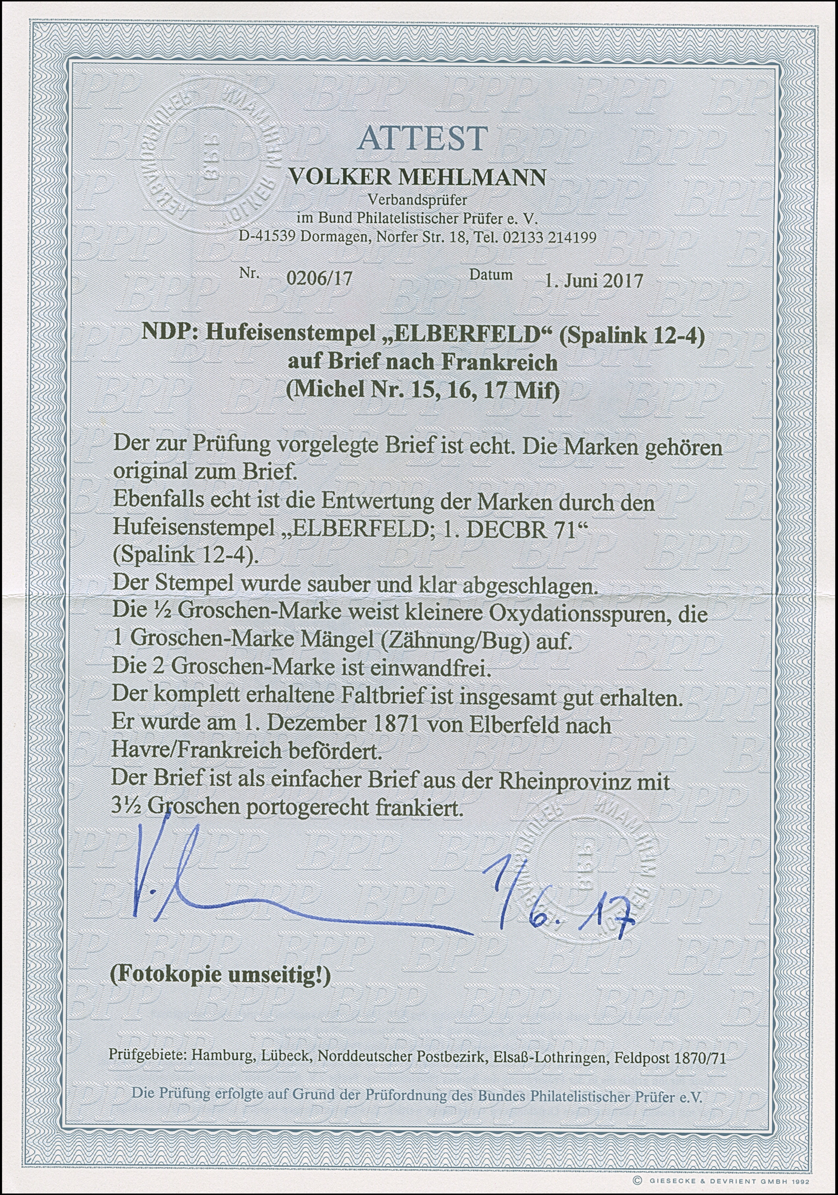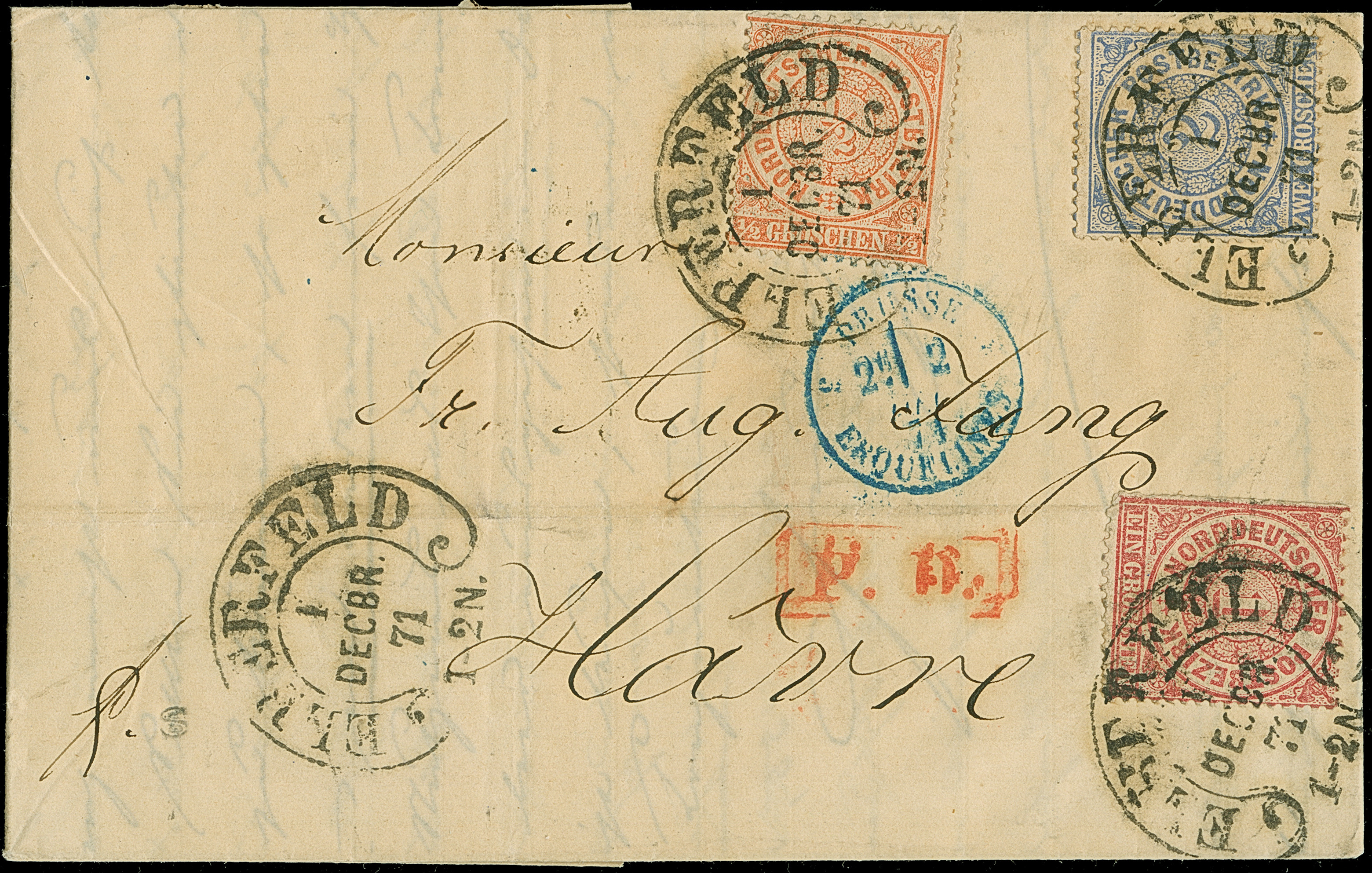 “ELBERFELD 1.DECBR.71” (Spalink 12-4) mehrfach klar auf Norddeutscher Postbezirk ½ Gr., 1 Gr. und 2 Gr. gezähnt als tarifgerechte Frankatur auf komplettem Faltbrief mit rotem Ra1 “P.D.” und frz. Transitstempel nach Havre mit Ankunftsstempel. Die 1 Gr.-Marke ist etwas fehlerhaft und die ½ Gr.-Marke mit winzigen Oxidationsspuren, ansonsten in guter Erhaltung, Fotoattest Mehlmann BPP (2017)