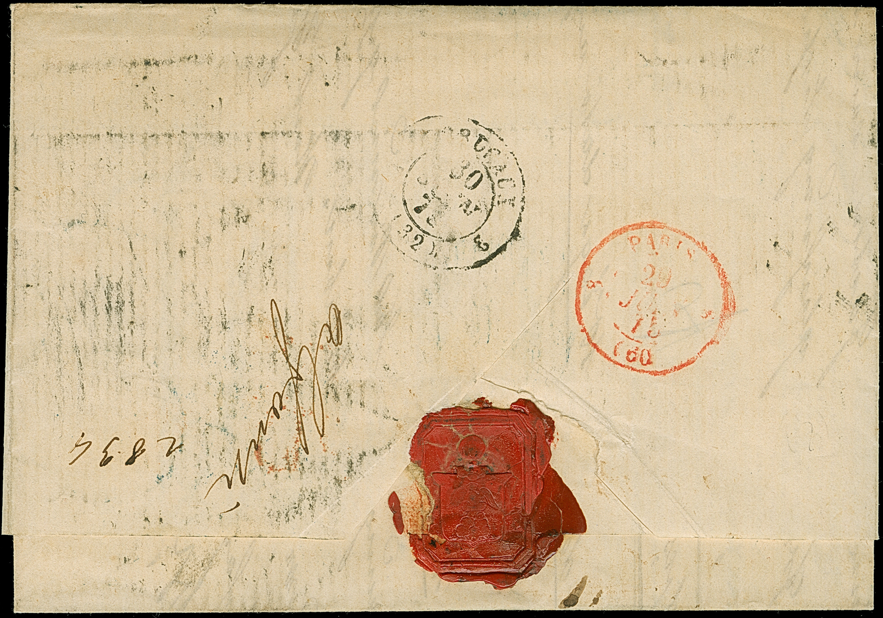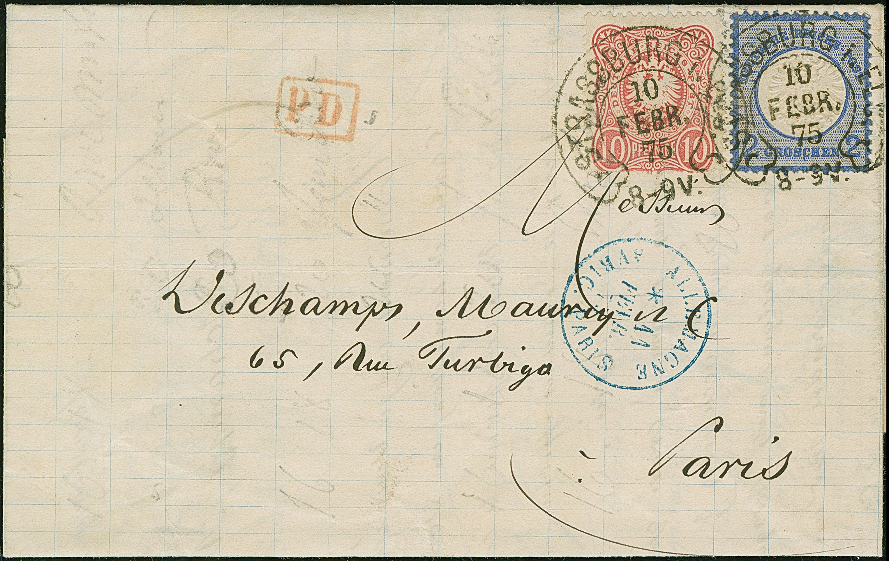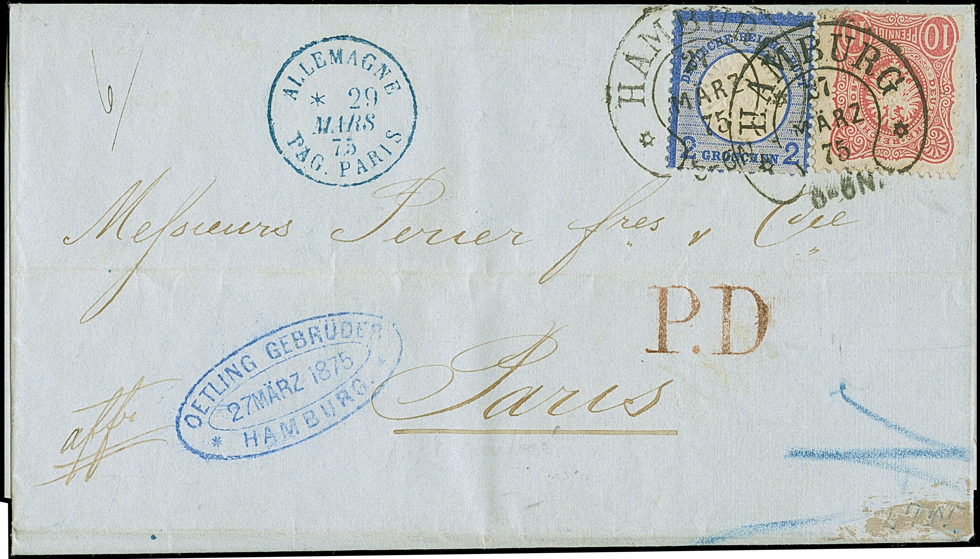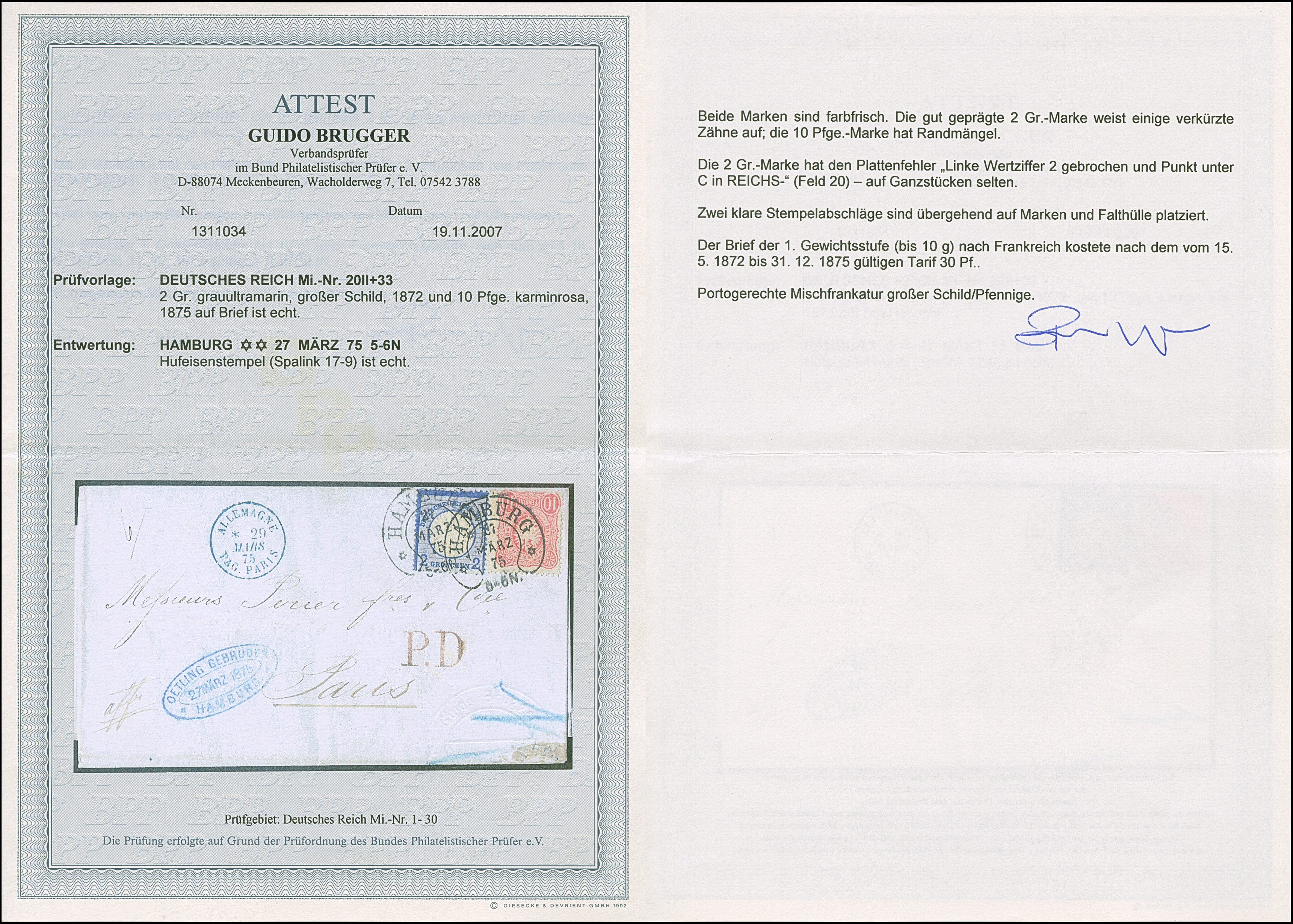 “HAMBURG 27.MÄRZ.75” (Spalink 17-9) zweimal klar auf kleiner Schild 2 Gr. grauultramarin mit Plattenfehler “linke Wertziffer 2 gebrochen und Punkt unter C in REICHS” (Feld 20) und 10 Pfge karminrosa als tarifgerechte Frankatur auf komplettem Faltbrief mit rotem L1 “P.D” und frz. Transitstempel nach Paris. Die farbfrische Brustschild-Marke ist gut geprägt und hat einige verkürzte Zähne, die 10 Pfge-Marke hat Randfehler, ansonsten in guter Erhaltung. Eine dekorative Mischfrankatur, Fotoattest Brugger BPP (2007)