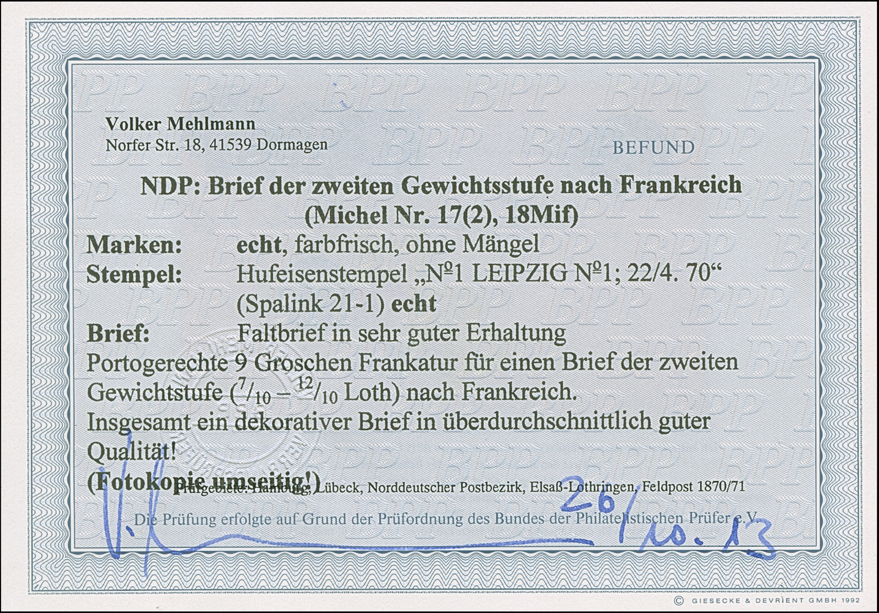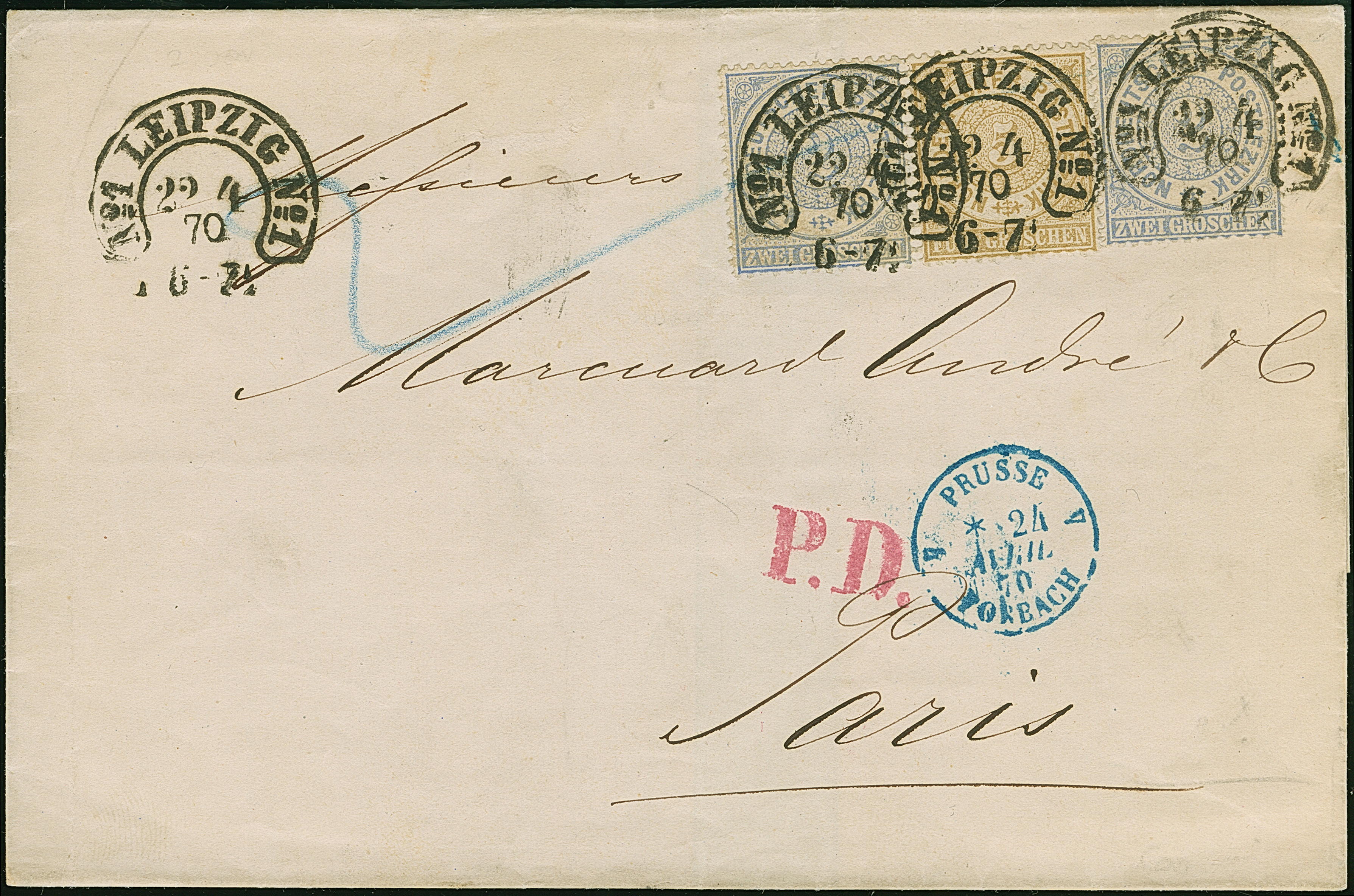 “LEIPZIG No. 1 22.4.70” (Spalink 21-1) mehrfach klar auf zwei Einzelmarken Norddeutscher Postbezirk 2 Gr. und Einzelmarke 5 Gr. gezähnt auf Faltbriefhülle der 2. Gewichtsstufe mit rotviolettem L1 “P.D.” und frz. Transitstempel nach Paris. Die farbfrischen Marken sind wie die Briefhülle in einwandfreier Erhaltung. Eine dekorative und nicht häufige 9 Groschen-Frankatur mit Destination Frankreich, Fotobefund Mehlmann BPP (2013)
