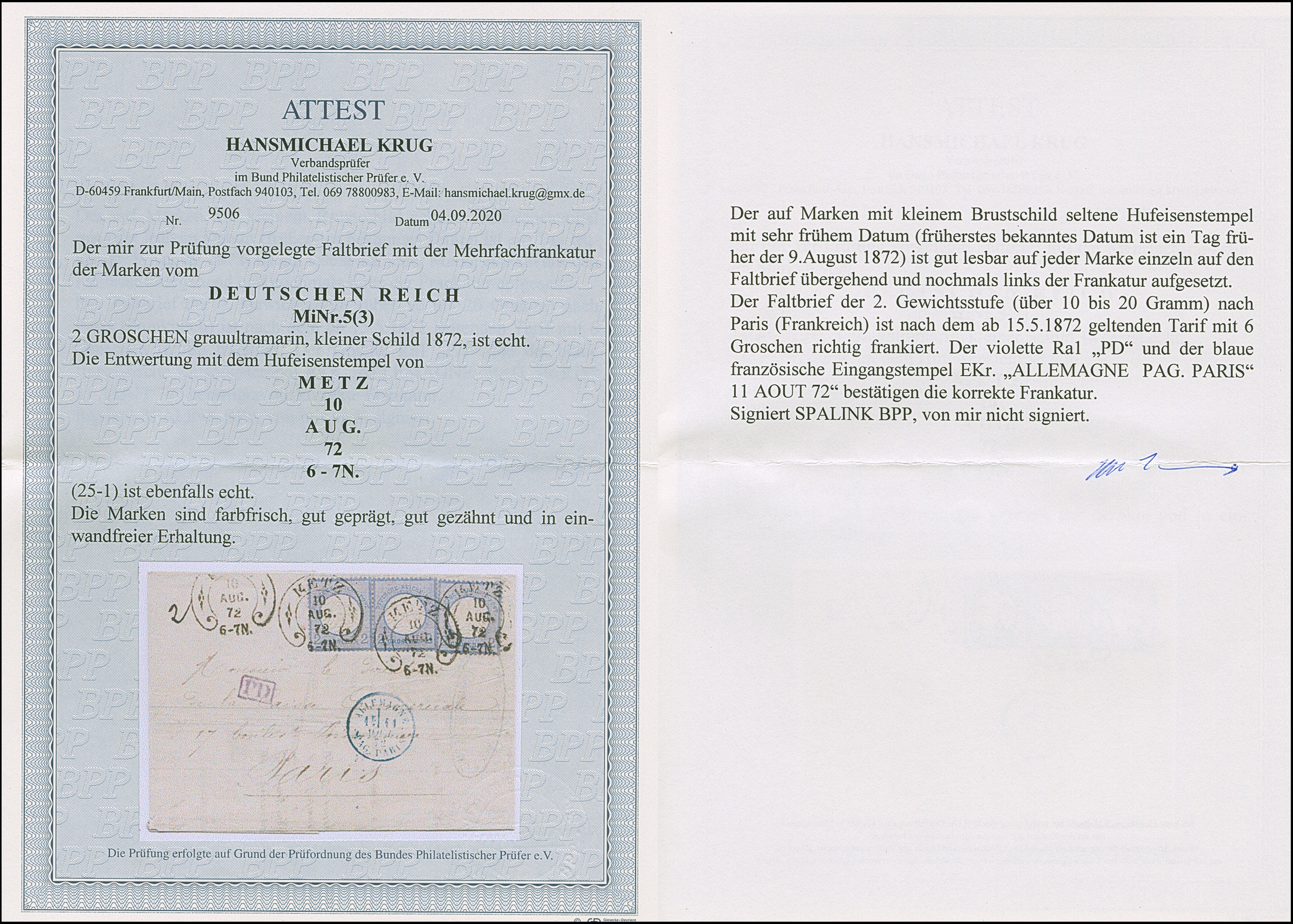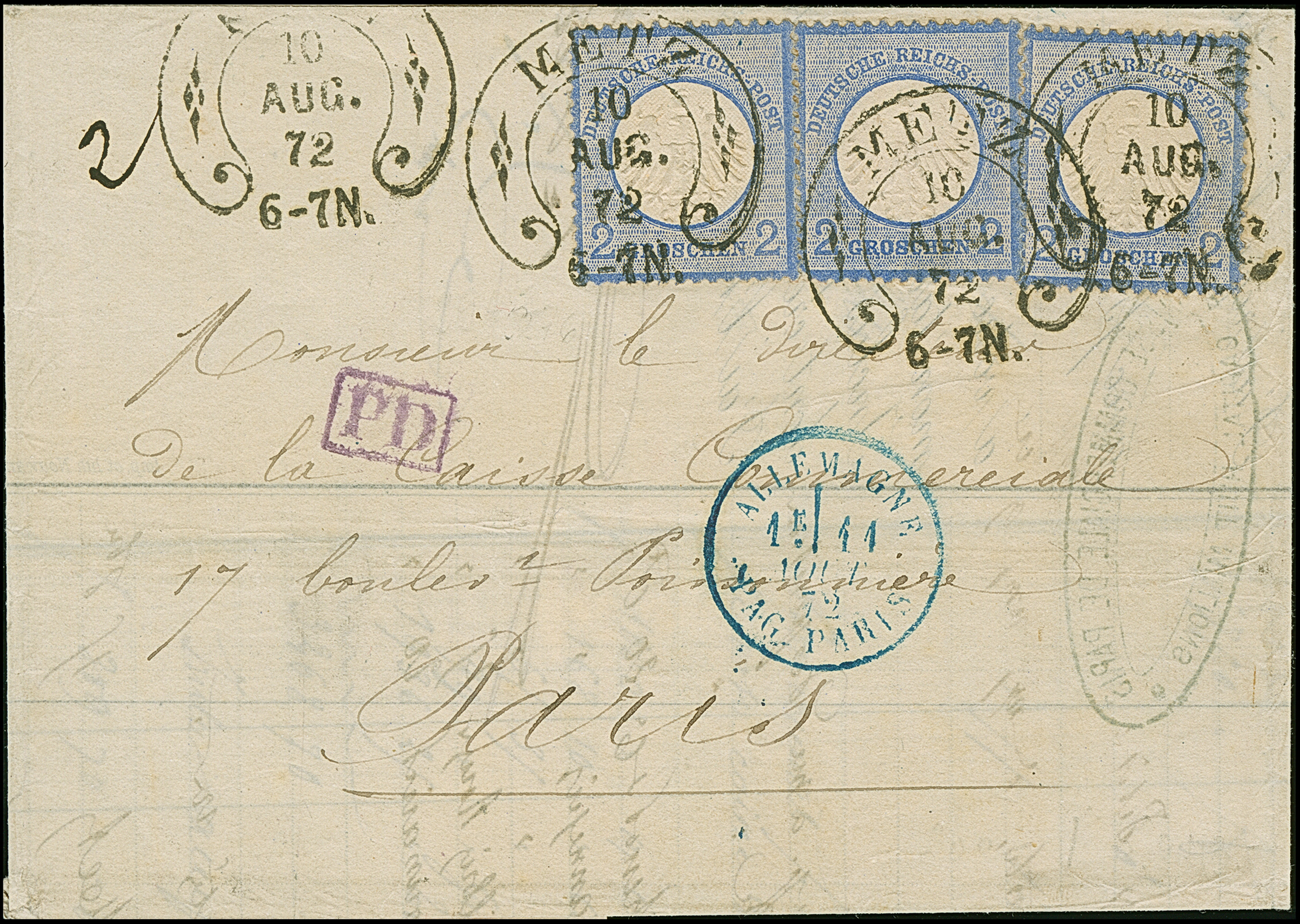 “METZ 10.AUG.72” (Spalink 25-1) mehrfach klar auf drei Einzelmarken kleiner Schild 2 Gr. grauultramarin als tarifgerechte Mehrfachfrankatur auf komplettem Faltbrief mit violettem Ra1 “PD” und frz. Transitstempel nach Paris. Die farbfrischen Marken sind gut geprägt, gut gezähnt und wie der Faltbrief in einwandfreier Erhaltung. Eine dekorative Mehrfachfrankatur mit früher Verwendung des besseren Hufeisenstempels, Fotoattest Krug BPP (2020)