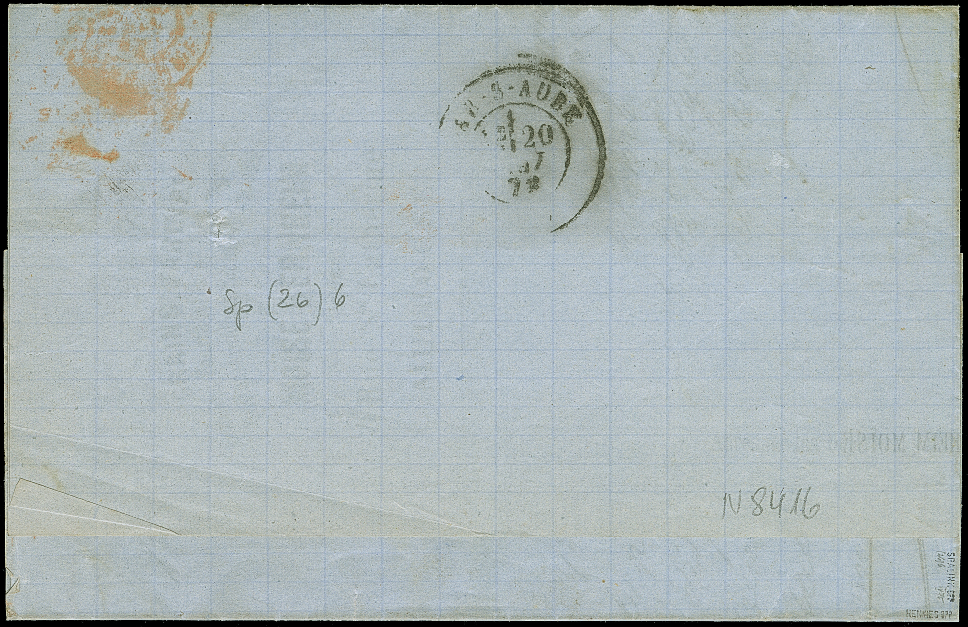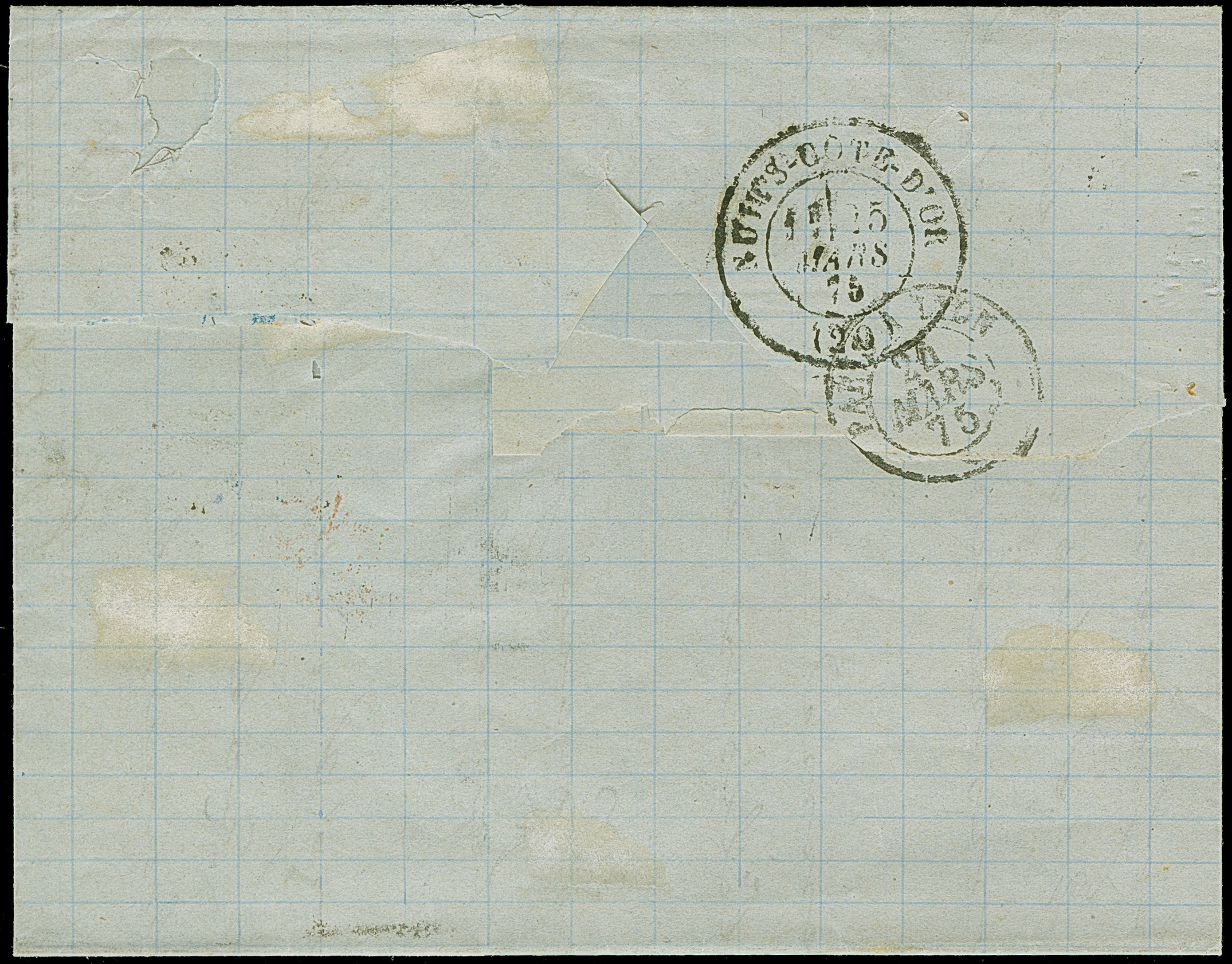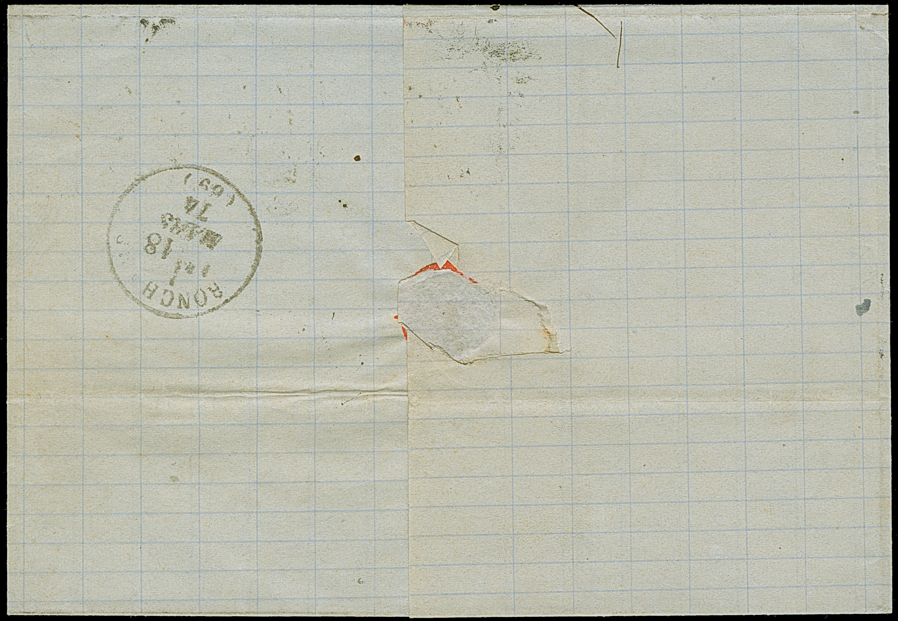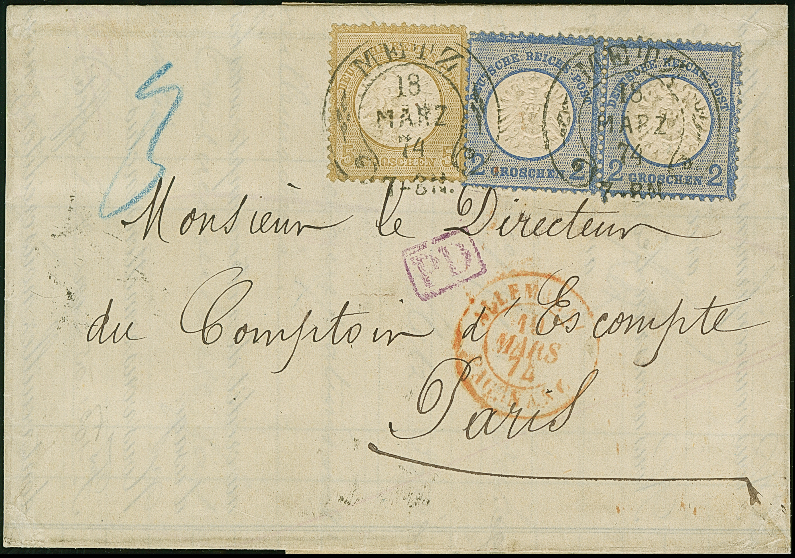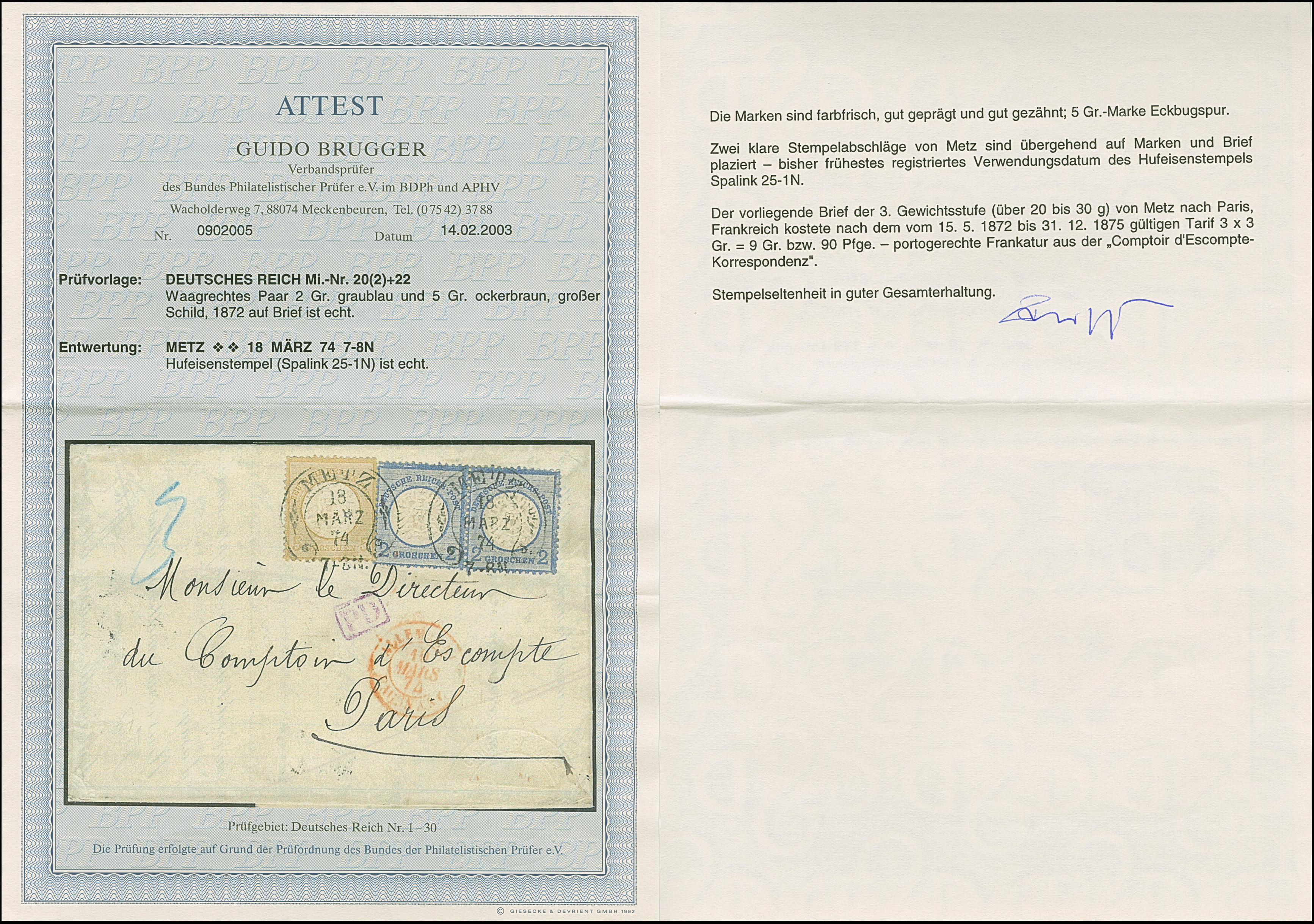 “METZ 18.MÄRZ.74” (Spalink 25-1N) zweimal klar auf waagerechtem Paar 2 Gr. grauultramarin und Einzelwert 5 Gr. ockberbraun als tarifgerechte Frankatur auf komplettem Faltbrief der 3. Gewichtsstufe mit violettem Ra1 “PD” und rotem frz. Transitstempel nach Paris mit Ankunftsstempel. Die farbfrischen Marken sind gut geprägt und gut gezähnt, die 5 Gr.-Marke hat eine Eckzahnbugspur, ansonsten wie der Faltbrief in guter Erhaltung. Ein dekorativer Brief mit dem Frühdatum 18.3.1875 des besseren Hufeisenstempels, Fotoattest Brugger BPP (2003)