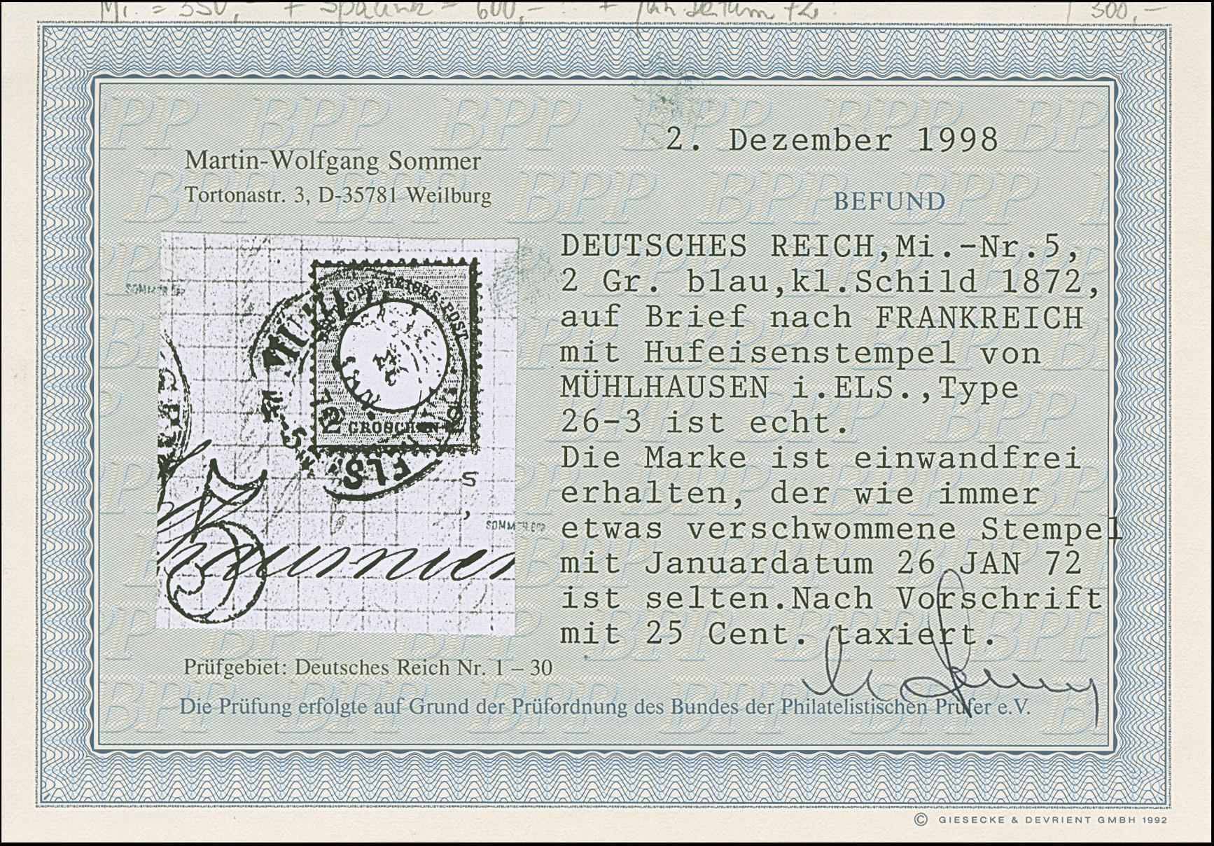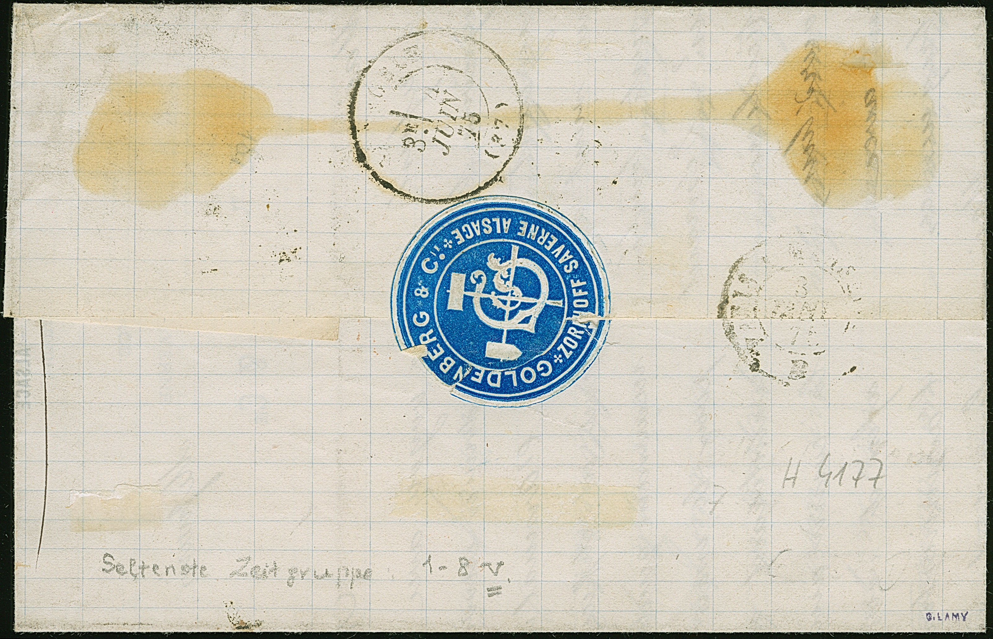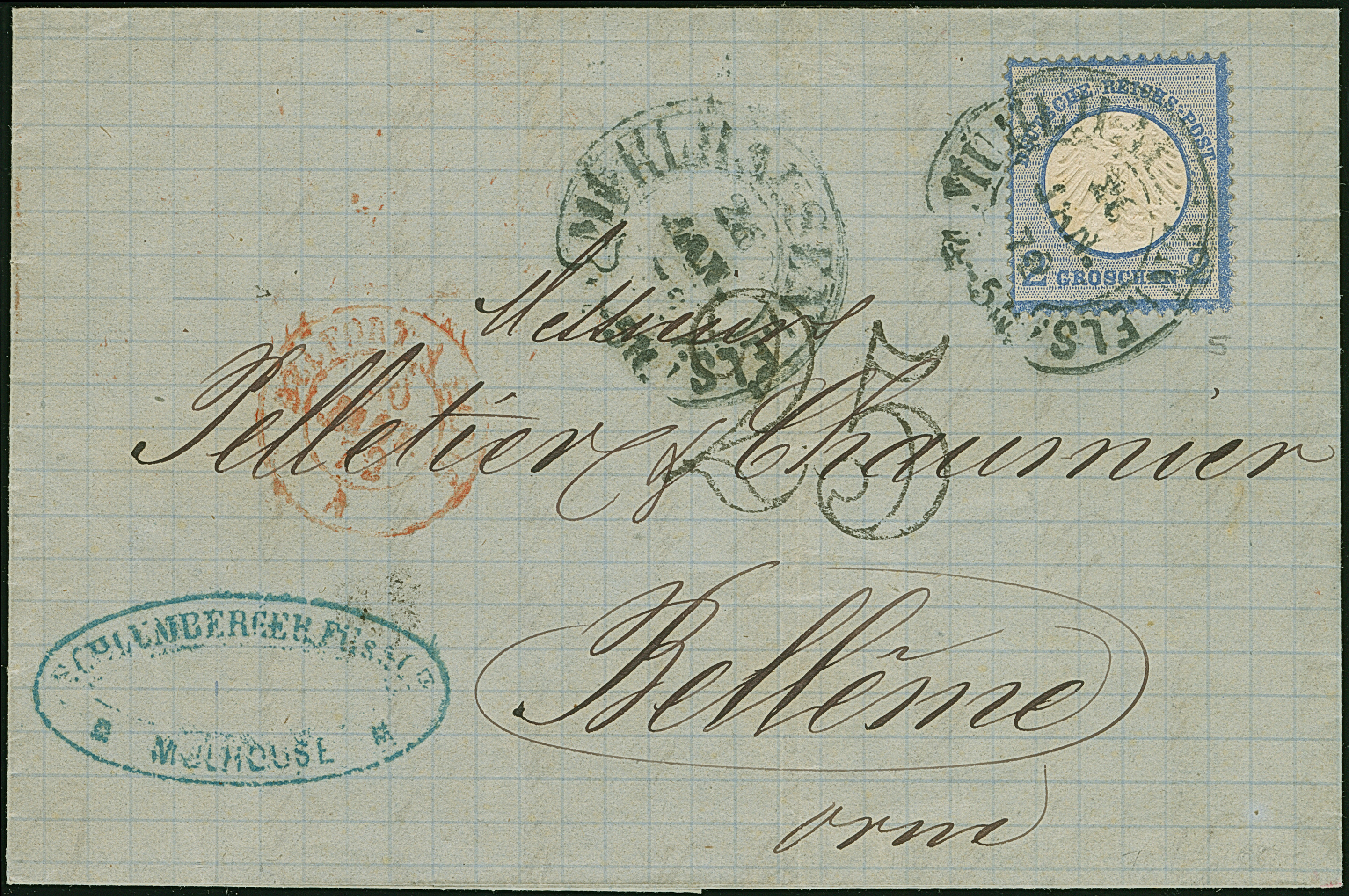 “MÜHLHAUSEN i. ELS. 26.JAN.72” (Spalink 26-3) recht klar auf kleiner Schild 2 Gr. grauultramarin auf komplettem Faltbrief mit rotem frz. Transitstempel und Tax-Stempel “25” via Paris nach Bellême. Die farbfrische Marke ist gut geprägt, normal gezähnt und wie die Briefhülle in einwandfreier Erhaltung. Eine dekorative Doppelfrankatur mit Fotobefund Sommer BPP (1998)