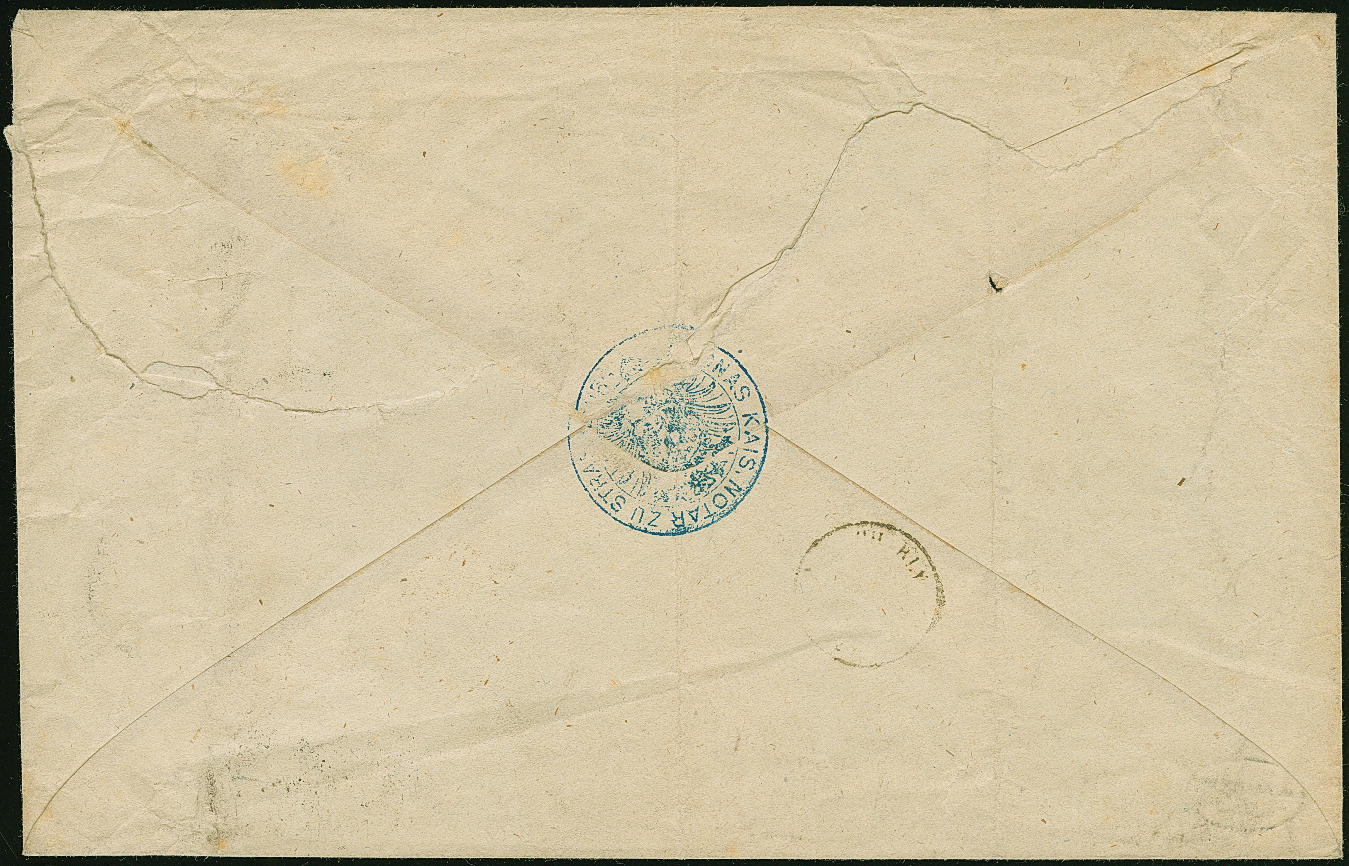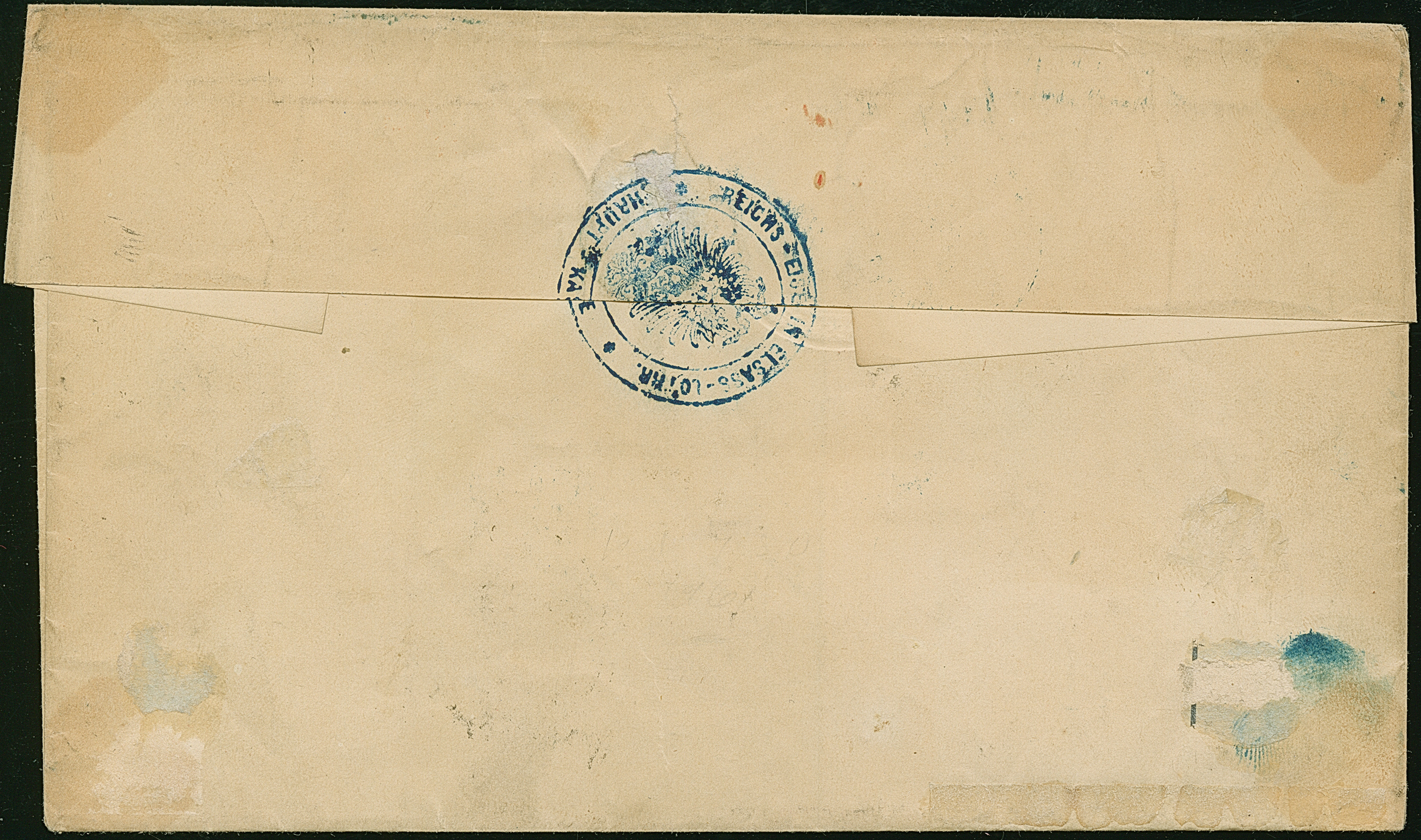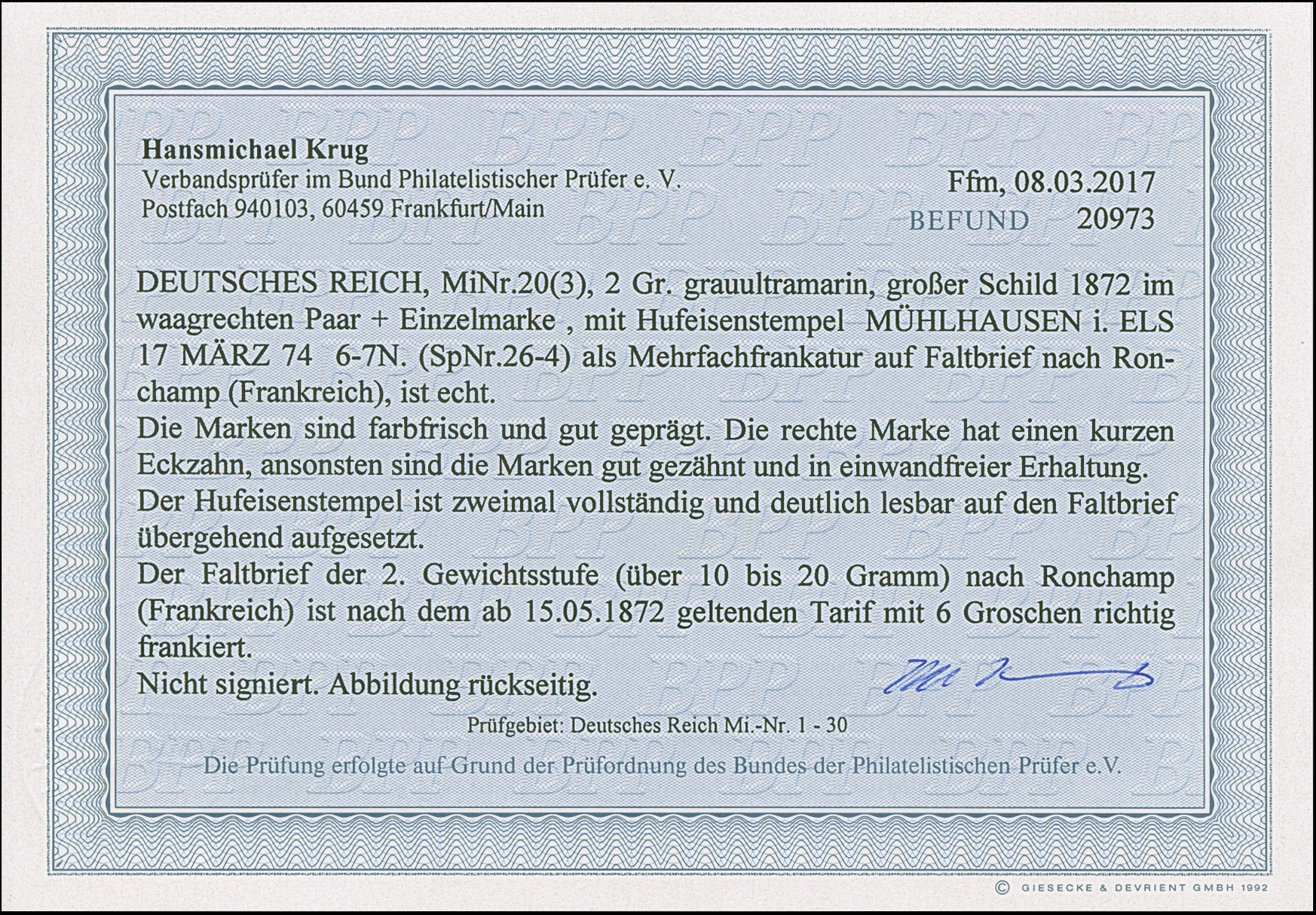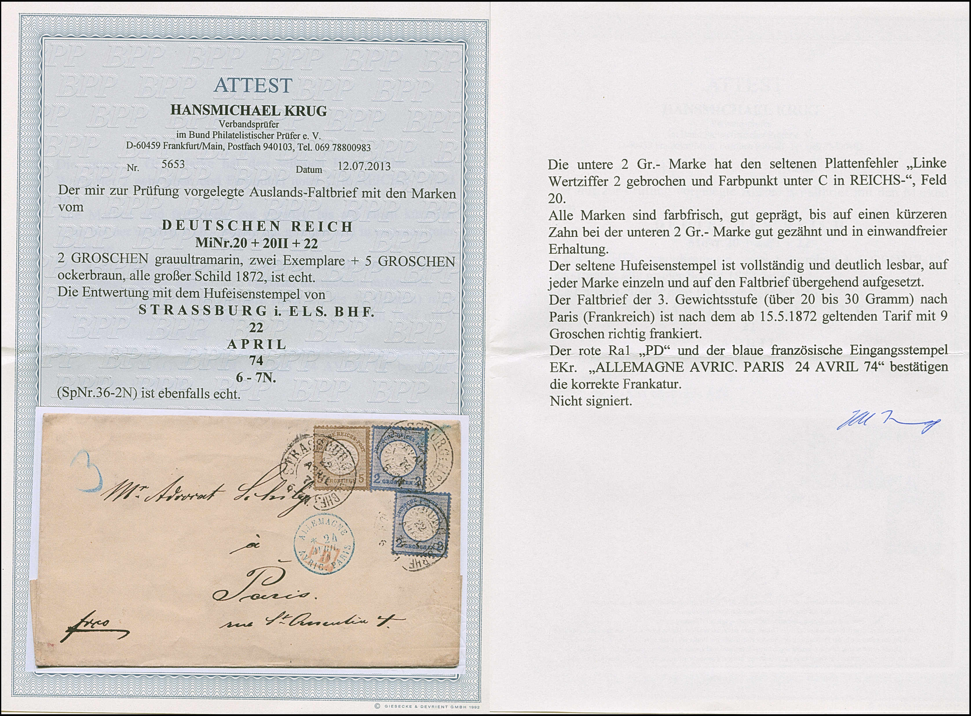 “STRASSBURG i. ELS. BHF. 22.APRIL.74” (Spalink 36-2N) mehrfach recht klar auf zwei Einzelmarken 2 Gr. grauultramarin, die untere Marke mit Plattenfehler “linke Wertziffer 2 gebrochen und Farbpunkt unter C in REICHS” (Feld 20) und 5 Gr. ockerbraun als tarifgerechte Frankatur auf Faltbriefhülle der 3. Gewichtsstufen mit rotem Ra1 “PD” und frz. Transitstempel nach Paris. Die farbfrischen Marken sind gut geprägt und bis auf einen kürzeren Zahn bei der unteren Marke gut gezähnt und in einwandfreier Erhaltung. Eine dekorative Frankatur mit besserem Plattenfehler und besserem Hufeisenstempel mit Destination Frankreich, Fotoattest Krug BPP (2013)
