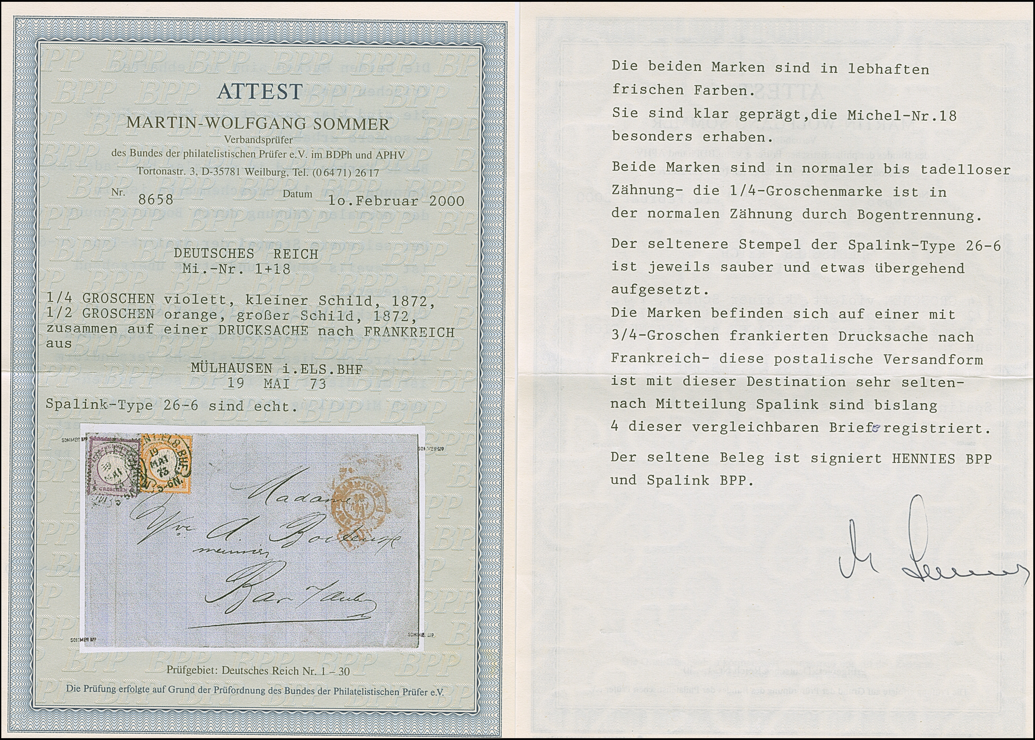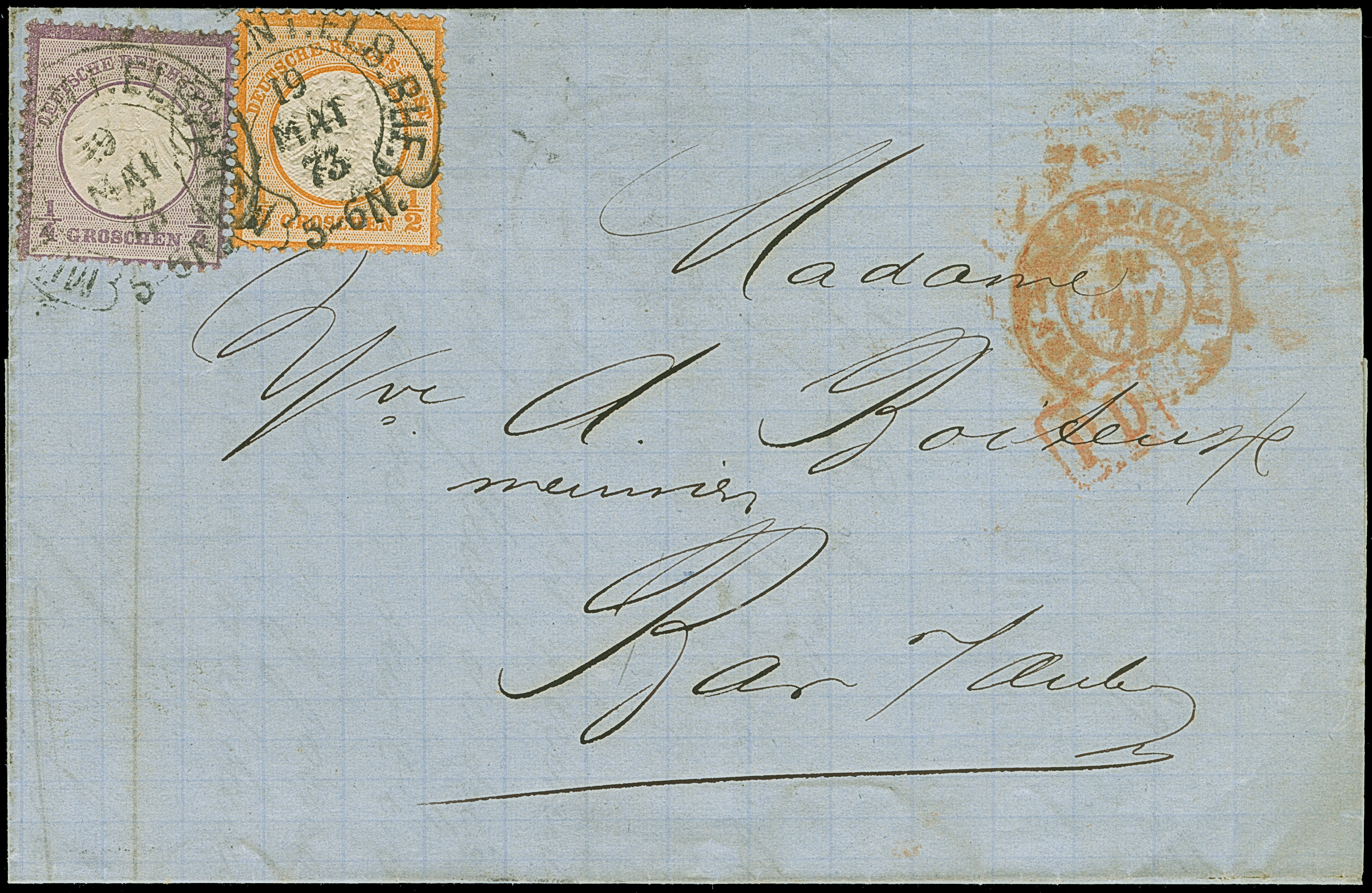 “MÜLHAUSEN i. ELS. BHF 19.MAI.73” (Spalink 26-6) zweimal recht klar auf kleiner Schild ¼ Gr. graupurpur und großer Schild ½ orange als tarifgerechte Frankatur auf komplettem Drucksachen-Faltbrief mit rotem Ra1 “PD” und rotem Transitstempel nach Bars-S-Aube mit Ankunftstempel. Die farbfrischen Marken sind gut geprägt, zum Teil mit ausgabentypischer Zähnung mit wenigen verkürzten Zahnspitzen und einem kurzen Zahn bei der ½ Gr.-Marke, in einwandfreier Erhaltung. Eine dekorative und nicht häufige Frankatur-Kombination mit besserem Hufeisenstempel und Destination Frankreich, Fotoattest Sommer BPP (2000)