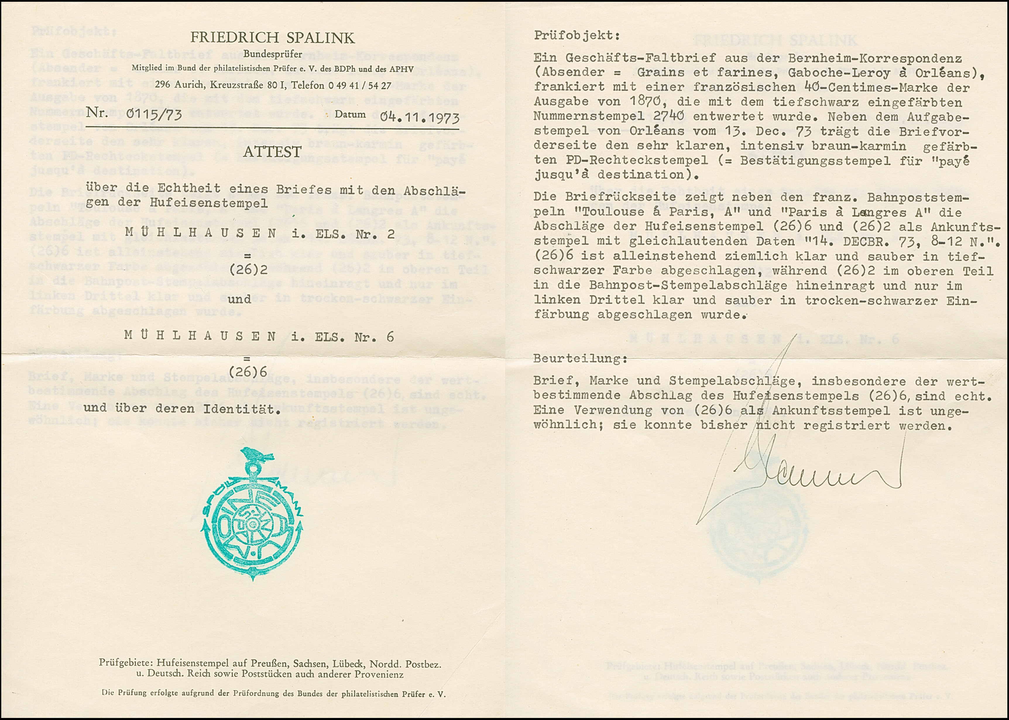 “MÜLHAUSEN i. ELS. BHF. 14.OCTBR.73” (Spalink 26-6) und “MÜHLHAUSEN i. ELS 14.OCTBR.73” (Spalink 26-2) jeweils klar als Ankunftsstempel rückseitig auf komplettem Faltbrief mit Ceres 40 C. mit GC "2740" und nebengesetztem DKr. “ORLEANS 13.DEC.73” nach Mühlhausen. Eine ganz ungewohnliche Verwendung von zwei verschiedenen Hufeisenstempeln als Ankunftsstempel, Fotoattest Spalink BPP(1973)