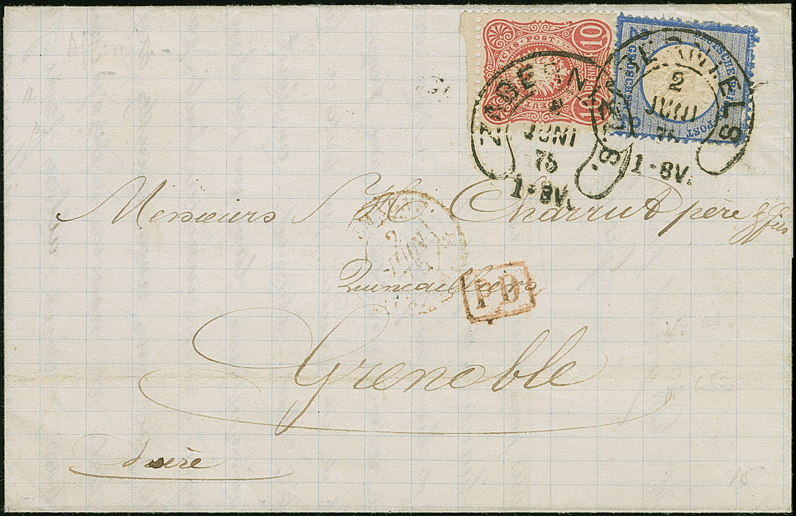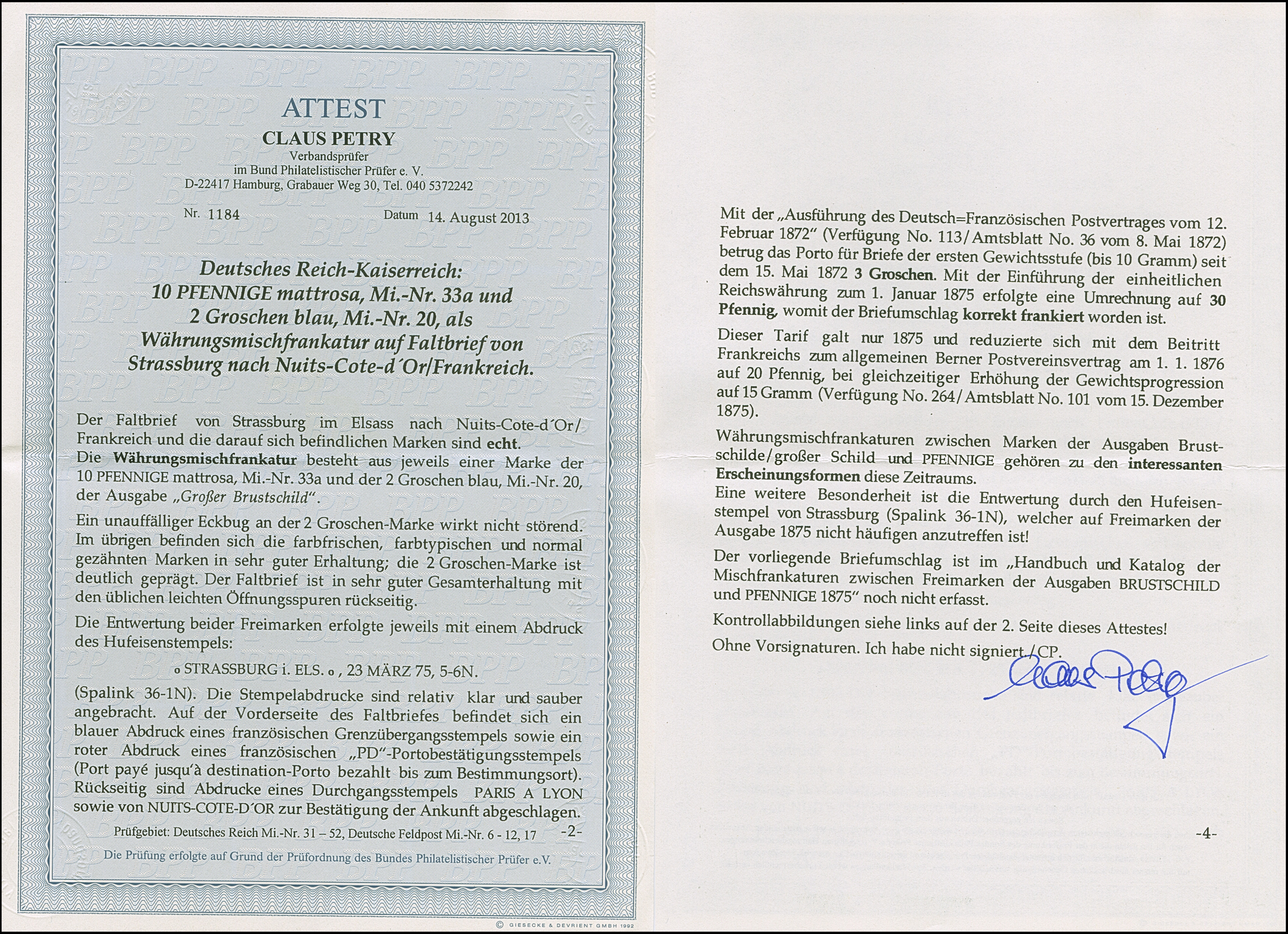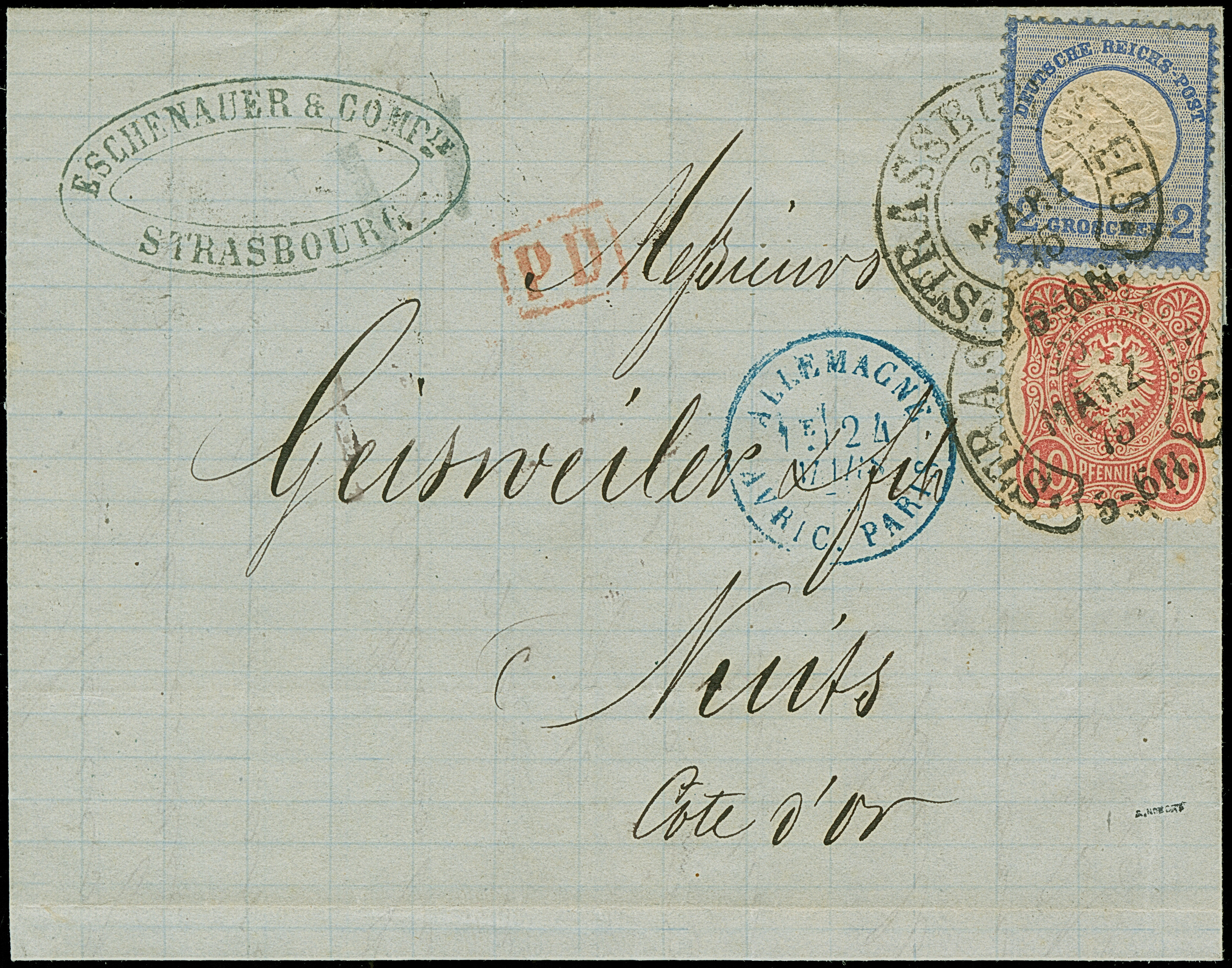 “STRASSBURG i. ELS. 25.MARZ.75” (Spalink 36-1N) zweimal klar auf großer Schild 2 Gr. grauultramarin und 10 Pfge mattrosa als tarifgerechte Frankatur auf komplettem Faltbrief mit rotem Ra1 “PD” und frz. Transitstempel nach Nuit Cote D'Or mit Ankunftsstempel. Die farbfrische Brustschildmarke ist deutlich geprägt und hat einen waagerechten Bug mit kleinem Einriss, die 10 Pfge-Marke ist wie der Faltbrief in einwandfreier Erhaltung, Trotz der Einschränkungen eine dekorative Mischfrankatur mit Destination Frankreich, Fotoattest Petry BPP (2013)