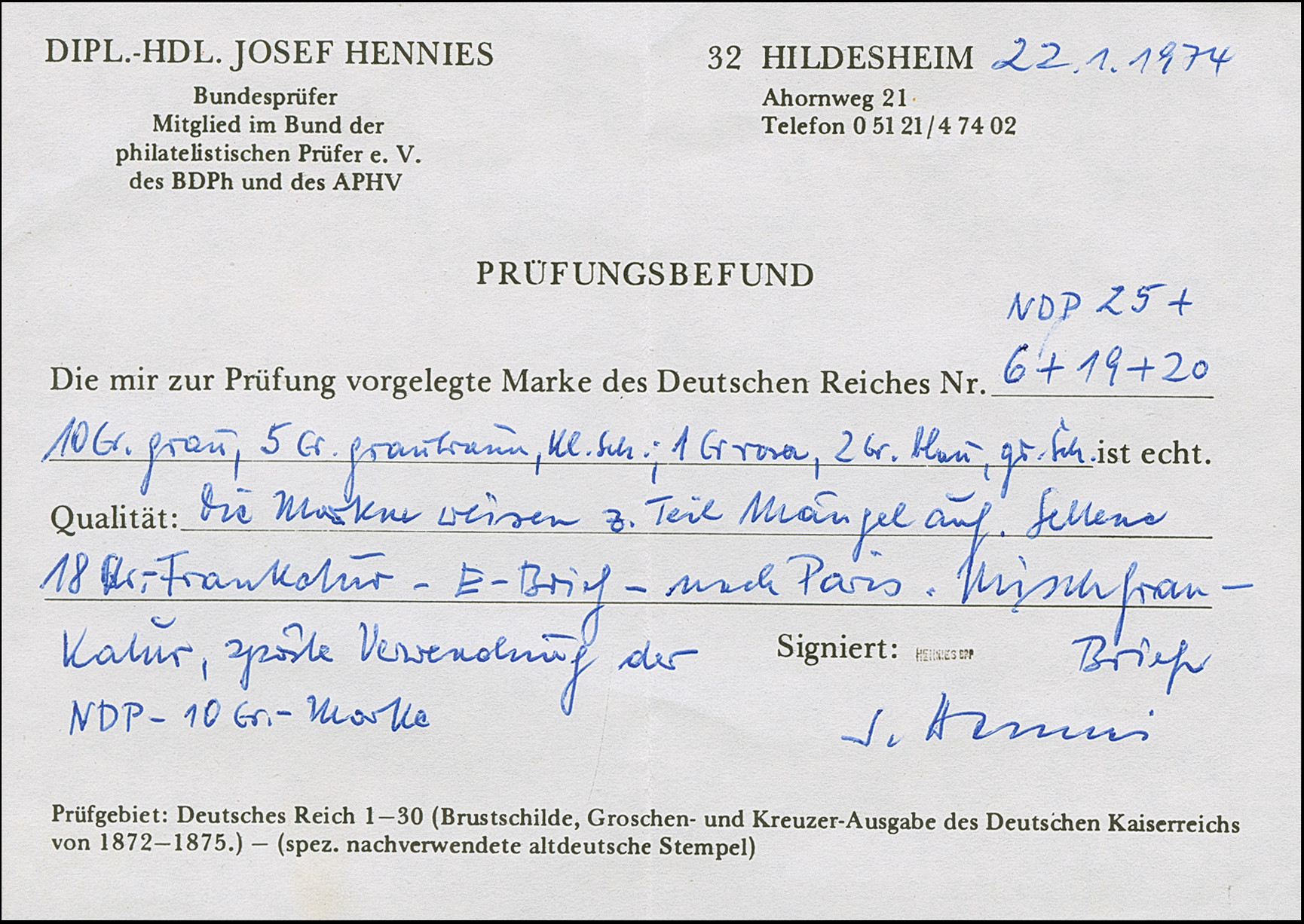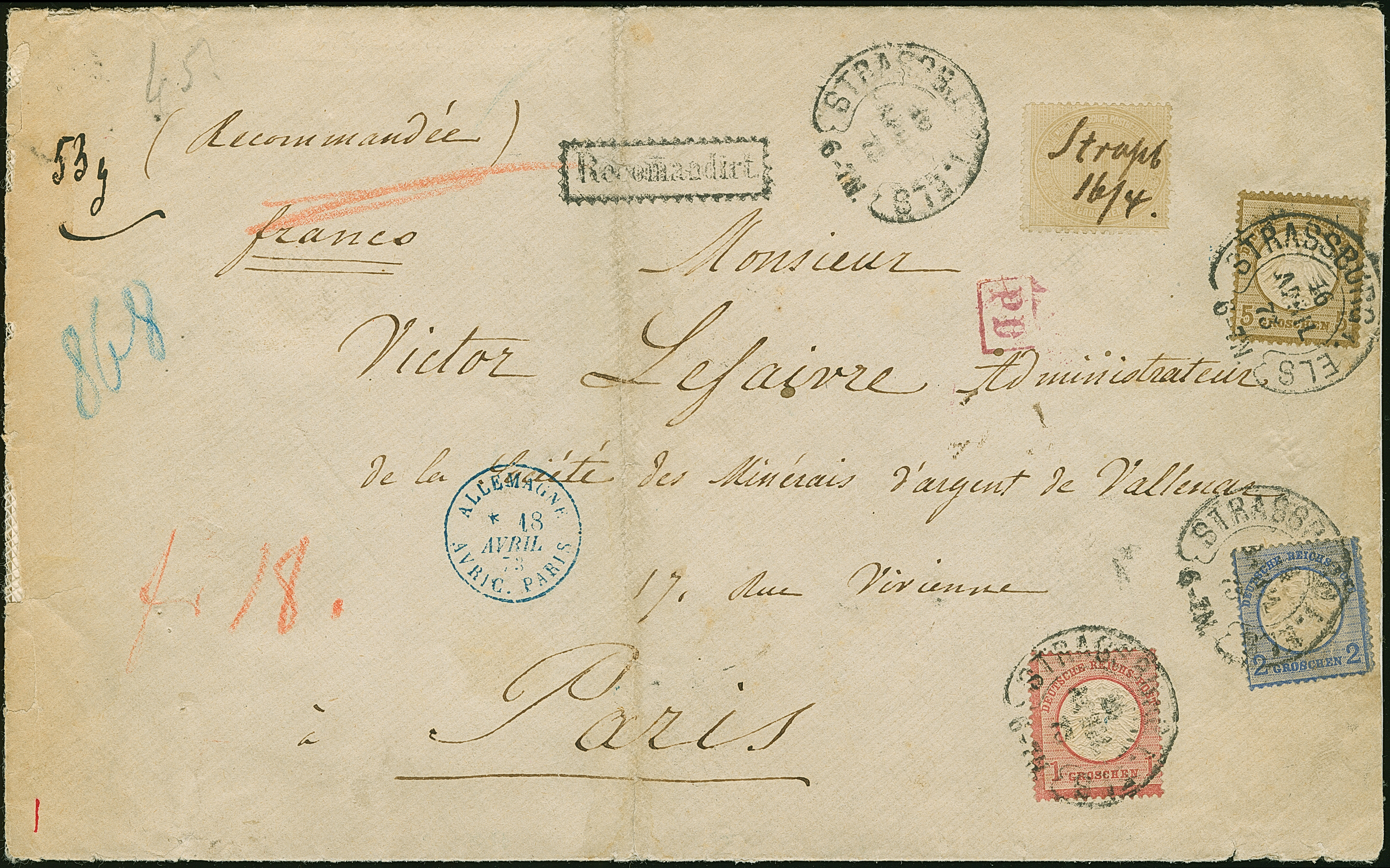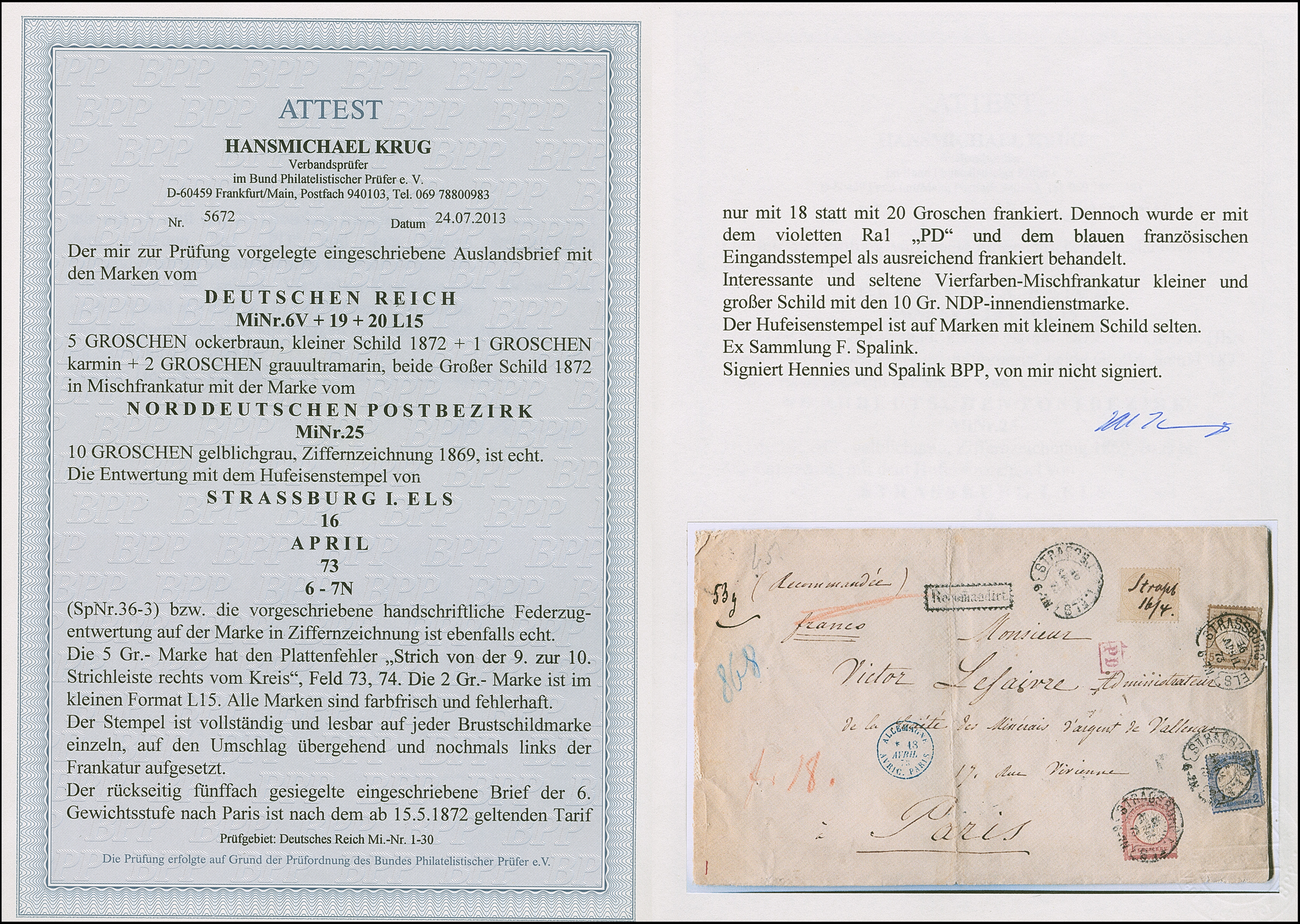 “STRASSBURG i. ELS 16.APRIL.73” (Spalink 36-3) recht klar mehrfach auf kleiner Schild 5 Gr. im kleinen Format mit Plattenfehler “Strich von der 9. und 10. Strichleiste rechts vom Kreis” (Feld 73,74), großer Schild 1 Gr. karmin und 2 Gr. grauultramarin sowie Norddeutscher Postbezirk Innendienst-Marke 10 Gr. gelblichgrau mit handschriftlicher Entwertung “Strassb. 16/4” auf R-Briefkuvert der 6. Gewichtsstufe mit rotem Ra1 “PD” und frz. Transitstempel nach Paris mit Ankunftsstempel. Der Brief wurde ohne Beanstandungen befördert, obwohl um 2 Groschen unterfrankiert ist. Alle Marken sind farbfrisch, aber fehlerhaft, und der Umschlag mit senkrechter Faltung und Beförderungsspuren. Trotz der Einschränkungen eine dekorative Vierfarben-Mischfrankatur mit der Innendienstmarke vom Norddeutschen Postbezirk, signiert Spalink BPP und Fotobefund Hennies BPP (1974) und Fotoattest Krug BPP (2013)
