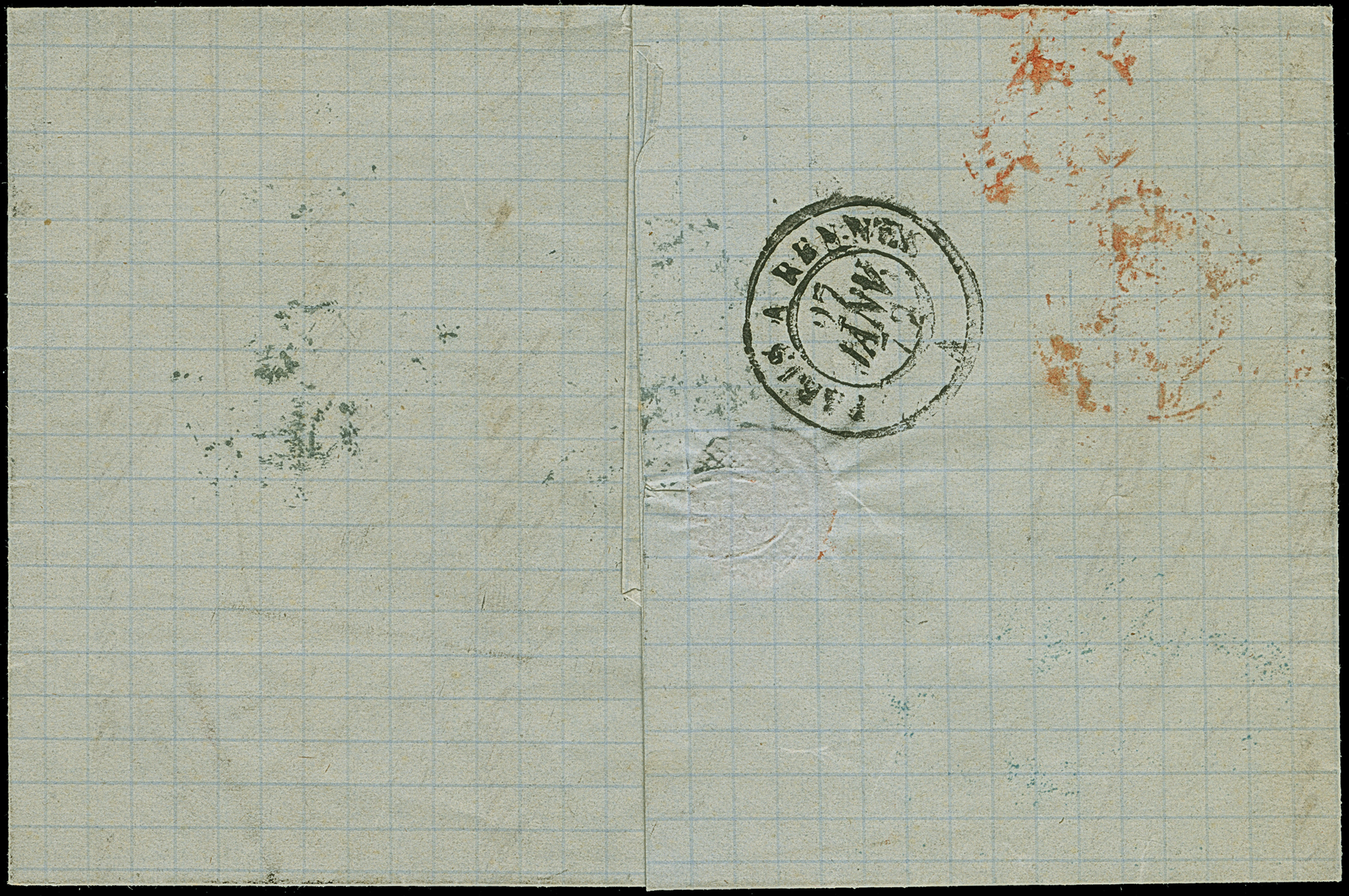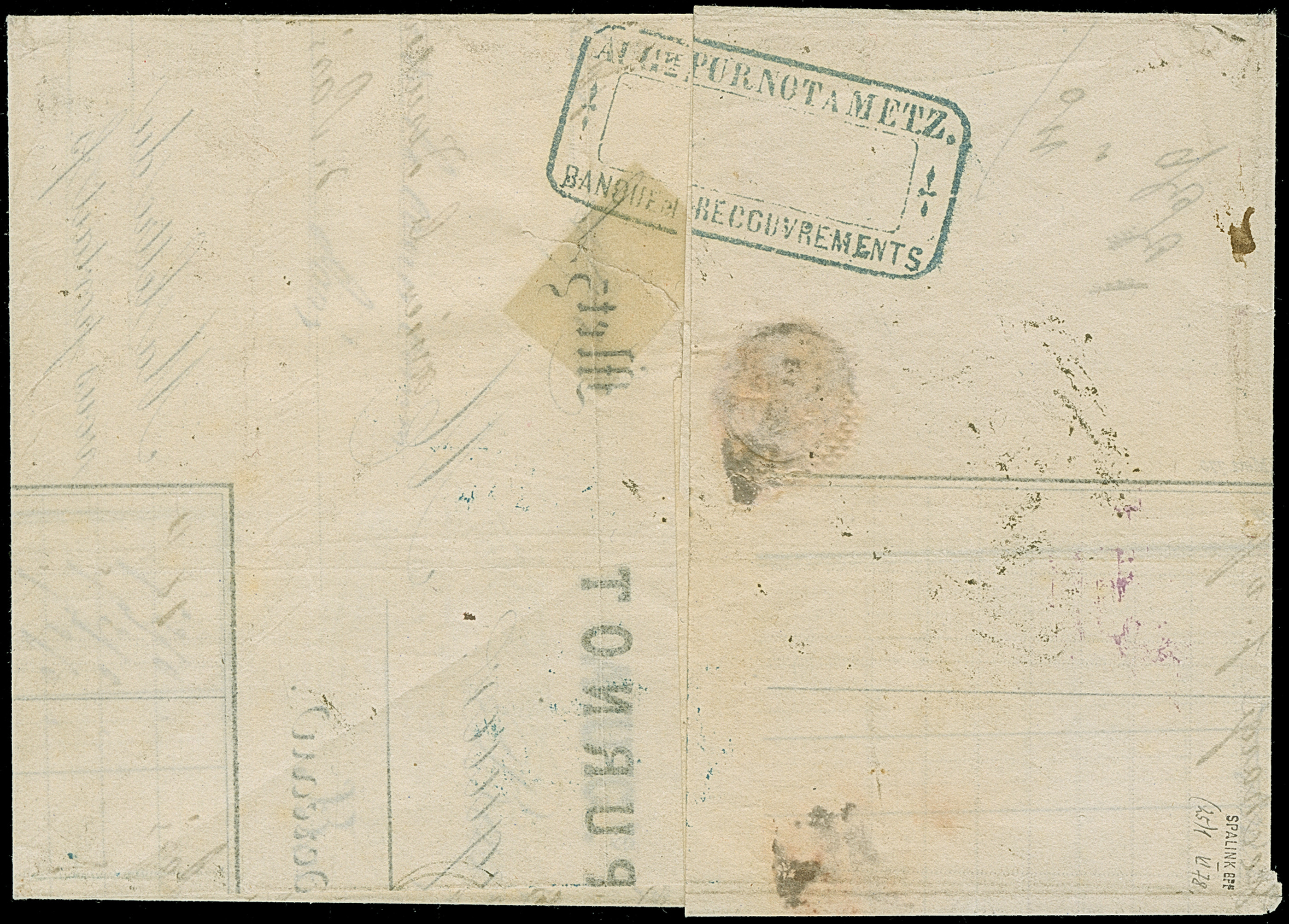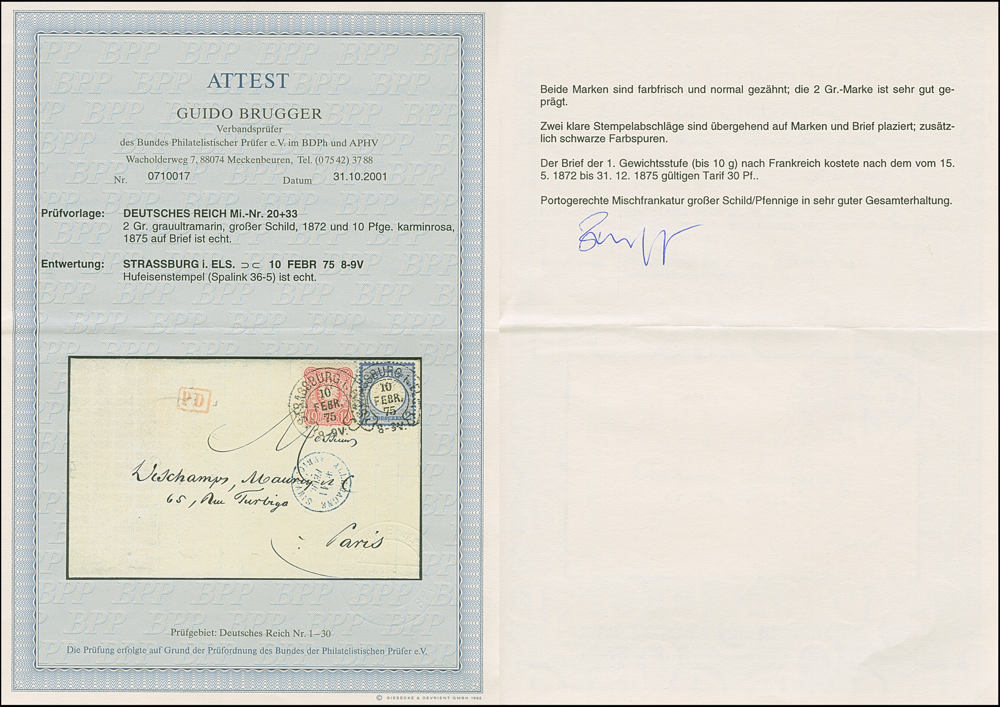 “STRASSBURG i. ELS. BHF. 10. FEBR.75” (Spalink 26-5) zweimal klar auf großer Schild 2 Gr. grauultramarin und 10 Pfge karminroa als tarifgerechte Frankatur auf komplettem Faltbrief mit rotem Ra1 “PD” und frz. Transitstempel nach Paris. Die Brustschild-Marke ist sehr gut geprägt, beide Marken sind farbfrisch, normal gezähnt und wie der Faltbrief in einwandfreier Erhaltung. Eine dekorative Mischfrankatur mit Fotoattest Brugger BPP (2001)