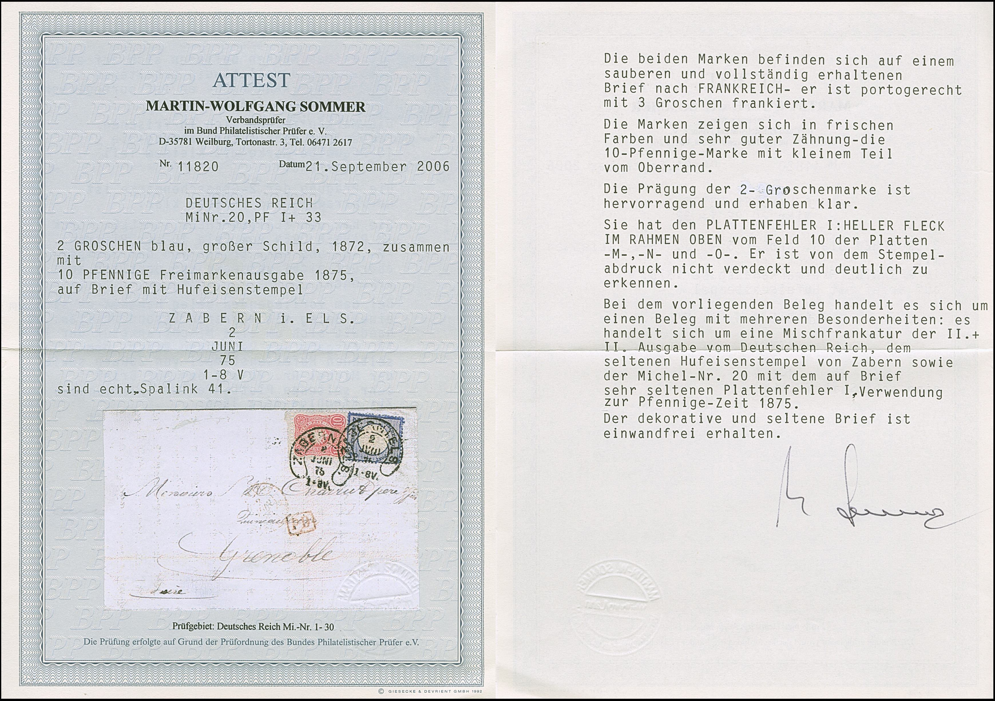 “ZABERN i. ELS. 2.JUNI.75” (Spalink 41) zweimal klar auf großer Schild 2 Gr. grauultramarin mit Plattenfehler “heller Fleck im Rahmen über CS von REICHS” (Feld 10) und 10 Pfge mattrosa mit winzigem Teil vom Oberrand als tarifgerechte Frankatur auf komplettem Faltbrief mit rotem Ra1 “PD” und frz. Transitstempel nach Grenoble, Frankreich mit Ankunftsstempel. Die farbfrische Brustschildmarke ist deutlich geprägt und wie die 10 Pfge-Marke typisch gezähnt und wie der Faltbrief in einwandfreier Erhaltung. Eine dekorative Mischfrankatur mit besserem Plattenfehler und Destination Frankreich, Fototattest Sommer BPP (2006)