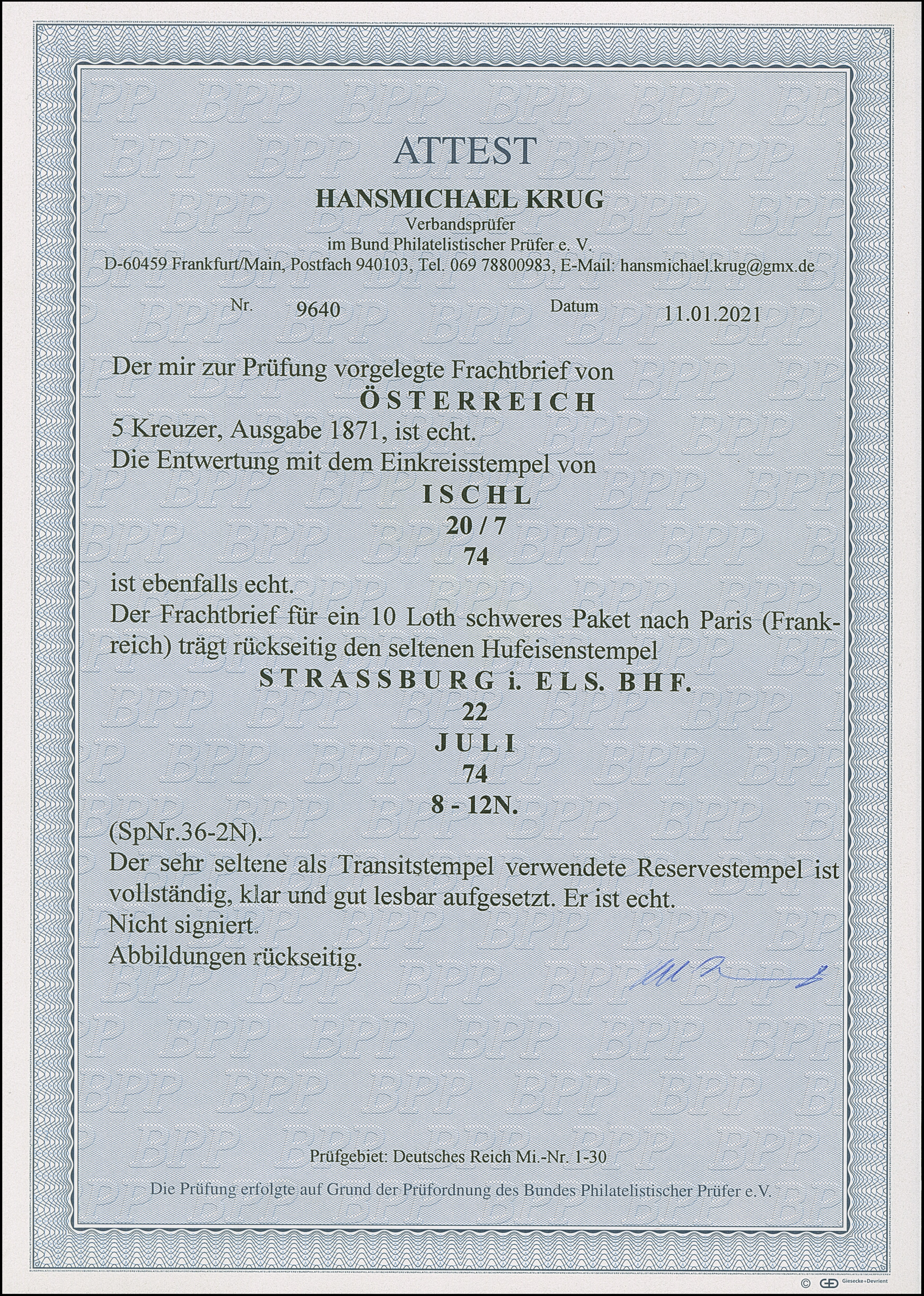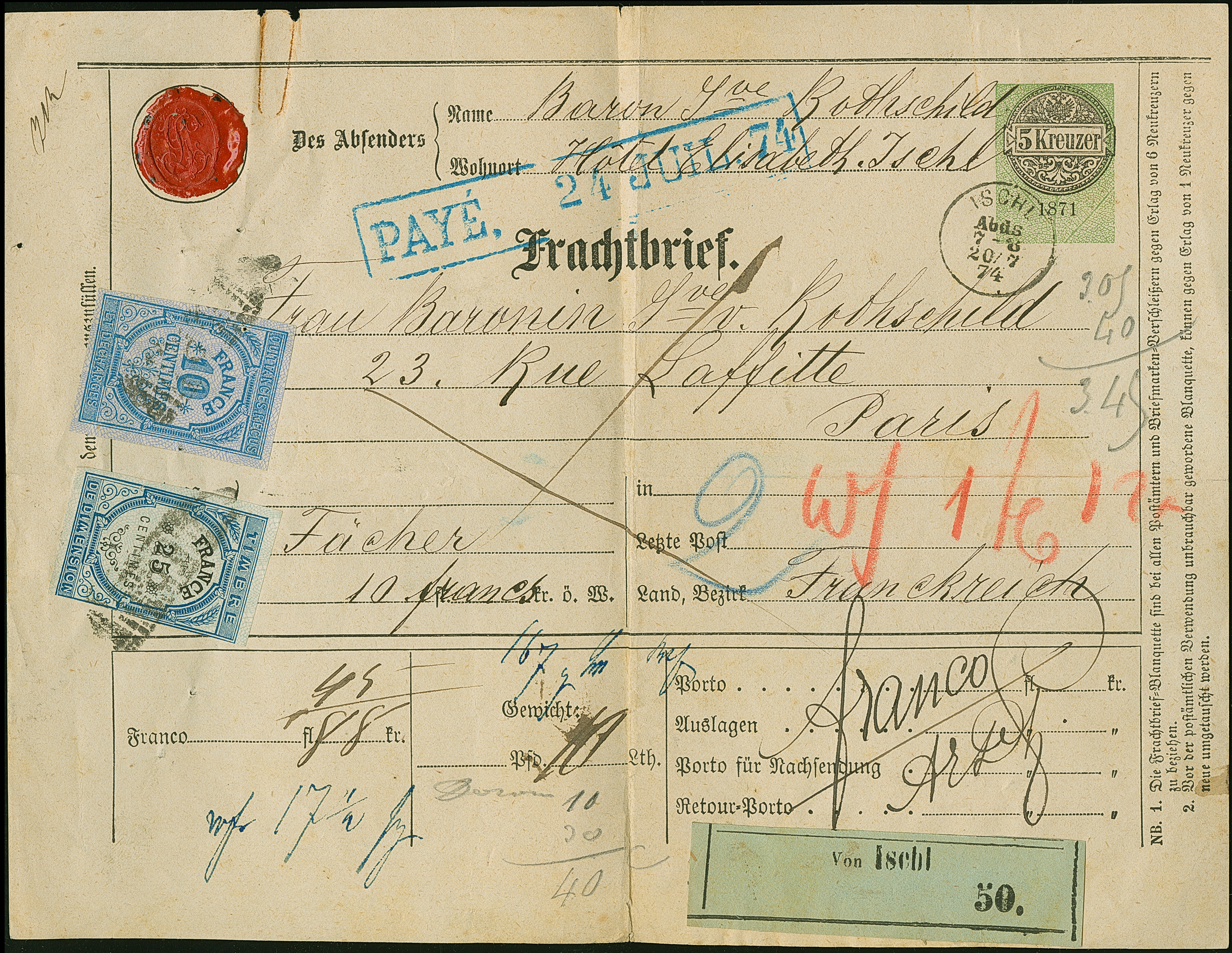 “STRASSBURG i. ELS. BHF. 22.JULI.74” (Spalink 36-2N) sehr klar rückseitig als Transitstempel auf komplettem Frachtbrief aus “ISCHL Abds 20.7.74” nach Paris mit zwei französischen Fiskalmarken auf der Vorderseite, dazu beiliegend “Récépisse Pour le Destinatatire”. Das Formular mit senkrechter Faltung und kleine Randspuren. Der Hufeisenstempel wurde zu dieser Zeit als Reservestempel eingesetzt, eine Verwendung als Transitstempel ist im Handbuch nicht notiert. Hier aus der bekannten Rothschild-Korrespondenz, Fotoattest Krug BPP (2021)