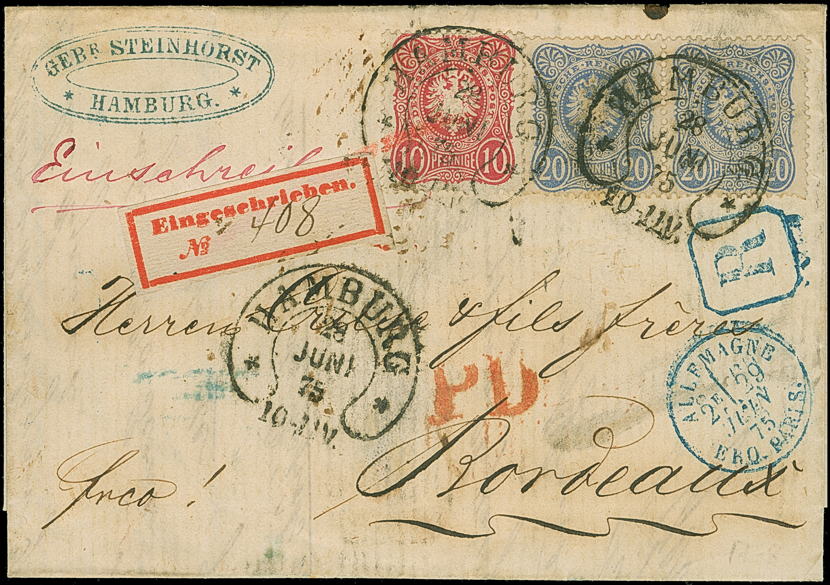 “HAMBURG** 28.JUNI.75” (Spalink 17-8) mehrfach klar auf 10 Pfge karmin und mit waagerechtem Paar 20 Pfge trübultramarin (rechte Marke im verbreiterten Format) als tarifgerechte Frankatur auf komplettem R-Faltbrief mit frühem R-Zettel “Eingeschrieben No.”, rotem L1 “PD” und frz. Transitstempel nach Bordeaux mit Ankunftsstempel. Die farbfrischen Marken sind bis auf einen kurzen Zahn in einwandfreier Erhaltung, der Faltbrief mit leichter Patina. Ein dekorativer R-Brief mit Destination Frankreich, Fotoattest Petry BPP (2015)