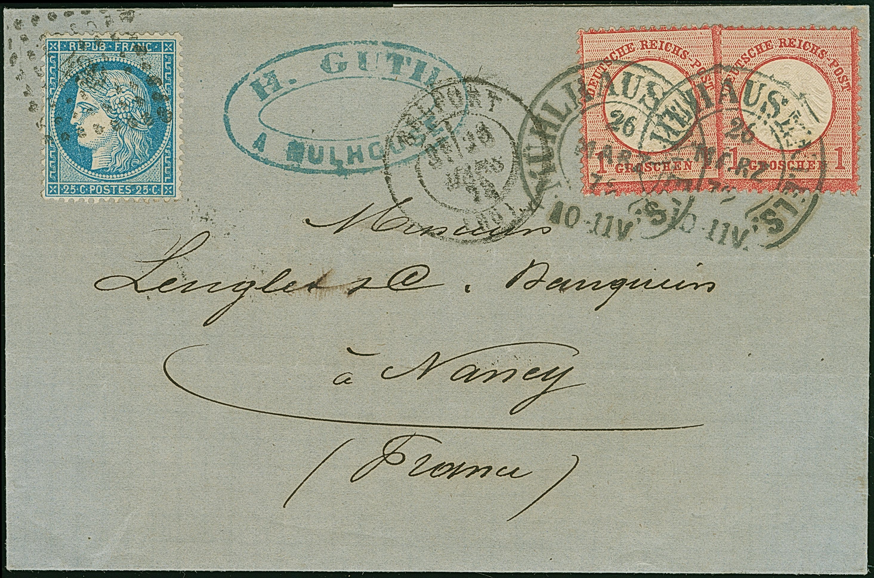 “MÜHLHAUSEN i. ELS. 26.MÄRZ.72” (Spalink 26-2) zweimal klar auf zwei Einzelmarken kleiner Schild 1 Gr. rötlichkarmin auf Faltbriefhülle mit Frankreich Ceres 25 C. mit PC “420” nach Nancy mit Ankunftsstempel. Die beiden, farbfrischen Brustschild-Marken sind sehr gut geprägt, gut gezähnt und wie die Marke von Frankreich bzw. der Briefhülle in einwandfreier Erhaltung. Eine dekorative Doppelfrankatur, Fotobefund Krug BPP (2013)