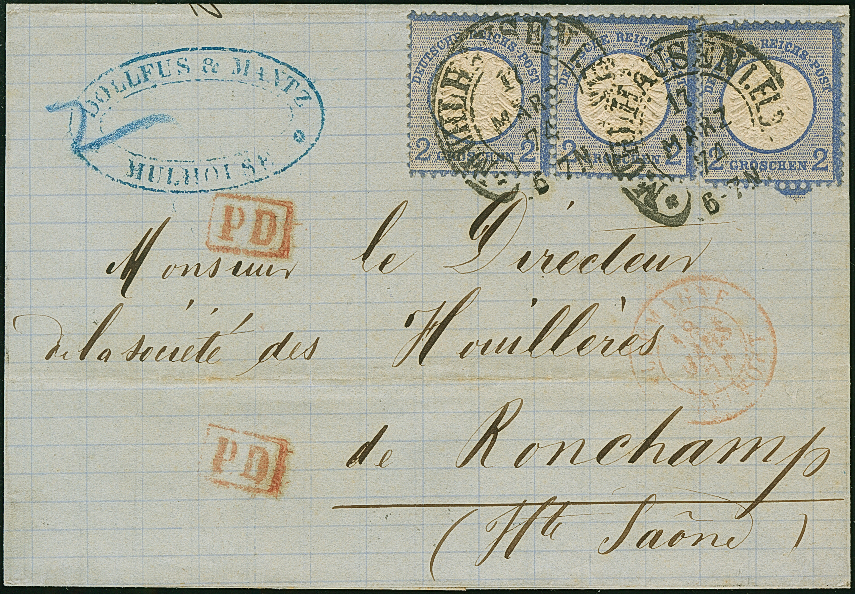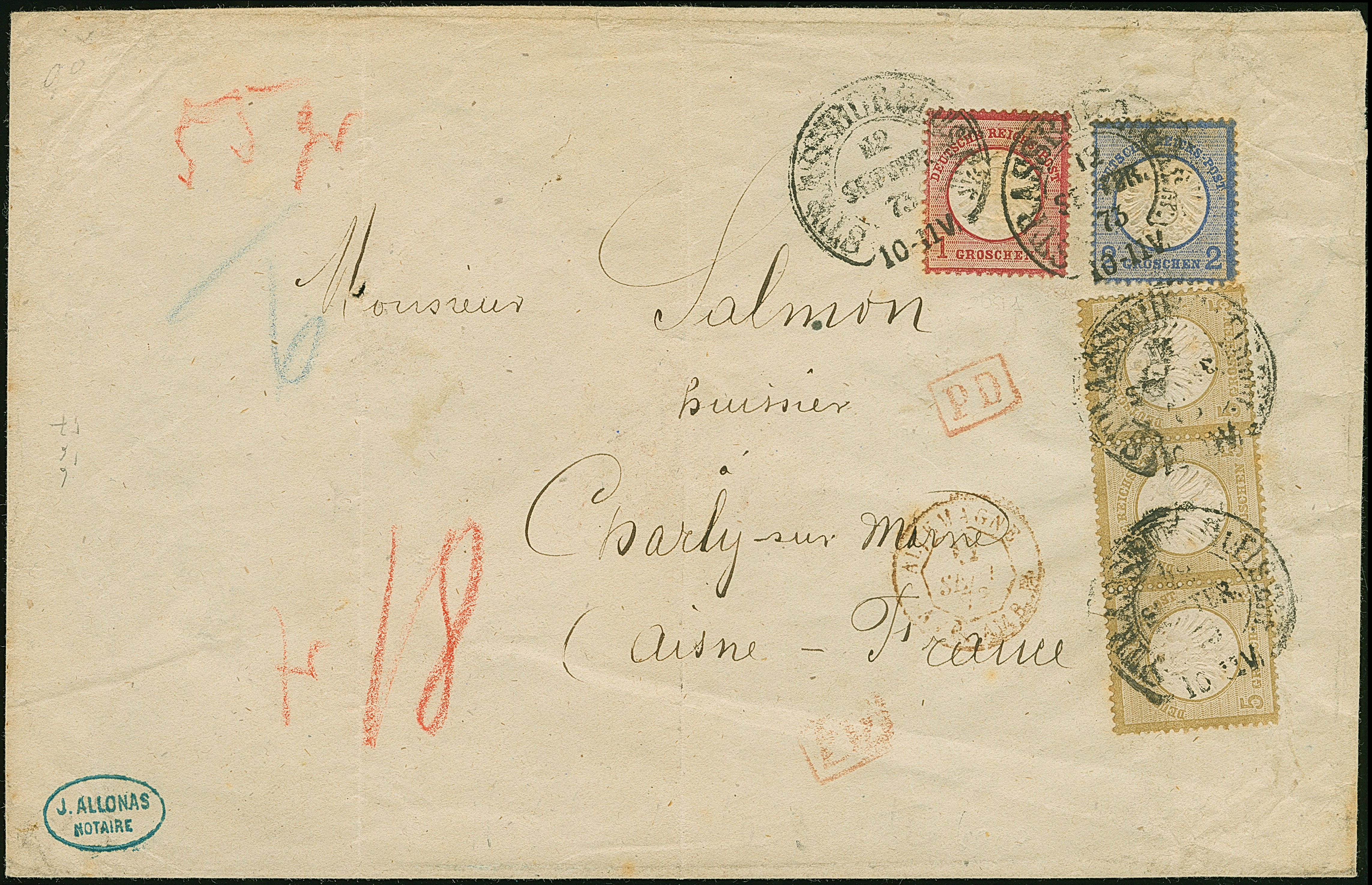 “STRASSBURG i. ELS. BHF. 12.SEPTBR.73” (Spalink 36-2) mehrfach klar auf kleiner Schild 5 Gr. im waagerechten Dreierstreifen, dabei linke Marke mit Plattenfehler “heller kreisförmiger Fleck im Bogen der rechten Wertziffer 5” (Feld 17) sowie großer Schild 1 Gr. karmin und 2 Gr. grauultramarin als tarifgerechte Frankatur auf Brief der 6. Gewichtsstufe (55 g) mit rotem Ra1 “PD” und rotem frz. Transitstempel nach Carly sur Marne mit Ankunftsstempel. Die farbfrischen Marken sind deutlich geprägt und bis auf wenige leicht verkürzte Zähne bei dem Dreierstreifen gut gezähnt und in einwandfreier Erhaltung, der Umschlag mit zwei senkrechten Faltungen und Beförderungsspuren im Rand. Eine dekorative 18 Groschen Farbenfrankatur mit besserem Plattenfehler und in Verbindung mit der 6. Gewichtstufe äußerst selten, Fotoattest Krug BPP (2020)