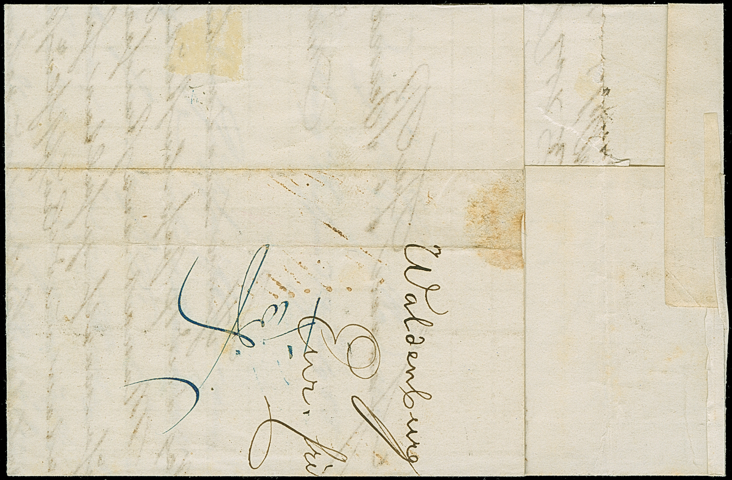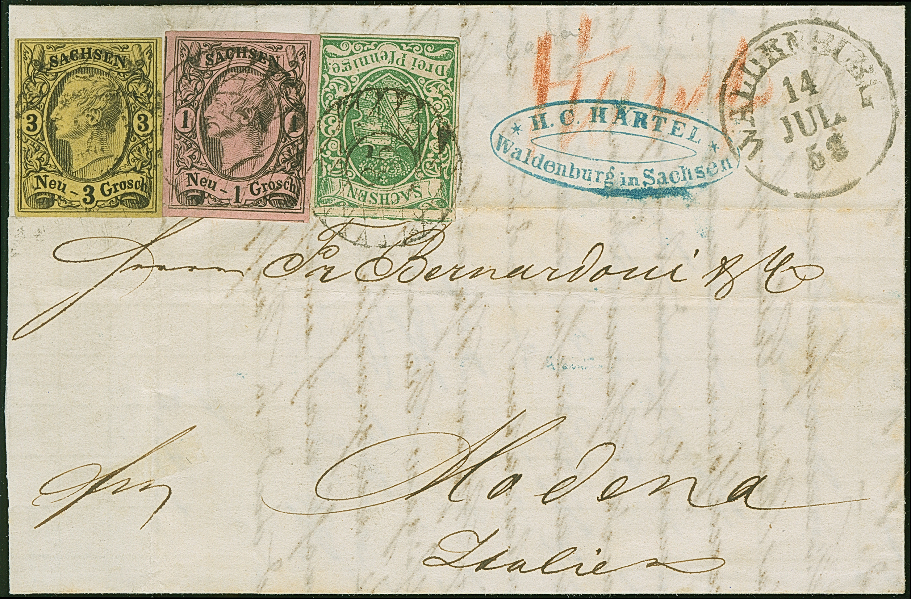 3 Ngr. auf gelb, 1 Ngr. auf mattgraurot und 1851/63, 3 Pfg. grün, alle farbfrisch und voll- bis breitrandig, mit Nr. "85" und sauber nebengesetztem Einkreisstempel "WALDENBURG 14 JUL 58" auf nicht ganz komplettem Faltbrief (links oben etwas hinterlegt) nach Modena. Das Porto betrug 4 1/10 Ngr., die Portospitze konnte nur durch die 3Pfg.-Marke dargestellt werden. Die 2 rechten Werte unauffälliger Briefbug. Ein attraktiver und seltener Brief; es sind nur 2 weitere mit dieser Frankatur nach Modena registriert.