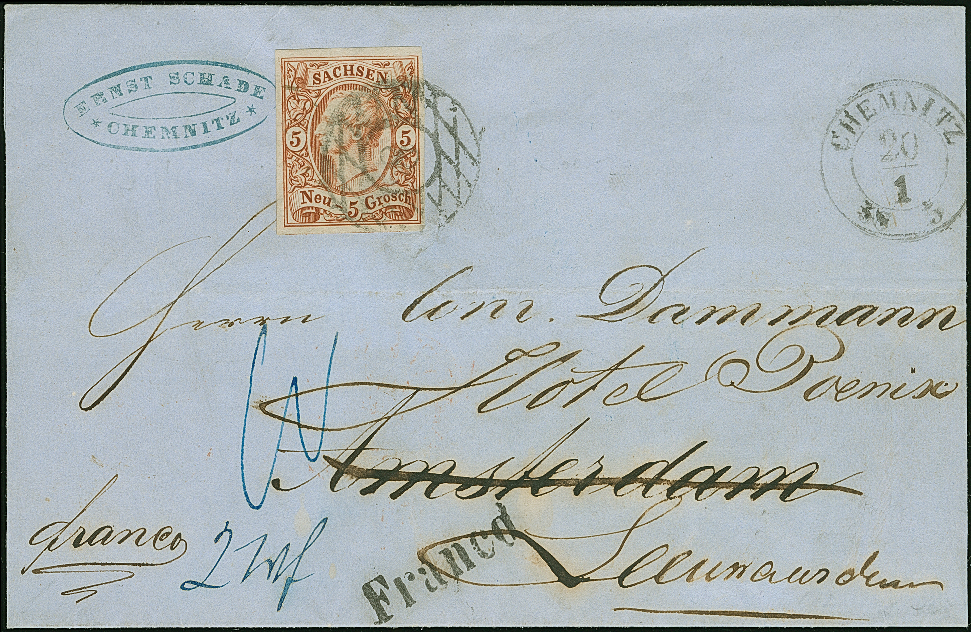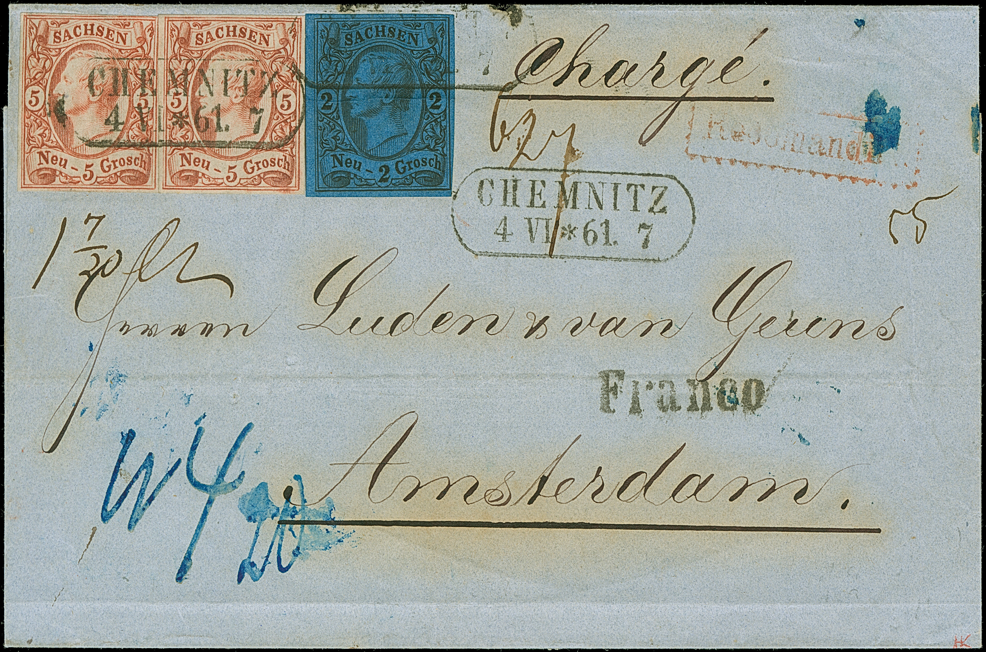 5 Ngr. ziegelrot, 2 Einzelwerte mit Rahmenstempel "CHEMNITZ 4 VI 61", zusammen mit 2 Ngr. auf blau (scharfe waagerechte Druckfalte) mit Federzugentwertung, alle farbfrisch und voll- bis breitrandig, auf eingeschriebener Briefhülle der 2. Gewichtsstufe nach Amsterdam, mit korrekt ausgewiesenen Weiterfranko von "4" Ngr., umgerechnet in "20" Cents. Eine attraktive und seltene Frankatur; PROFI hat nur eine weitere solche in die Niederlande registriert. Signiert Bela Szekula.