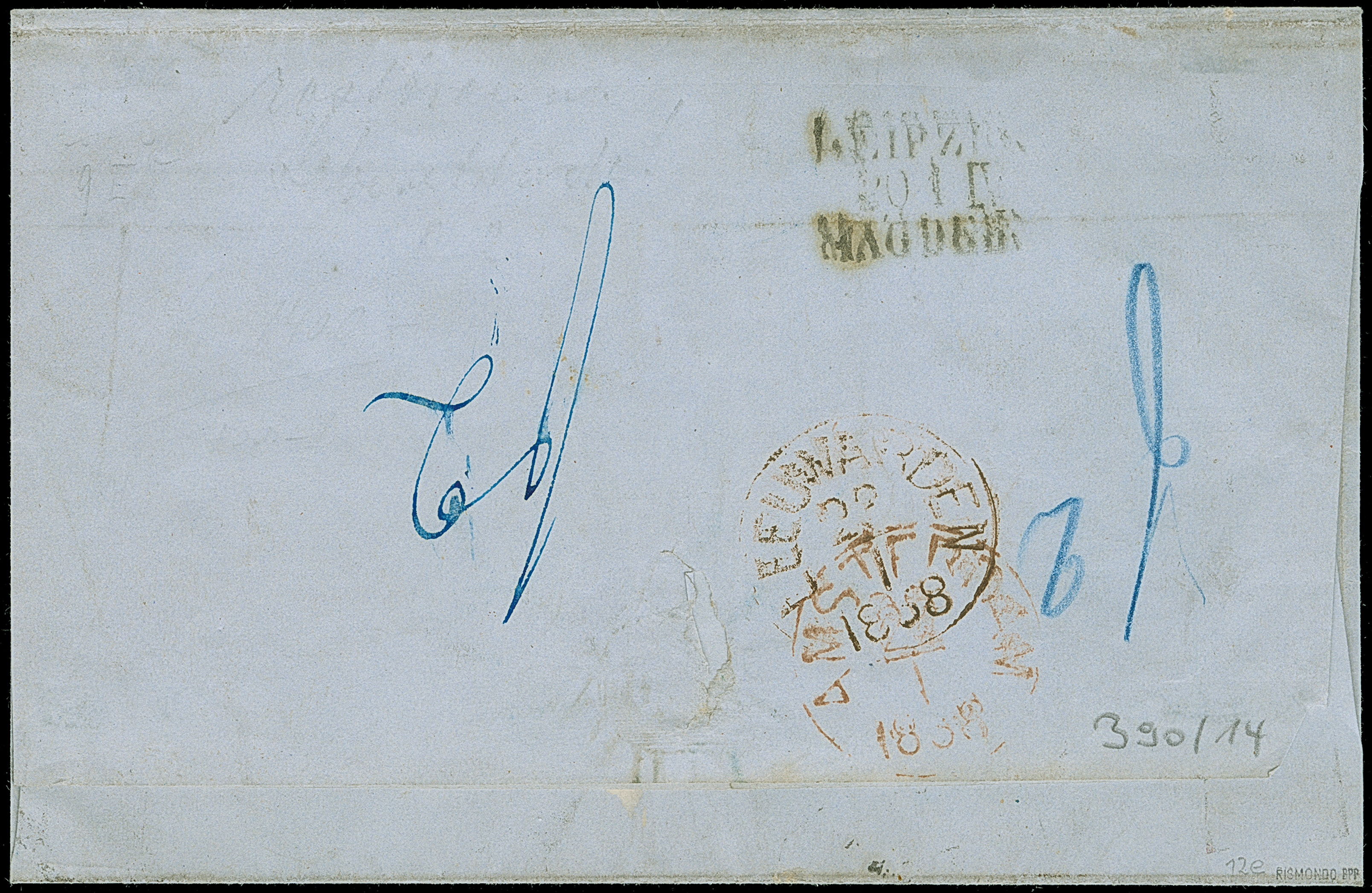 5 Ngr. rostbraun (sogenannte Fehlfarbe), allseits breitrandig, mit Nr. "8" und nebengesetztem Doppelkreisstempel "CHEMNITZ 20/1 58" auf Briefhülle nach Amsterdam, Niederlande, und nachgesandt nach Leuwarden. Einwandfrei. Fotobefund Rismondo BPP (2003)
