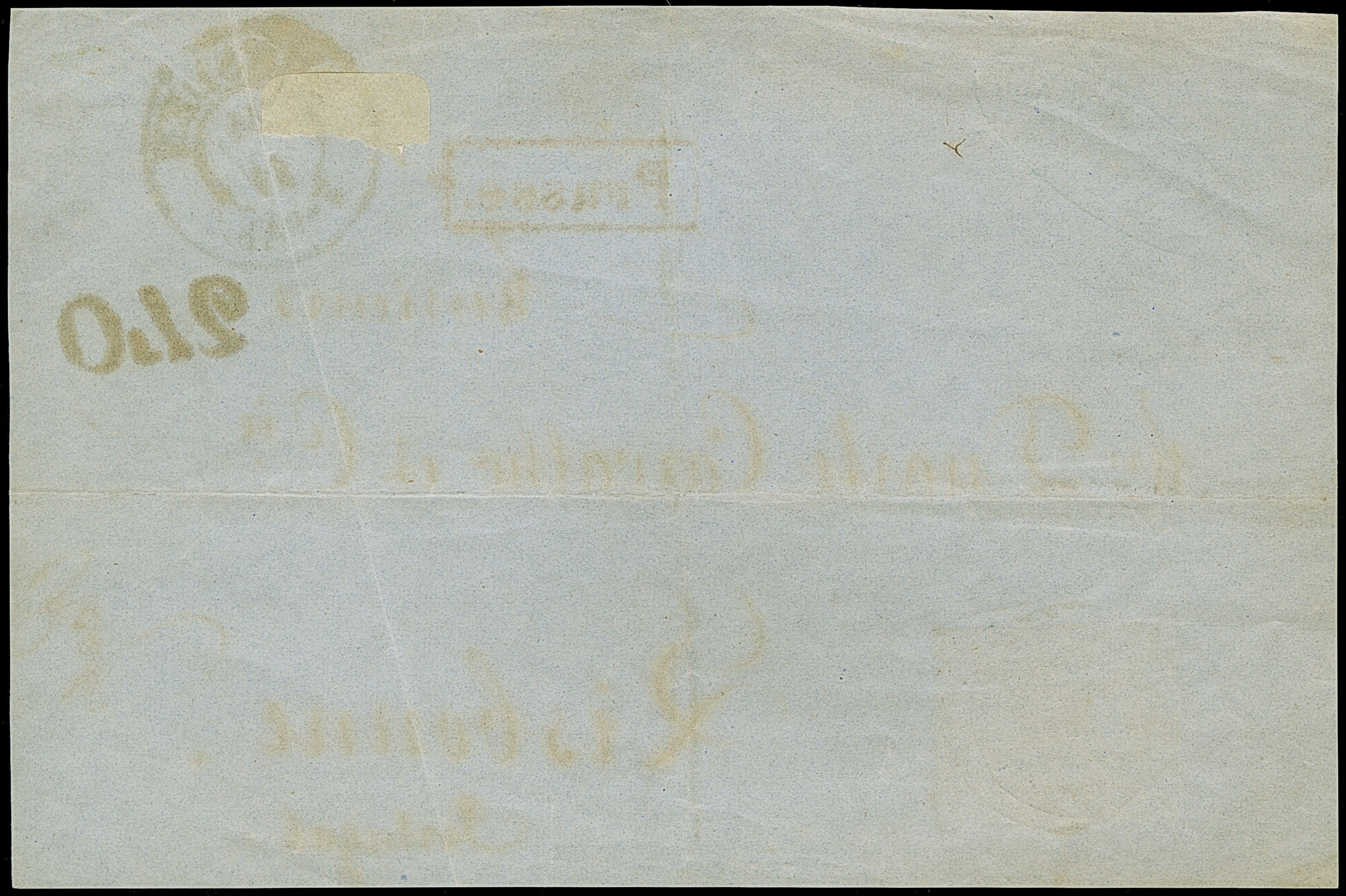3 Ngr. auf gelb, mit sauberer Nr. "1" und nebengesetztem Doppelkreisstempel "DRESDEN 24/11". auf Briefvorderseite nach Lissabon, mit nebengesetztem roten Ra1 "Prusse." und Taxstempel "240" (Reis) für das vom Empfänger zu zahlende Porto für die Auslandsstrecke. Ein äußerst seltener Beleg der postvertragslosen Zeit vor 1864.