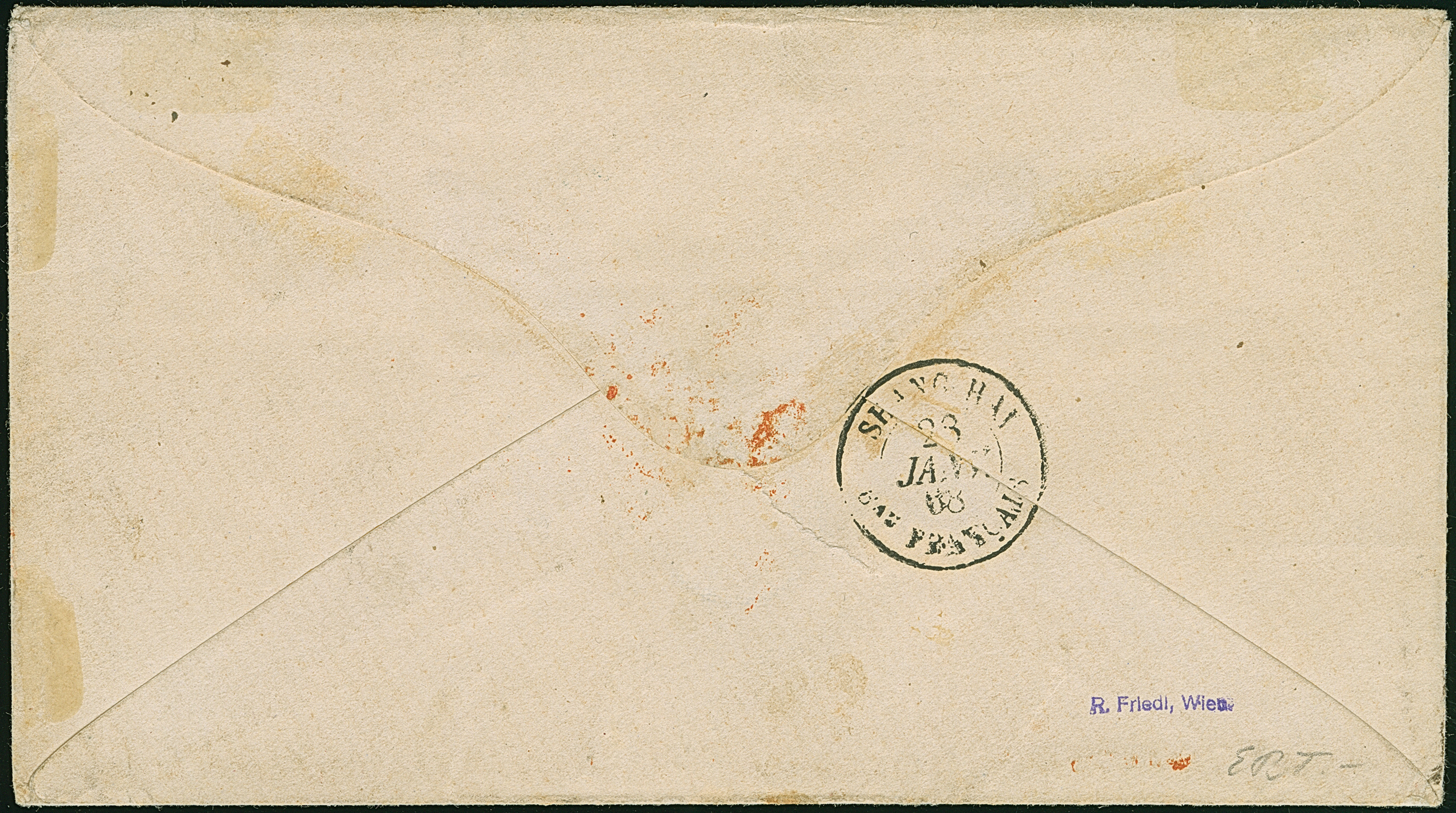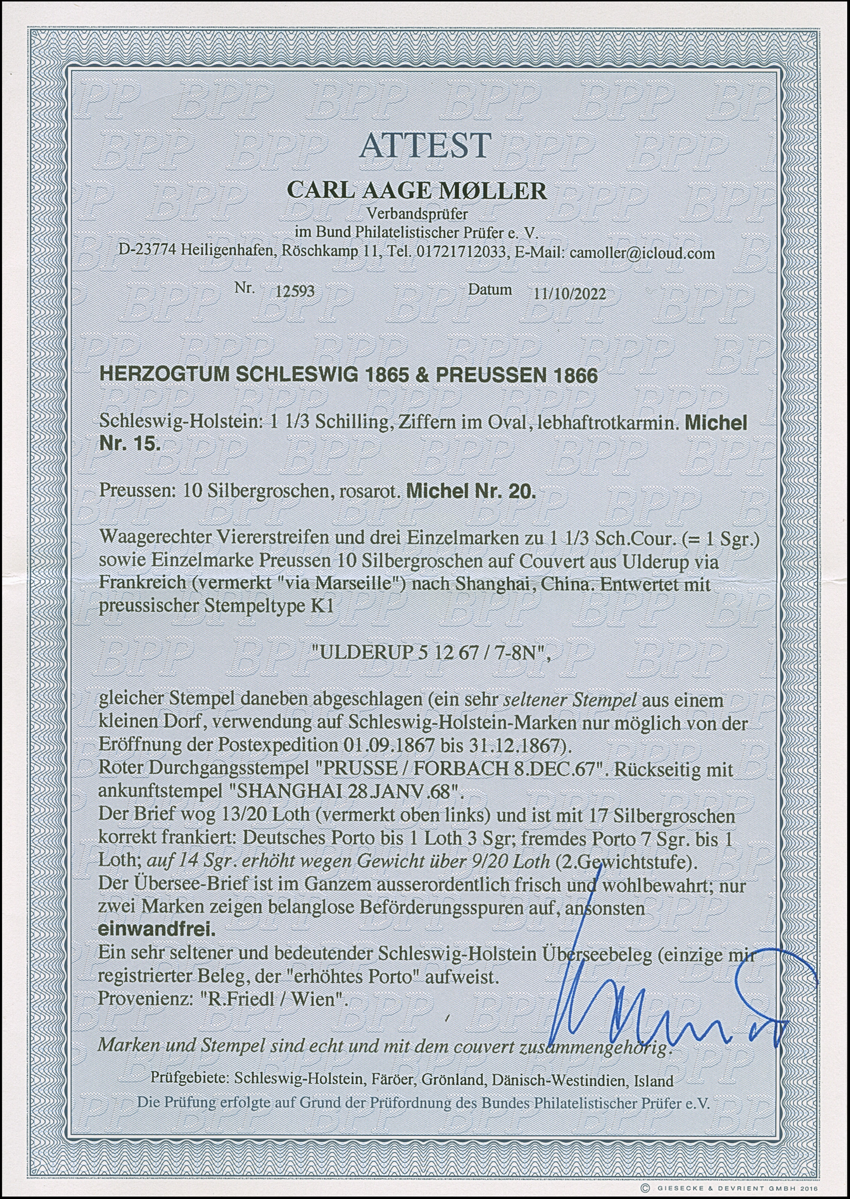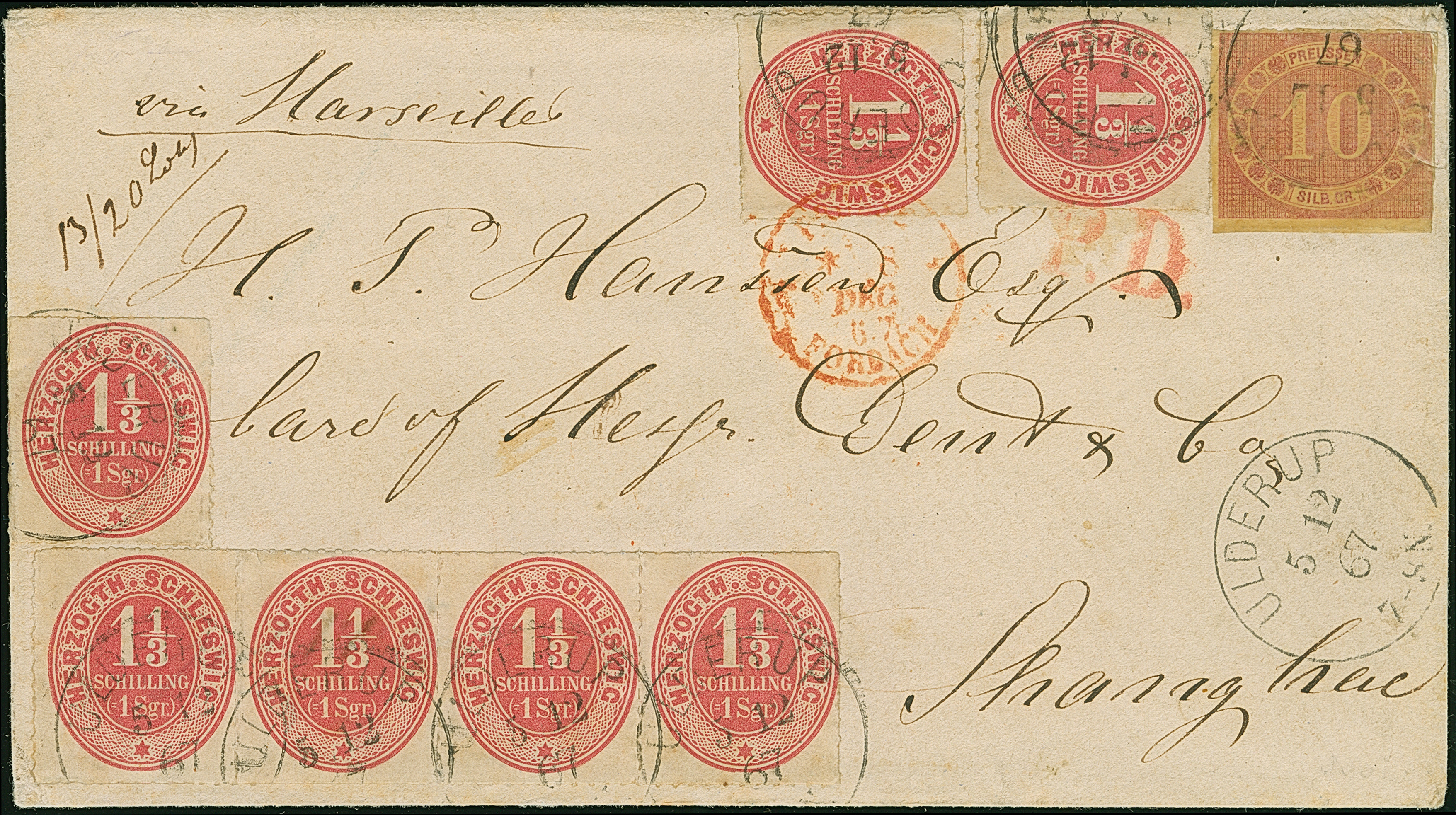 1865/67, 1⅓ Sch. lebhaftrotkarmin, waagerechter Vierer-Streifen und 3 Einzelmarken in Mischfrankatur mit Preußen 10 Silbergroschen rosarot, alle farbfrisch und mit meist gutem Durchstich, die 10 Silbergroschen teils übliche Scherentrennung, mit mehrfach sauber auf- und nebengesetztem EKr. "ULDERUP 5 12 67" auf Briefkuvert der 2. französischen Gewichtsstufe über Frankreich nach Shanghai, China, mit vorderseitigem roten Transitstempel sowie Ankunftsstempel des französischen Postamtes vom 28.1.1868. Ganz kleine Verwendungs- bzw. Altersspuren, insgesamt außerordentlich frische und schöne Erhaltung. Einer der spektakulärsten Auslandsbriefe der Herzogtümer und altbekanntes Unikat. Signiert Friedl, Wien, Fotoattest Moeller BPP (2022)