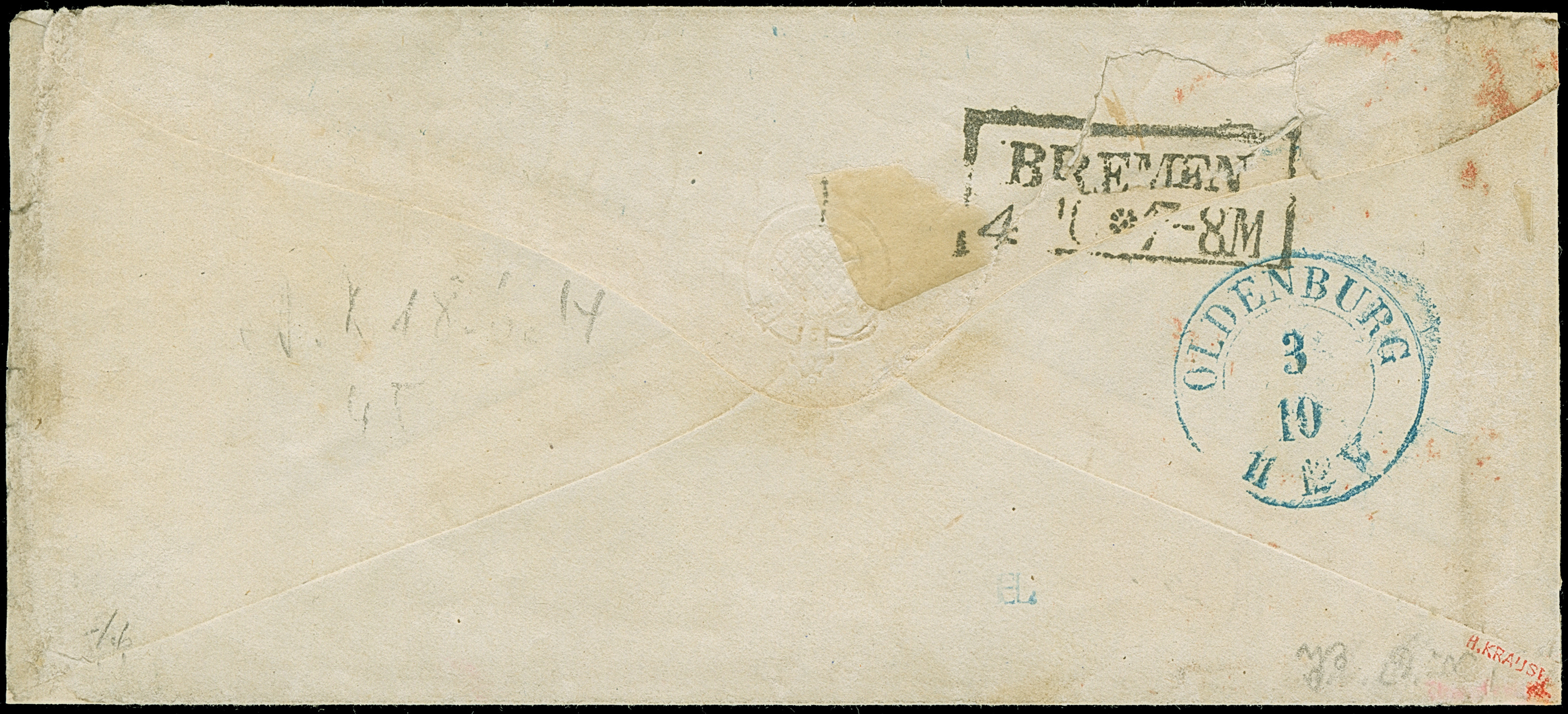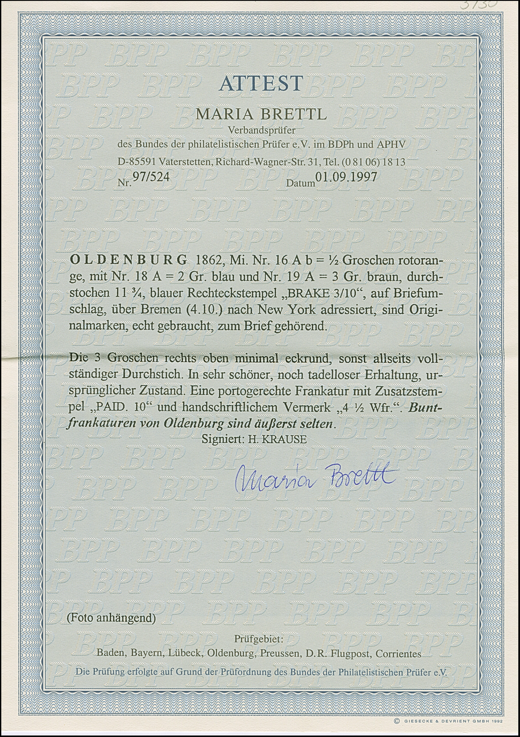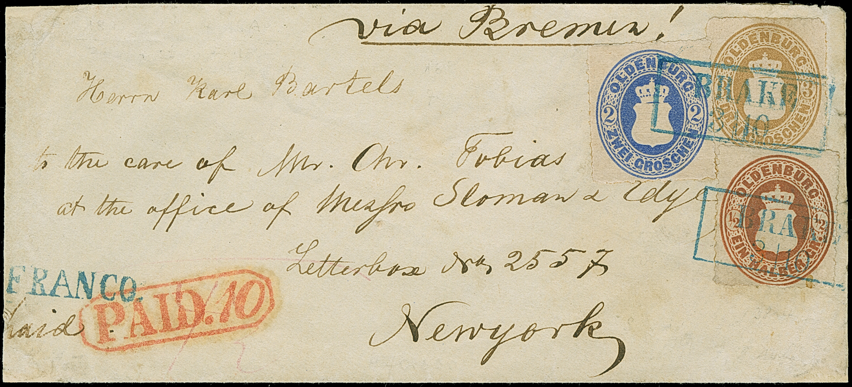 ½ Gr. rotorange, 2 Gr. blau und 3 Gr. braun je mit Durchstich 11¾ und blauem Rahmenstempel “BRAKE 3.10.” als tarifgerechte Frankatur auf kleinformatigem Umschlag via Oldenburg und Bremen mit blauem L1 “FRANCO”, rotem Ra1 “PAID.10” und handschriftlichem Weiterfranko-Vermerk “4½” nach New York. Die 3 Gr. rechts oben minimal eckrund, ansonsten sind die Marken in einwandfreier Erhaltung, der Umschlag mit Patina. Eine dekorative und seltene Buntfrankatur mit Destination USA, Fotoattest Brettl BPP (1997)