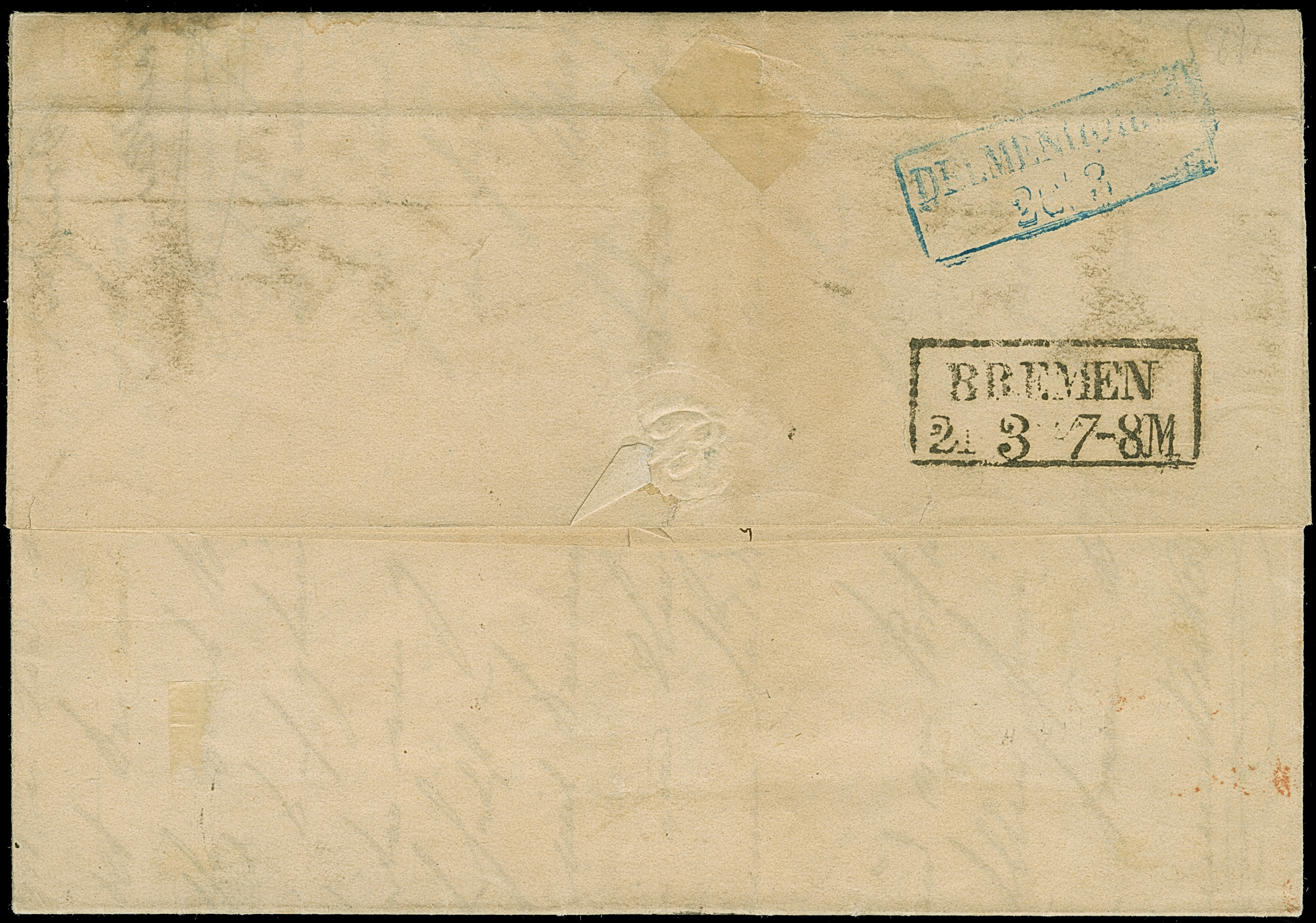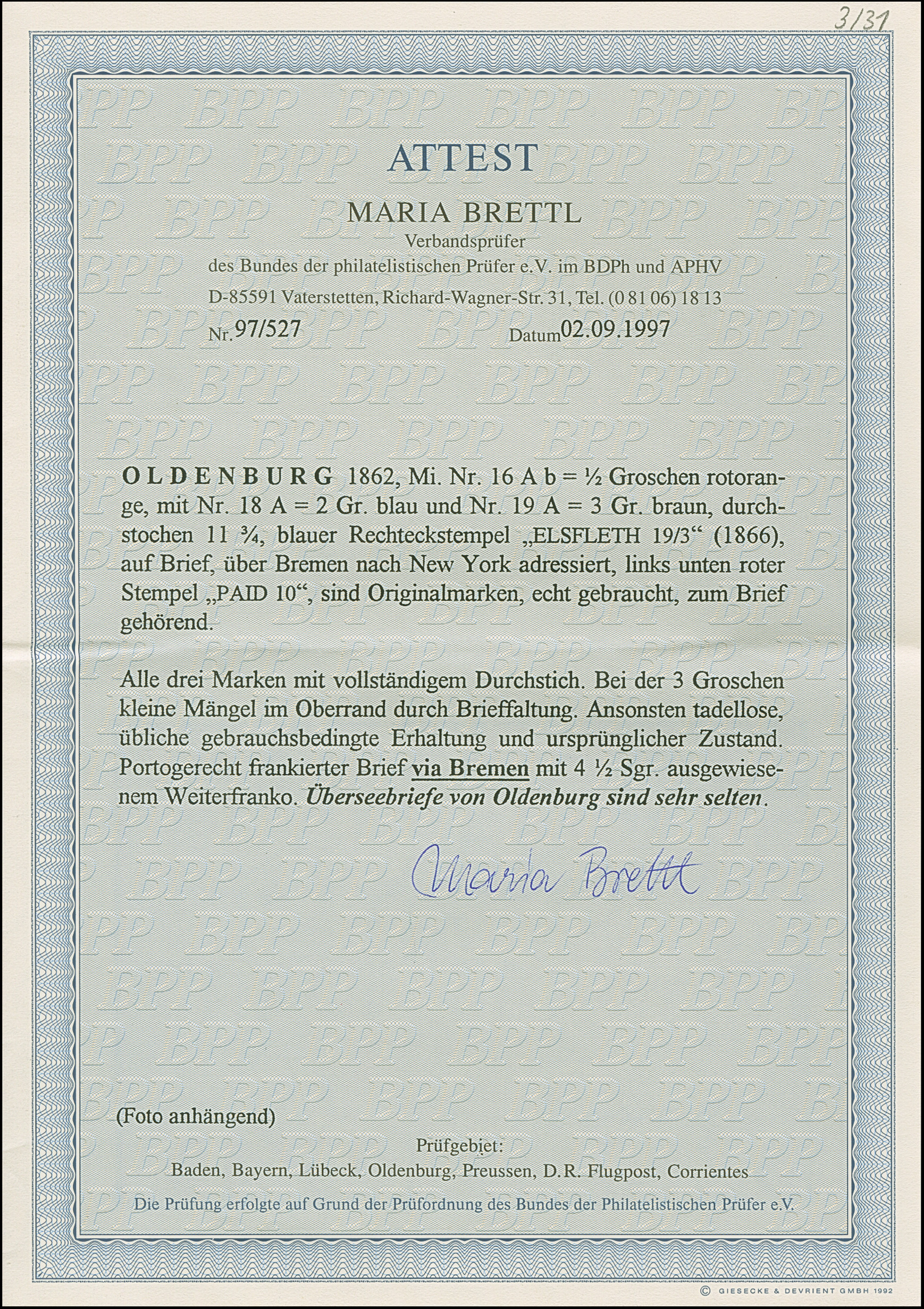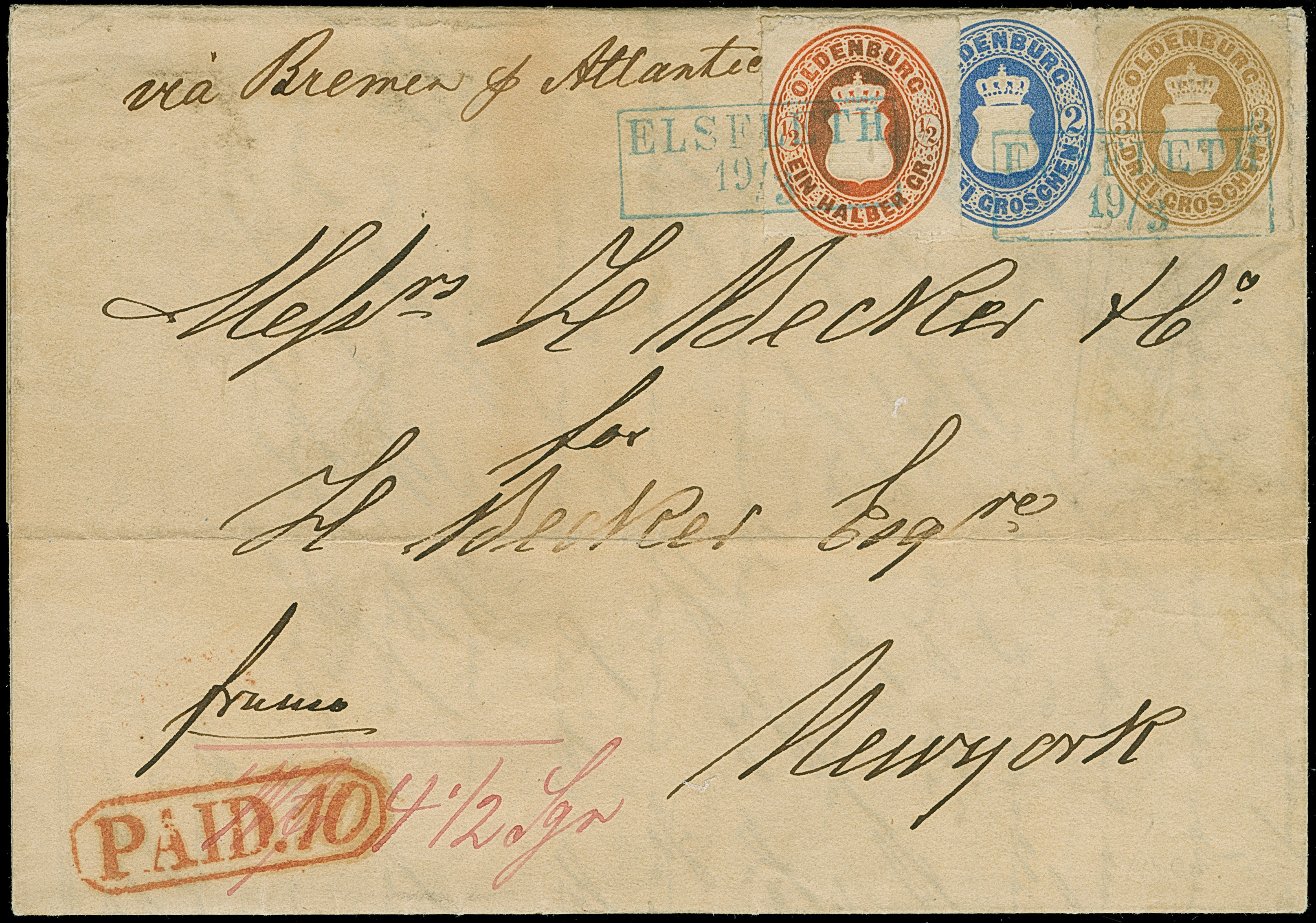 “ELSFLETH 19.3.(66)” blauer Rahmenstempel zweimal klar auf ½ Gr. rotorange, 2 Gr. blau und 3 Gr. braun als tarifgerechte Frankatur auf komplettem Faltbrief via Delmenhorst und Bremen mit rotem Ra1 “PAID.10” und Weiterfranko-Vermerk “Wfr. 4½ Sgr.” nach New York. Die 3 Gr.-Marke mit kleinen Fehlern durch Randklebung und der Faltbrief mit Patina, ansonsten in einwandfreier Erhaltung. Eine dekorative und seltene Buntfrankatur mit Destination USA, aus Elsfleth hat ProFi nur einen weiteren Brief aus dieser Korrespondenz registriert, Fotoattest Brettl BPP (1997)