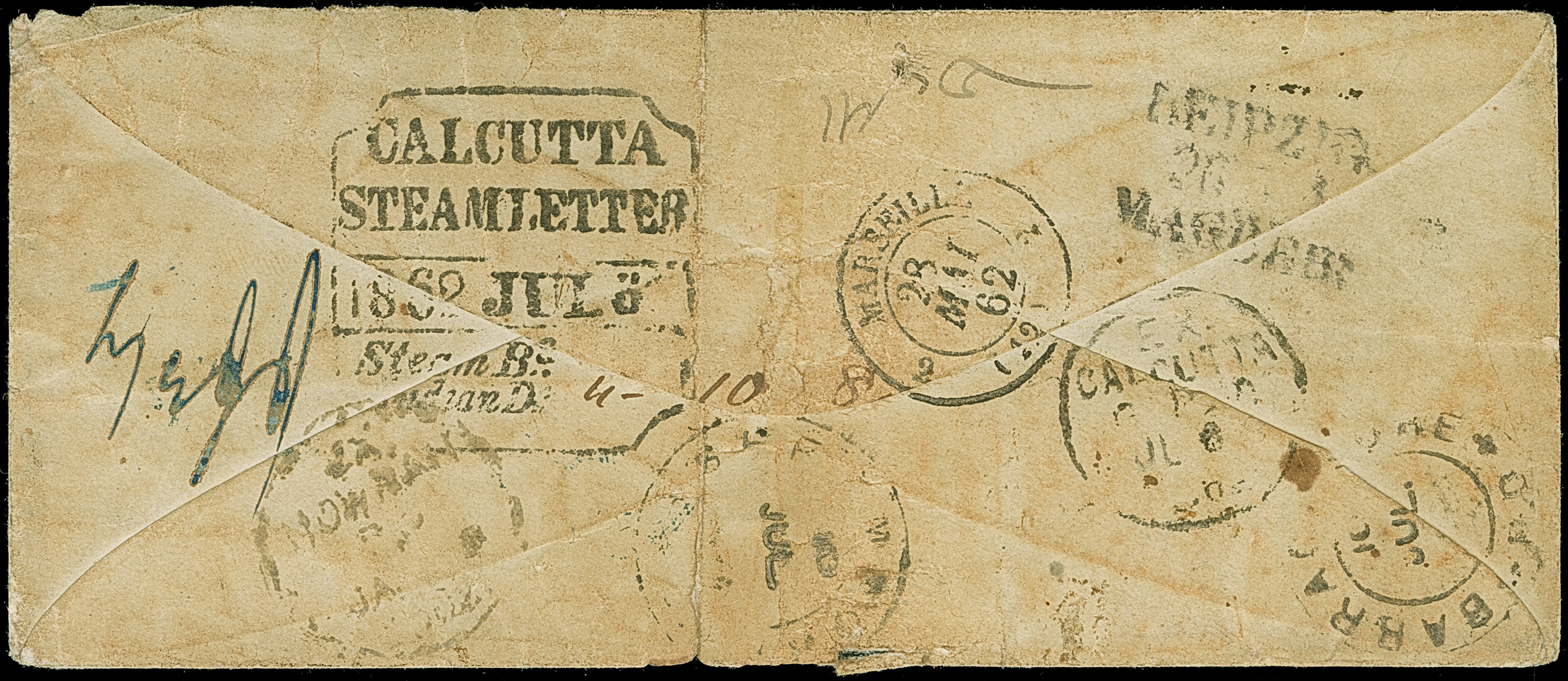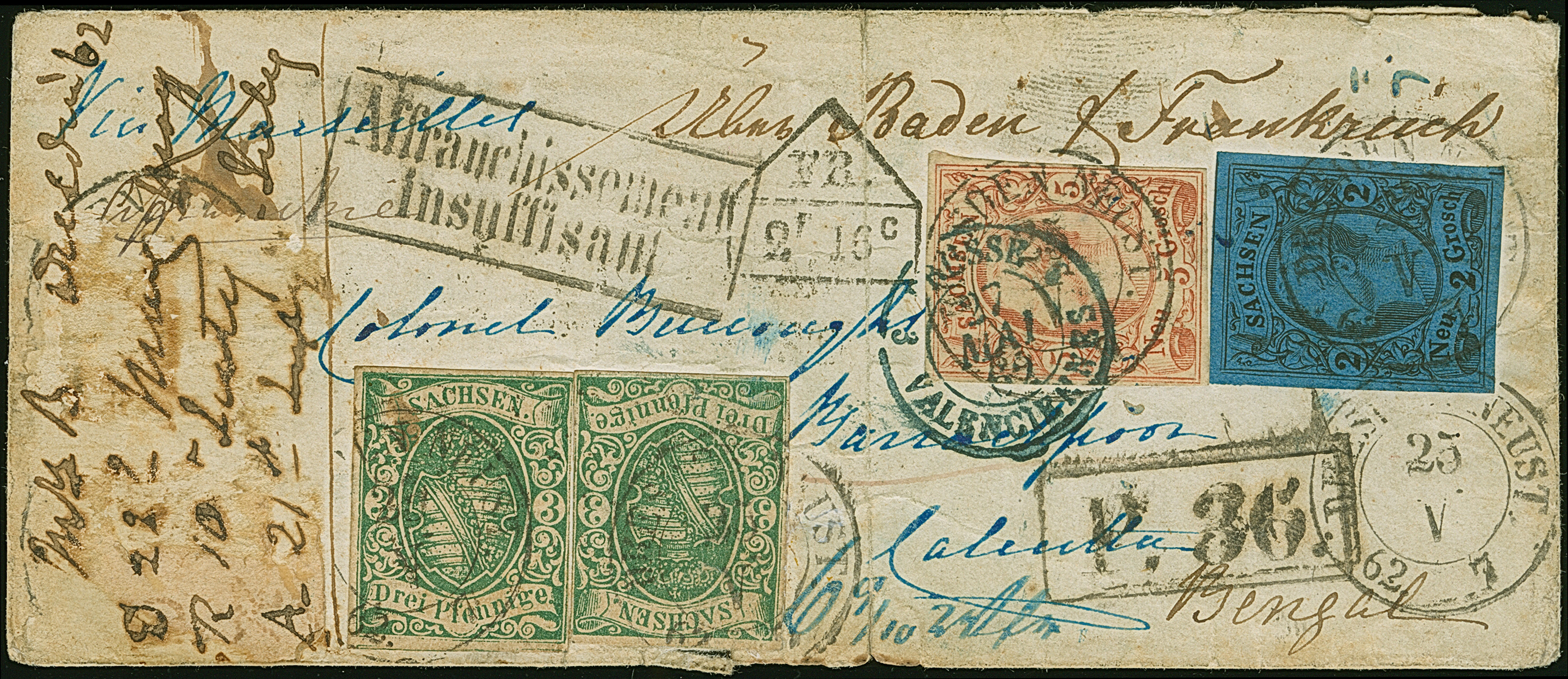 5 Ngr. ziegelrot, 2 Ngr. auf blau und 2 Einzelwerte 1851/63,3 Pfennig grün, mit Doppelkreisstempel Dresden-NEUST. 25 V 62 auf Briefkuvert mit Leitvermerk "Über Baden und Frankreich", jedoch befördert über Preußen und Frankreich, nach Barrackpoor bei Calcutta. Der Brief war bei Aufgabe für den vorgesehenen Leitweg vollständig frankiert mit 9 9/10 Ngr. (Weiterfranko von 6 9/10 Ngr. korrekt notiert), jedoch zwei links klebend Werte (3 Pfennig und 2 Ngr.) bereits im deutschen Transit abgefallen. Bei Grenzübergang gestempelt mit "P. 36", Ra2 "Affranchisement insuffisante" und Taxstempel "FR. 2 F 16 C" (Strafporto pro Unze). Rückseitig diverse Transit- und Ankunftsstempel sowie “CALCUTTA STEAMLETTER Bg. Indian Do.”. Übliche Beförderungsspuren, das Kuvert außerhalb der Frankatur senkrecht gefaltet. Ein in dieser Form sicherlich einmaliger Brief mit äußerst seltener Destination.