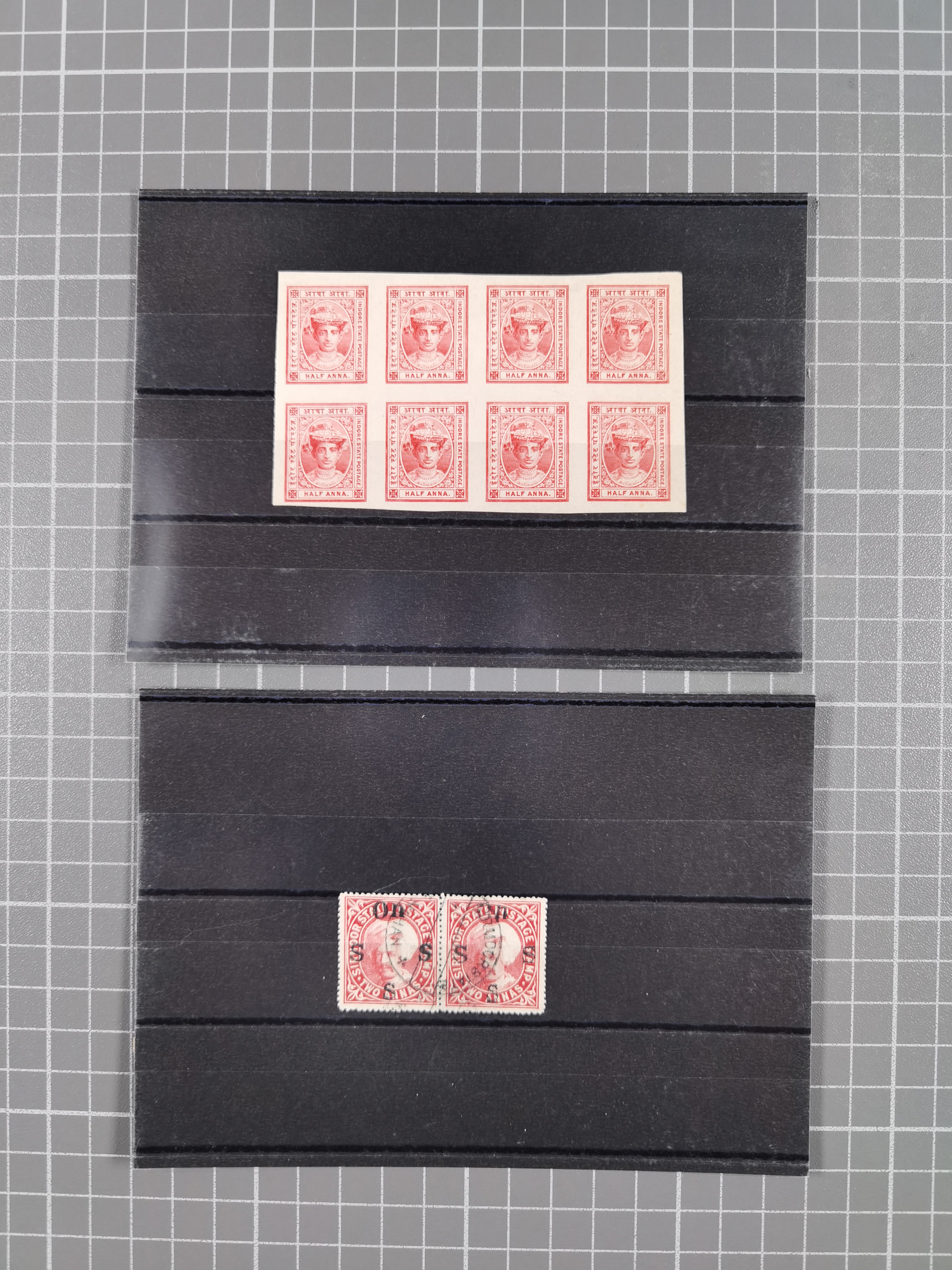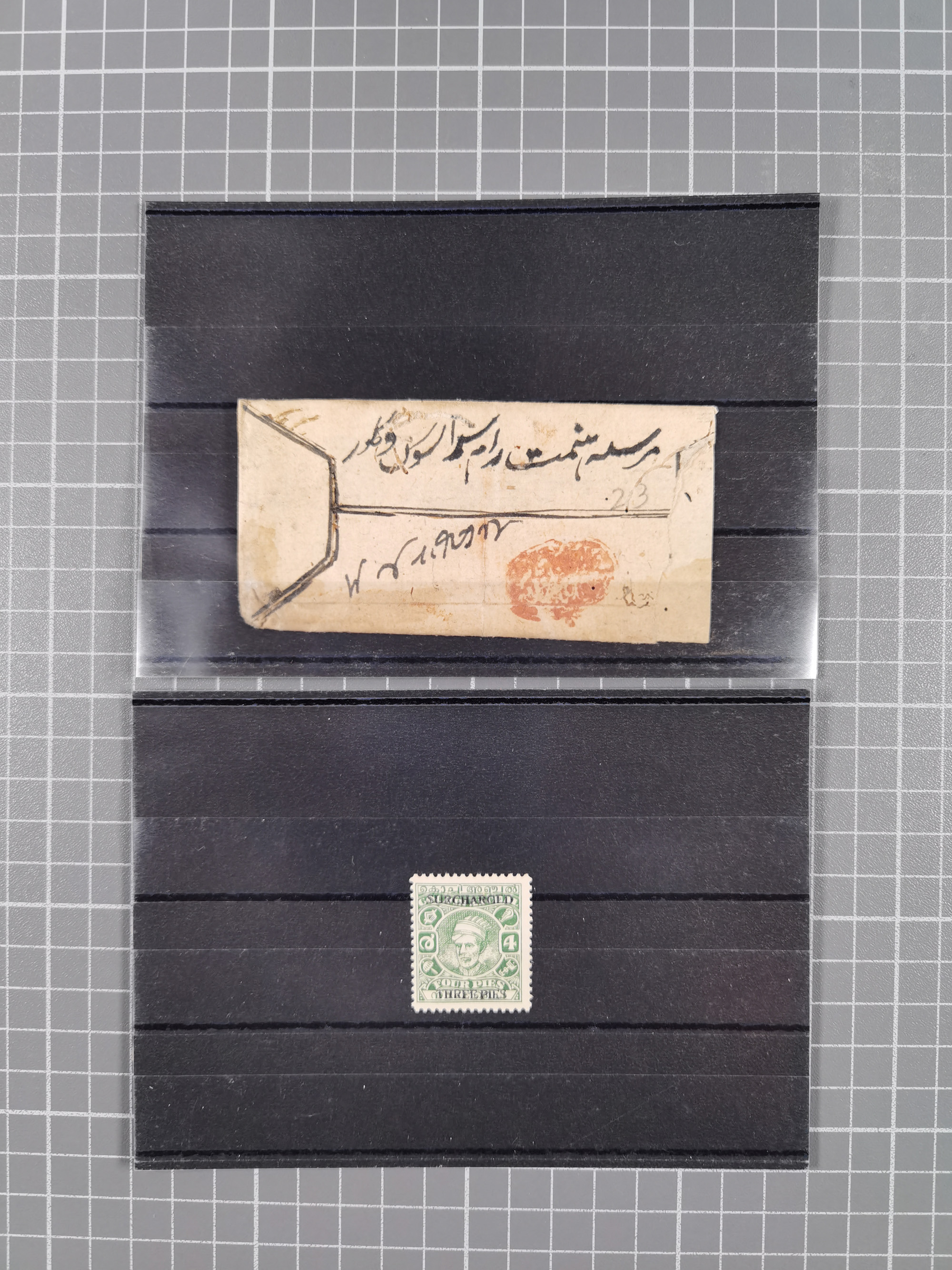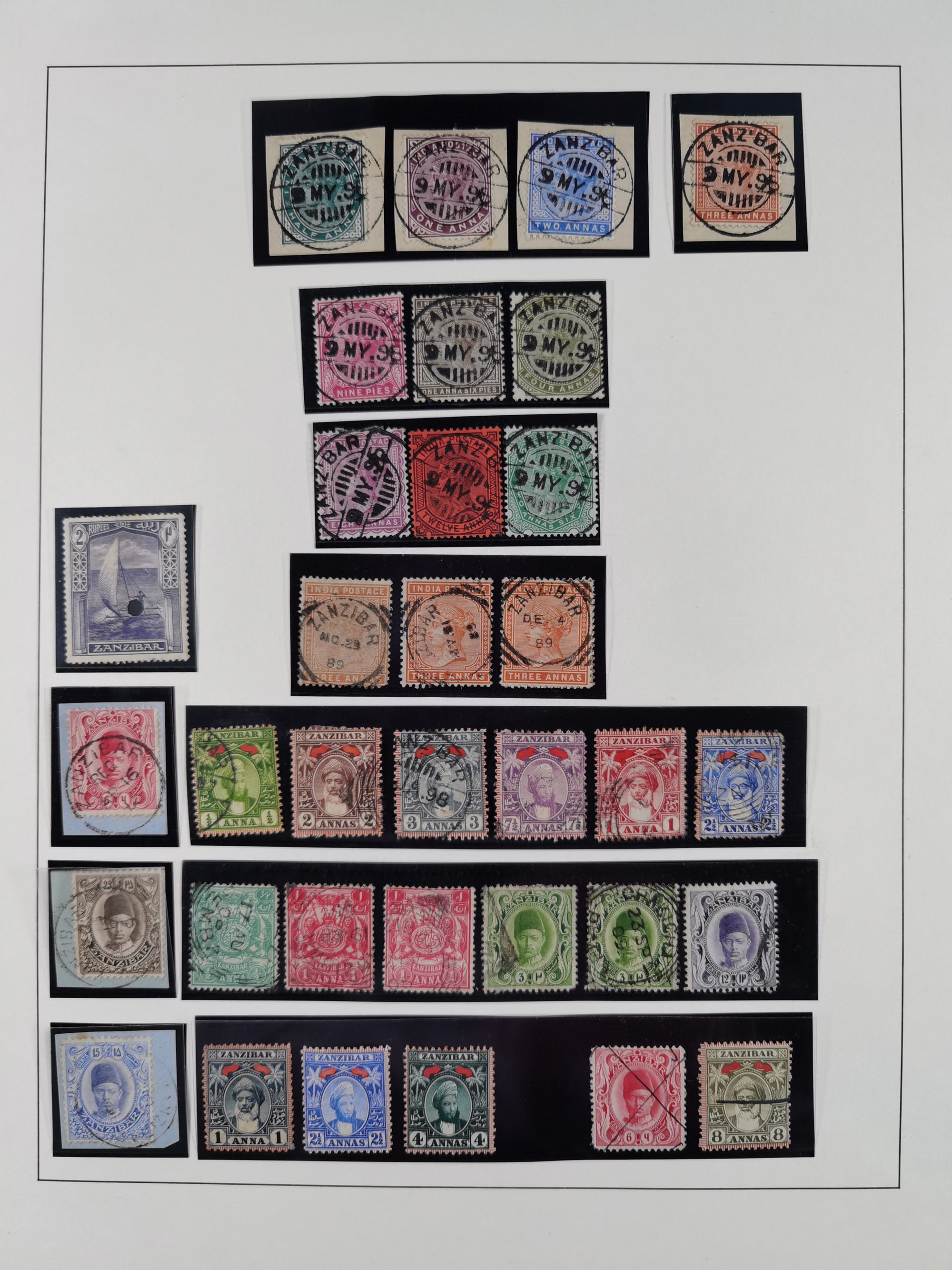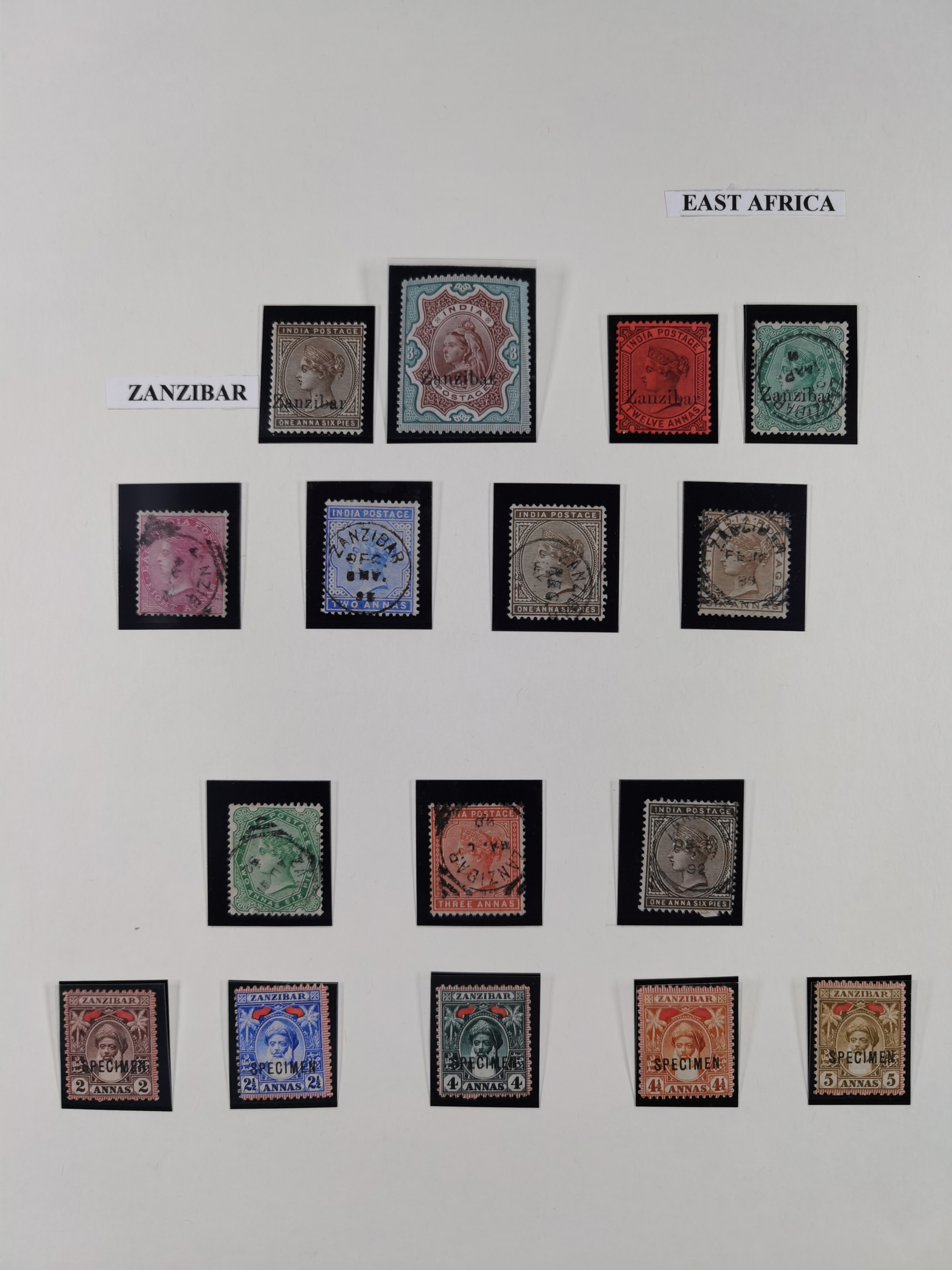 1895-1910, Small collection on two album leaves, including 3 r. 1895 unused, five Specimen overprinted stamps, India stamps with Zanzibar cancellations, postcard 1904 and three postal stationery wrapper