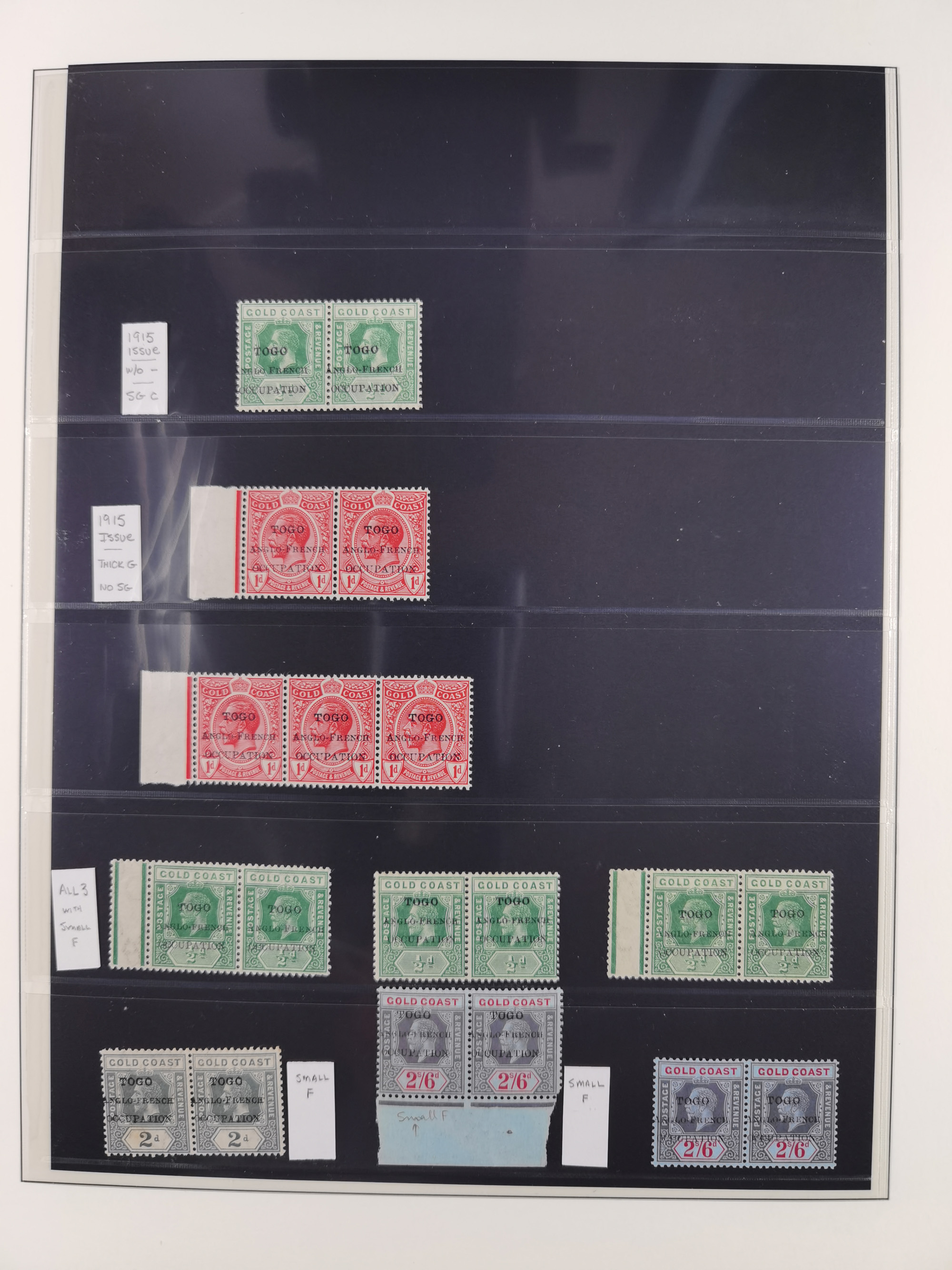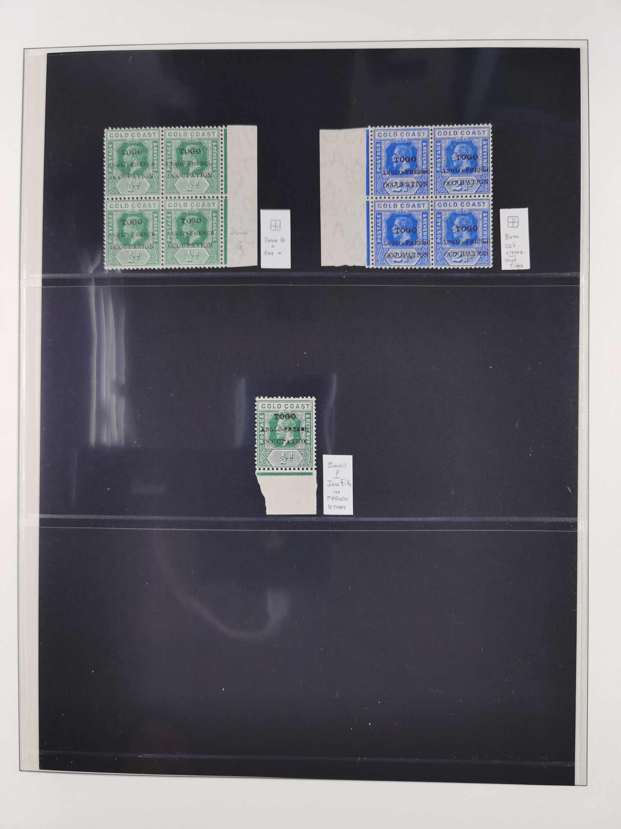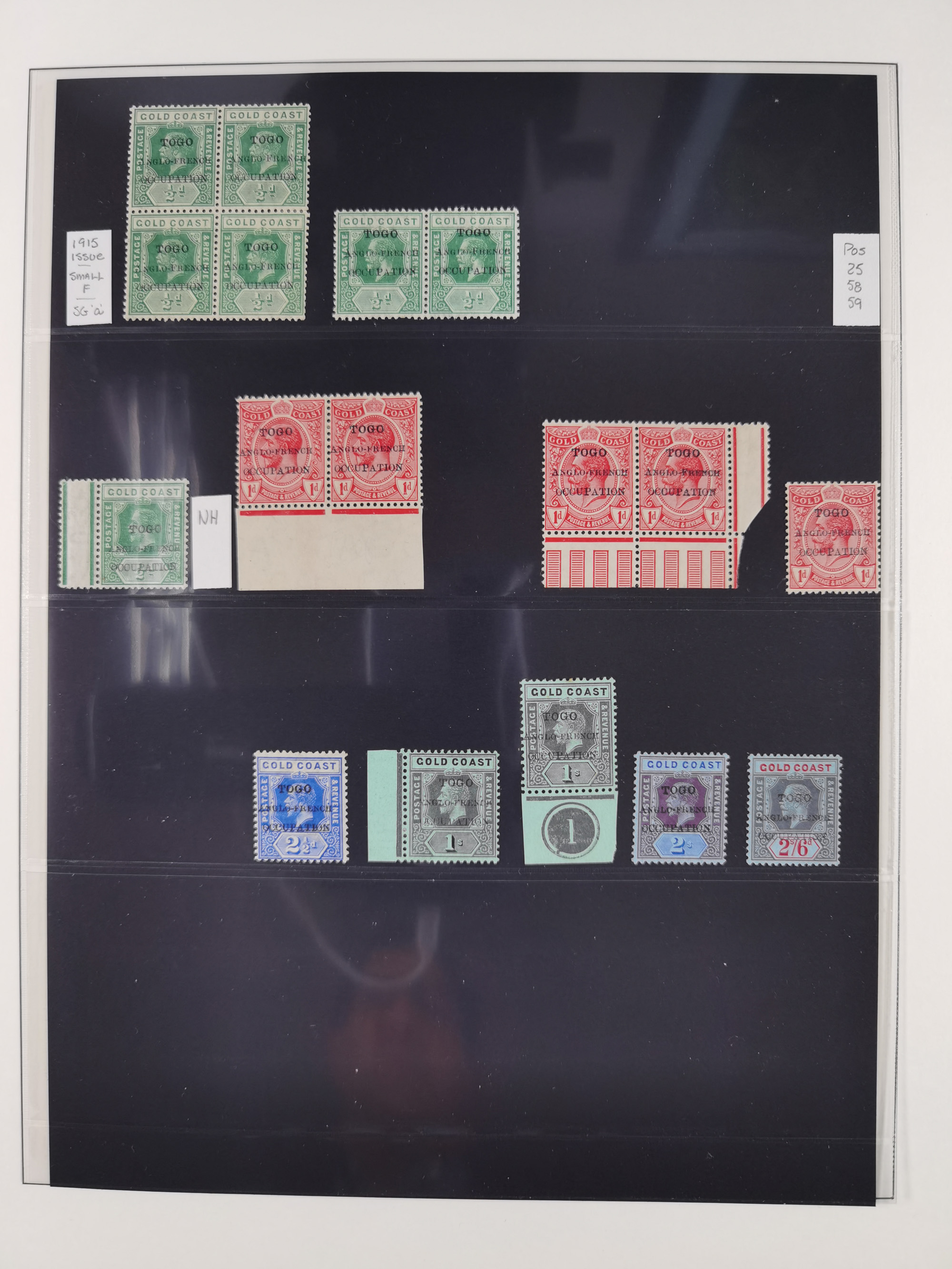 1915/16, ´TOGO / ANGLO-FRENCH / OCCUPATION´ Collection Gold Coast KGV overprinted issue mostly unused up to 5 sh. block of four used, many overprint varieties, missing letters, small ‘F’, thin ‘G’, double and missing hyphen, multiples, margin imprints, gutter pair. Mostly fine to very fine, neatly housed on expertly described nine album pages.