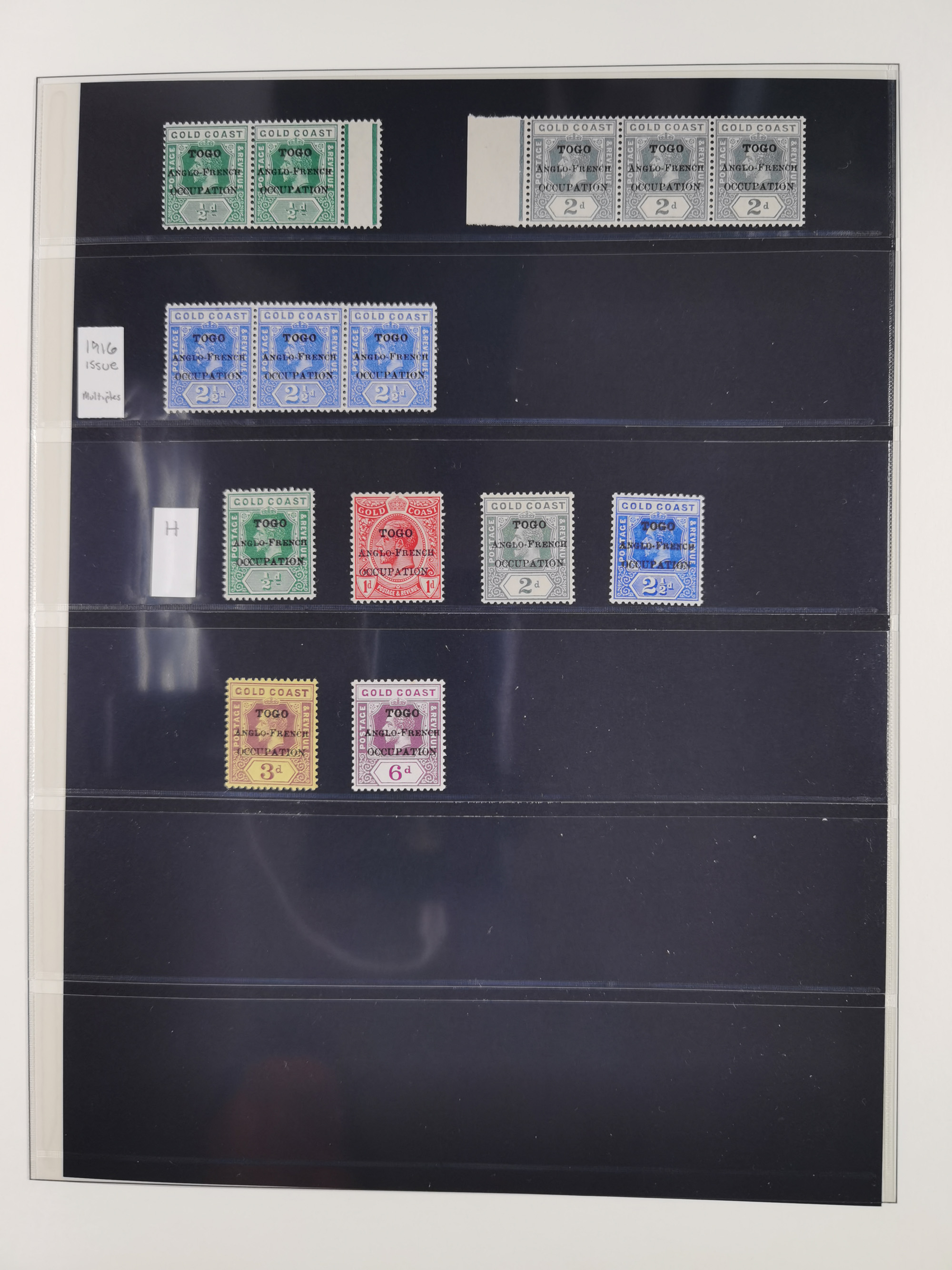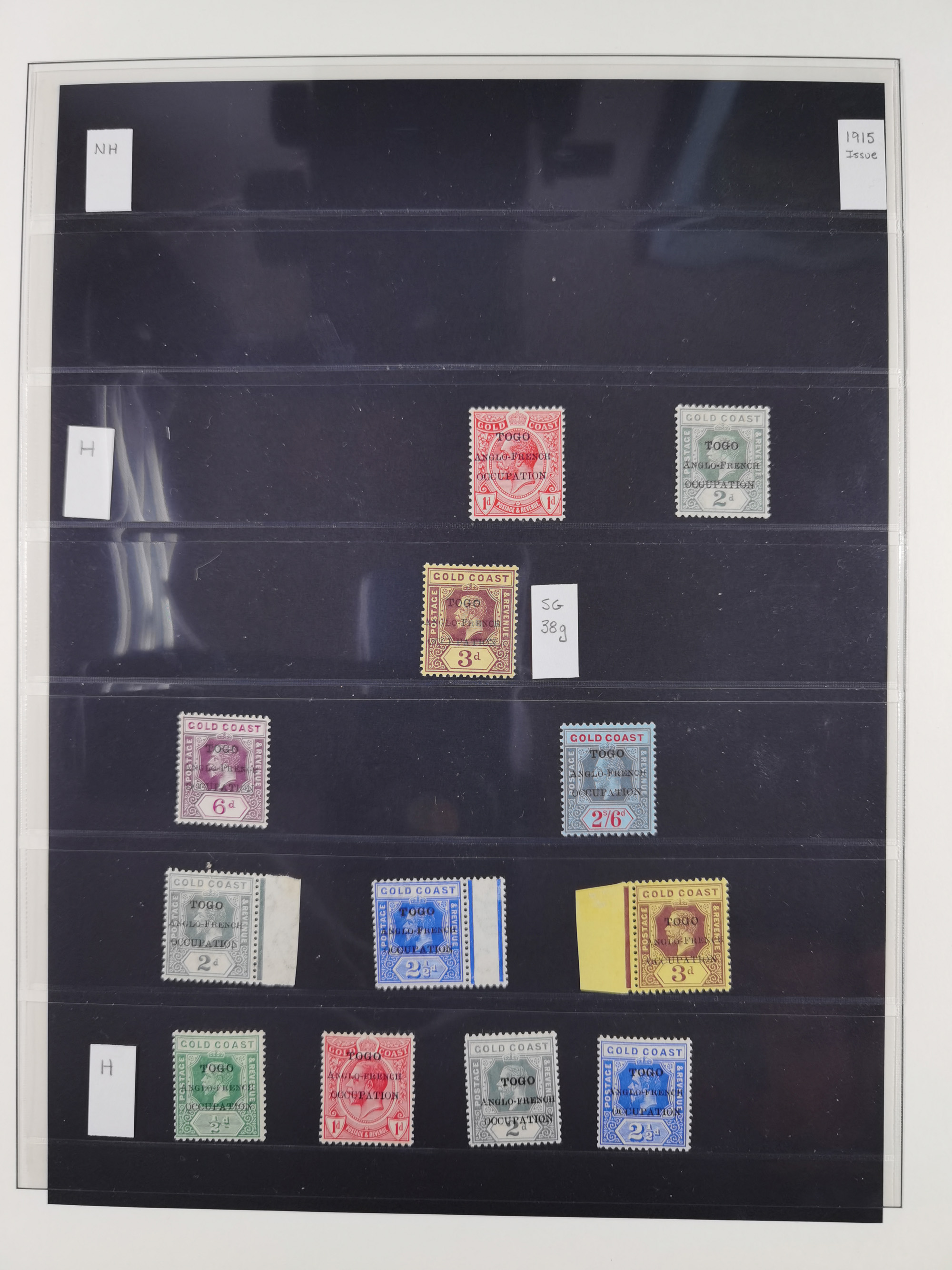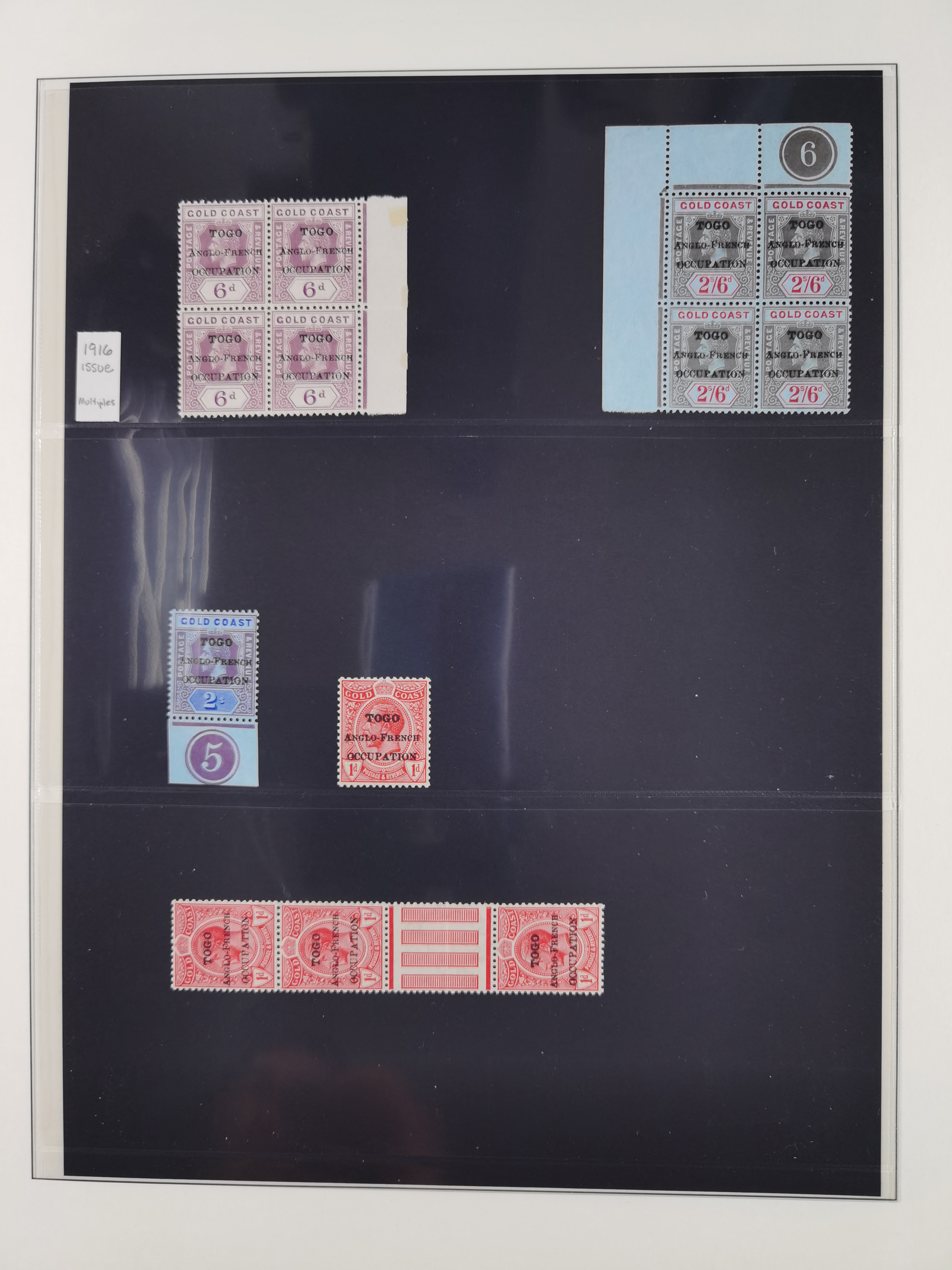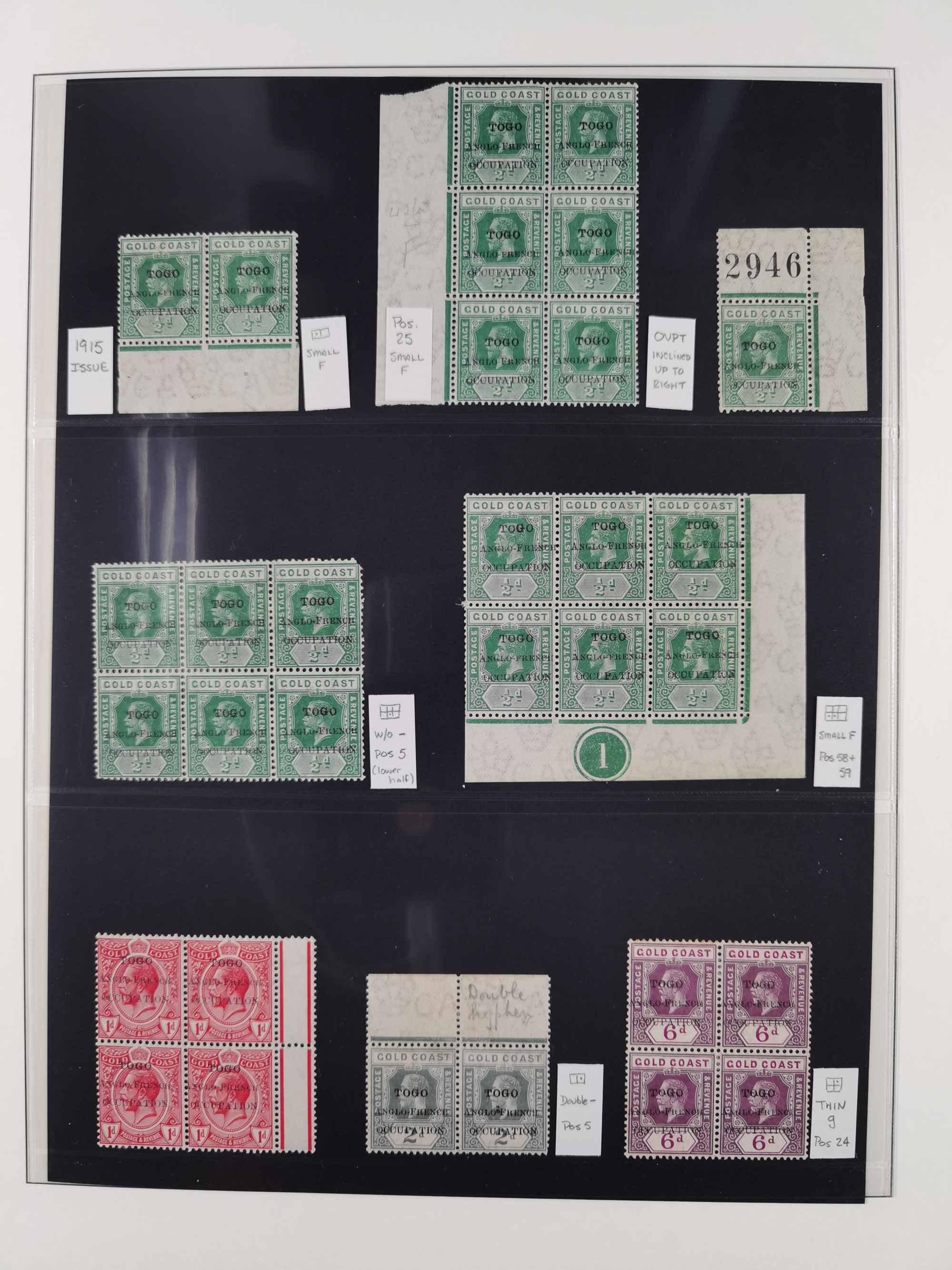 1915/16, ´TOGO / ANGLO-FRENCH / OCCUPATION´ Collection Gold Coast KGV overprinted issue mostly unused up to 5 sh. block of four used, many overprint varieties, missing letters, small ‘F’, thin ‘G’, double and missing hyphen, multiples, margin imprints, gutter pair. Mostly fine to very fine, neatly housed on expertly described nine album pages.