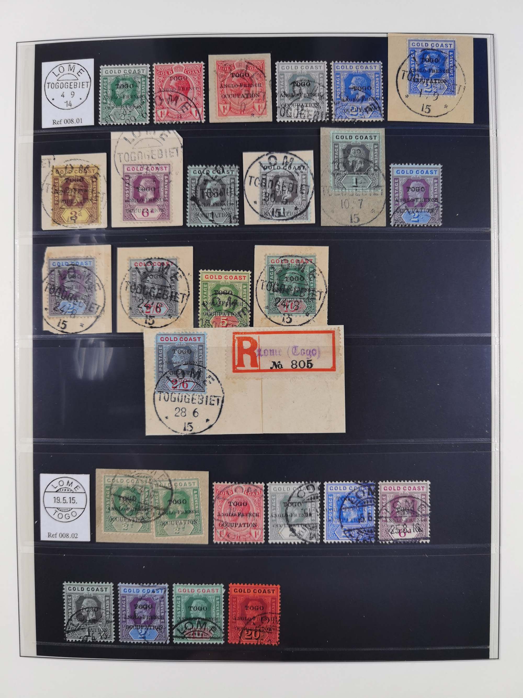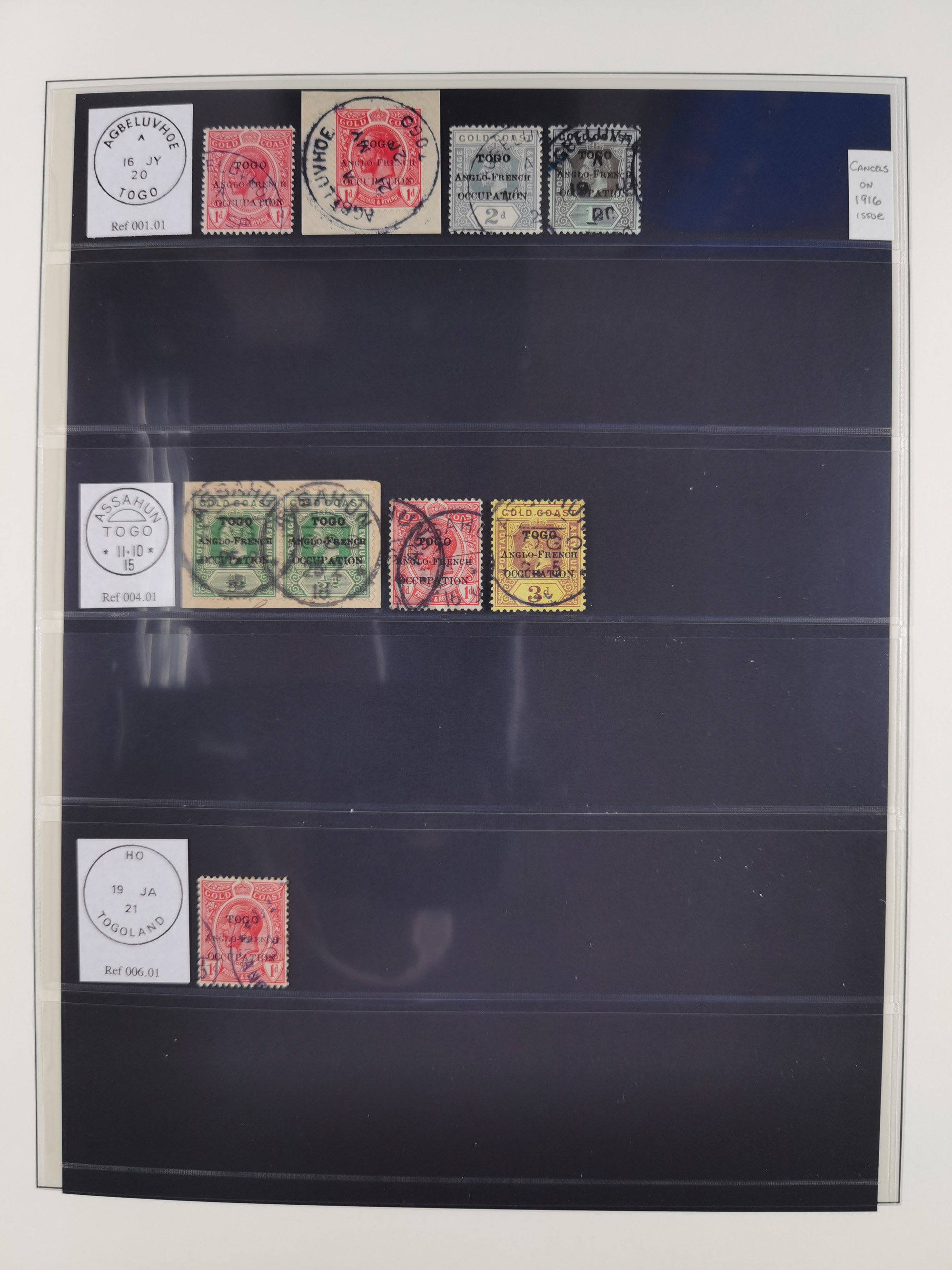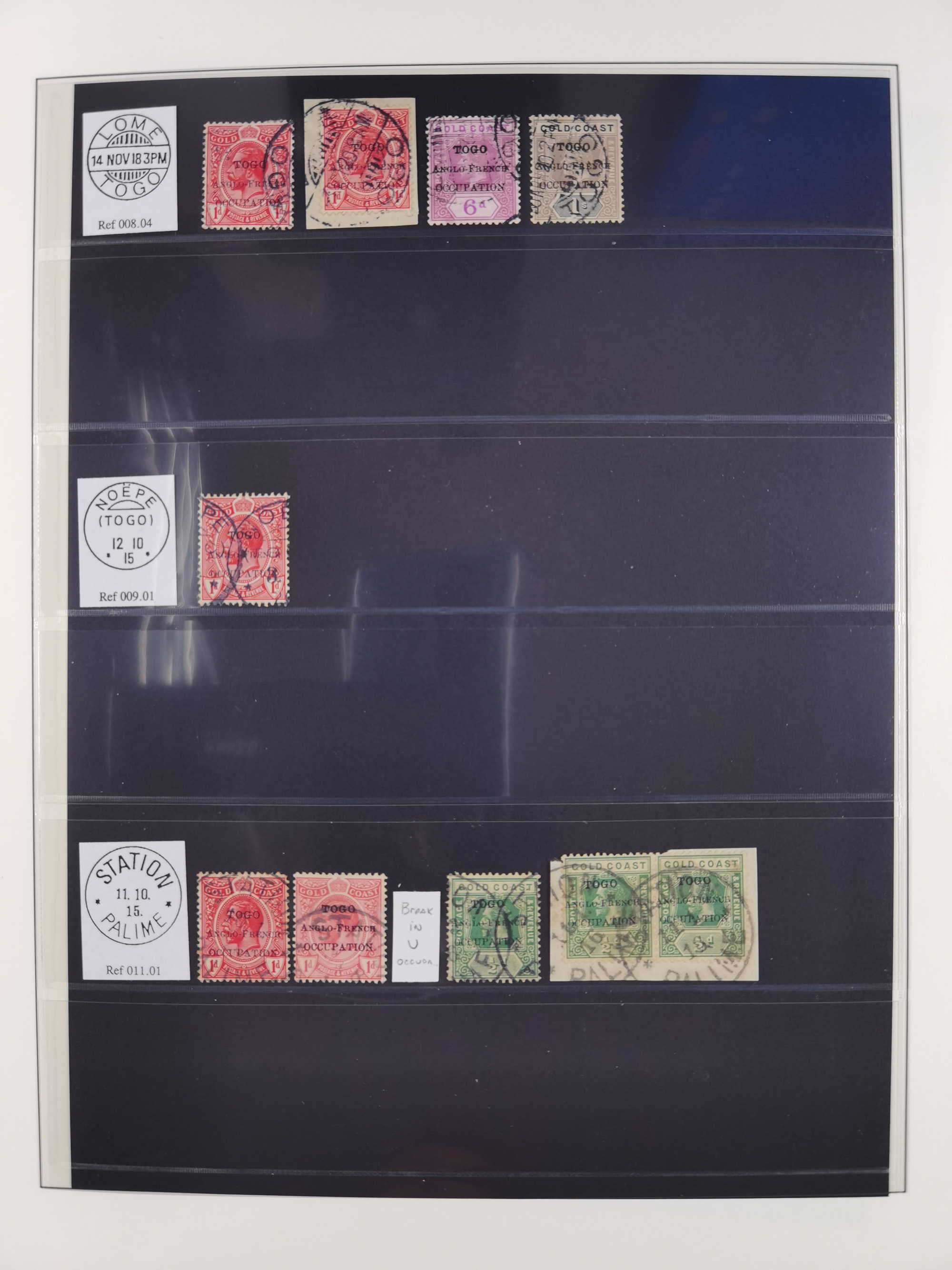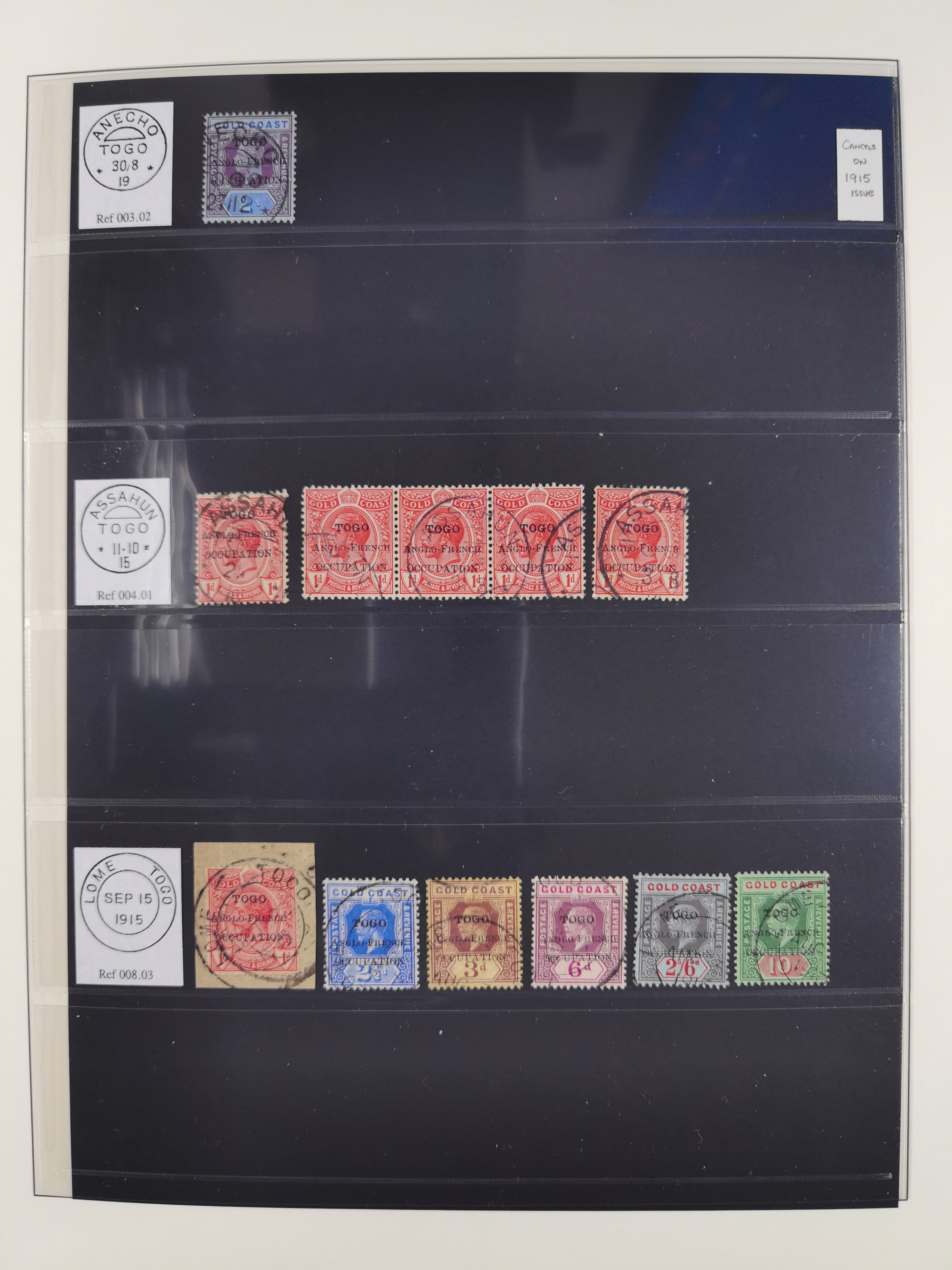 1915/16, ´TOGO / ANGLO-FRENCH / OCCUPATION´ Collection of cancellations on Gold Coast KGV overprinted issue up to 20 sh., including Anecho, Assahun, Lome Togogebiet, Noepe, Station Palime, Agbeluvhoe and Tsewie. Mostly fine, neatly housed on expertly described nine album pages.