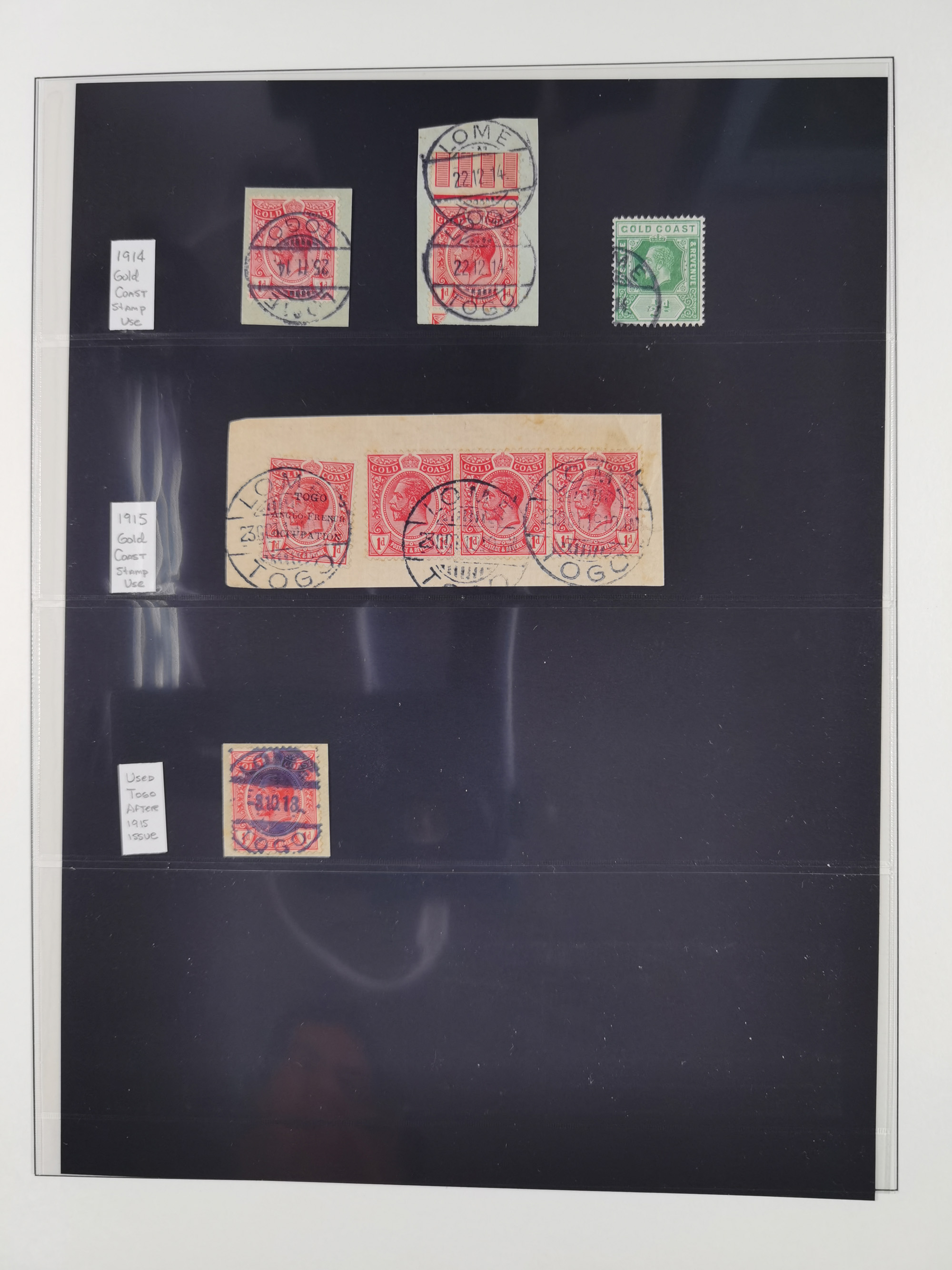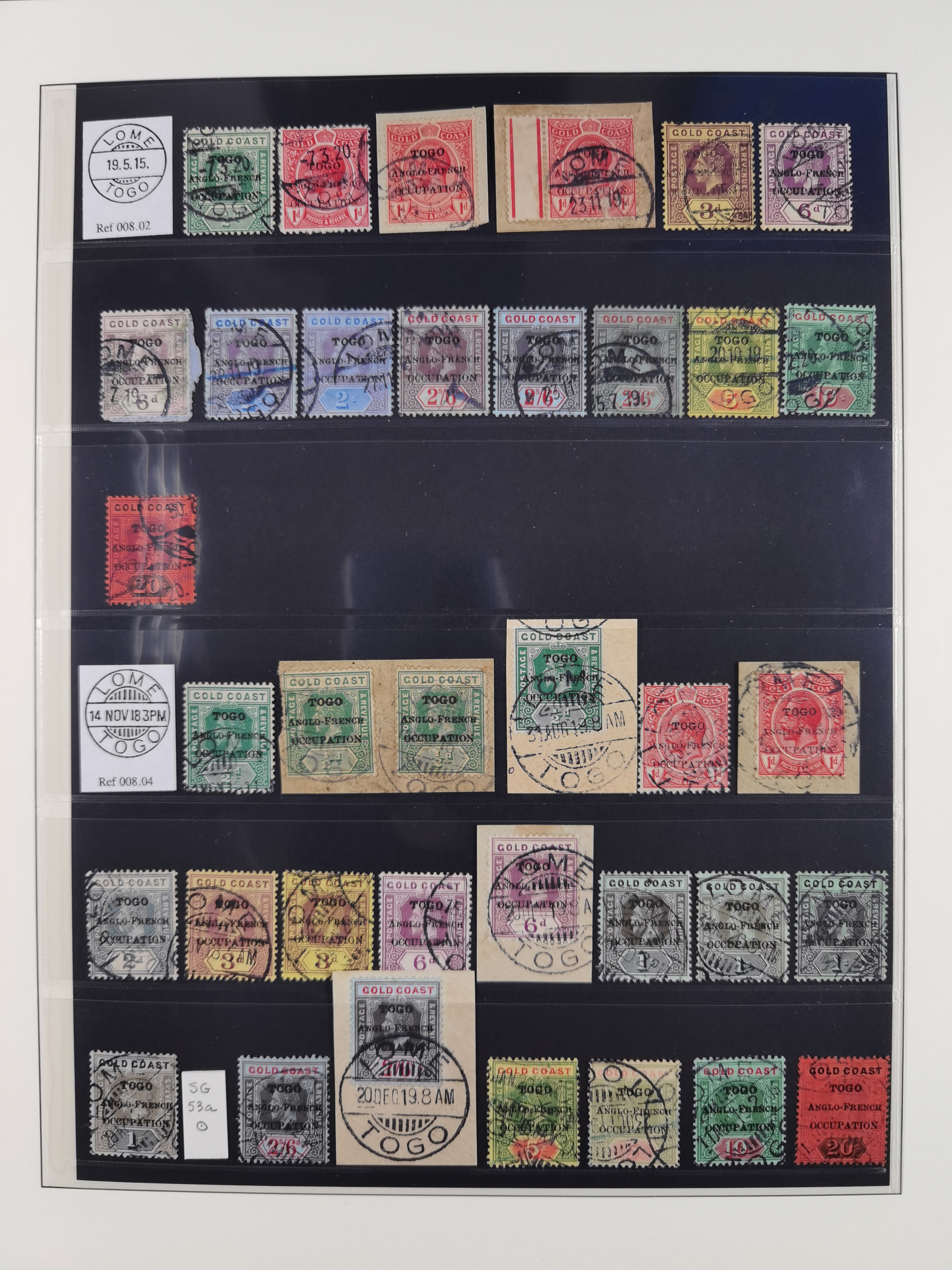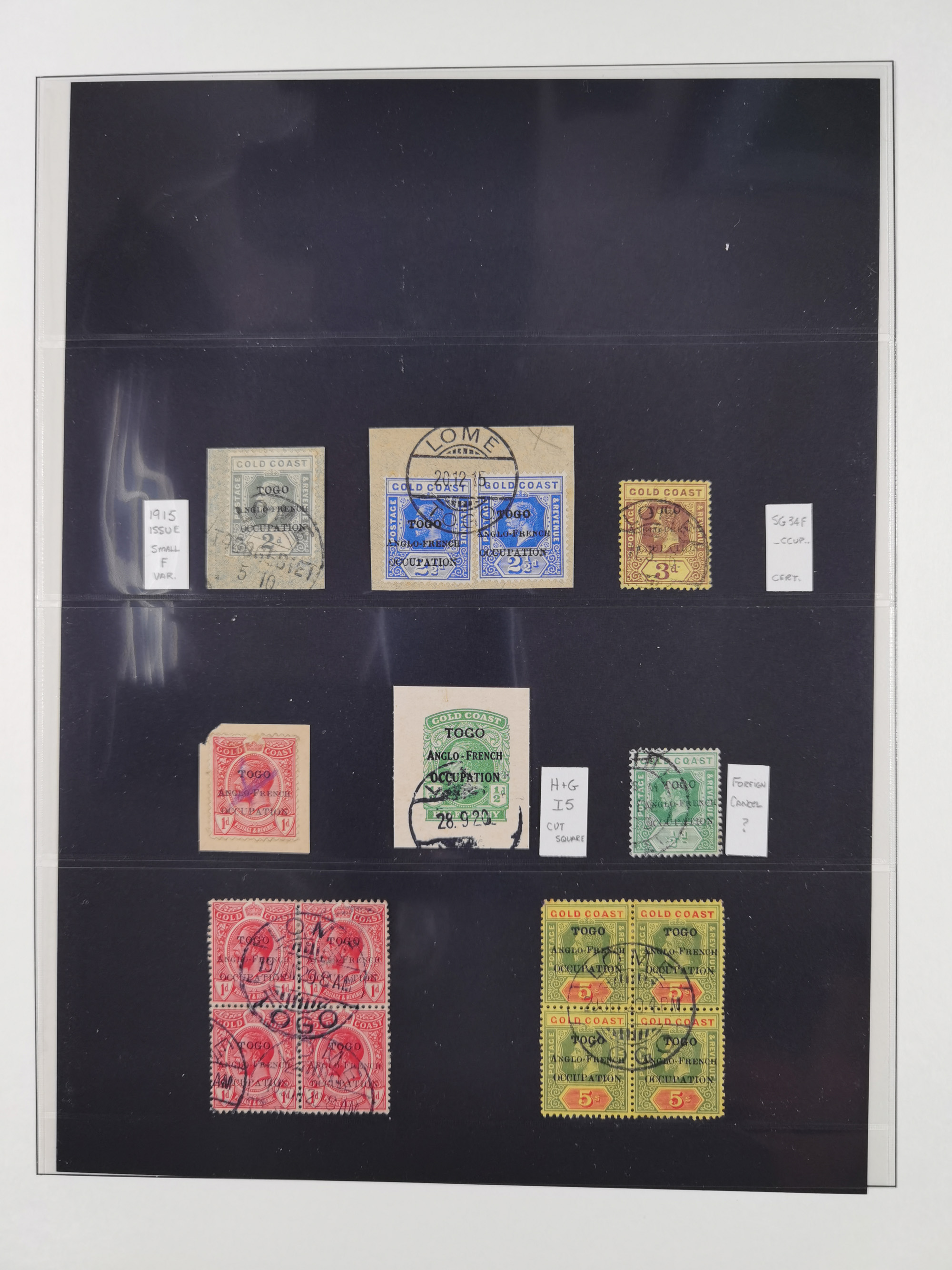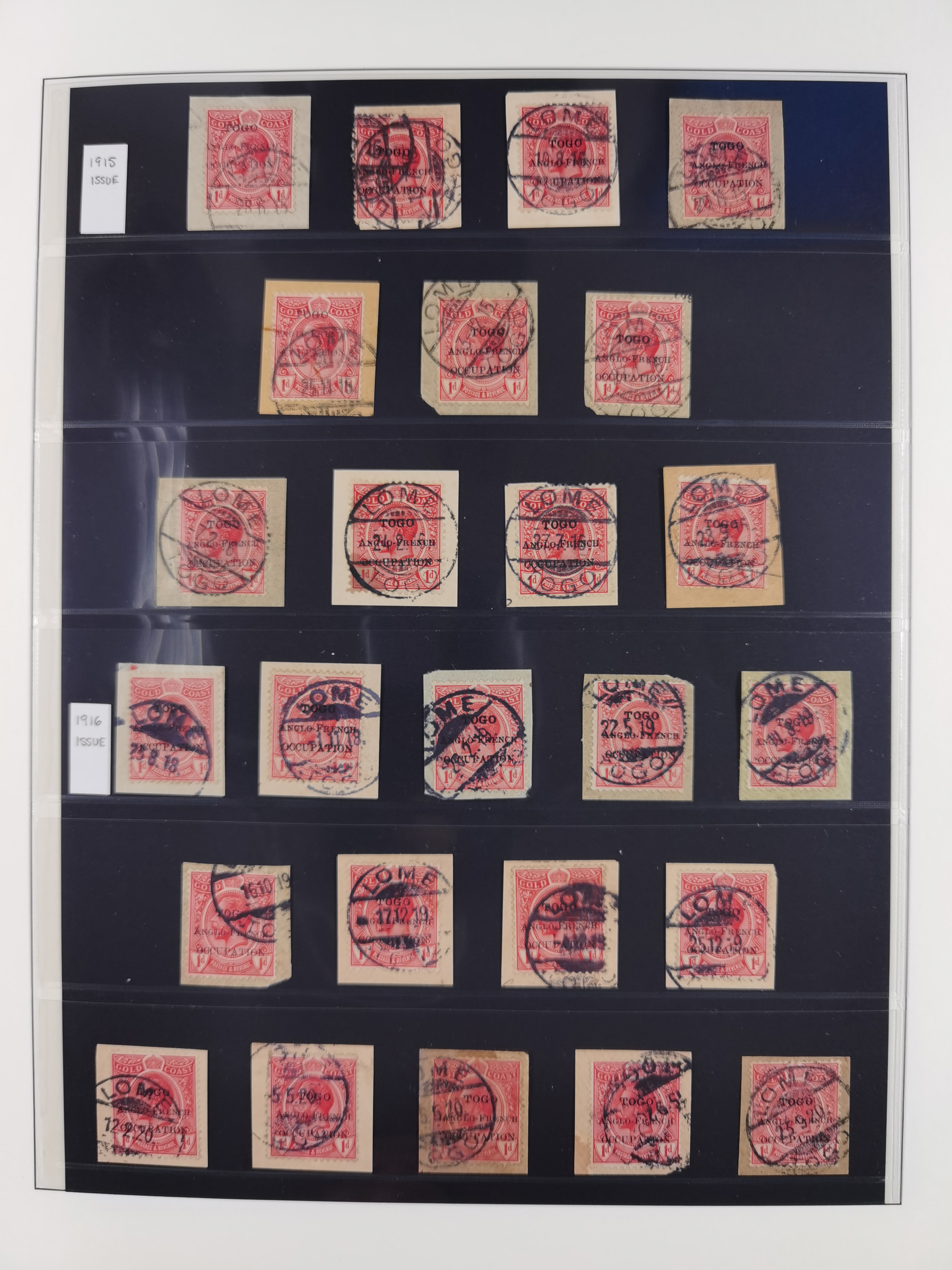 1915/16, ´TOGO / ANGLO-FRENCH / OCCUPATION´ Collection of cancellations on Gold Coast KGV overprinted issue up to 20 sh., including Anecho, Assahun, Lome Togogebiet, Noepe, Station Palime, Agbeluvhoe and Tsewie. Mostly fine, neatly housed on expertly described nine album pages.