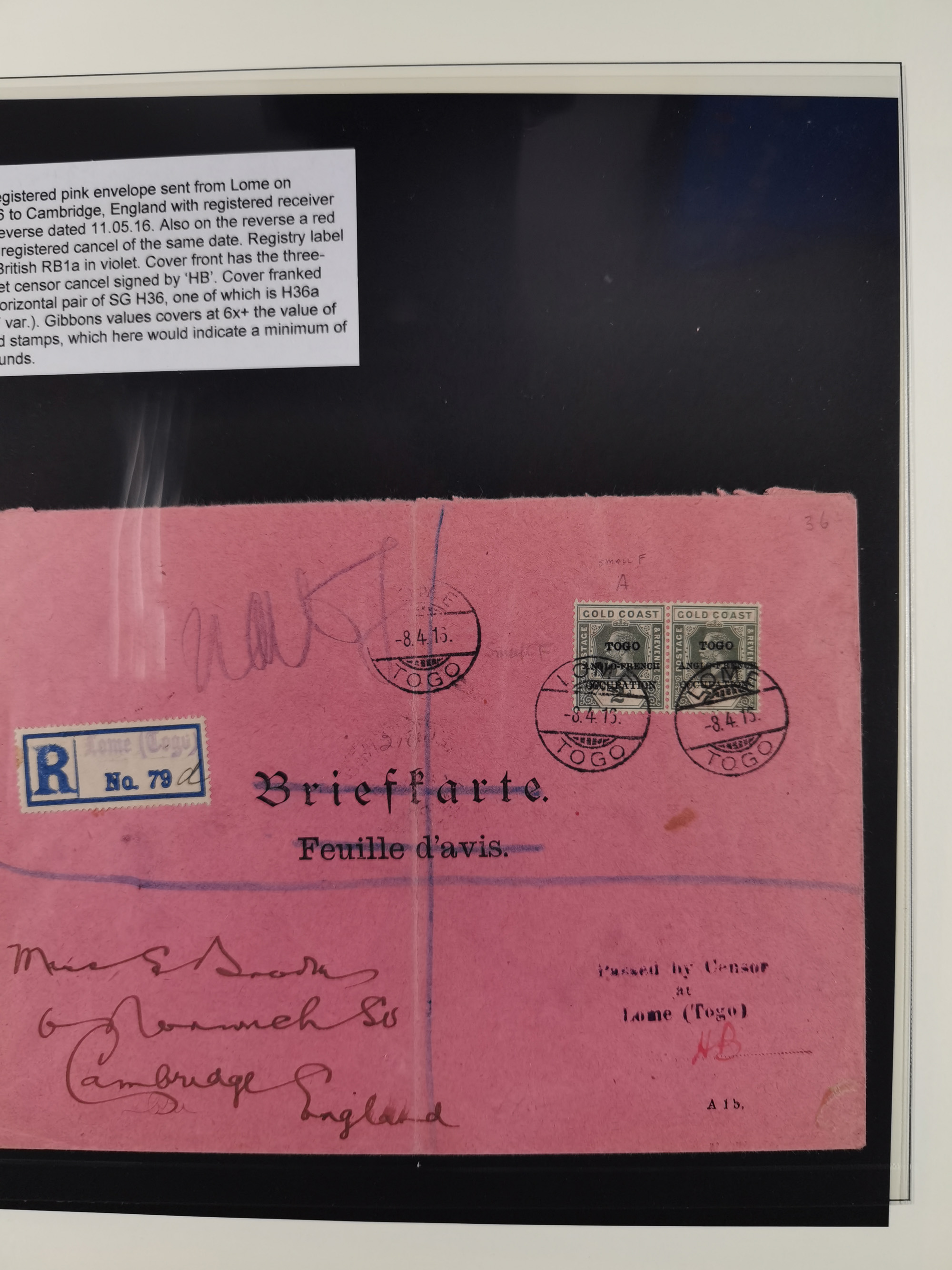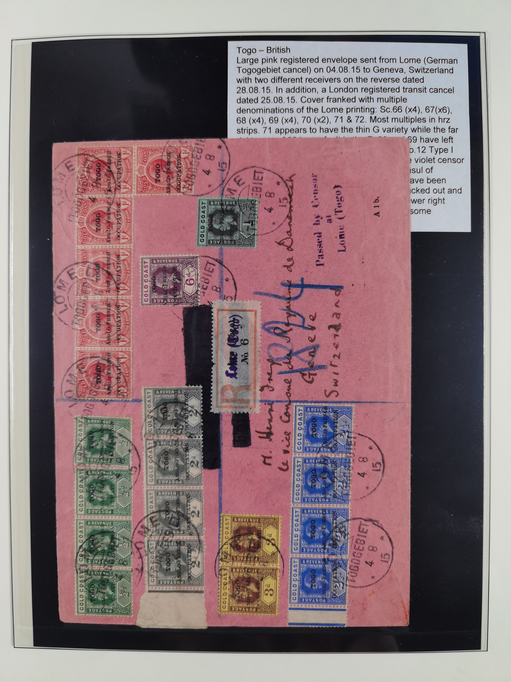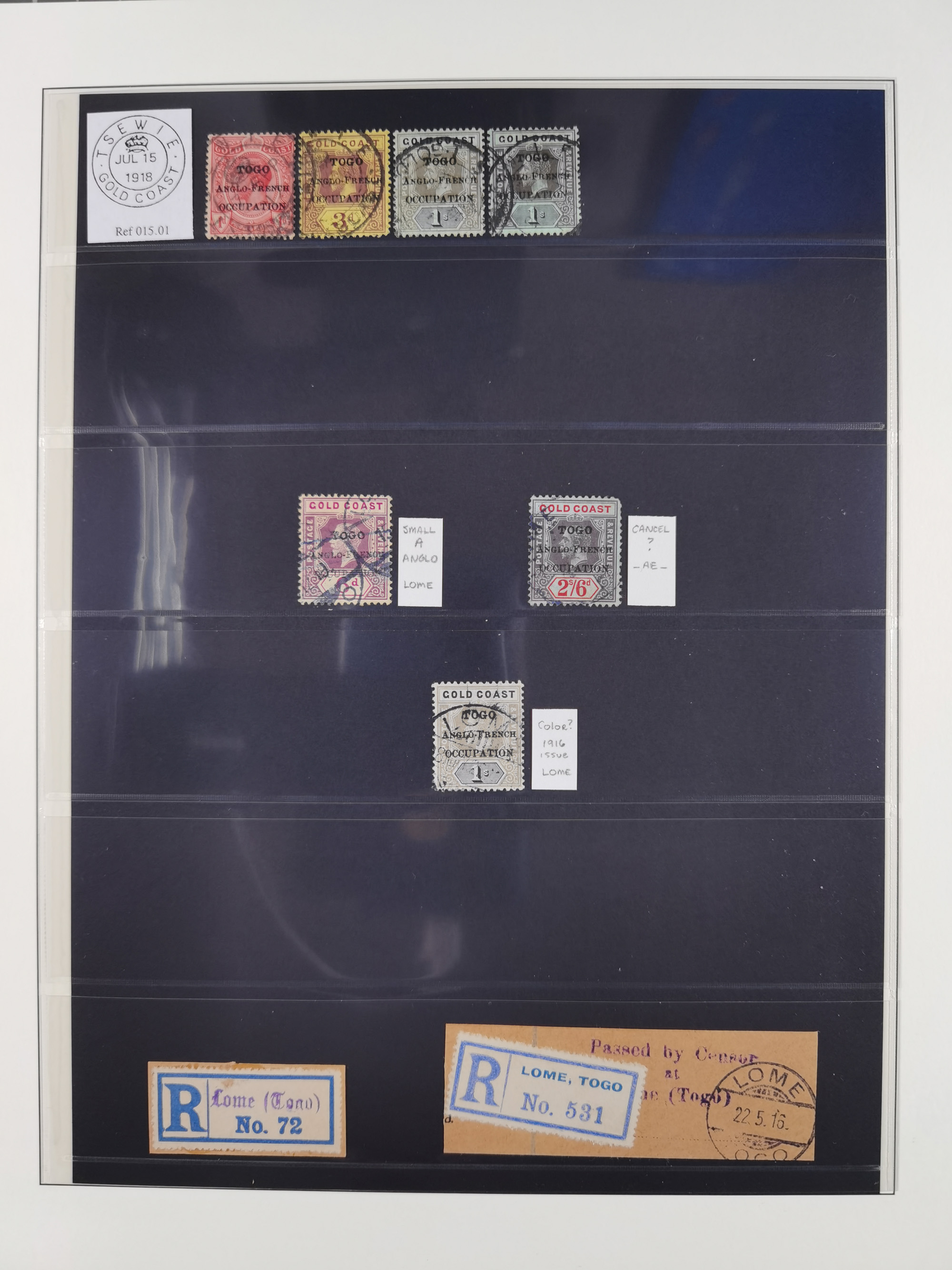 1915/16, ´TOGO / ANGLO-FRENCH / OCCUPATION´ Collection of 7 covers and postal stationerys with good cancellations on Gold Coast KGV overprinted issue up to 5 sh., Anecho with french occup. mixed stationey and Lome Togogebiet late used german colonies cancel., five registered mail. Mostly fine, neatly housed on expertly described nine album pages.
