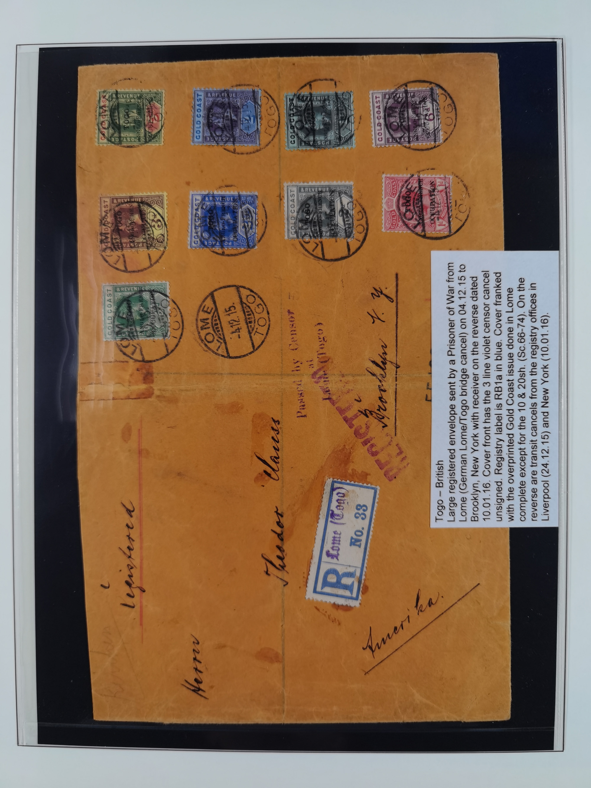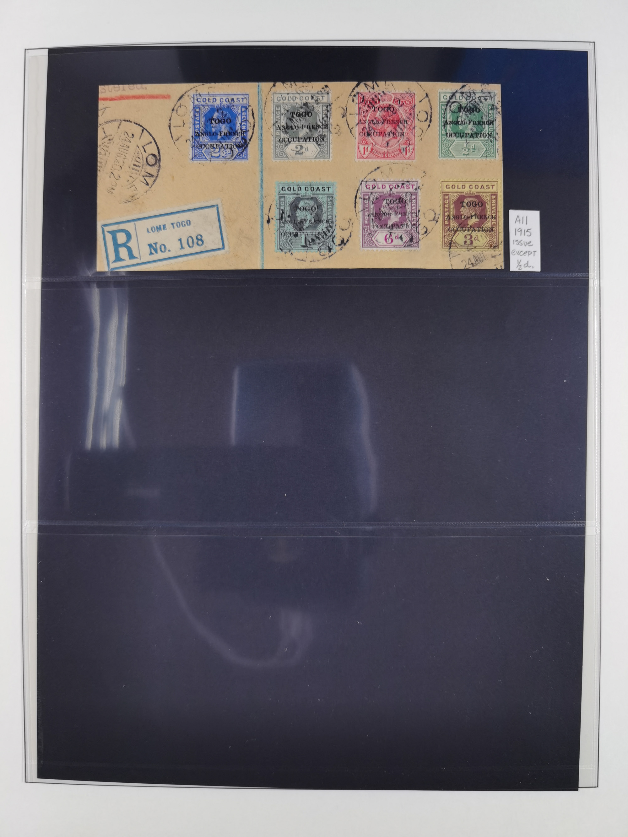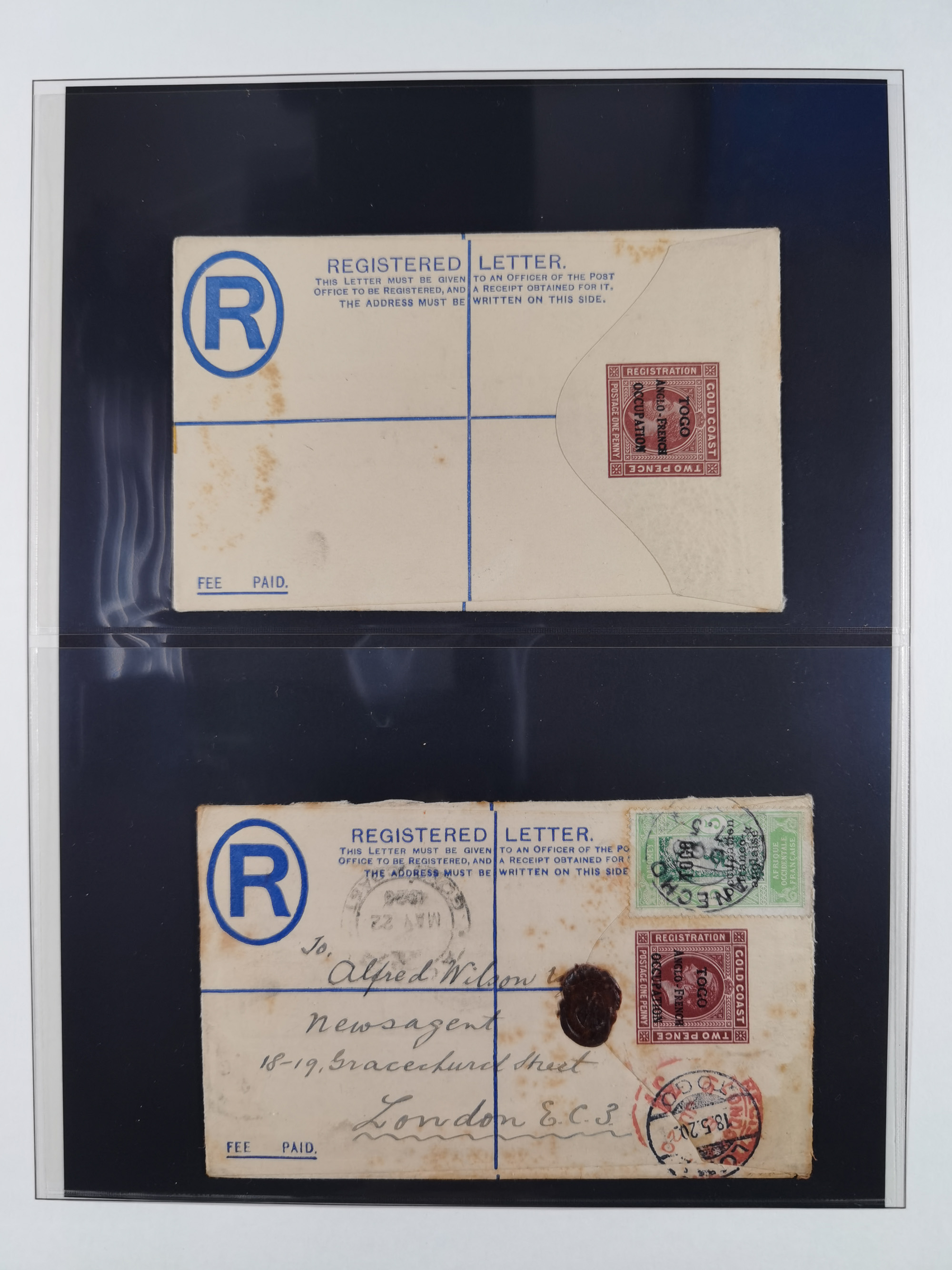 1915/16, ´TOGO / ANGLO-FRENCH / OCCUPATION´ Collection of 7 covers and postal stationerys with good cancellations on Gold Coast KGV overprinted issue up to 5 sh., Anecho with french occup. mixed stationey and Lome Togogebiet late used german colonies cancel., five registered mail. Mostly fine, neatly housed on expertly described nine album pages.