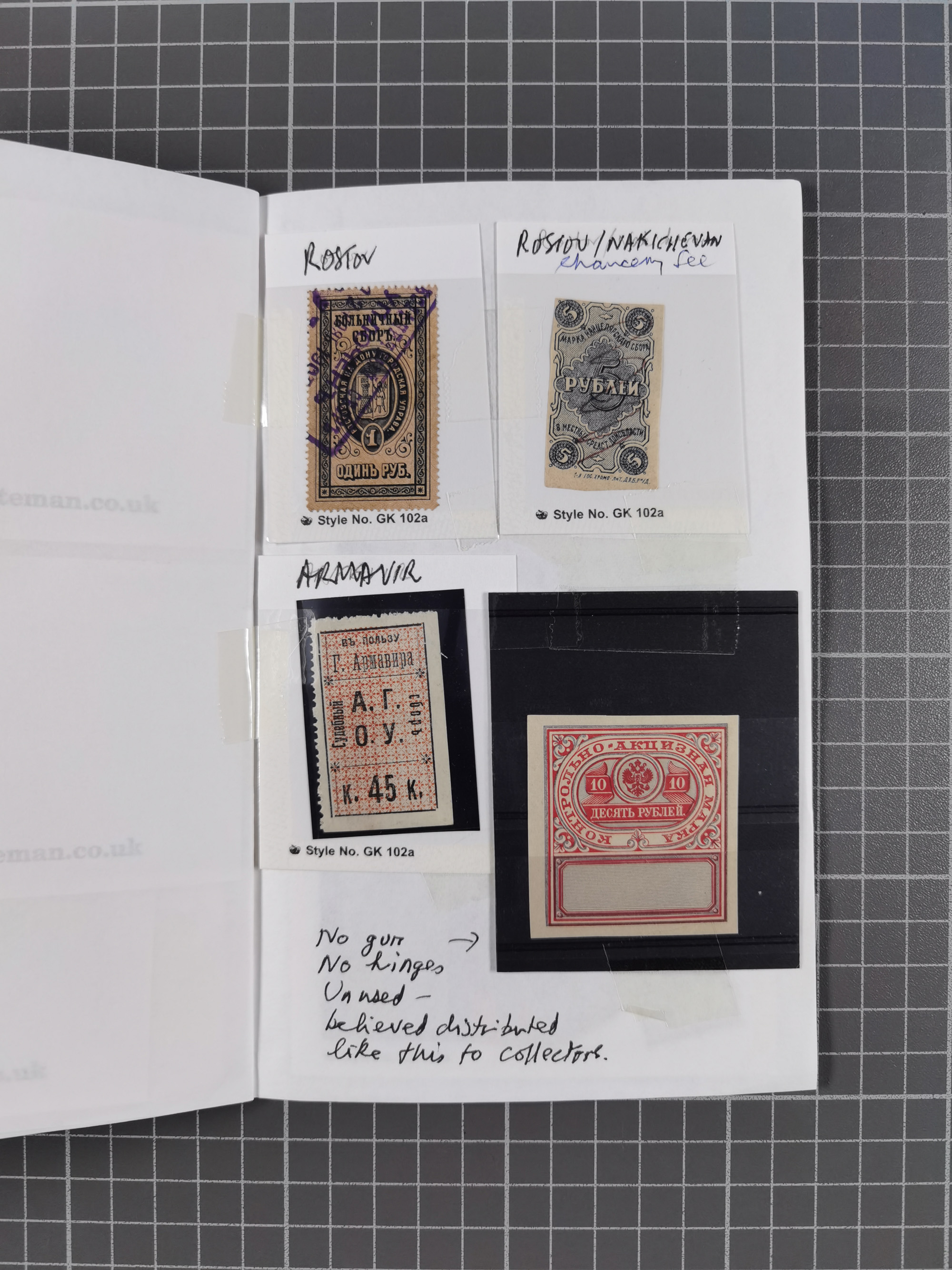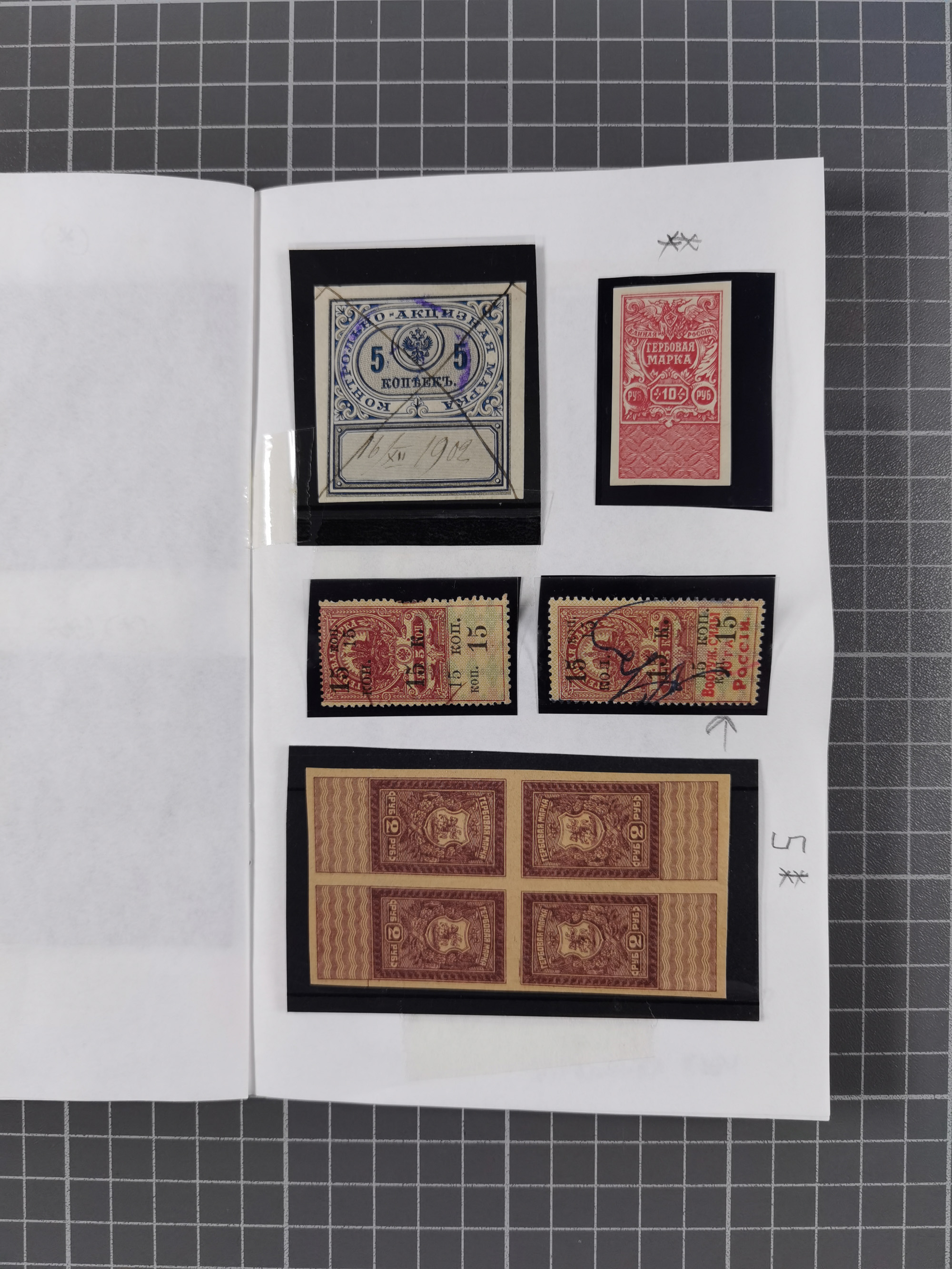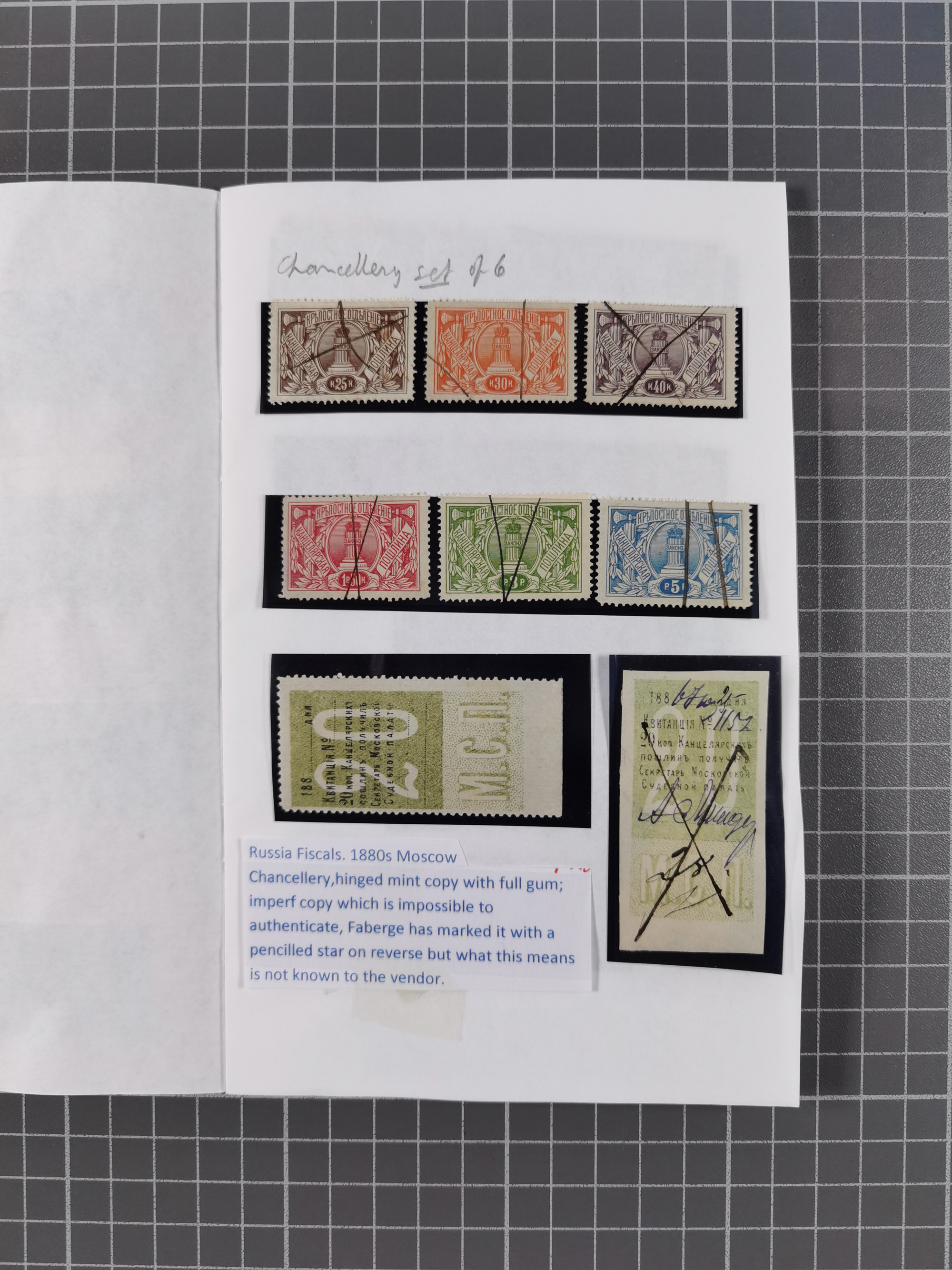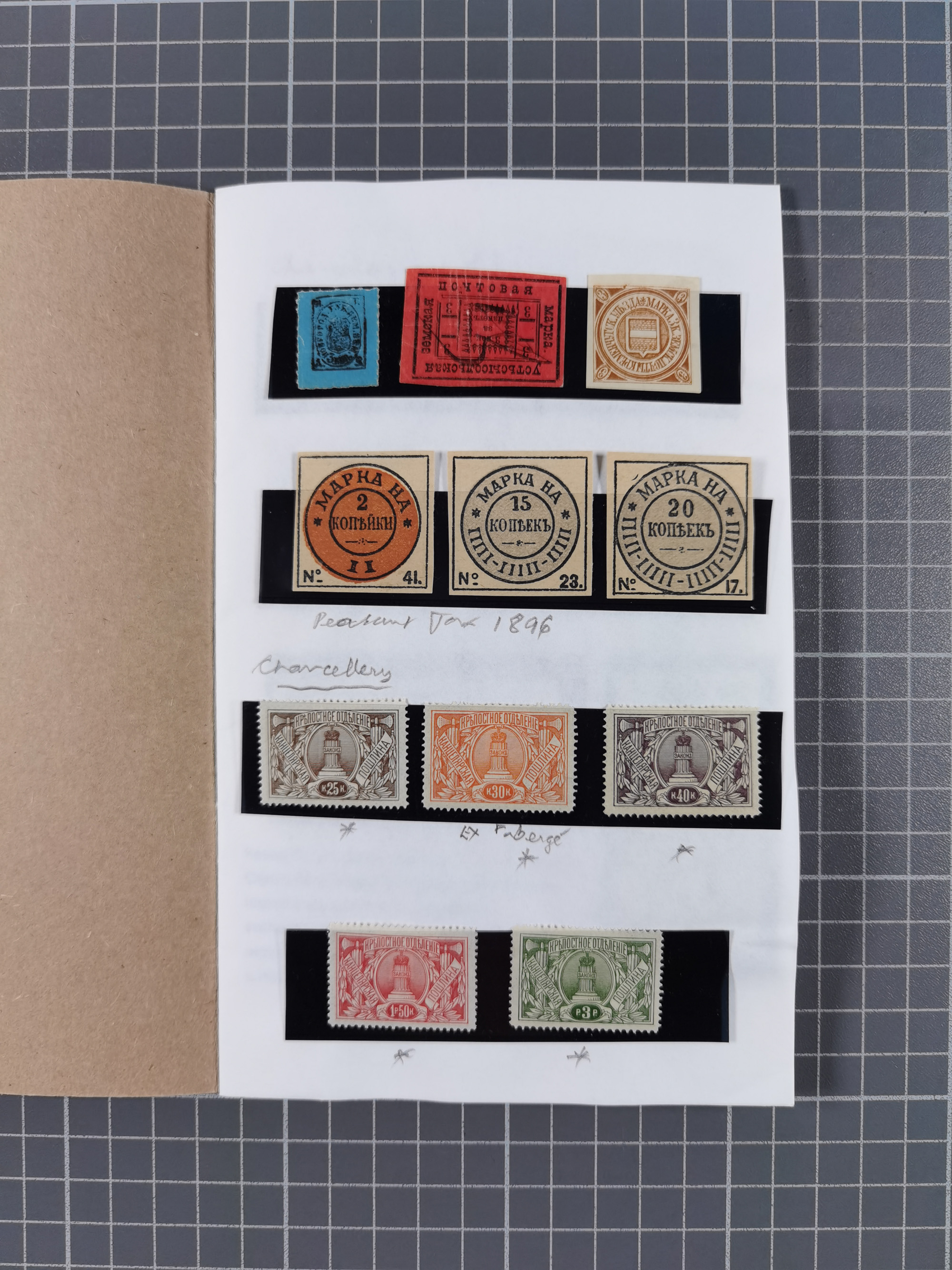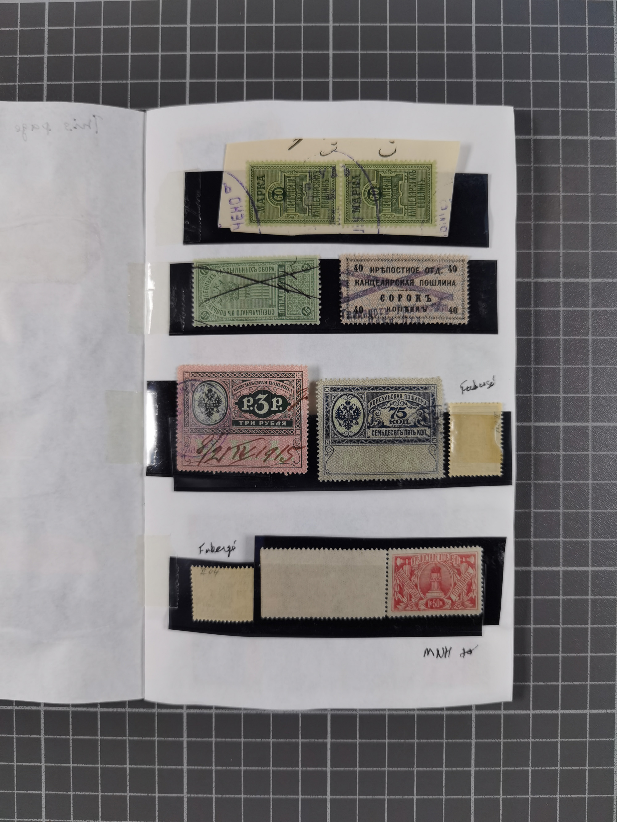 1880/1923 (ca.), Russian Fiscals and Zemstvo, group of unused/used including some multiples, noted Moscow chancellery, Simbirsk, Armavir, Voronezh and more, 1871 “Tabak” 3 roubles green imperforate unused (Standart-Nr. 5, ex Fabergé), small Zemstvo part with Ustssissolsk, Krememchug, Borigolevsk, etc, except for the occasional fault mostly in fine condition, an interesting assembly neatly housed in two booklets