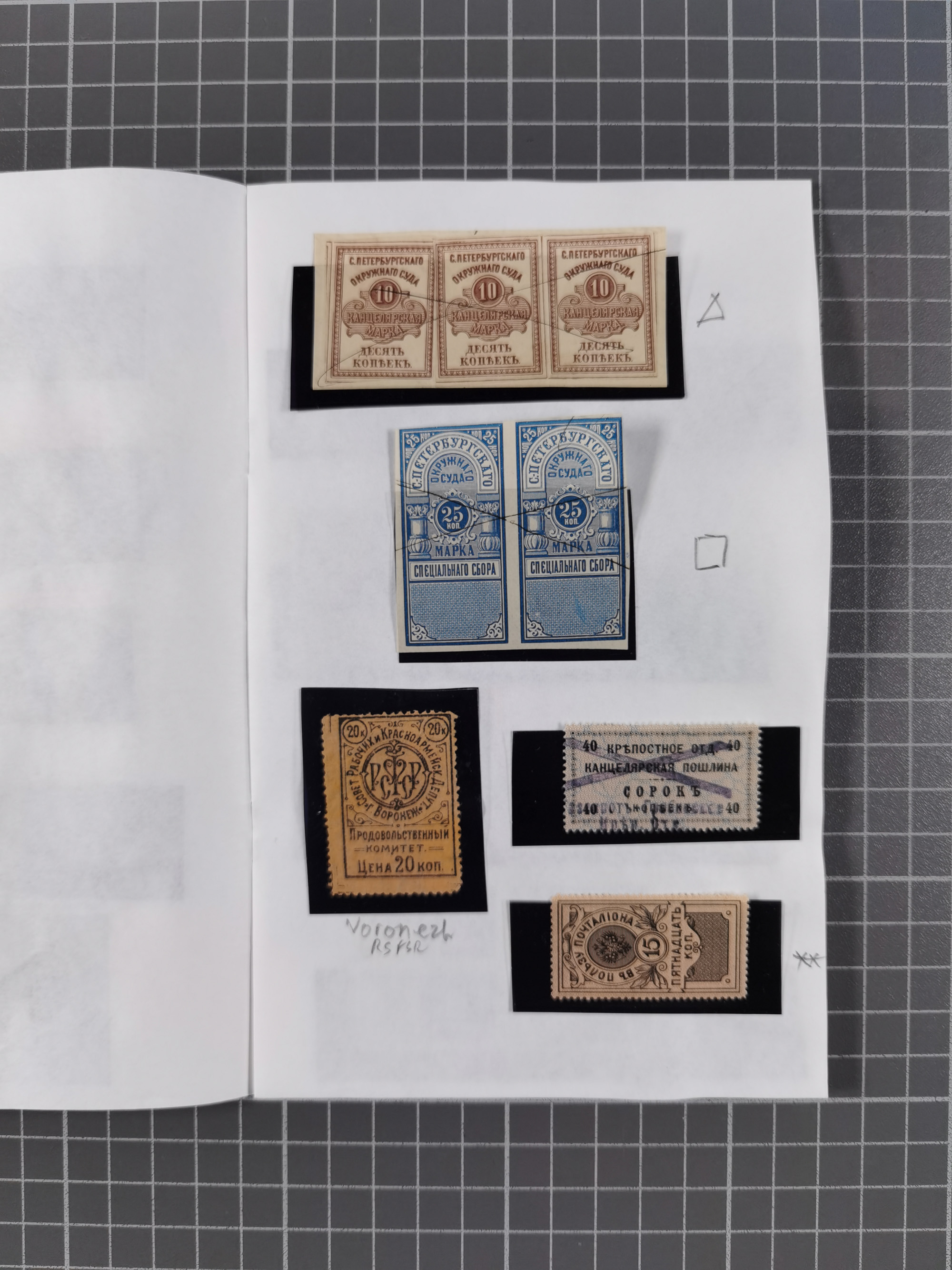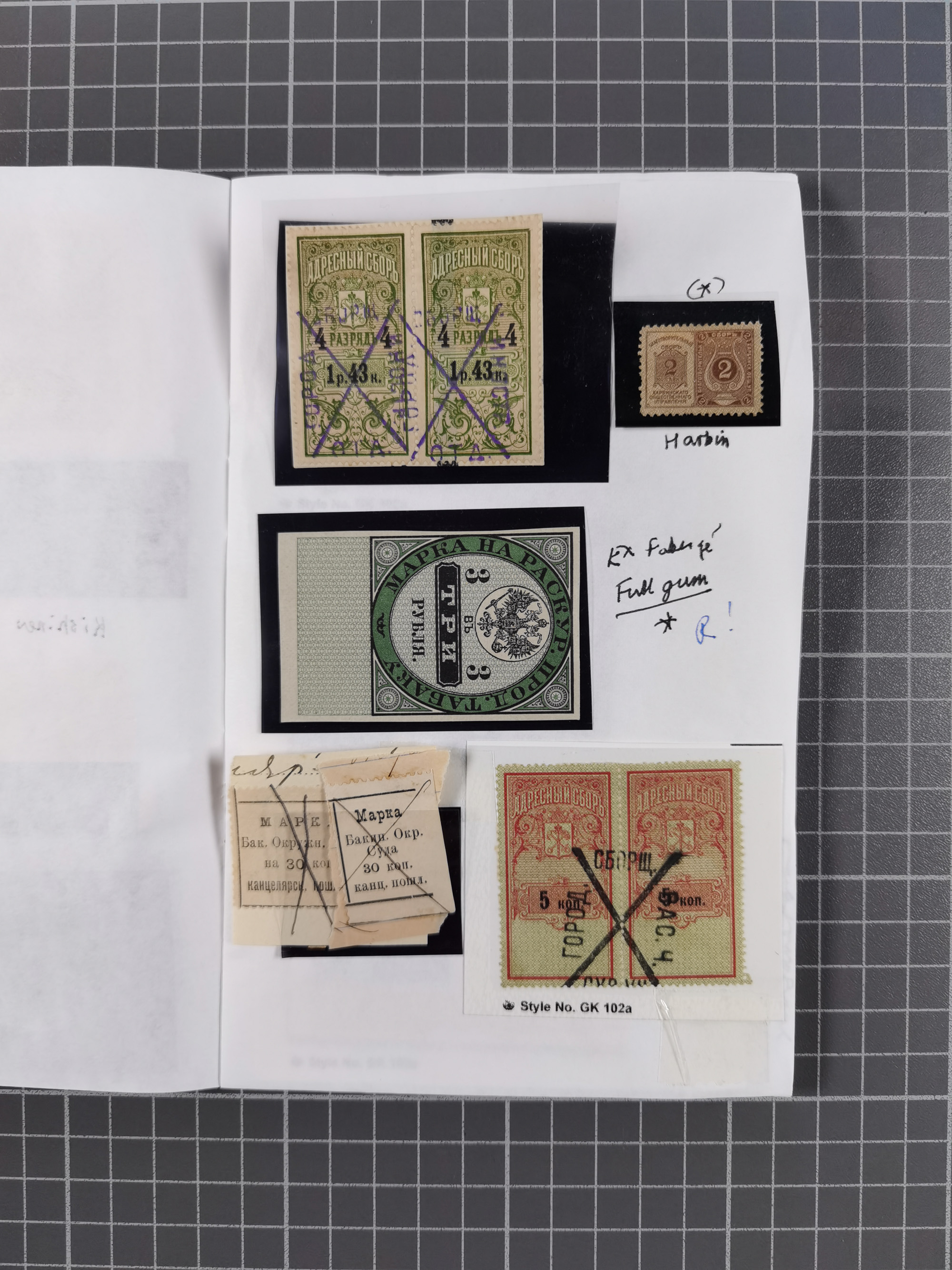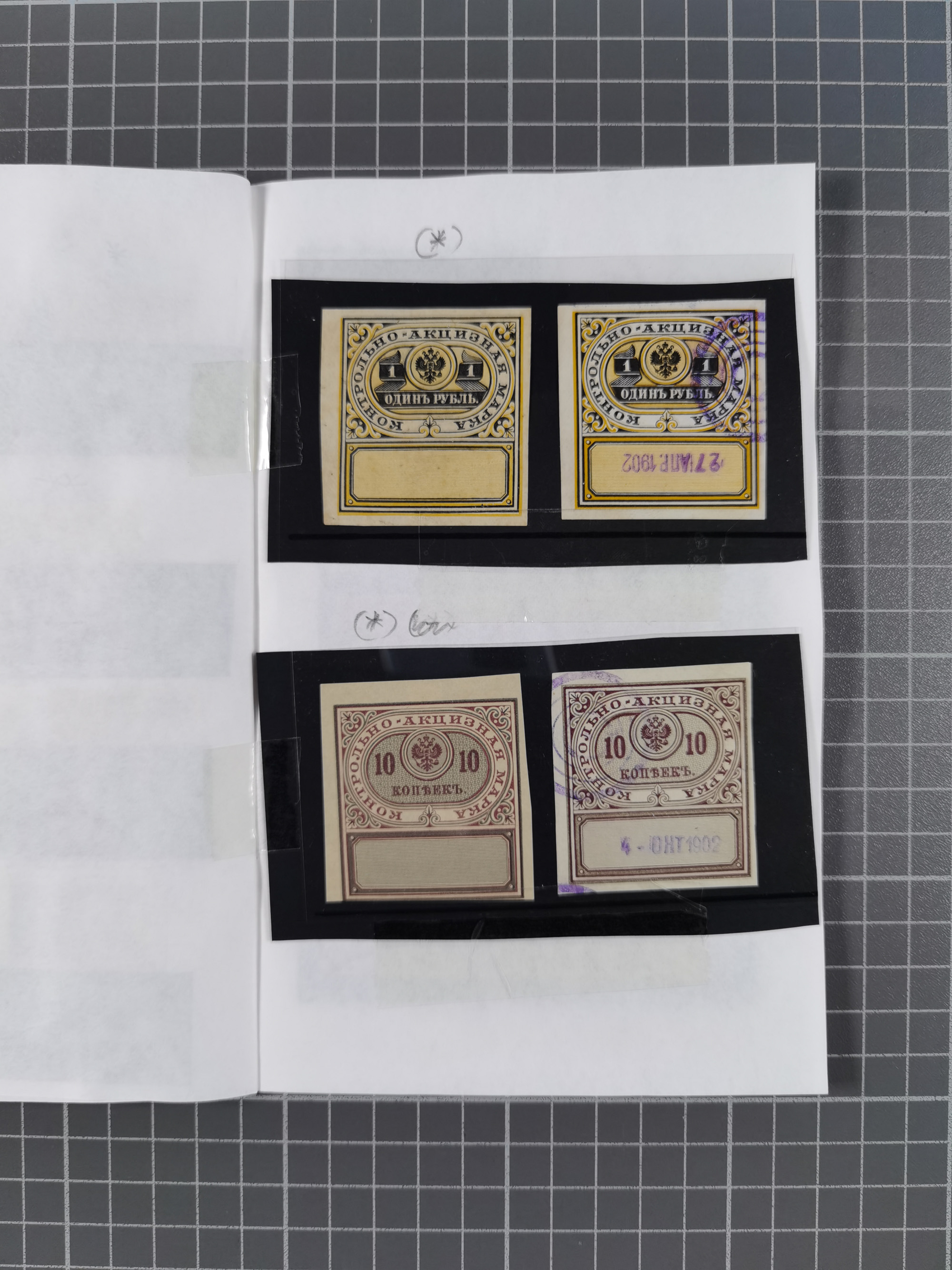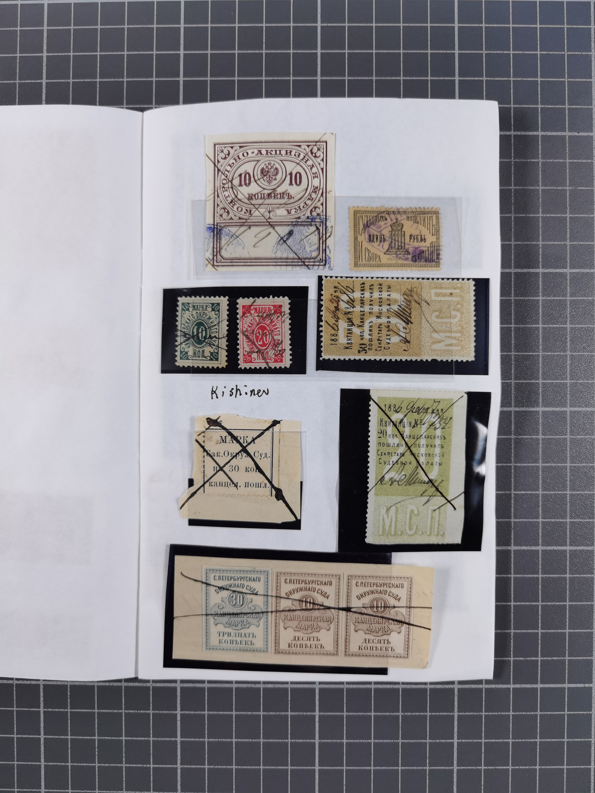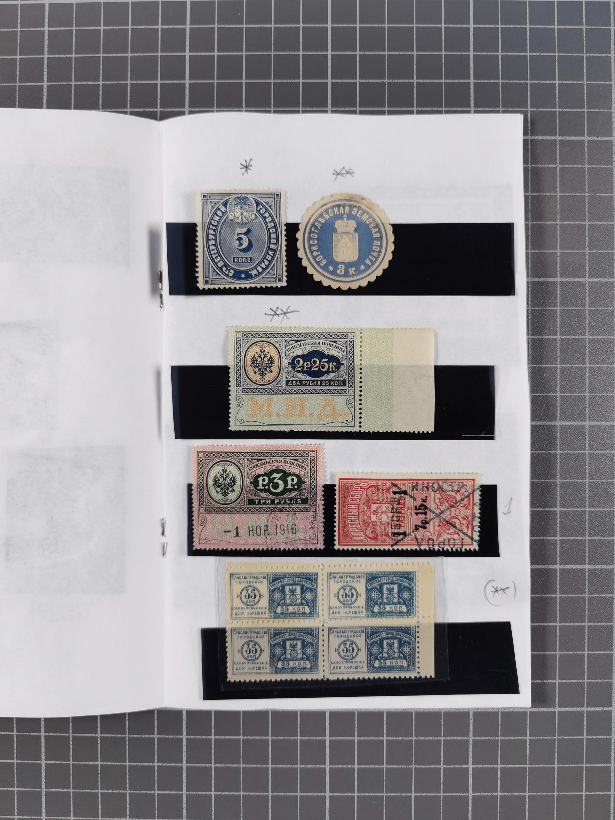 1880/1923 (ca.), Russian Fiscals and Zemstvo, group of unused/used including some multiples, noted Moscow chancellery, Simbirsk, Armavir, Voronezh and more, 1871 “Tabak” 3 roubles green imperforate unused (Standart-Nr. 5, ex Fabergé), small Zemstvo part with Ustssissolsk, Krememchug, Borigolevsk, etc, except for the occasional fault mostly in fine condition, an interesting assembly neatly housed in two booklets