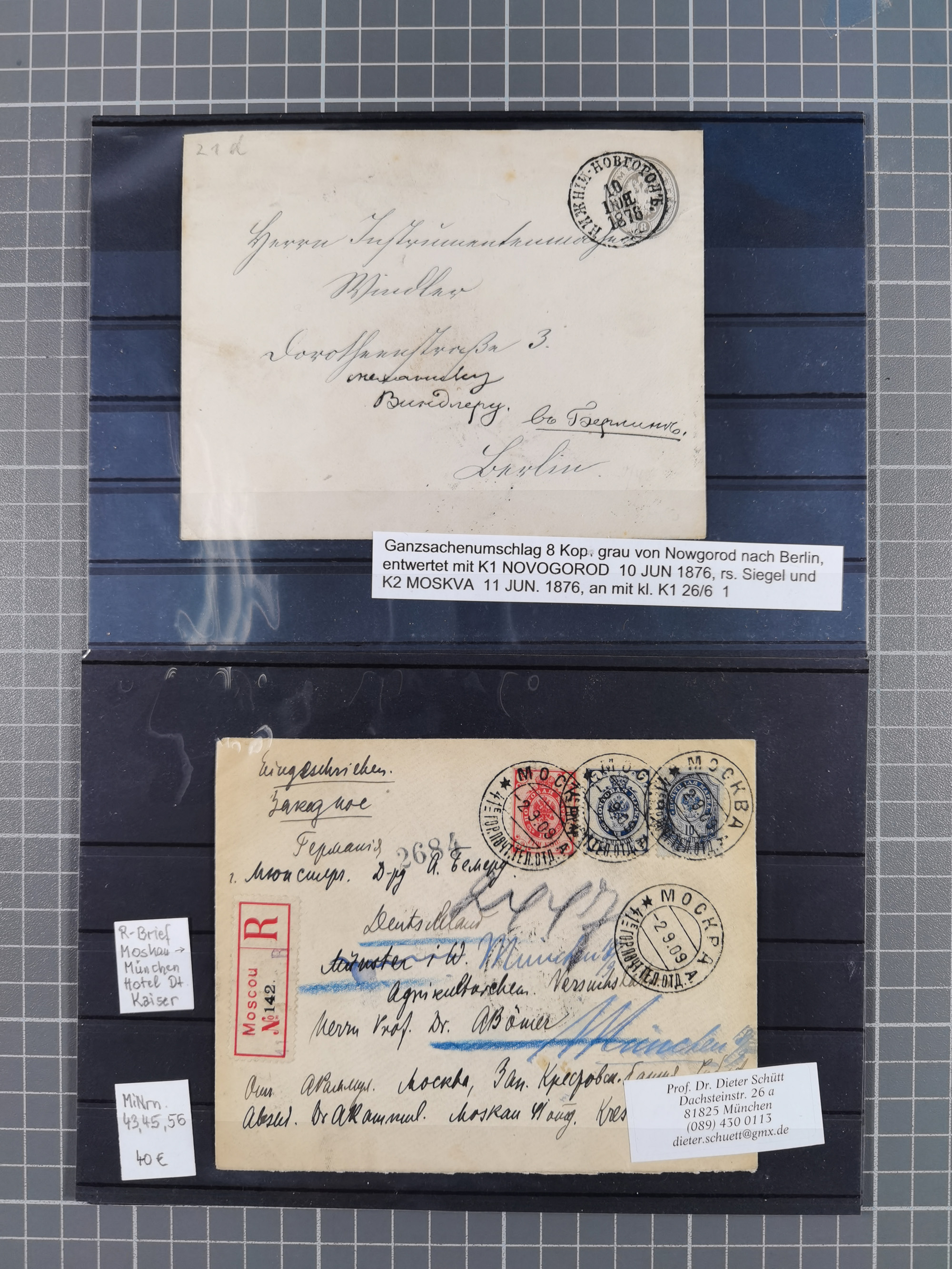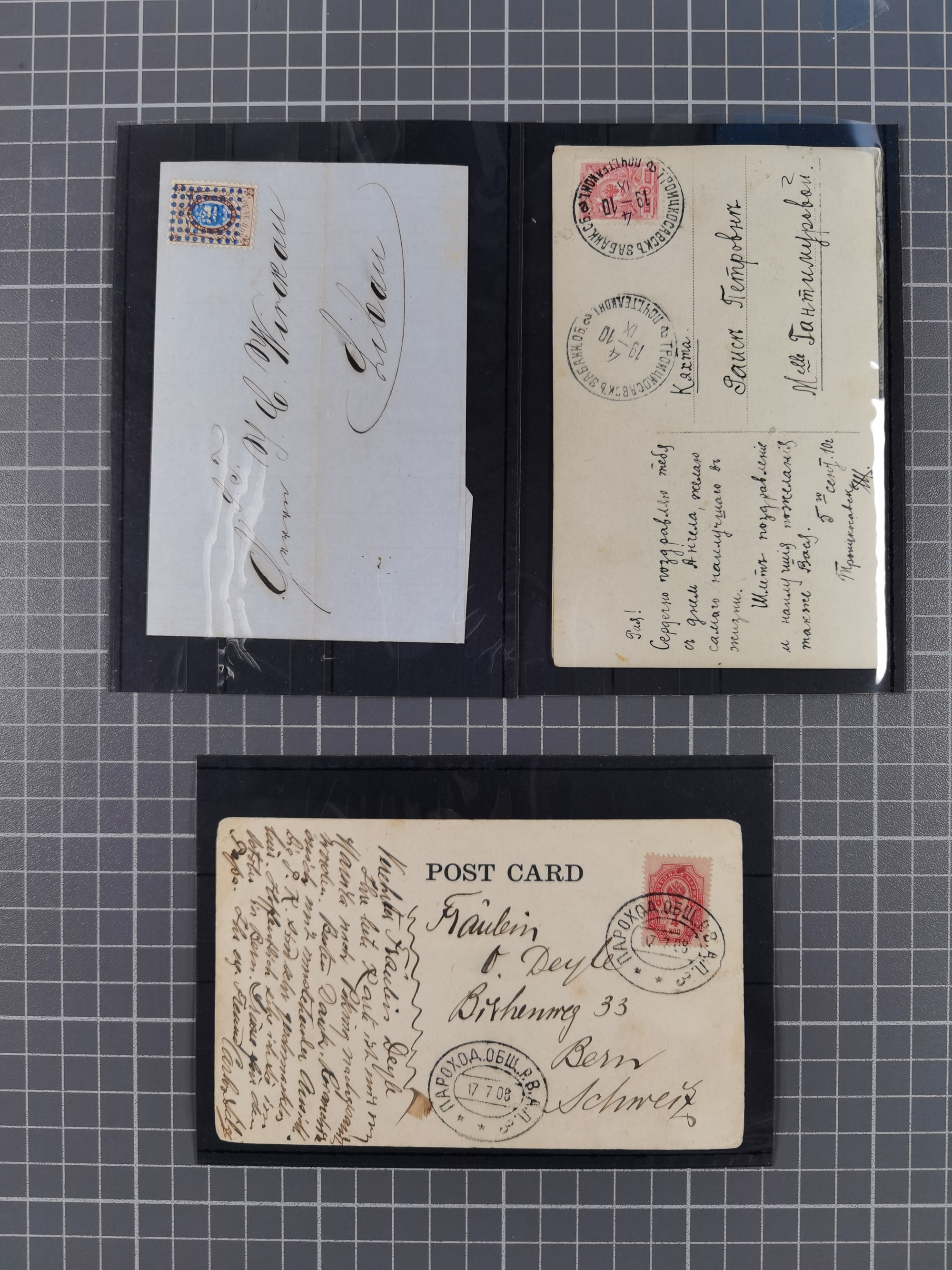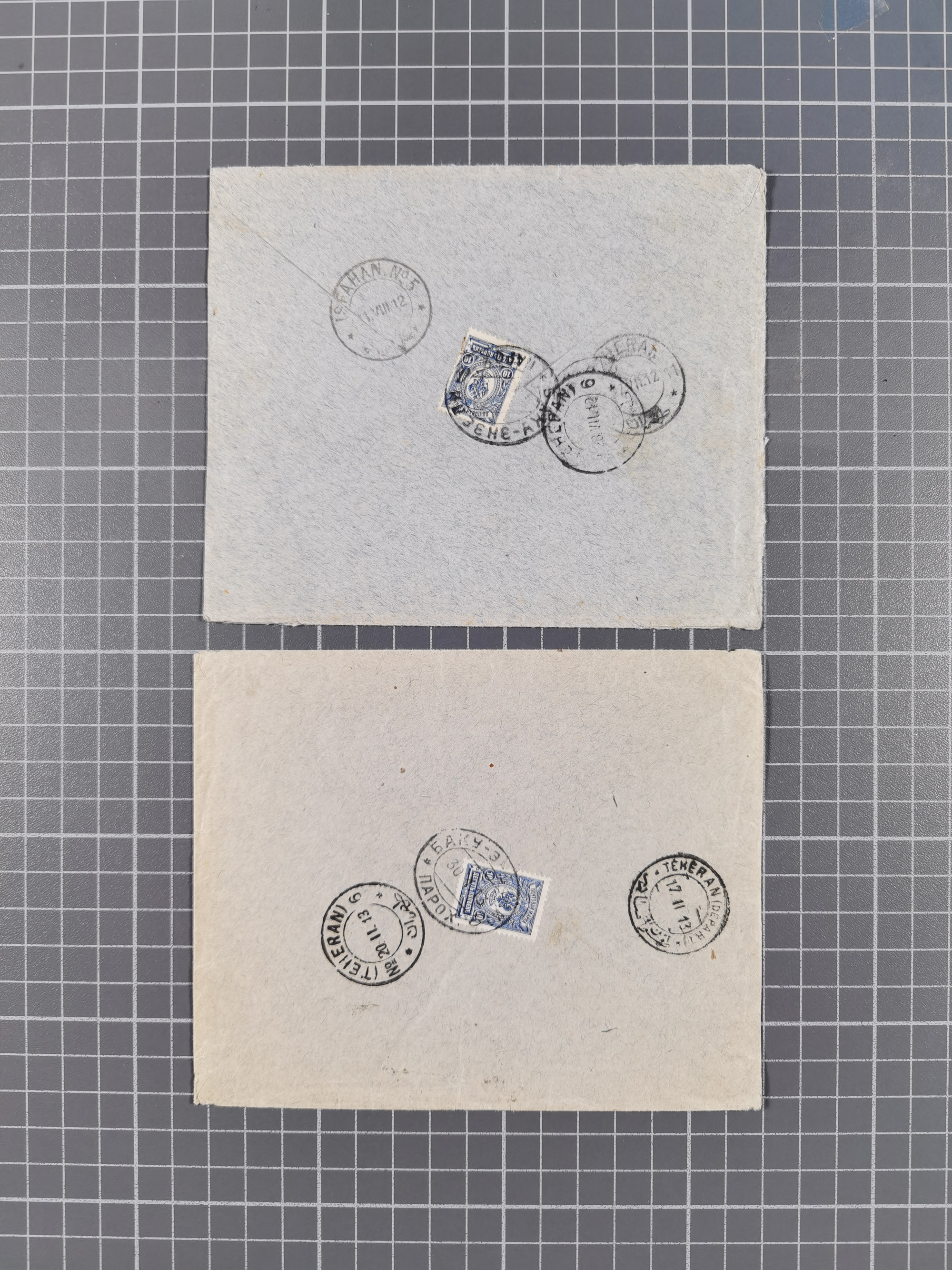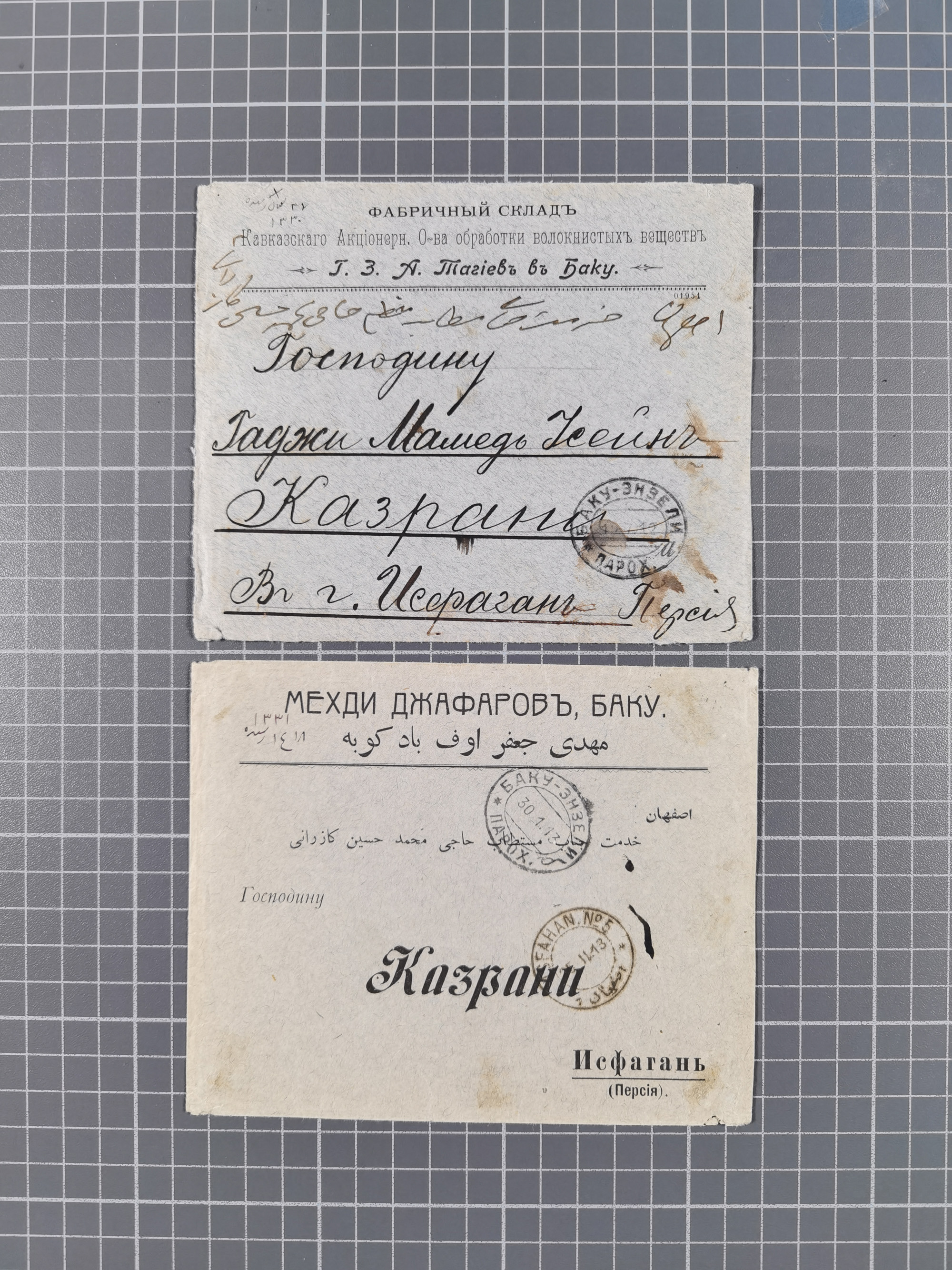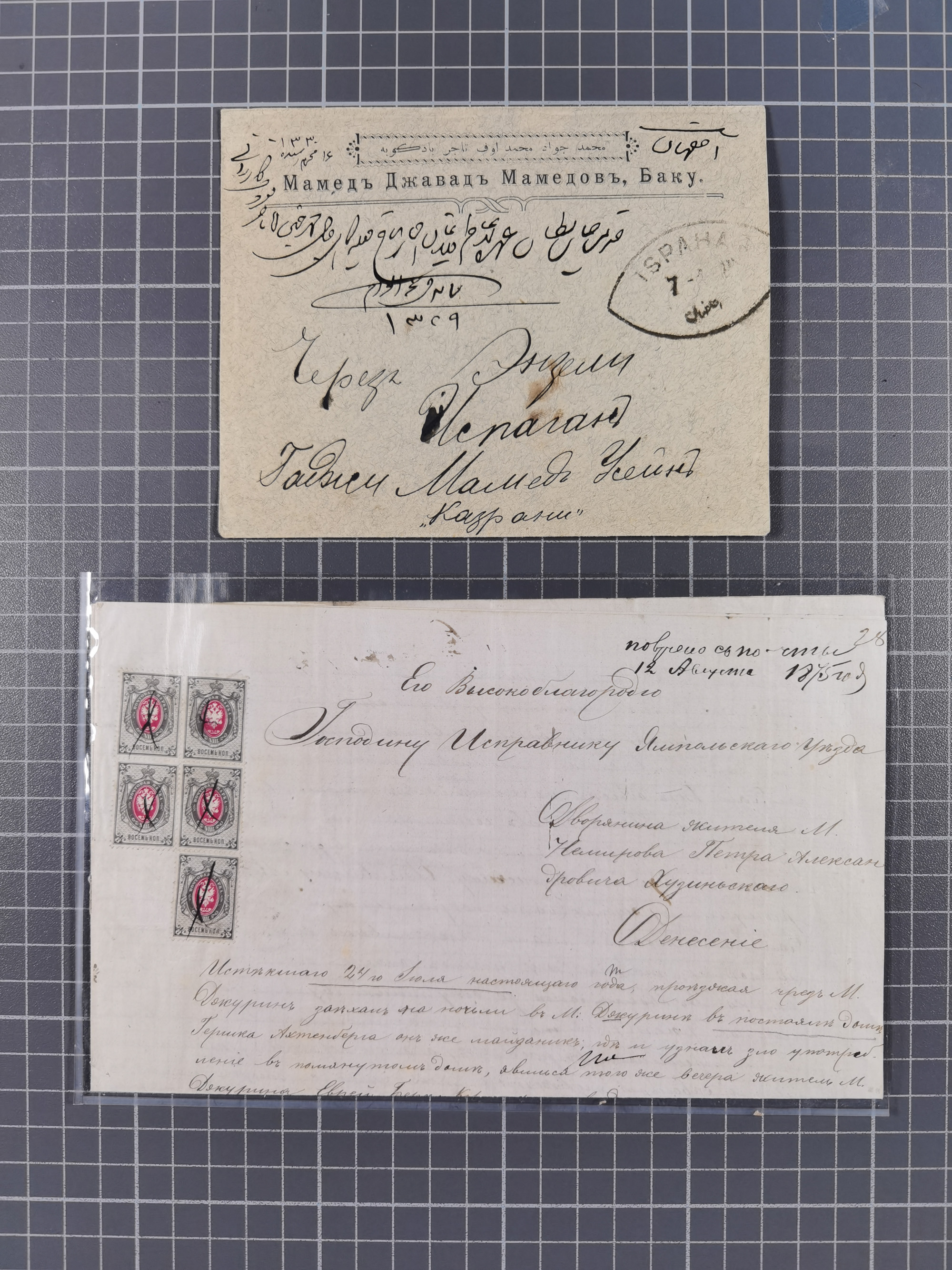 1875/1913, group of 8 covers and cards, some interesting usages including ship mail with “PARAKHODA. OBSCH. R.V.A.P. z 17 7 08” (STEAMSHIP OF EAST ASIATIC STEAMSHIP COMPANY) on 4 k., repeated alongside to postcard to Switzerland, Caspian sea mail with “BAKU-ENZELI PAROKH. 30 1 13” oval cds. on 10 k. on reverse of envelope to Ispahan with transit cds. “TEHERAN (DÉPART) 17. 11 13”, “(TEHERAN) 20.11.13”, very fine, also a similar cover from 1912, etc., together with Mi.-Nr. 26x (bloc of five) used with pen cross to a 1875 police report regarding a crime involving counterfeited coins in the hamlet of Dokurin, mostly fine