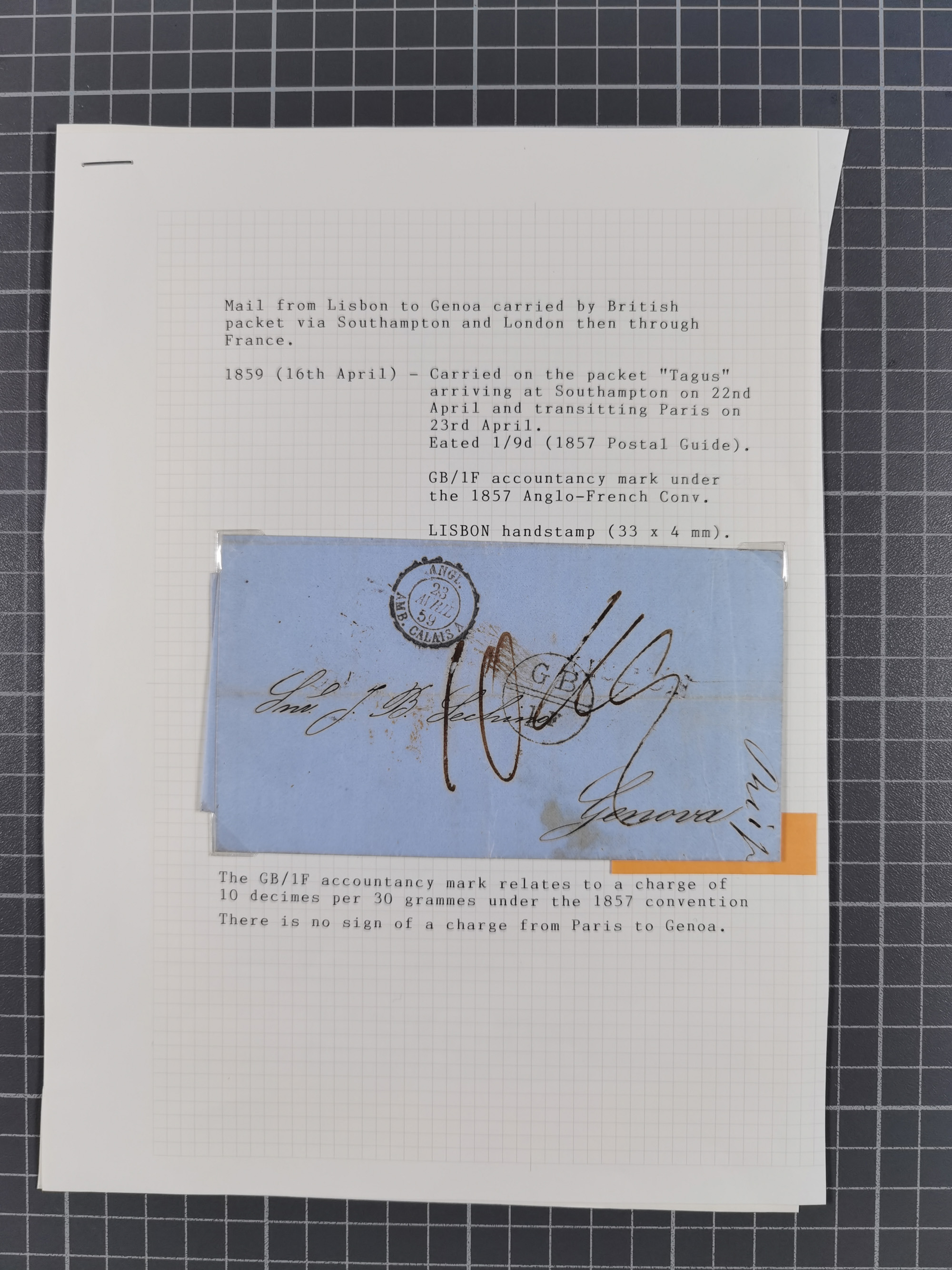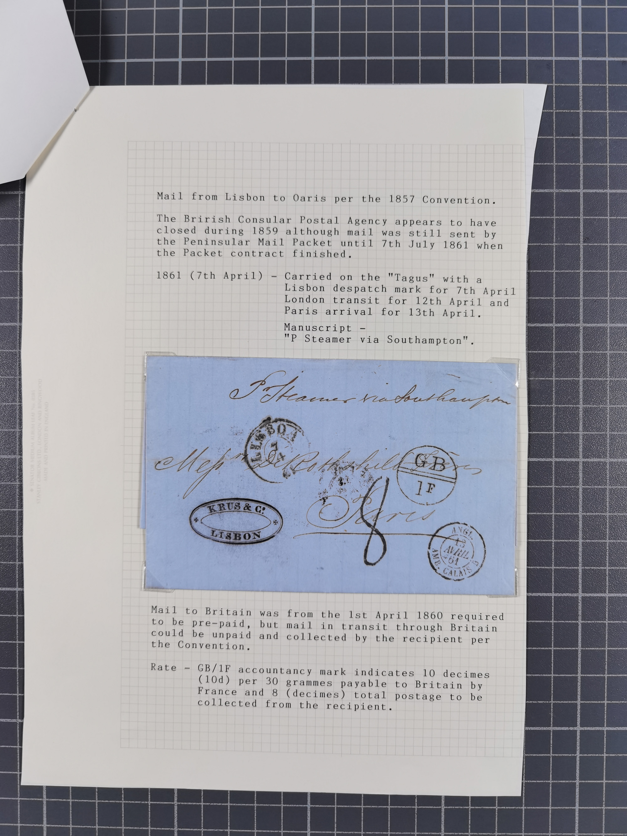 1847/59, 3 letters: 30 Nov. 1847 to Paris, rated “1/9” d., framed “LISBON” and “COLONIES/&C ART.13”, Calais transit and London cds.; 1859 letter to Genoa, rated “1/9” d., straight-line “LISBON”, circular “GB/1F”, Calais transit cds., also 1861 letter to Paris, posted after closure of the Consular P.O. but carried by Peninsular Mail Packet with Lisbon cds., on described pages