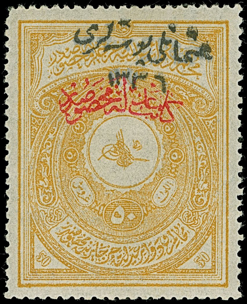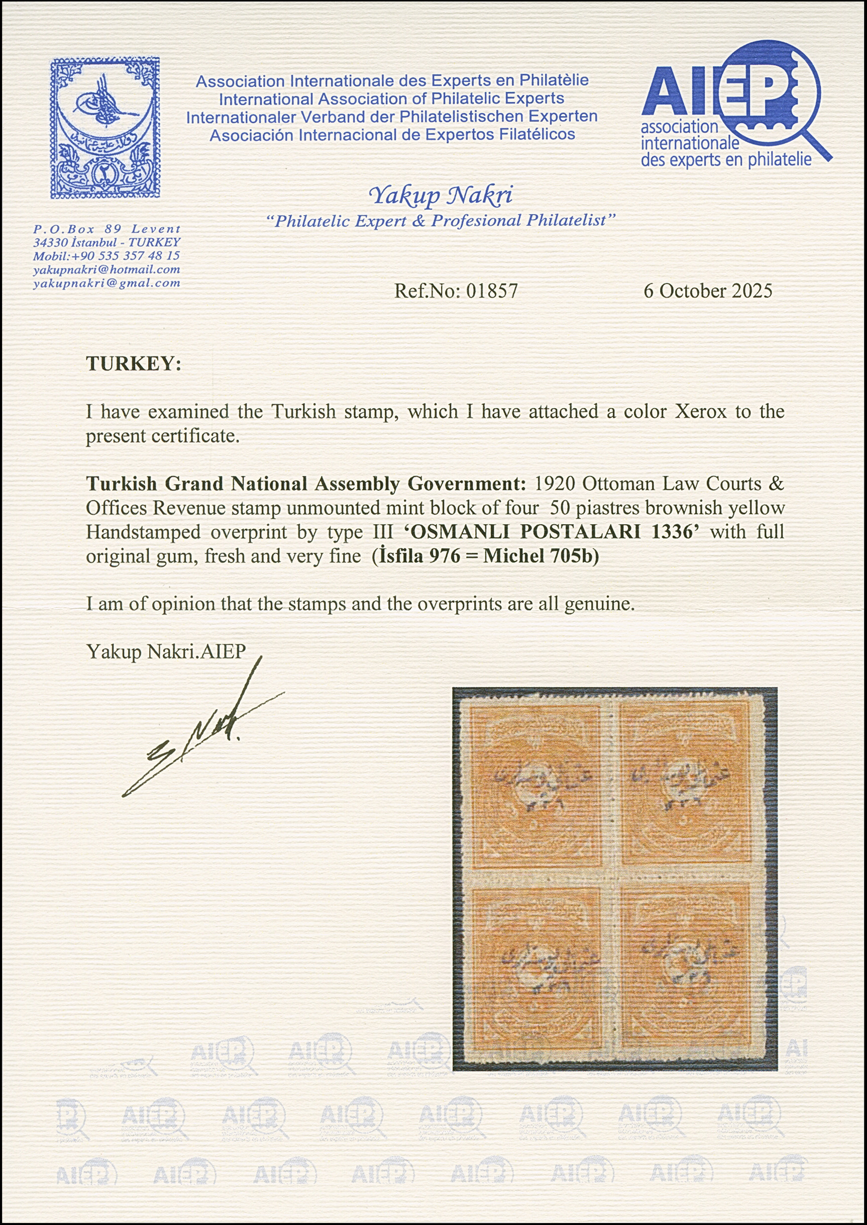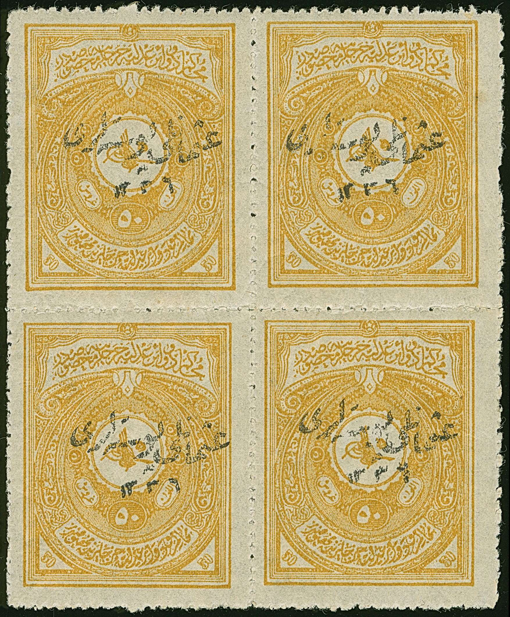 1920, Law Courts Revenue 50 pia. brownish-yellow, overprint type III handstamped in black (rare type), block of four, mint never hinged, very well centered with good perforation for this issue. Certificate Yakup Nakri (2025).